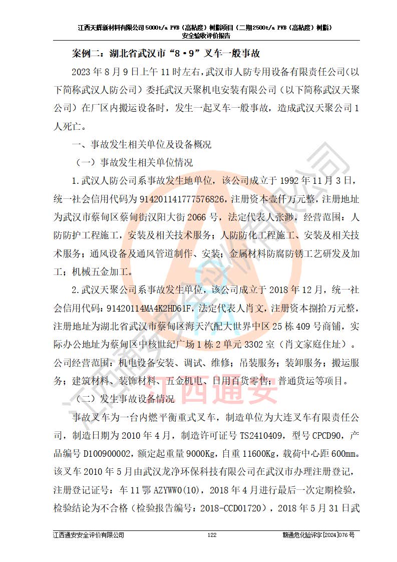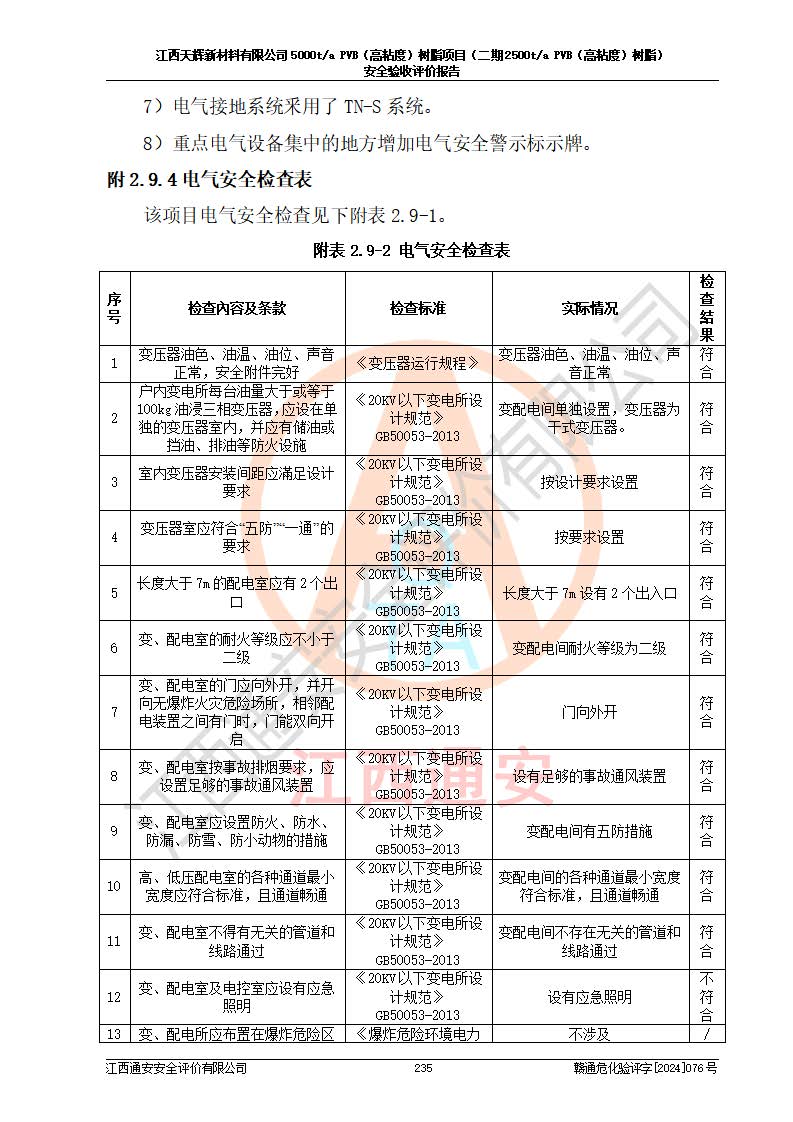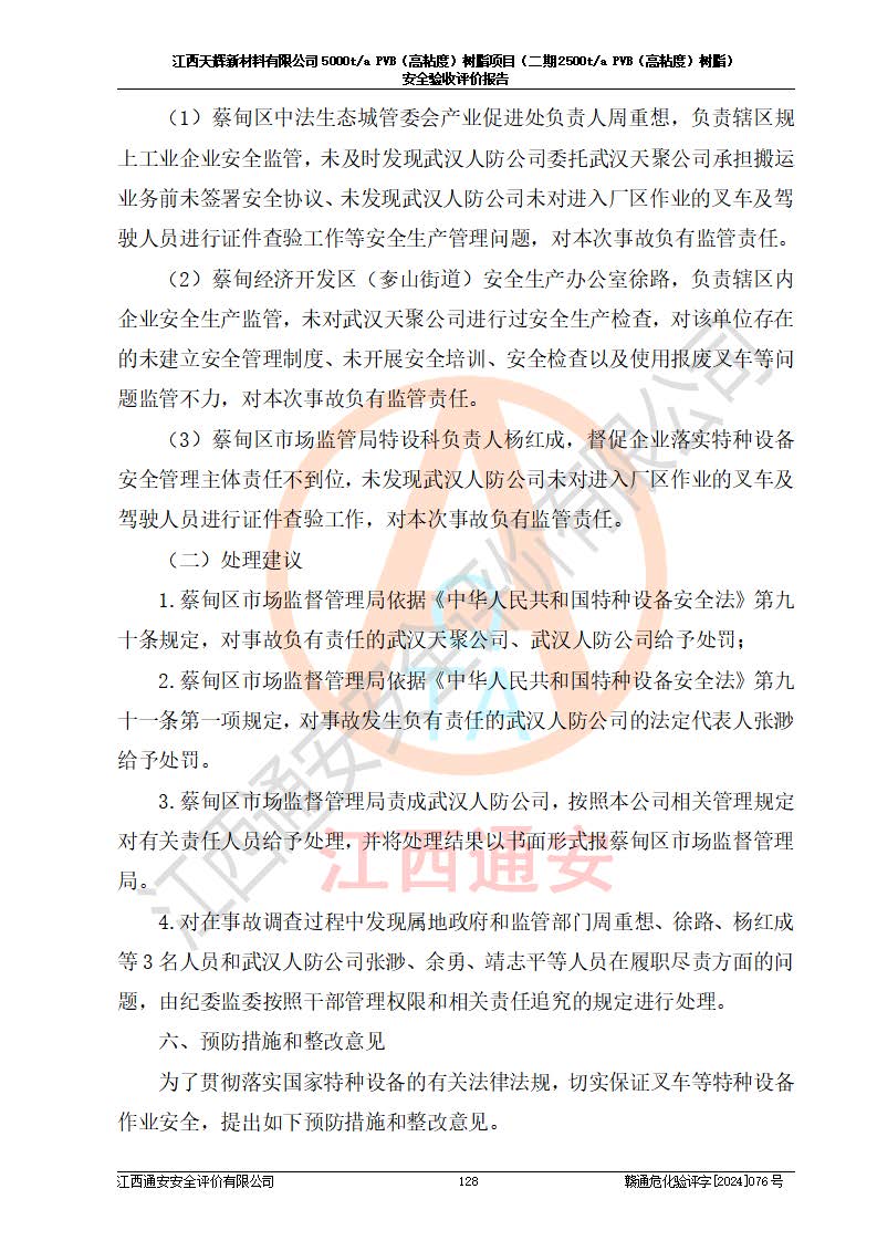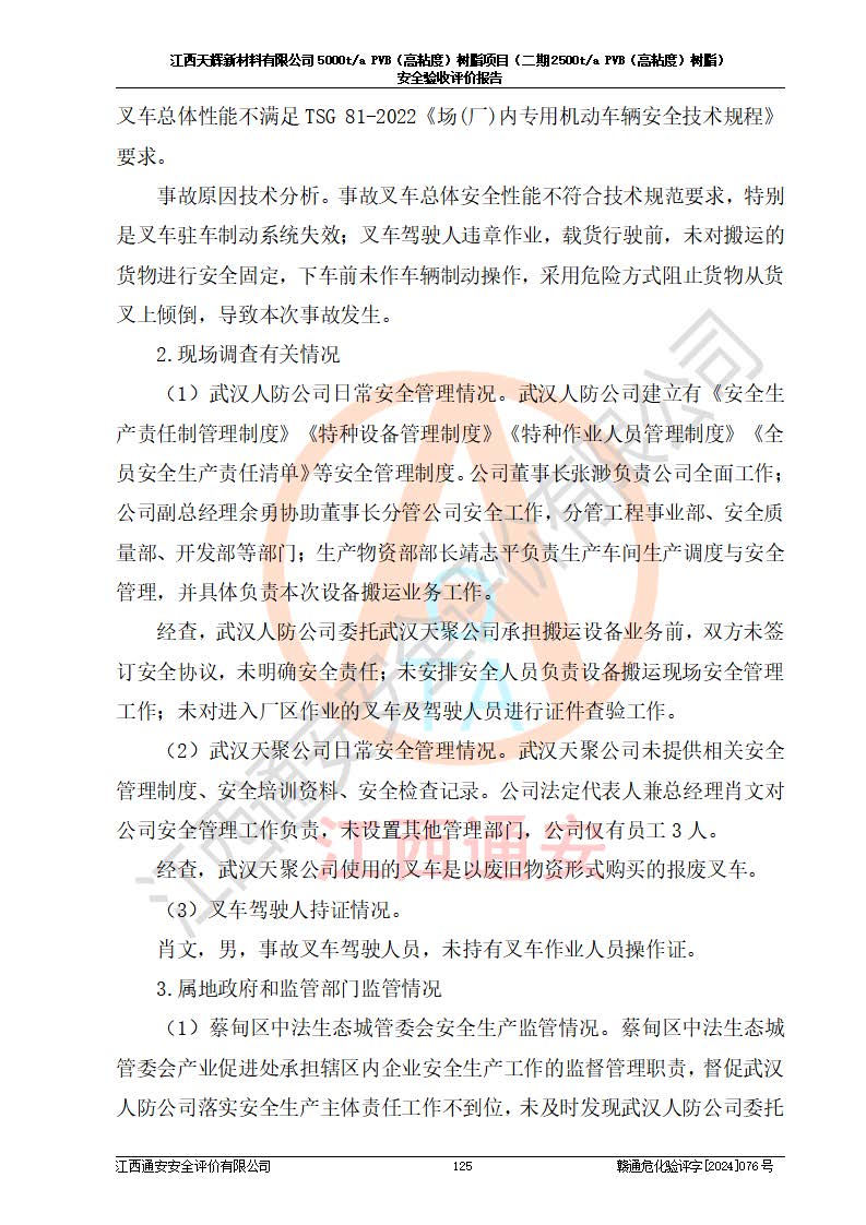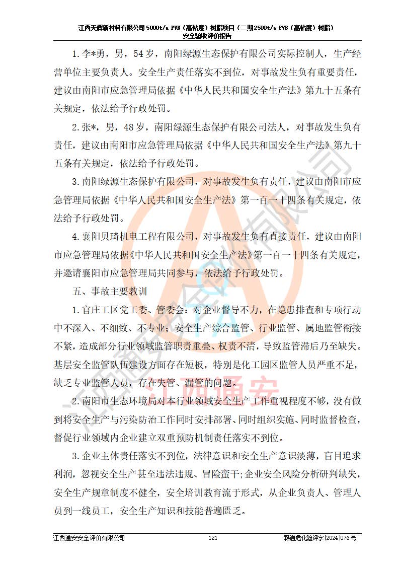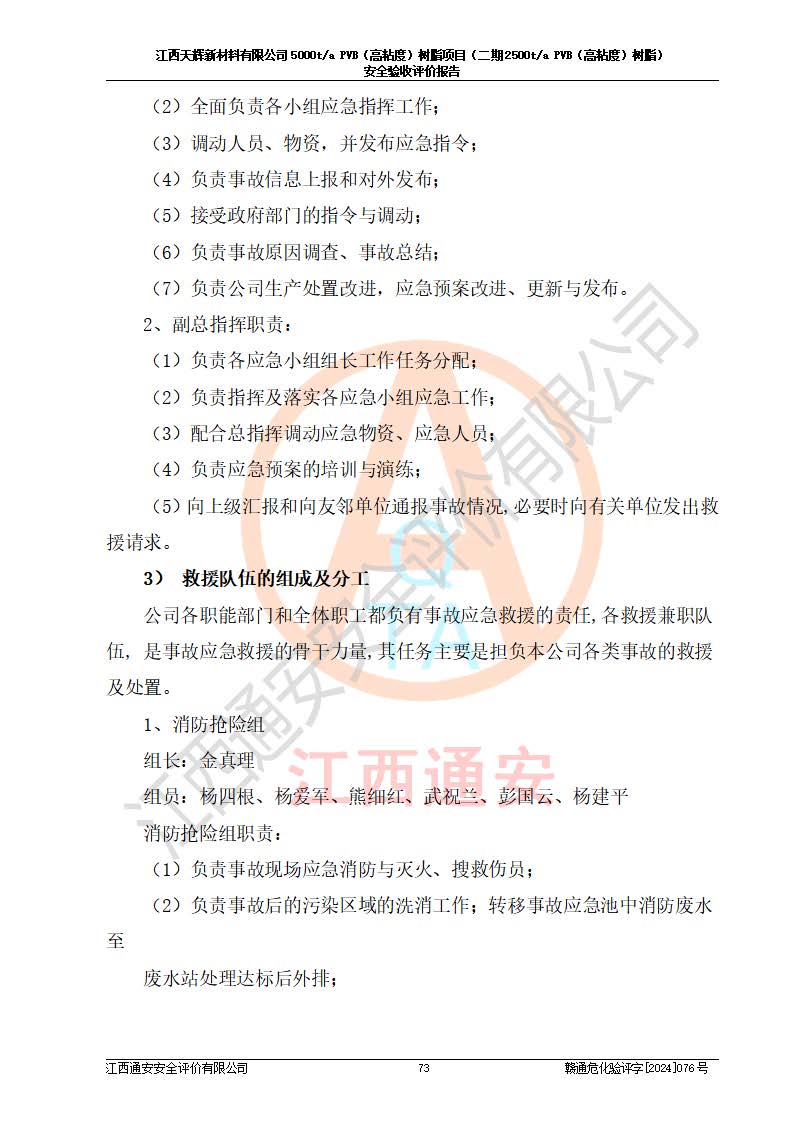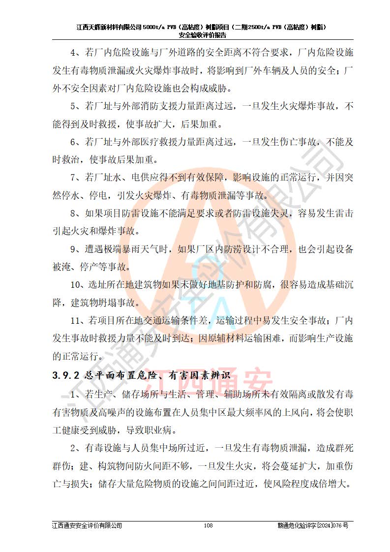 評價報告名稱 | 江西天輝新材料有限公司5000t/a PVB(高粘度)樹脂項目(二期2500t/a PVB(高粘度)樹脂)安全驗收評價報告 | |||