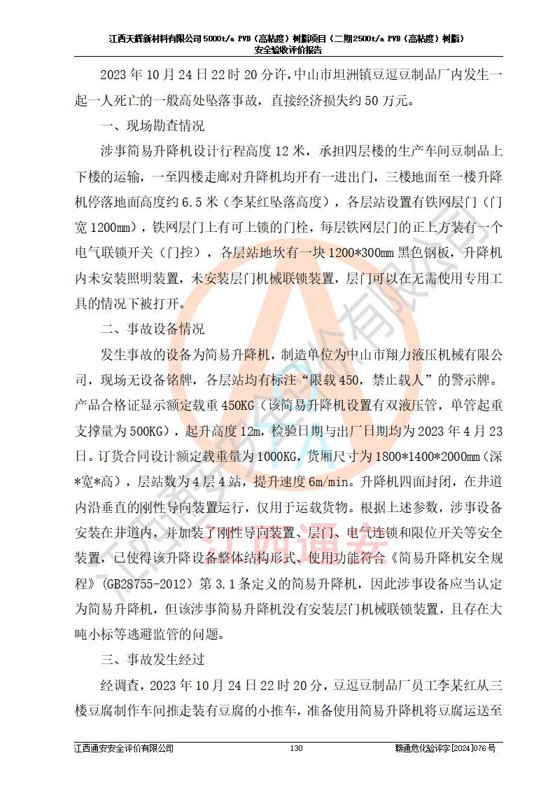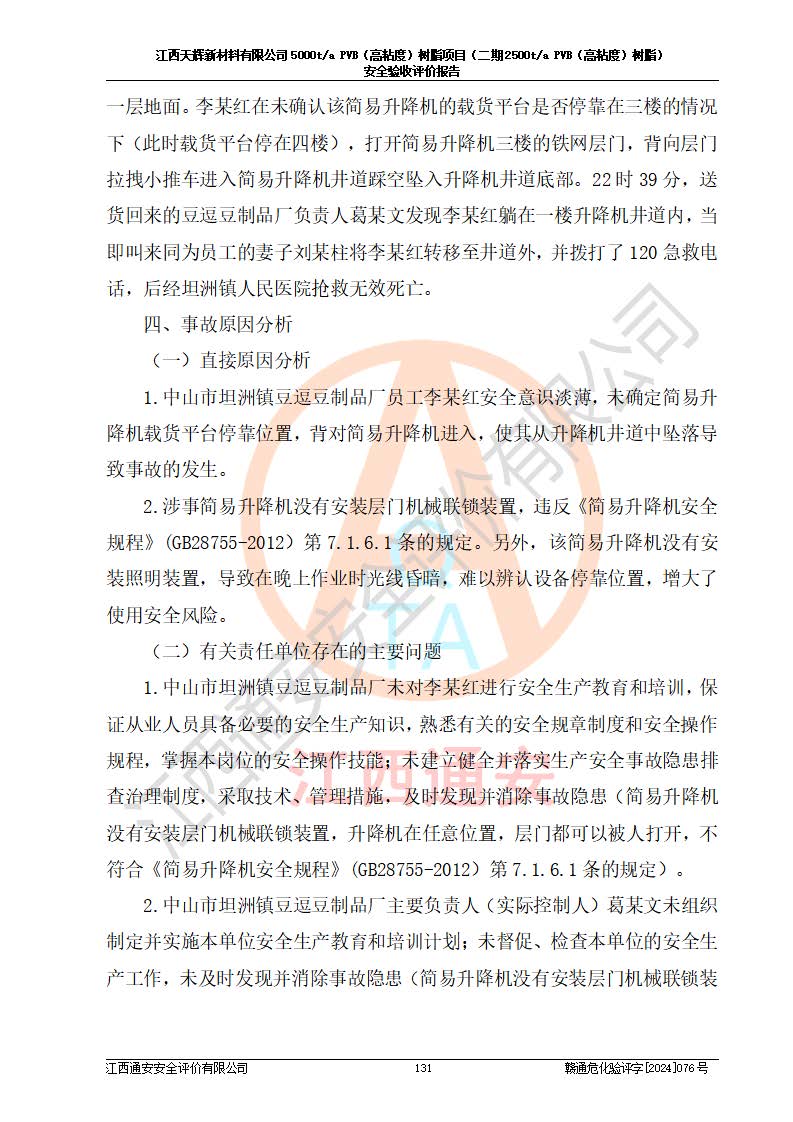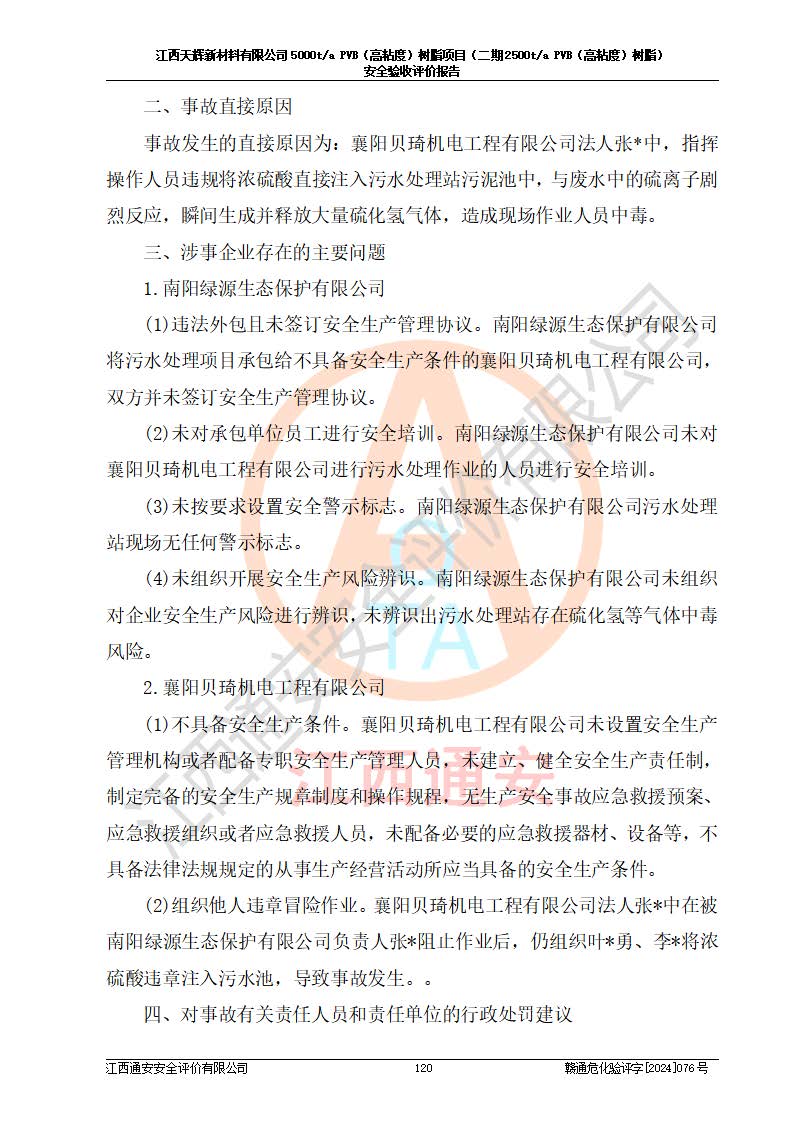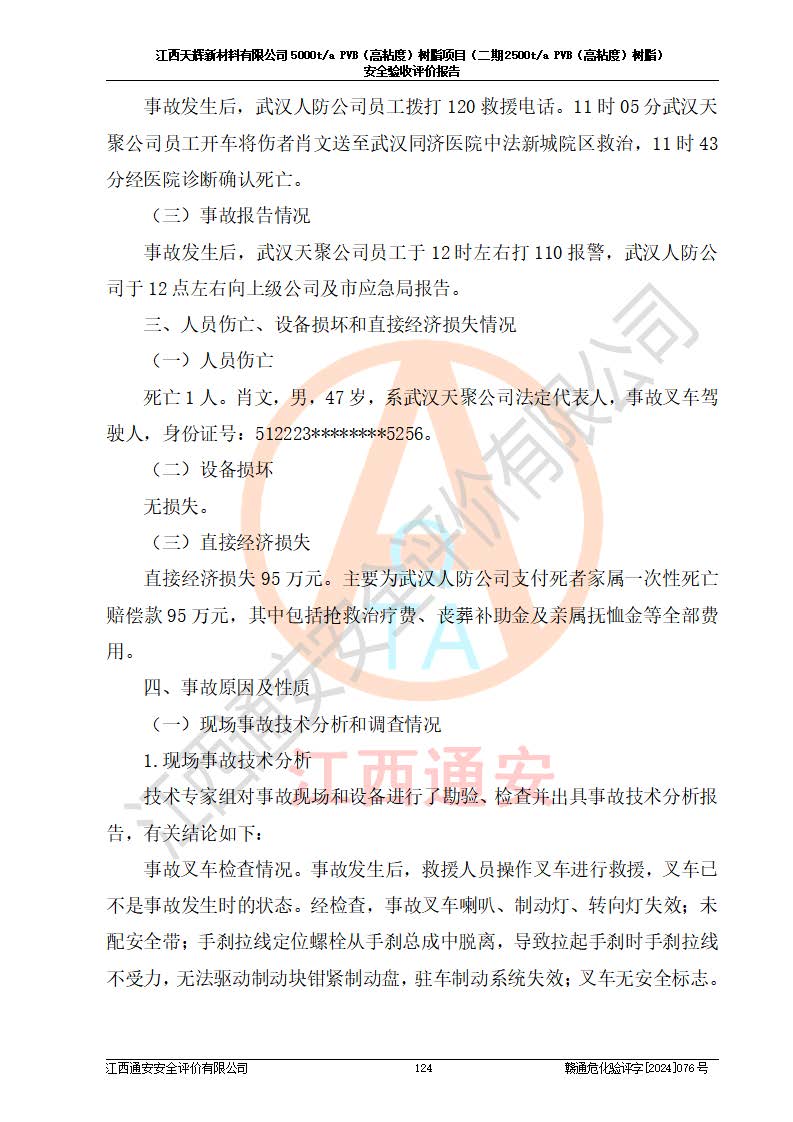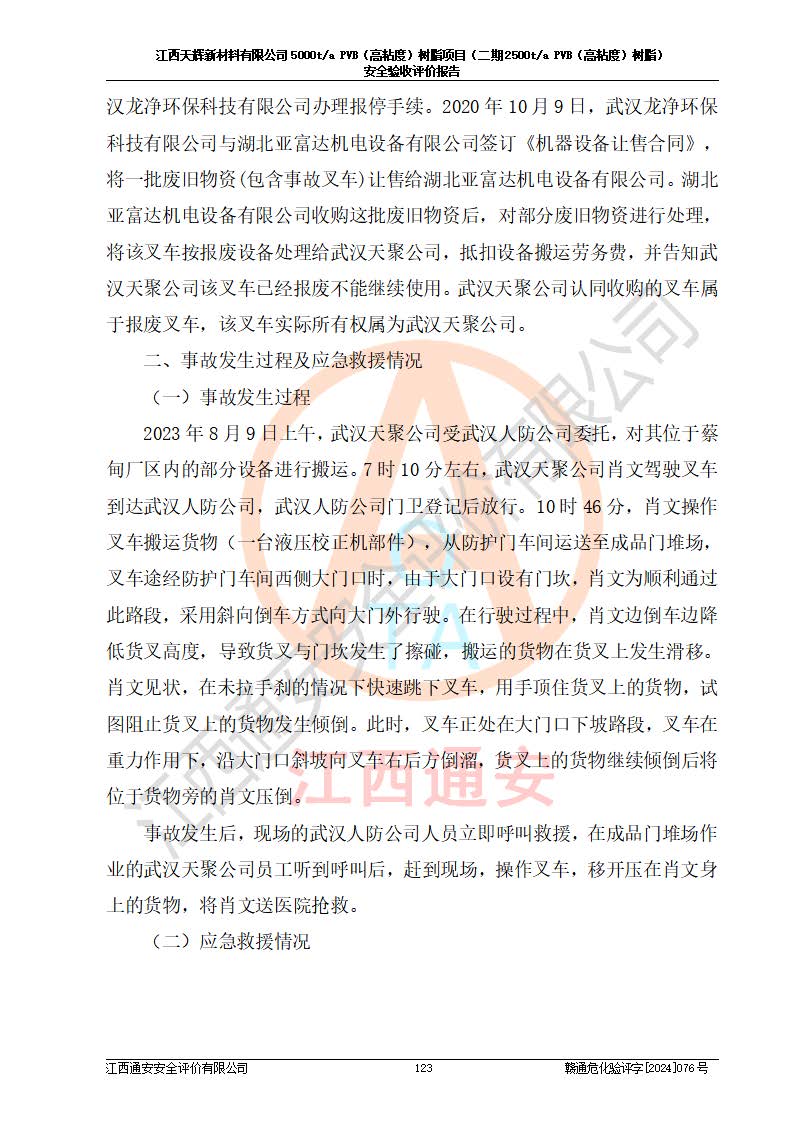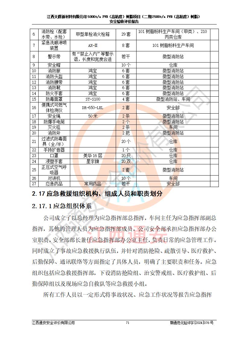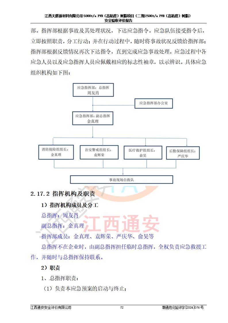 評價報告名稱 | 江西天輝新材料有限公司5000t/a PVB(高粘度)樹脂項目(二期2500t/a PVB(高粘度)樹脂)安全驗收評價報告 | |||