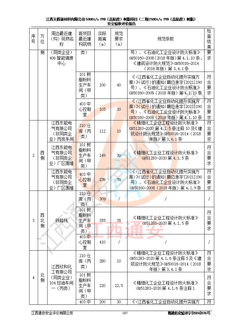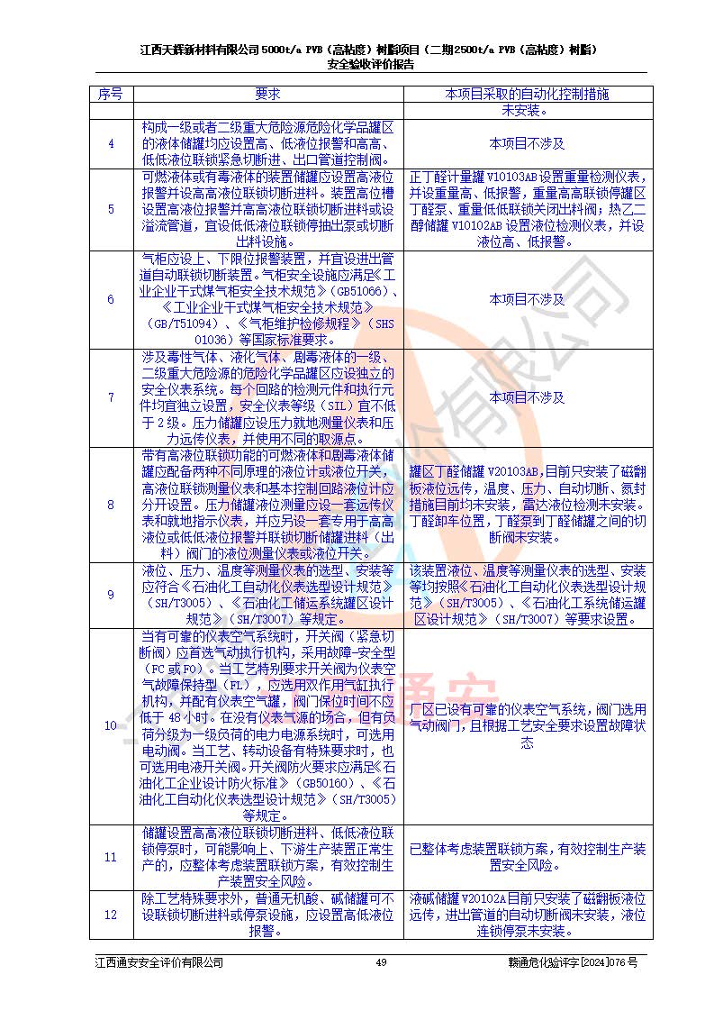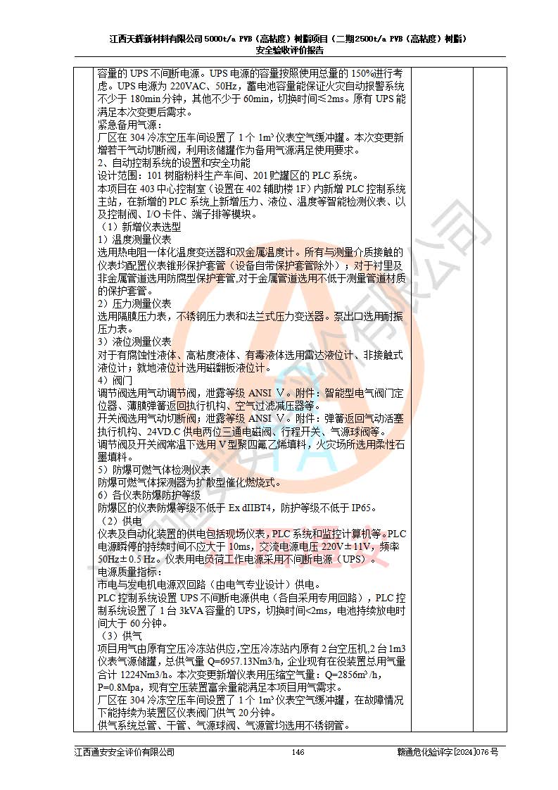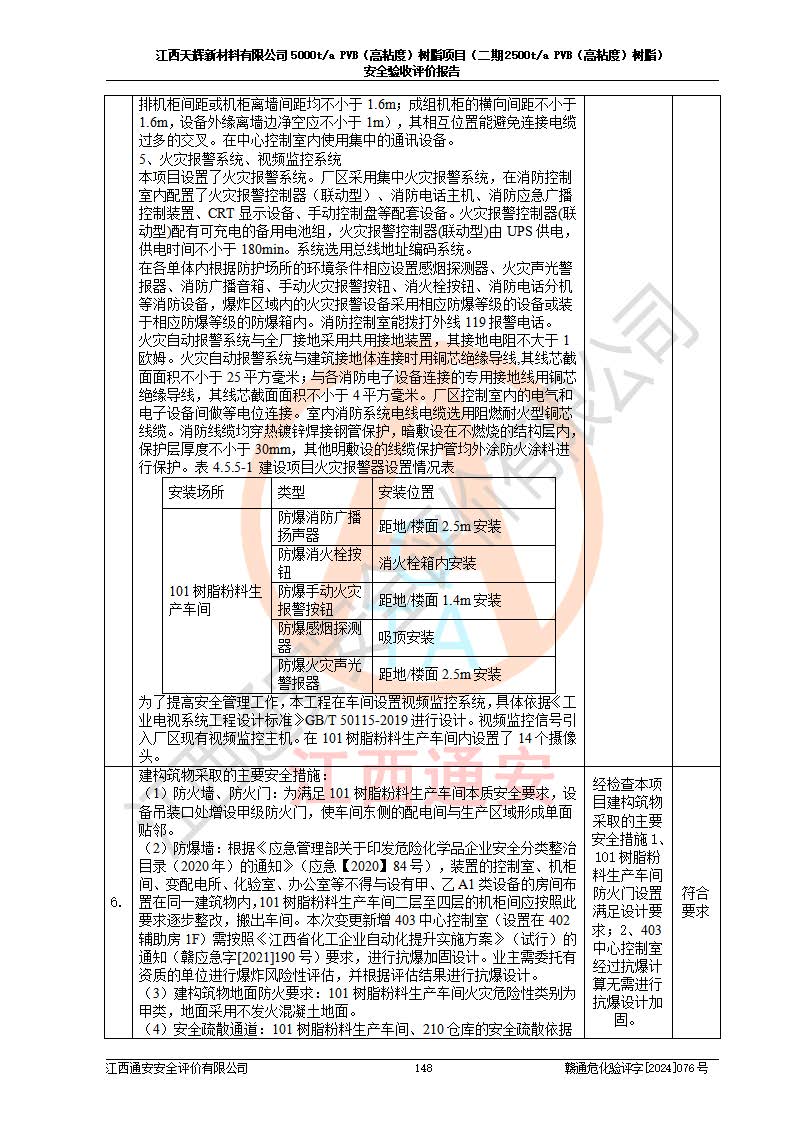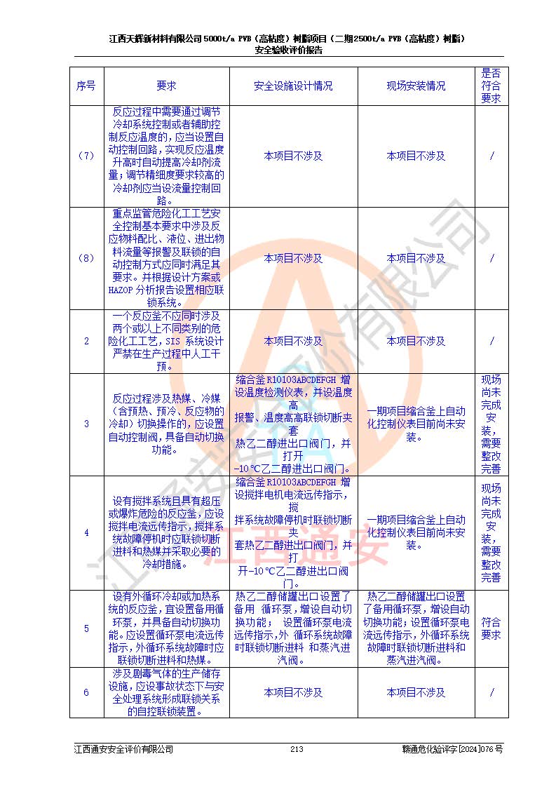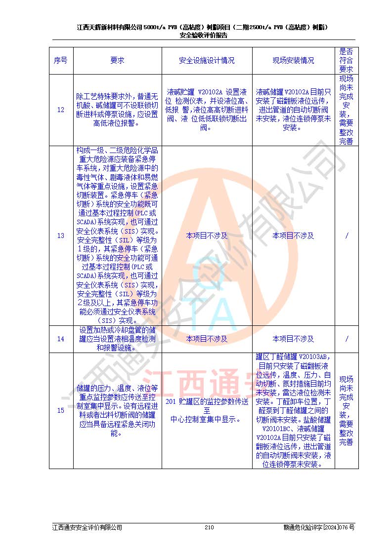 評價結(jié)論 | 江西天輝新材料有限公司5000t/a PVB(高粘度)樹脂項目(二期2500t/a PVB(高粘度)樹脂)安全設(shè)施與主體工程同時設(shè)計、同時施工、同時投入生產(chǎn)和使用,符合**有關(guān)建設(shè)項目“三同時”的規(guī)定和要求。江西天輝新材料有限公司5000t/a PVB(高粘度)樹脂項目(二期2500t/a PVB(高粘度)樹脂)符合新干縣化工園區(qū)發(fā)展規(guī)劃的布局;該項目現(xiàn)場情況、企業(yè)總平面布置、設(shè)備設(shè)施的布置與設(shè)計圖、竣工圖紙基本一致,主體工程安全設(shè)施、安全措施符合法律法規(guī)的規(guī)定和要求,安全設(shè)施正常投用并運行**;供配電、給排水、供熱、供冷、供氣等公用工程及輔助設(shè)施滿足主體工程生產(chǎn)安全的需要;企業(yè)安全管理體系滿足生產(chǎn)安全的要求;總平面布置基本符合《建筑設(shè)計防火規(guī)范》(2018年版)GB50016-2014、《精細化工企業(yè)工程設(shè)計防火標準》GB51283-2020等標準、規(guī)范的要求。;公司已針對本報告提出的安全隱患整改意見組織人員進行整改,整改措施已落實到位,企業(yè)安全生產(chǎn)的風(fēng)險控制在可以接受的范圍內(nèi)。 該項目采用成熟的生產(chǎn)工藝和設(shè)備,本質(zhì)安全程度較高。江西天輝新材料有限公司5000t/a PVB(高粘度)樹脂項目(二期2500t/a PVB(高粘度)樹脂)的生產(chǎn)裝置現(xiàn)場情況與設(shè)計圖紙一致,自動化控制系統(tǒng)滿足《江西省化工企業(yè)自動化提升實施方案(試行)》(贛應(yīng)急字[2021]190號)、江西省應(yīng)急廳辦公室關(guān)于進一步推動危險化學(xué)品(化工)企業(yè)自動化改造提升的通知(贛應(yīng)急辦字[2023]77號)的要求,安全設(shè)施及安全管理符合**及有關(guān)部門關(guān)于安全生產(chǎn)法律、法規(guī)、標準的要求,安全風(fēng)險是可控的,其風(fēng)險程度是可以接受的,符合安全生產(chǎn)條件,能夠滿足安全生產(chǎn)的要求,基本具備安全設(shè)施“三同時”驗收條件。 | |||