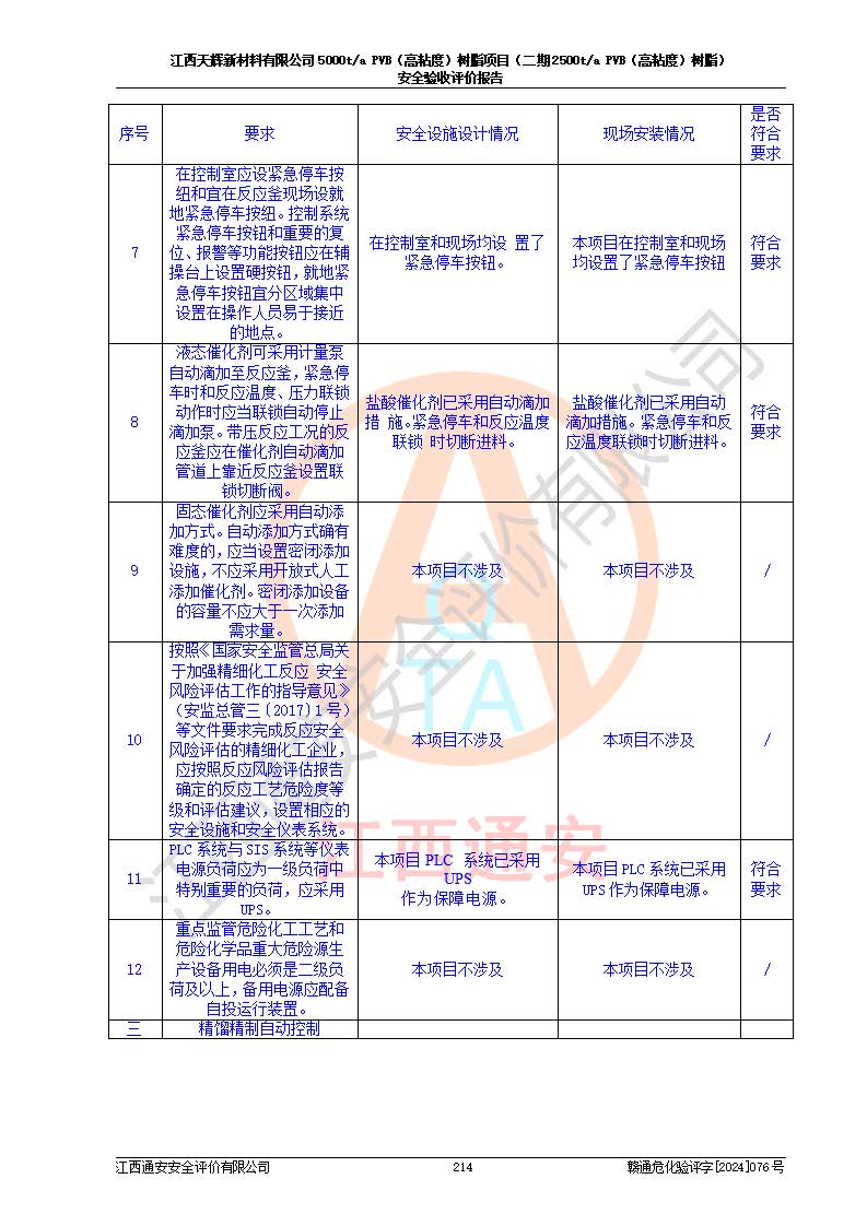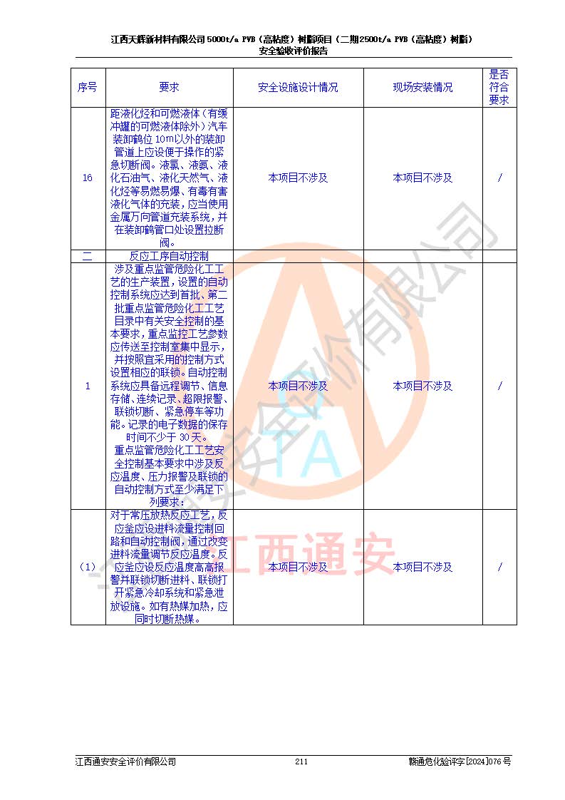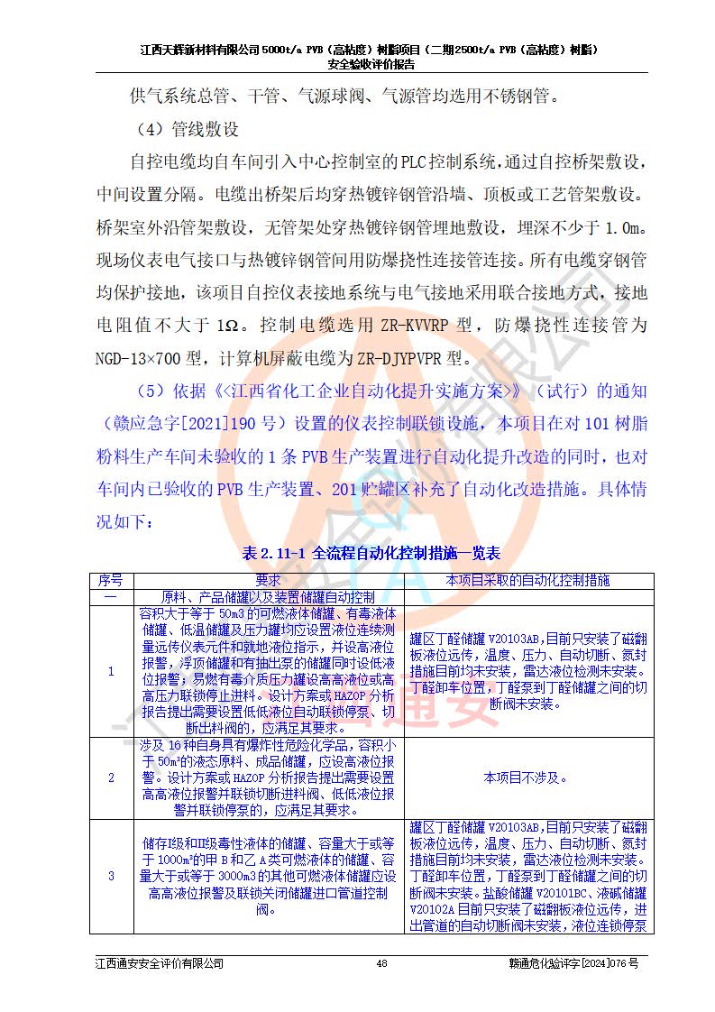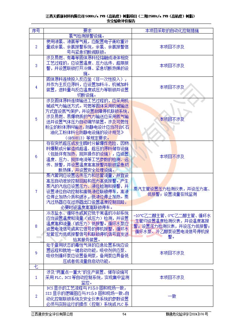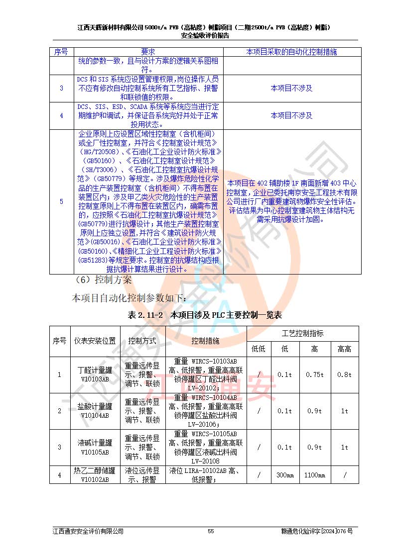 評價結(jié)論 | 江西天輝新材料有限公司5000t/a PVB(高粘度)樹脂項目(二期2500t/a PVB(高粘度)樹脂)安全設(shè)施與主體工程同時設(shè)計、同時施工、同時投入生產(chǎn)和使用,符合**有關(guān)建設(shè)項目“三同時”的規(guī)定和要求。江西天輝新材料有限公司5000t/a PVB(高粘度)樹脂項目(二期2500t/a PVB(高粘度)樹脂)符合新干縣化工園區(qū)發(fā)展規(guī)劃的布局;該項目現(xiàn)場情況、企業(yè)總平面布置、設(shè)備設(shè)施的布置與設(shè)計圖、竣工圖紙基本一致,主體工程安全設(shè)施、安全措施符合法律法規(guī)的規(guī)定和要求,安全設(shè)施正常投用并運行**;供配電、給排水、供熱、供冷、供氣等公用工程及輔助設(shè)施滿足主體工程生產(chǎn)安全的需要;企業(yè)安全管理體系滿足生產(chǎn)安全的要求;總平面布置基本符合《建筑設(shè)計防火規(guī)范》(2018年版)GB50016-2014、《精細化工企業(yè)工程設(shè)計防火標準》GB51283-2020等標準、規(guī)范的要求。;公司已針對本報告提出的安全隱患整改意見組織人員進行整改,整改措施已落實到位,企業(yè)安全生產(chǎn)的風(fēng)險控制在可以接受的范圍內(nèi)。 該項目采用成熟的生產(chǎn)工藝和設(shè)備,本質(zhì)安全程度較高。江西天輝新材料有限公司5000t/a PVB(高粘度)樹脂項目(二期2500t/a PVB(高粘度)樹脂)的生產(chǎn)裝置現(xiàn)場情況與設(shè)計圖紙一致,自動化控制系統(tǒng)滿足《江西省化工企業(yè)自動化提升實施方案(試行)》(贛應(yīng)急字[2021]190號)、江西省應(yīng)急廳辦公室關(guān)于進一步推動危險化學(xué)品(化工)企業(yè)自動化改造提升的通知(贛應(yīng)急辦字[2023]77號)的要求,安全設(shè)施及安全管理符合**及有關(guān)部門關(guān)于安全生產(chǎn)法律、法規(guī)、標準的要求,安全風(fēng)險是可控的,其風(fēng)險程度是可以接受的,符合安全生產(chǎn)條件,能夠滿足安全生產(chǎn)的要求,基本具備安全設(shè)施“三同時”驗收條件。 | |||