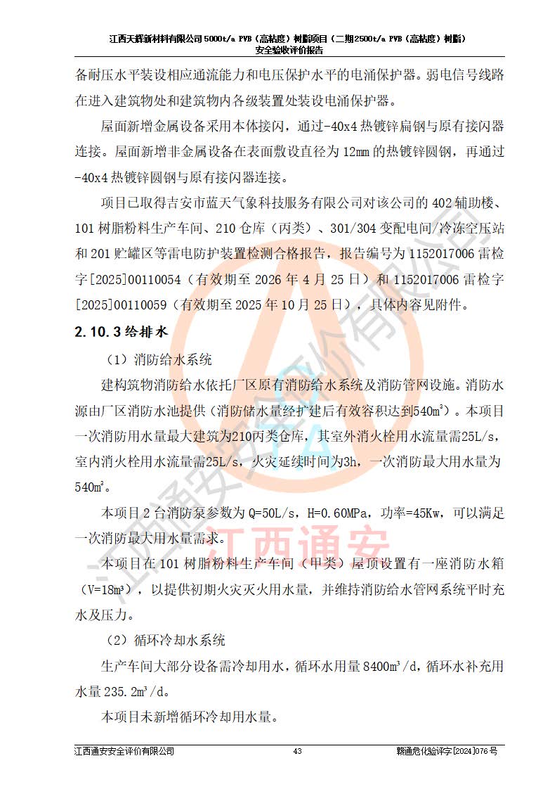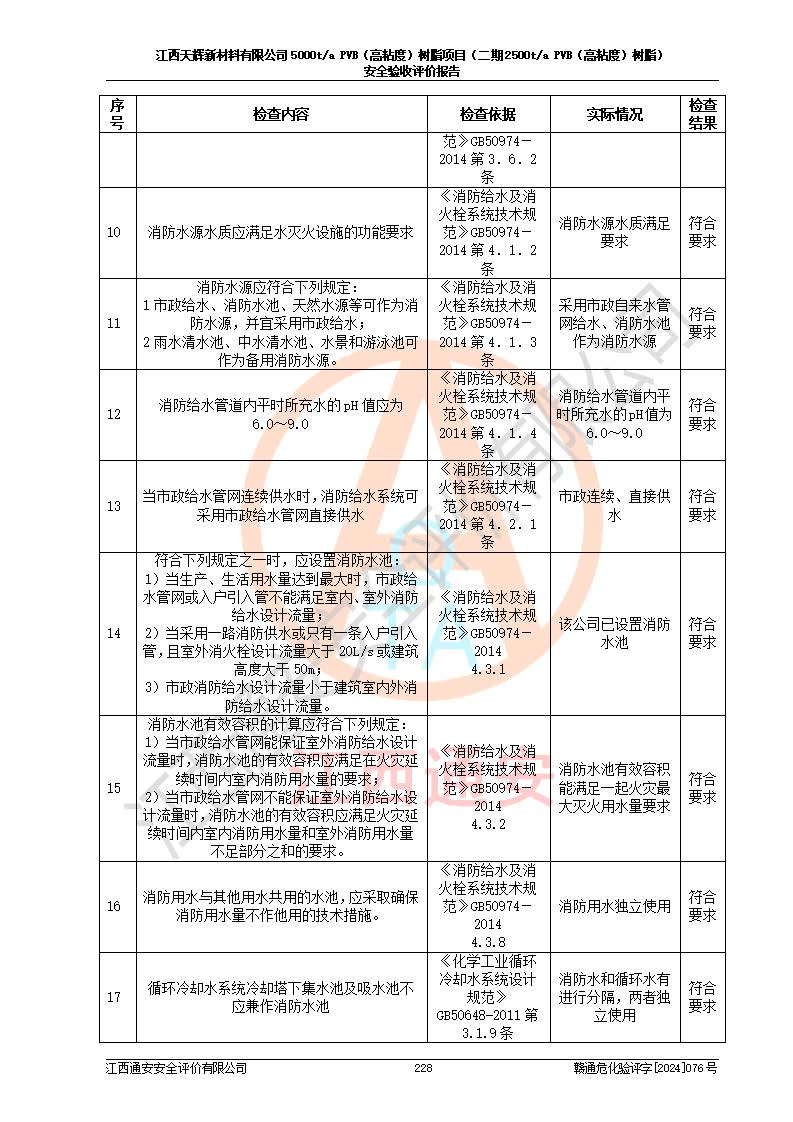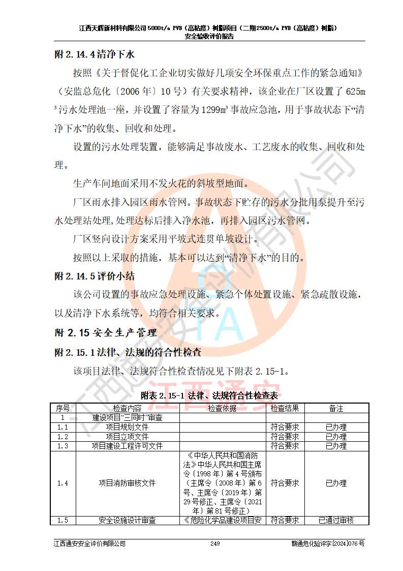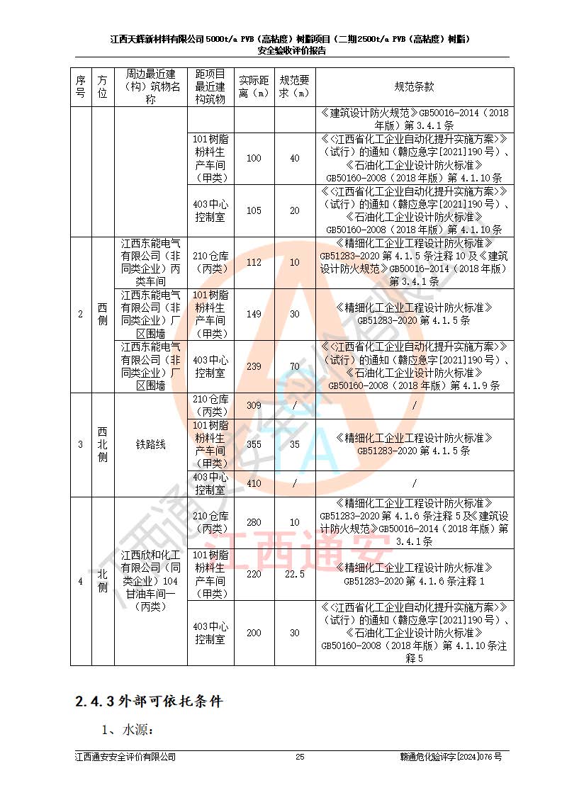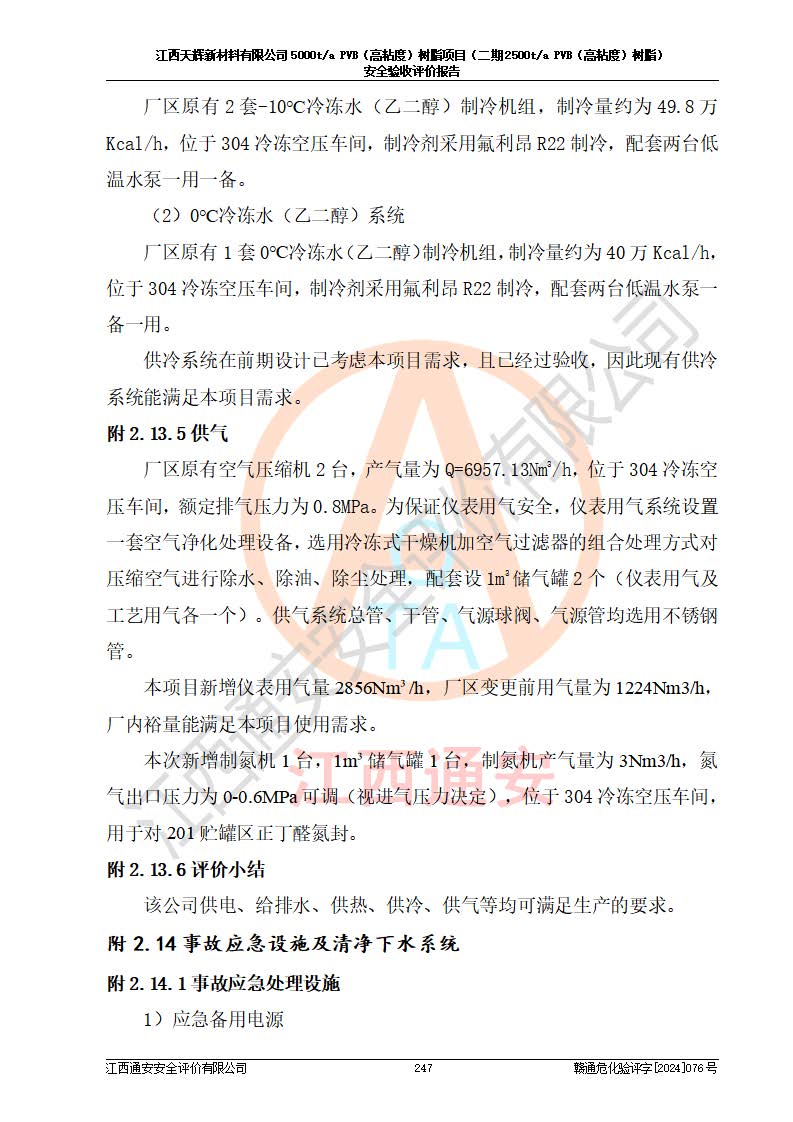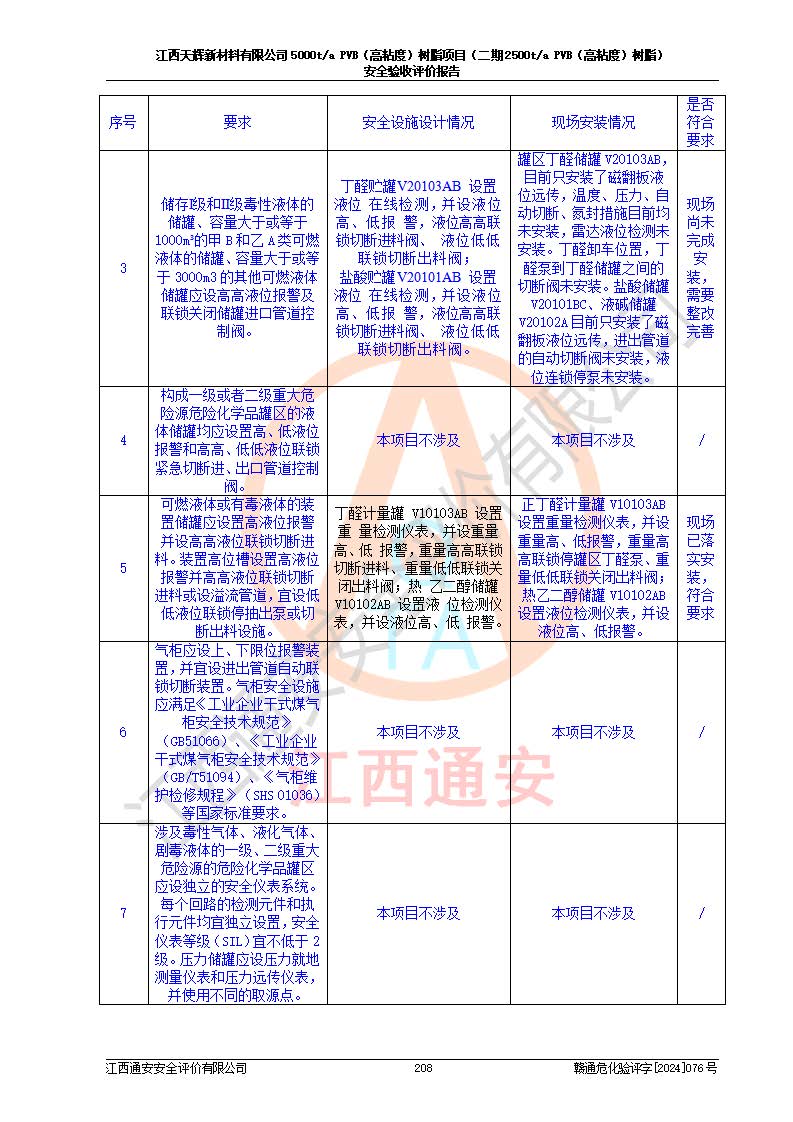 評價結(jié)論 | 江西天輝新材料有限公司5000t/a PVB(高粘度)樹脂項目(二期2500t/a PVB(高粘度)樹脂)安全設(shè)施與主體工程同時設(shè)計、同時施工、同時投入生產(chǎn)和使用,符合**有關(guān)建設(shè)項目“三同時”的規(guī)定和要求。江西天輝新材料有限公司5000t/a PVB(高粘度)樹脂項目(二期2500t/a PVB(高粘度)樹脂)符合新干縣化工園區(qū)發(fā)展規(guī)劃的布局;該項目現(xiàn)場情況、企業(yè)總平面布置、設(shè)備設(shè)施的布置與設(shè)計圖、竣工圖紙基本一致,主體工程安全設(shè)施、安全措施符合法律法規(guī)的規(guī)定和要求,安全設(shè)施正常投用并運行**;供配電、給排水、供熱、供冷、供氣等公用工程及輔助設(shè)施滿足主體工程生產(chǎn)安全的需要;企業(yè)安全管理體系滿足生產(chǎn)安全的要求;總平面布置基本符合《建筑設(shè)計防火規(guī)范》(2018年版)GB50016-2014、《精細化工企業(yè)工程設(shè)計防火標準》GB51283-2020等標準、規(guī)范的要求。;公司已針對本報告提出的安全隱患整改意見組織人員進行整改,整改措施已落實到位,企業(yè)安全生產(chǎn)的風(fēng)險控制在可以接受的范圍內(nèi)。 該項目采用成熟的生產(chǎn)工藝和設(shè)備,本質(zhì)安全程度較高。江西天輝新材料有限公司5000t/a PVB(高粘度)樹脂項目(二期2500t/a PVB(高粘度)樹脂)的生產(chǎn)裝置現(xiàn)場情況與設(shè)計圖紙一致,自動化控制系統(tǒng)滿足《江西省化工企業(yè)自動化提升實施方案(試行)》(贛應(yīng)急字[2021]190號)、江西省應(yīng)急廳辦公室關(guān)于進一步推動危險化學(xué)品(化工)企業(yè)自動化改造提升的通知(贛應(yīng)急辦字[2023]77號)的要求,安全設(shè)施及安全管理符合**及有關(guān)部門關(guān)于安全生產(chǎn)法律、法規(guī)、標準的要求,安全風(fēng)險是可控的,其風(fēng)險程度是可以接受的,符合安全生產(chǎn)條件,能夠滿足安全生產(chǎn)的要求,基本具備安全設(shè)施“三同時”驗收條件。 | |||