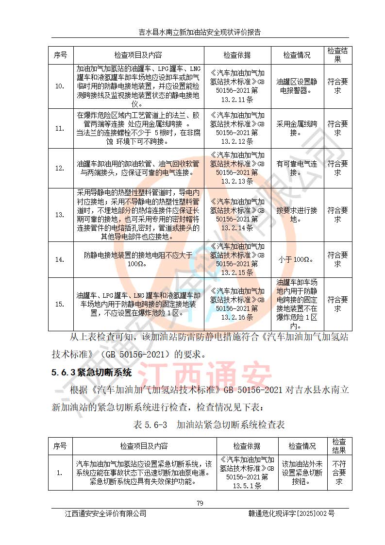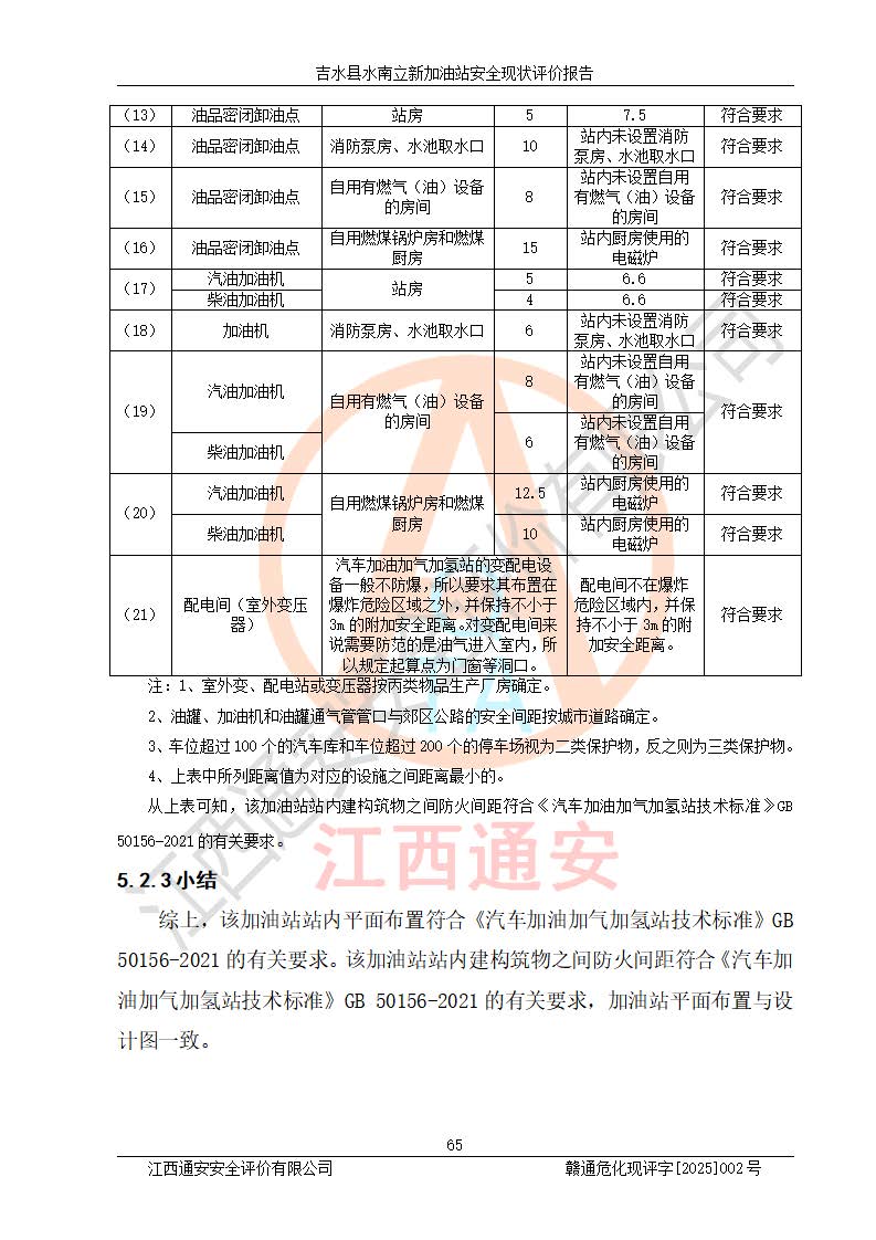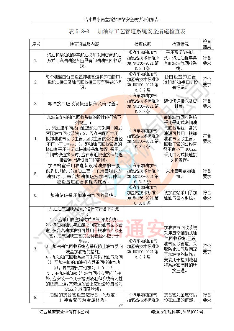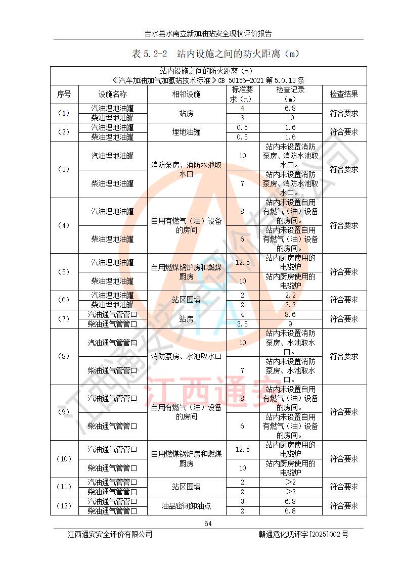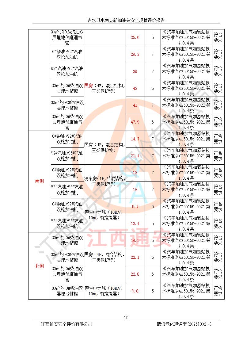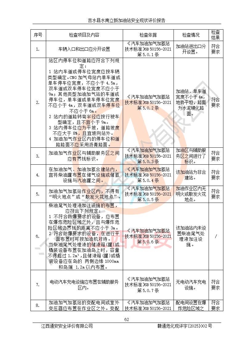 評價結論 | 吉水縣水南立新加油站站址合理,周邊環(huán)境良好,與敏感防護目標間距符合規(guī)范要求,站區(qū)建構筑物之間的防火間距、耐火等級符合標準要求,與總平面布置圖一致,加油卸油工藝及設備設施合理,工藝布置得當,防雷設施經檢測合格,采取的工藝安全設施符合規(guī)范要求;該加油站制定了安全管理制度和操作規(guī)程,人員經培訓合格后上崗,安全管理人員經考核合格并取得安全合格證,主要負責人于2024年05月08日取得安全生產知識和管理能力考核合格證,能按照法律法規(guī)要求開展安全生產管理工作。 吉水縣水南立新加油站符合《汽車加油加氣加氫站技術標準》GB50156-2021等標準規(guī)范的要求,安全風險可控,滿足危險化學品經營的安全條件。 | |||