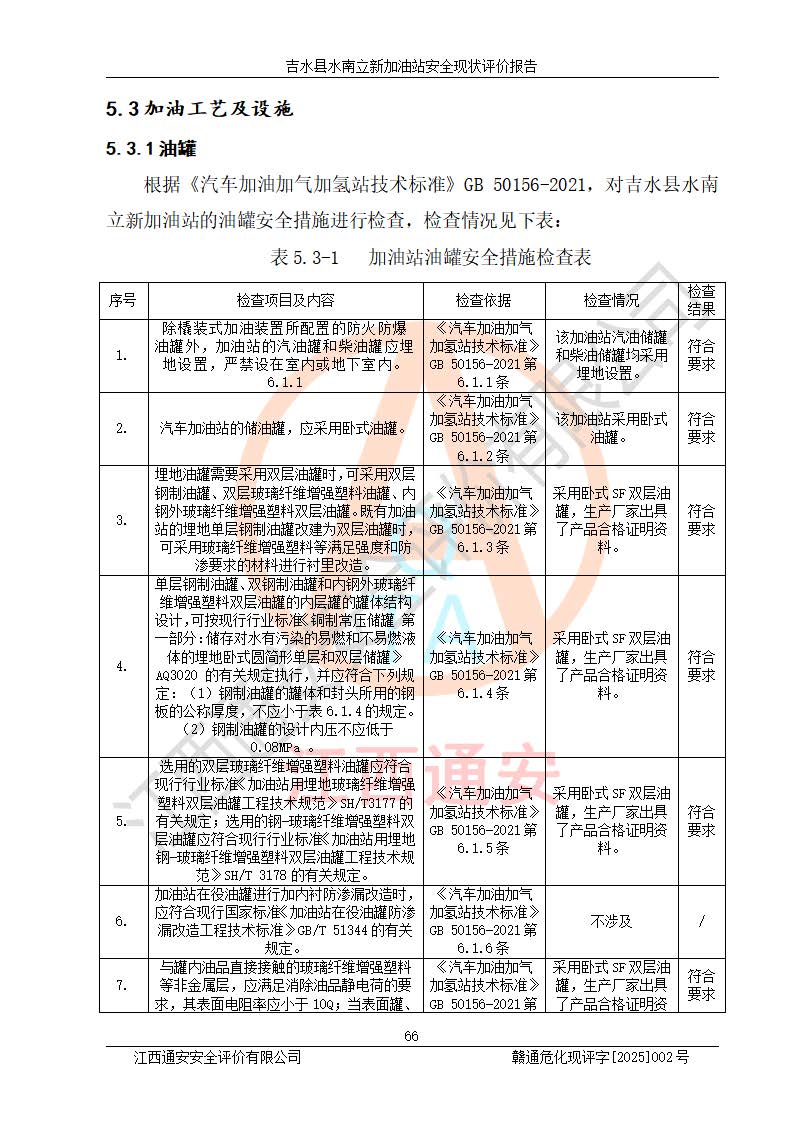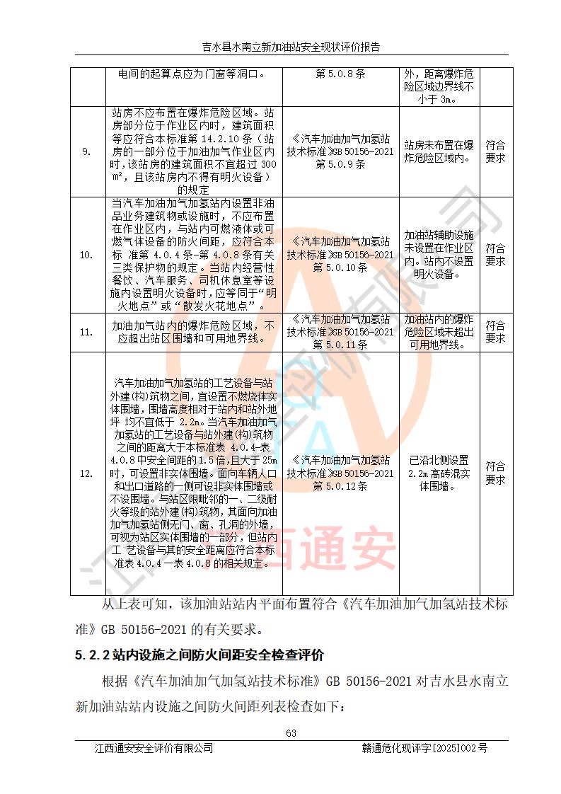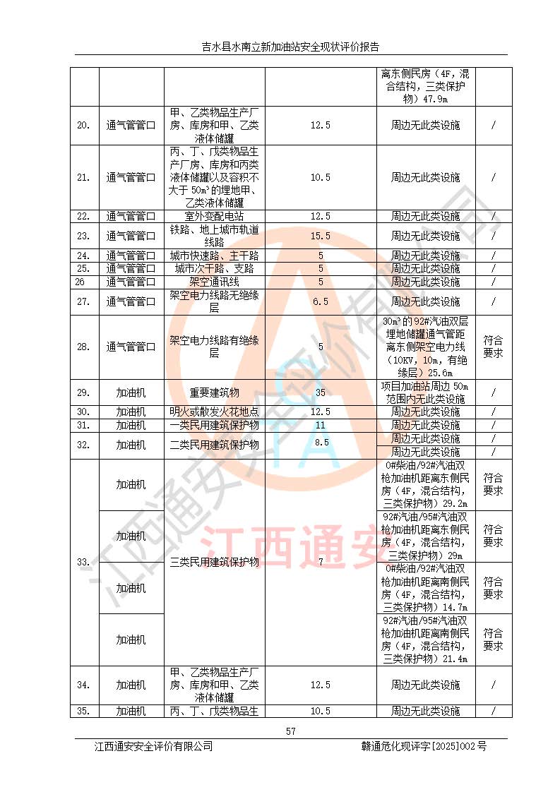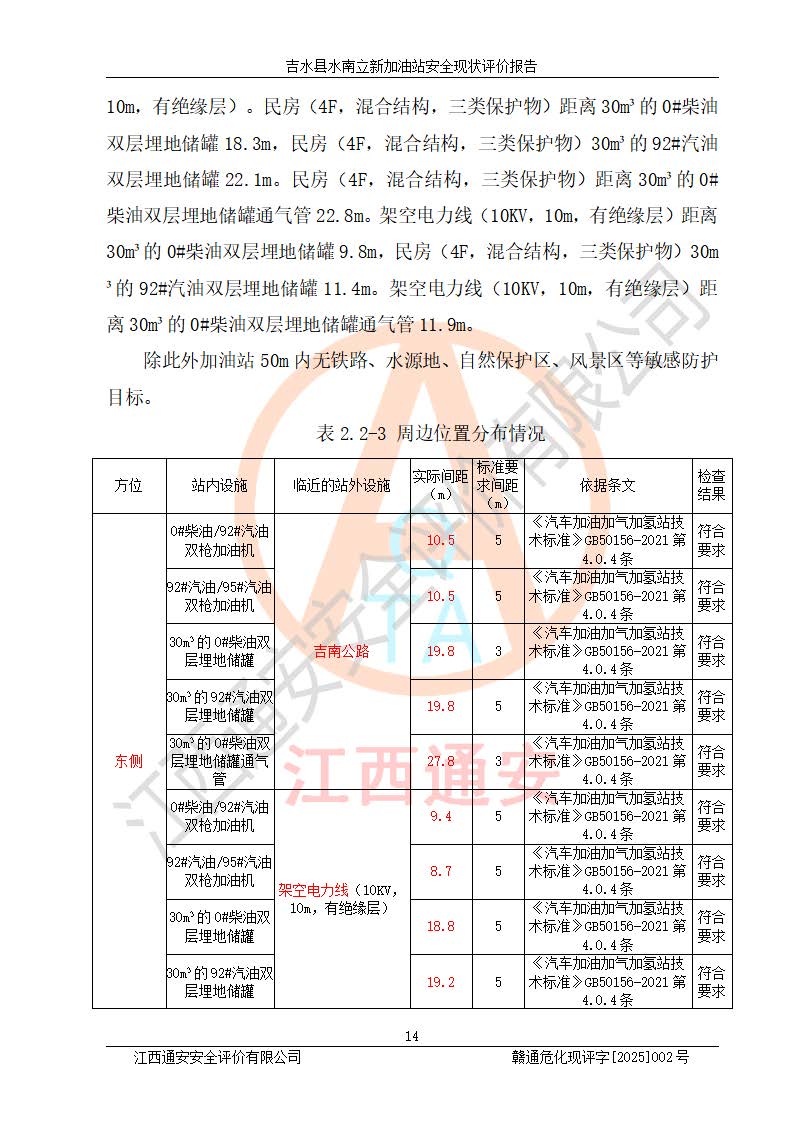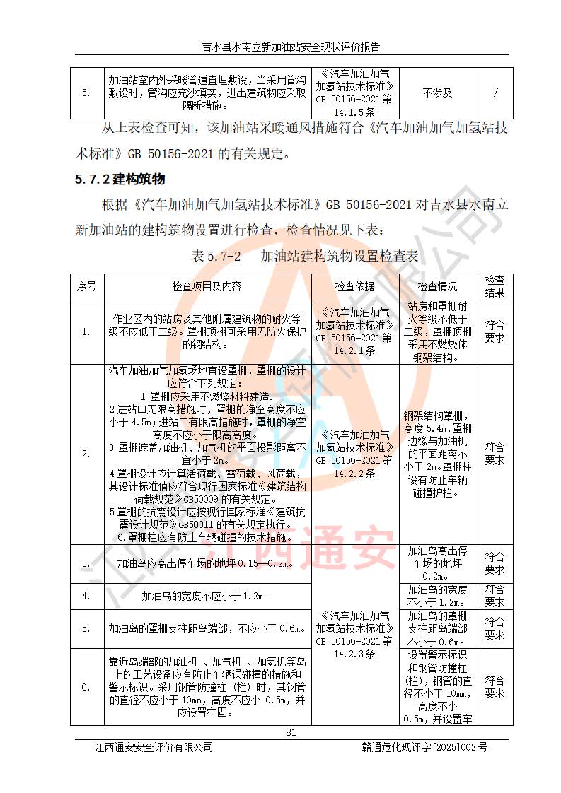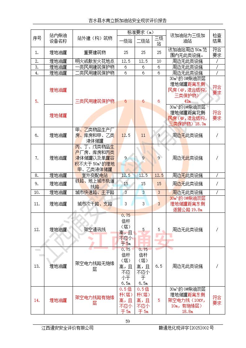 評價結論 | 吉水縣水南立新加油站站址合理,周邊環(huán)境良好,與敏感防護目標間距符合規(guī)范要求,站區(qū)建構筑物之間的防火間距、耐火等級符合標準要求,與總平面布置圖一致,加油卸油工藝及設備設施合理,工藝布置得當,防雷設施經檢測合格,采取的工藝安全設施符合規(guī)范要求;該加油站制定了安全管理制度和操作規(guī)程,人員經培訓合格后上崗,安全管理人員經考核合格并取得安全合格證,主要負責人于2024年05月08日取得安全生產知識和管理能力考核合格證,能按照法律法規(guī)要求開展安全生產管理工作。 吉水縣水南立新加油站符合《汽車加油加氣加氫站技術標準》GB50156-2021等標準規(guī)范的要求,安全風險可控,滿足危險化學品經營的安全條件。 | |||