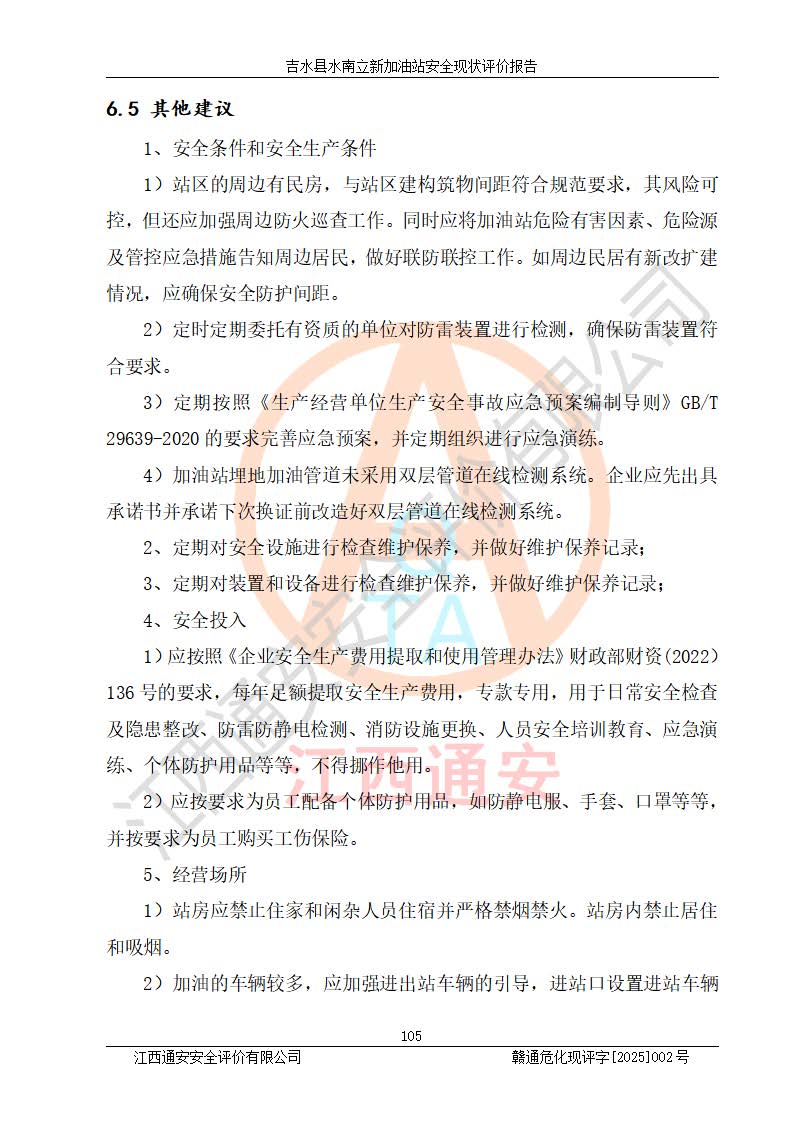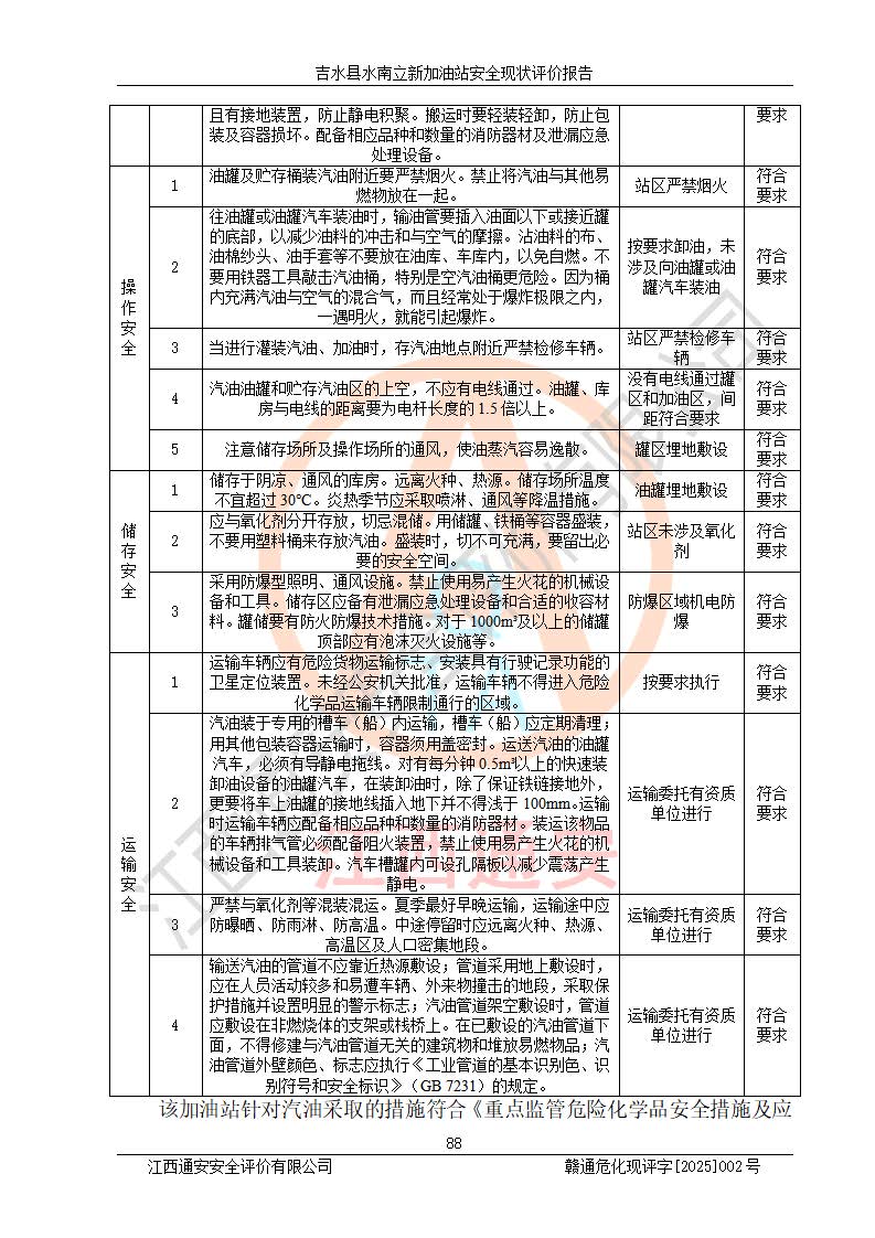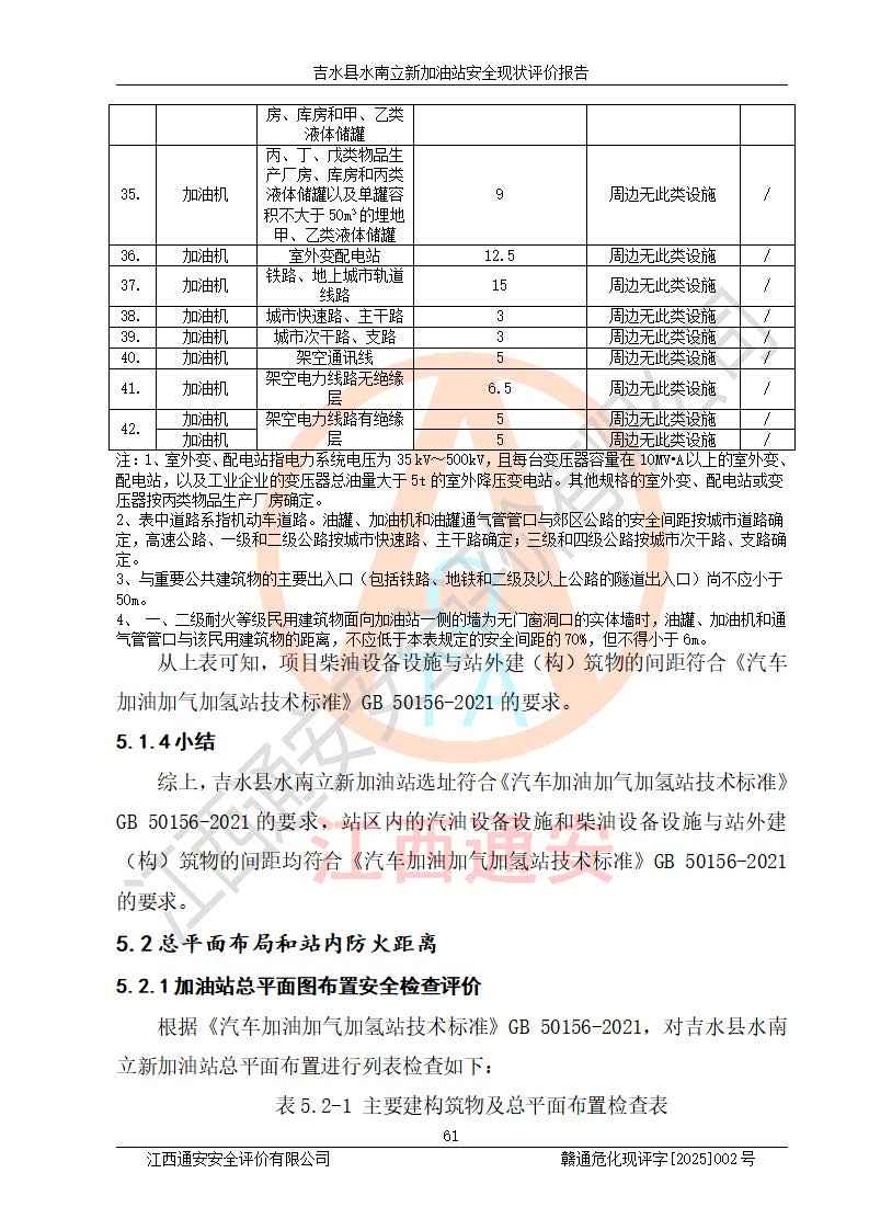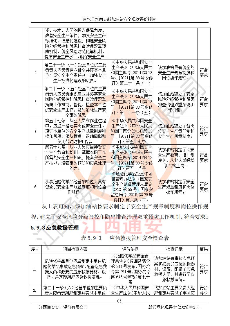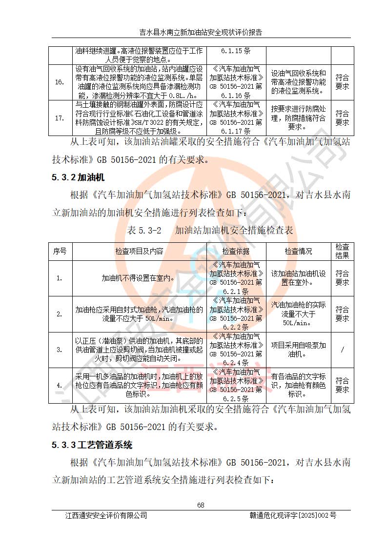 評價結論 | 吉水縣水南立新加油站站址合理,周邊環(huán)境良好,與敏感防護目標間距符合規(guī)范要求,站區(qū)建構筑物之間的防火間距、耐火等級符合標準要求,與總平面布置圖一致,加油卸油工藝及設備設施合理,工藝布置得當,防雷設施經檢測合格,采取的工藝安全設施符合規(guī)范要求;該加油站制定了安全管理制度和操作規(guī)程,人員經培訓合格后上崗,安全管理人員經考核合格并取得安全合格證,主要負責人于2024年05月08日取得安全生產知識和管理能力考核合格證,能按照法律法規(guī)要求開展安全生產管理工作。 吉水縣水南立新加油站符合《汽車加油加氣加氫站技術標準》GB50156-2021等標準規(guī)范的要求,安全風險可控,滿足危險化學品經營的安全條件。 | |||