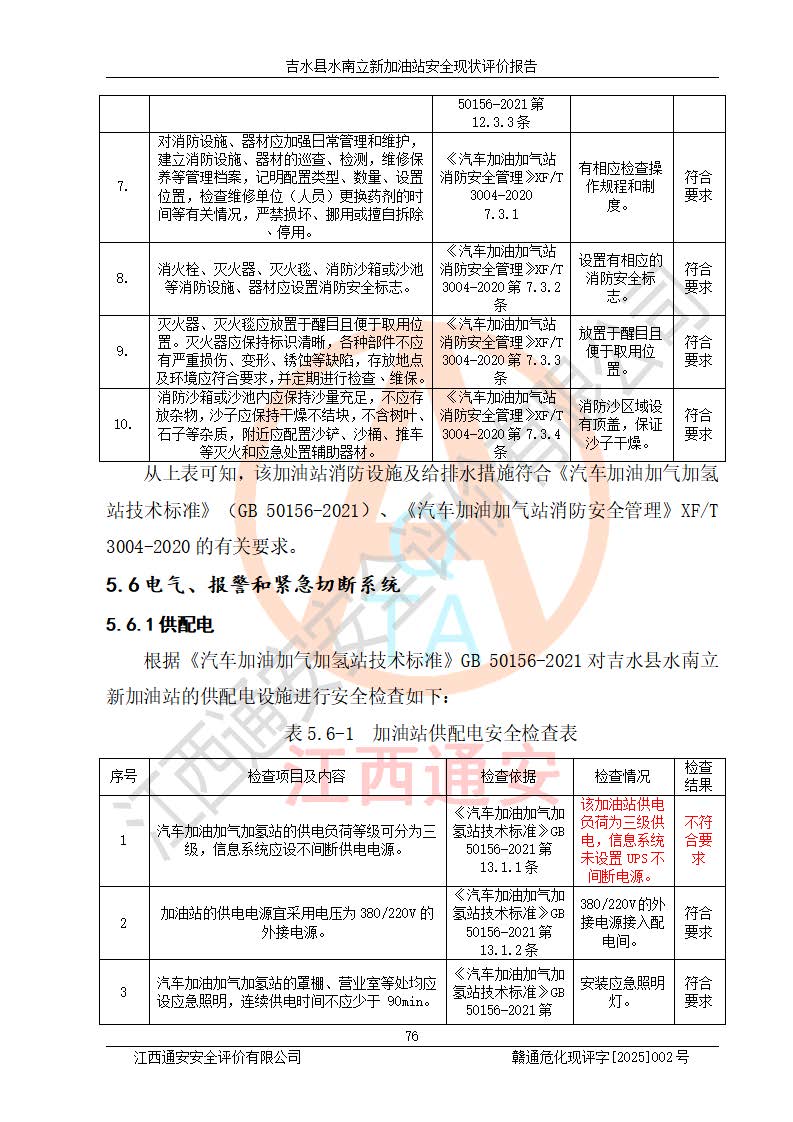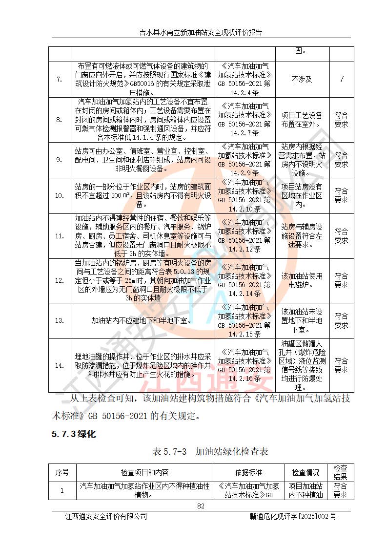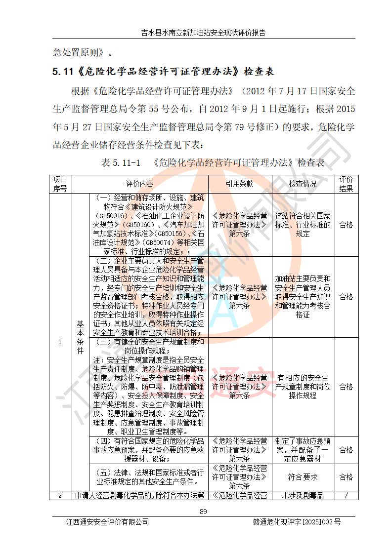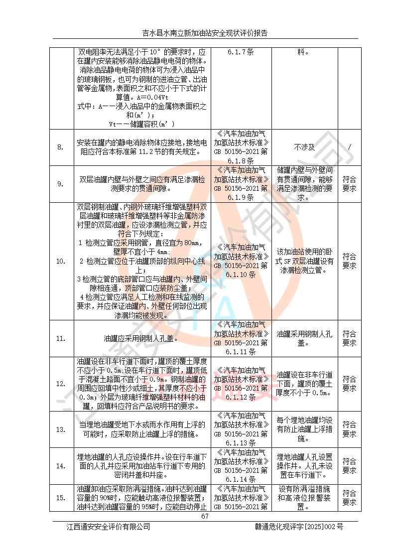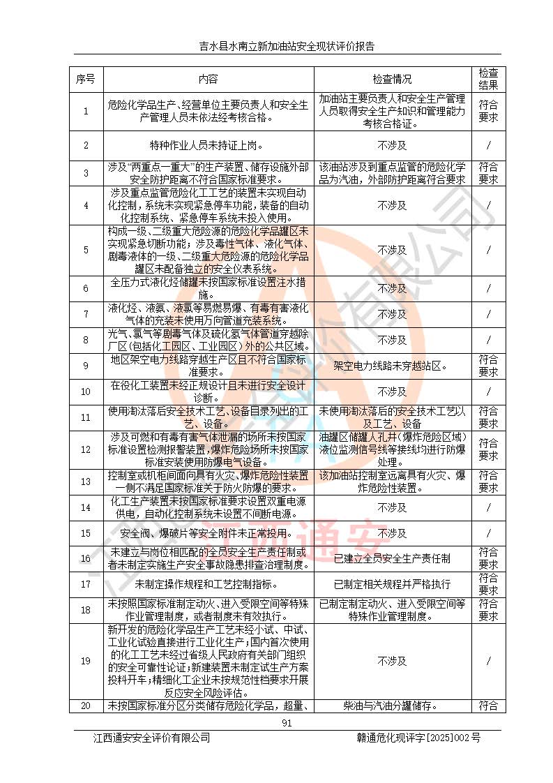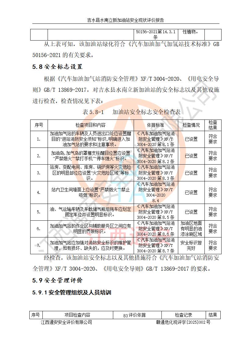 評價結論 | 吉水縣水南立新加油站站址合理,周邊環(huán)境良好,與敏感防護目標間距符合規(guī)范要求,站區(qū)建構筑物之間的防火間距、耐火等級符合標準要求,與總平面布置圖一致,加油卸油工藝及設備設施合理,工藝布置得當,防雷設施經檢測合格,采取的工藝安全設施符合規(guī)范要求;該加油站制定了安全管理制度和操作規(guī)程,人員經培訓合格后上崗,安全管理人員經考核合格并取得安全合格證,主要負責人于2024年05月08日取得安全生產知識和管理能力考核合格證,能按照法律法規(guī)要求開展安全生產管理工作。 吉水縣水南立新加油站符合《汽車加油加氣加氫站技術標準》GB50156-2021等標準規(guī)范的要求,安全風險可控,滿足危險化學品經營的安全條件。 | |||