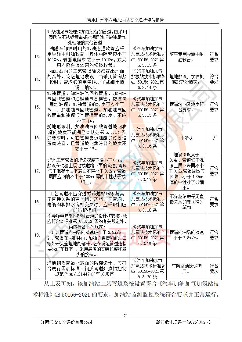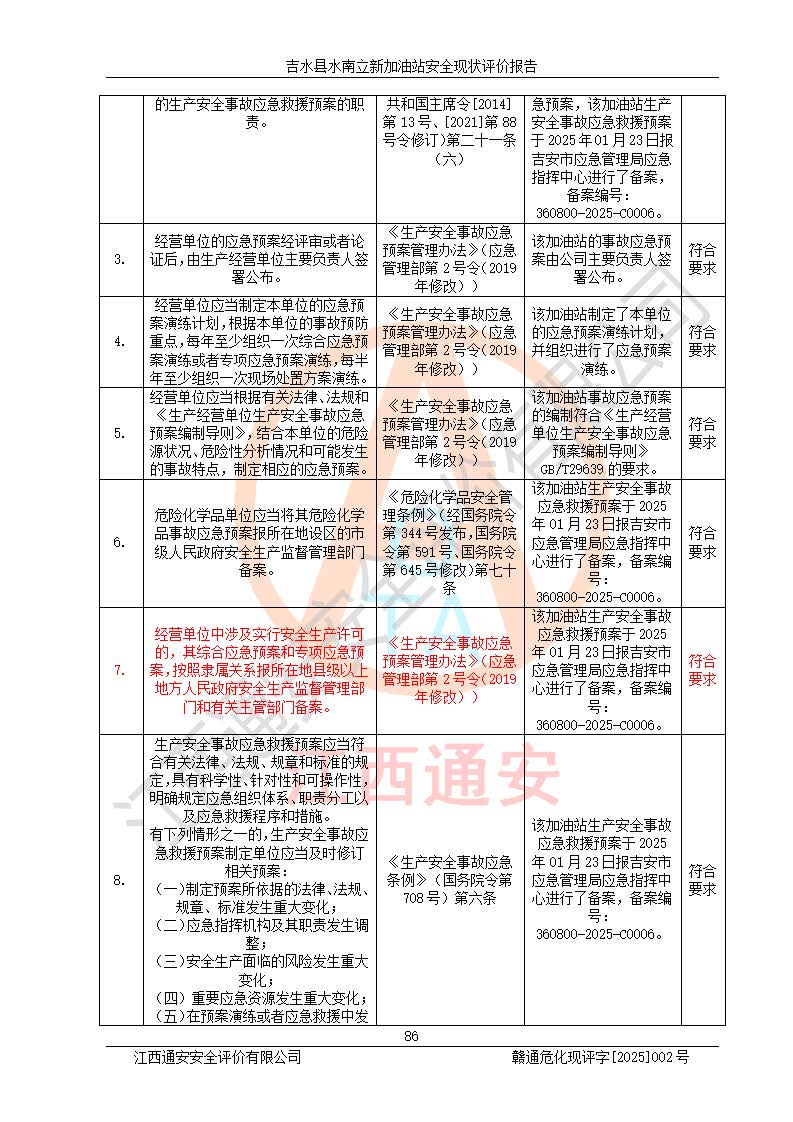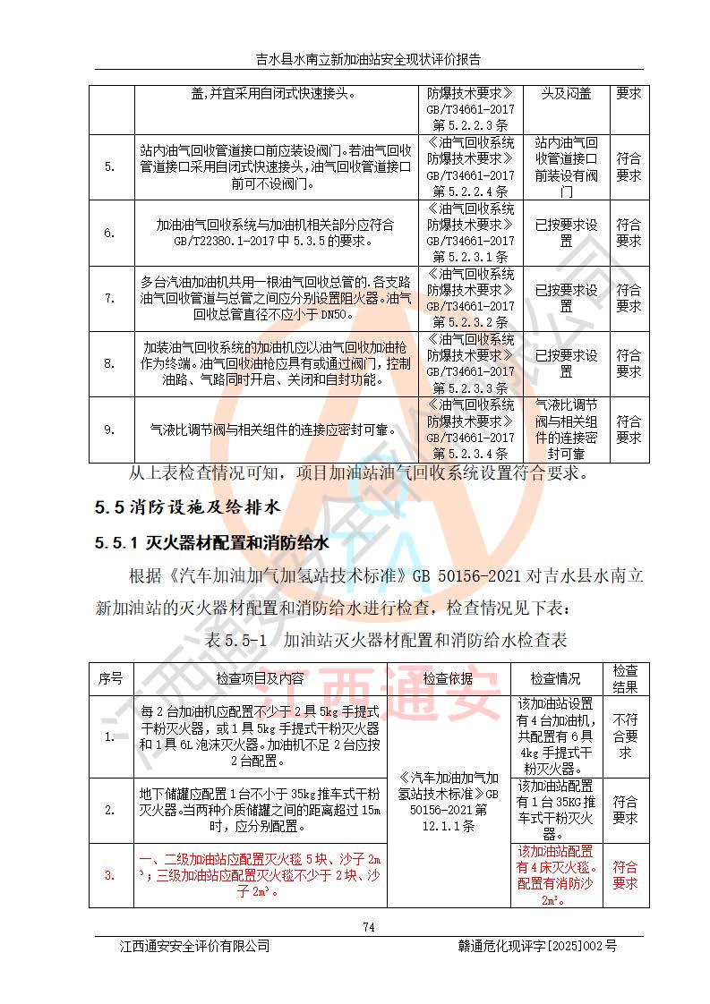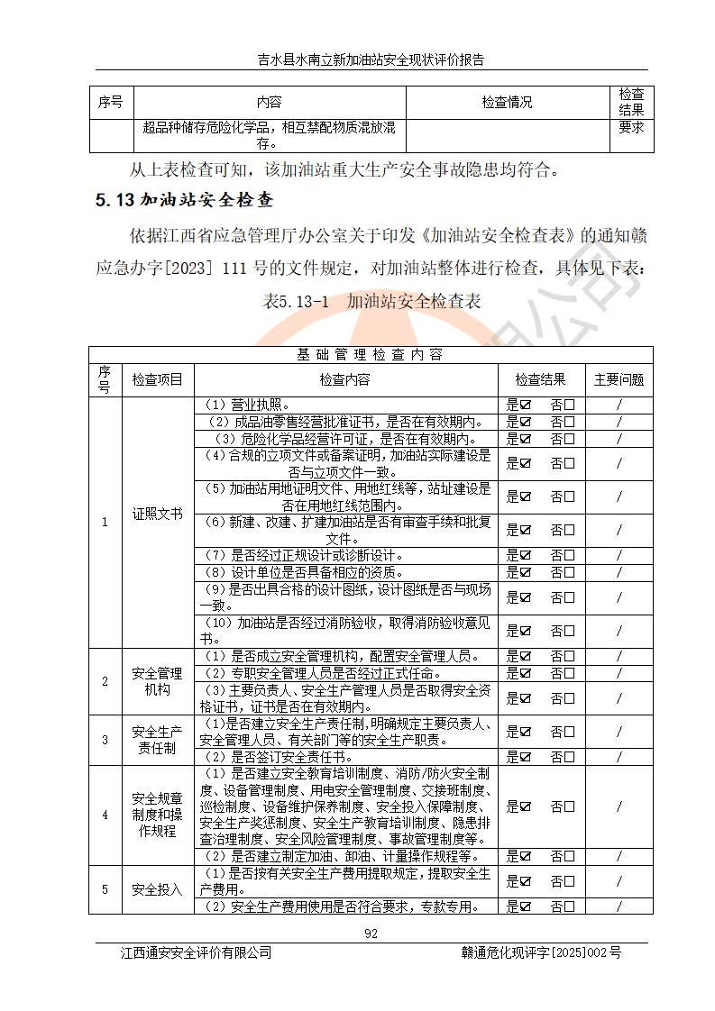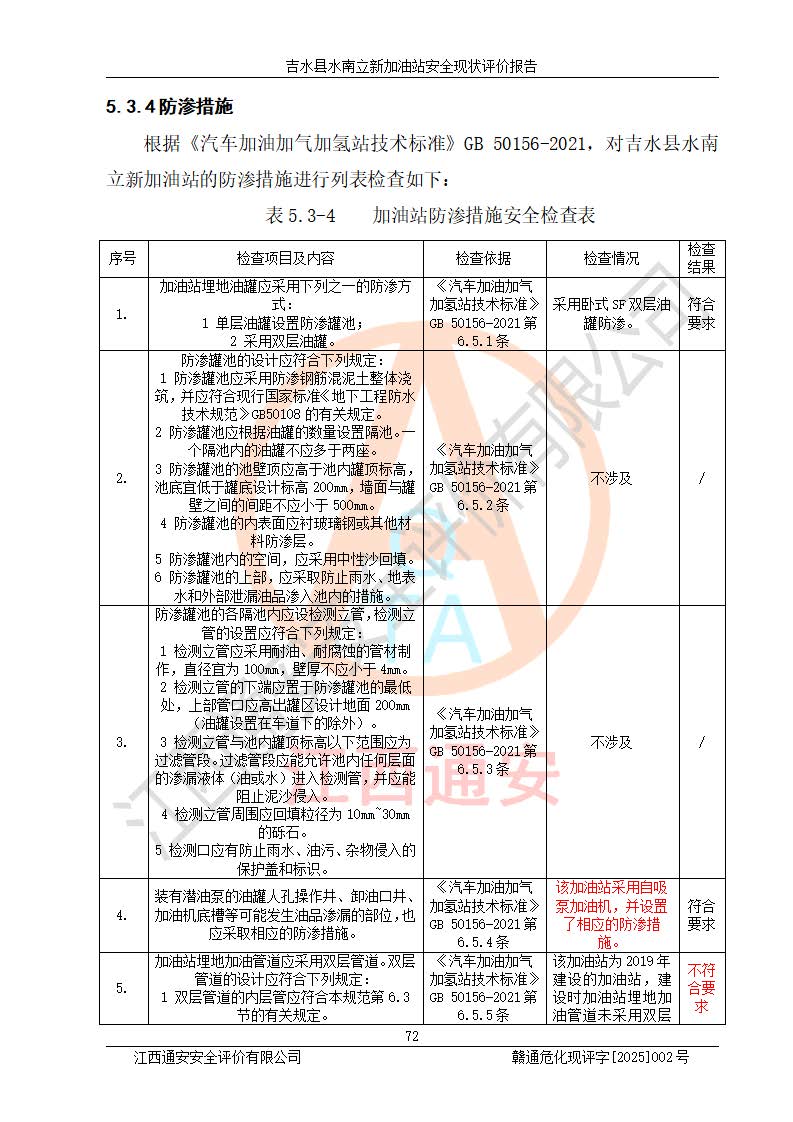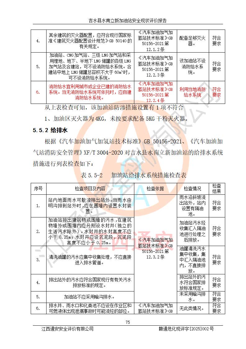 評價結論 | 吉水縣水南立新加油站站址合理,周邊環(huán)境良好,與敏感防護目標間距符合規(guī)范要求,站區(qū)建構筑物之間的防火間距、耐火等級符合標準要求,與總平面布置圖一致,加油卸油工藝及設備設施合理,工藝布置得當,防雷設施經檢測合格,采取的工藝安全設施符合規(guī)范要求;該加油站制定了安全管理制度和操作規(guī)程,人員經培訓合格后上崗,安全管理人員經考核合格并取得安全合格證,主要負責人于2024年05月08日取得安全生產知識和管理能力考核合格證,能按照法律法規(guī)要求開展安全生產管理工作。 吉水縣水南立新加油站符合《汽車加油加氣加氫站技術標準》GB50156-2021等標準規(guī)范的要求,安全風險可控,滿足危險化學品經營的安全條件。 | |||