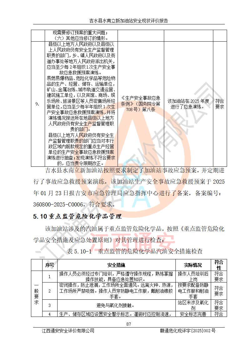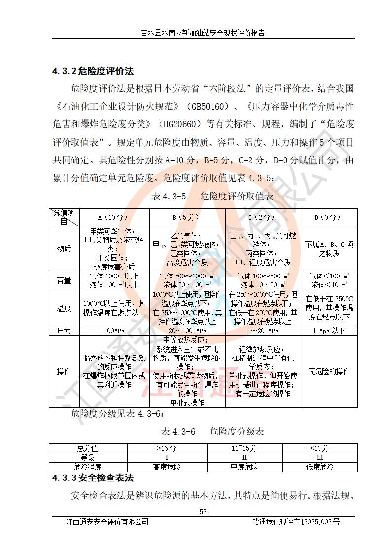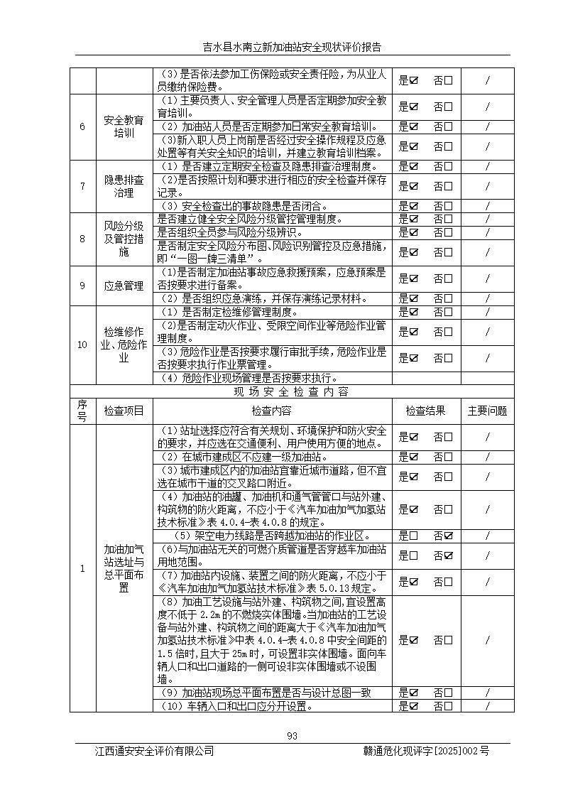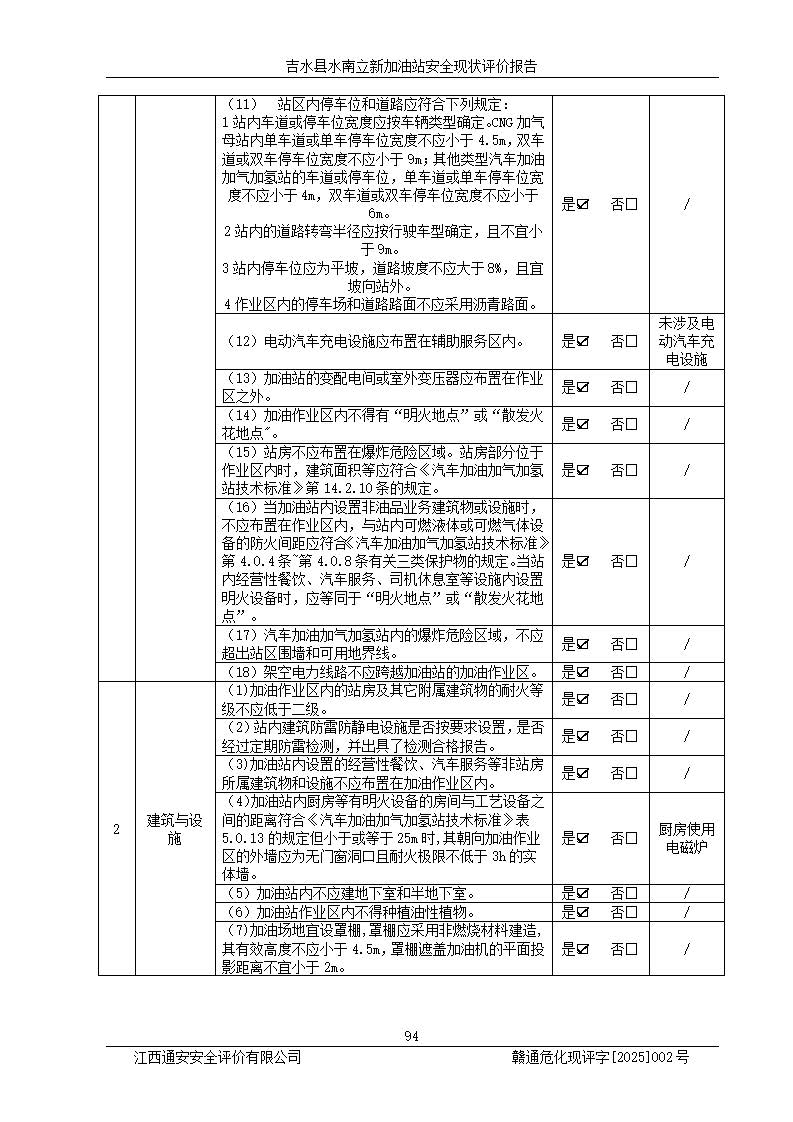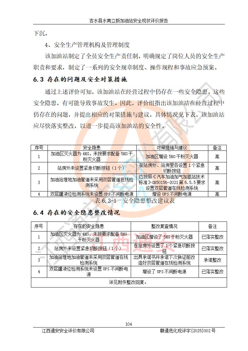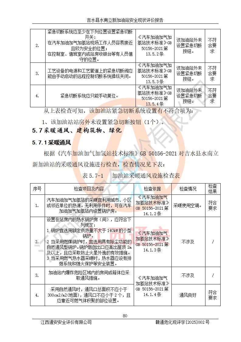 評價結論 | 吉水縣水南立新加油站站址合理,周邊環(huán)境良好,與敏感防護目標間距符合規(guī)范要求,站區(qū)建構筑物之間的防火間距、耐火等級符合標準要求,與總平面布置圖一致,加油卸油工藝及設備設施合理,工藝布置得當,防雷設施經檢測合格,采取的工藝安全設施符合規(guī)范要求;該加油站制定了安全管理制度和操作規(guī)程,人員經培訓合格后上崗,安全管理人員經考核合格并取得安全合格證,主要負責人于2024年05月08日取得安全生產知識和管理能力考核合格證,能按照法律法規(guī)要求開展安全生產管理工作。 吉水縣水南立新加油站符合《汽車加油加氣加氫站技術標準》GB50156-2021等標準規(guī)范的要求,安全風險可控,滿足危險化學品經營的安全條件。 | |||