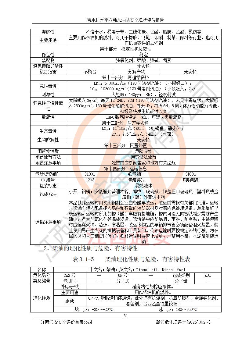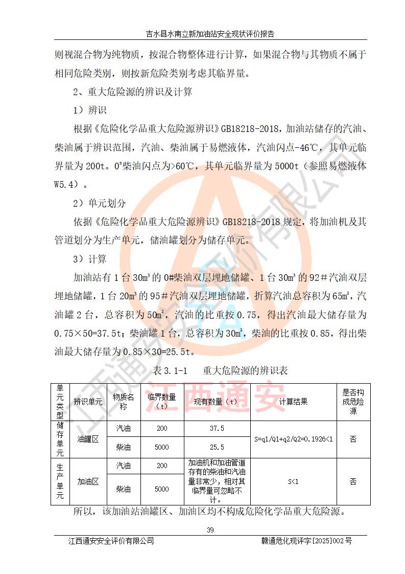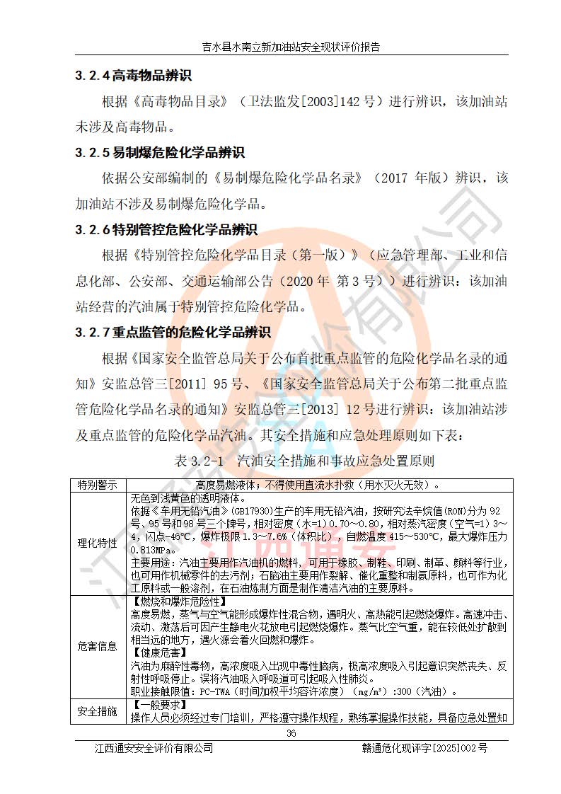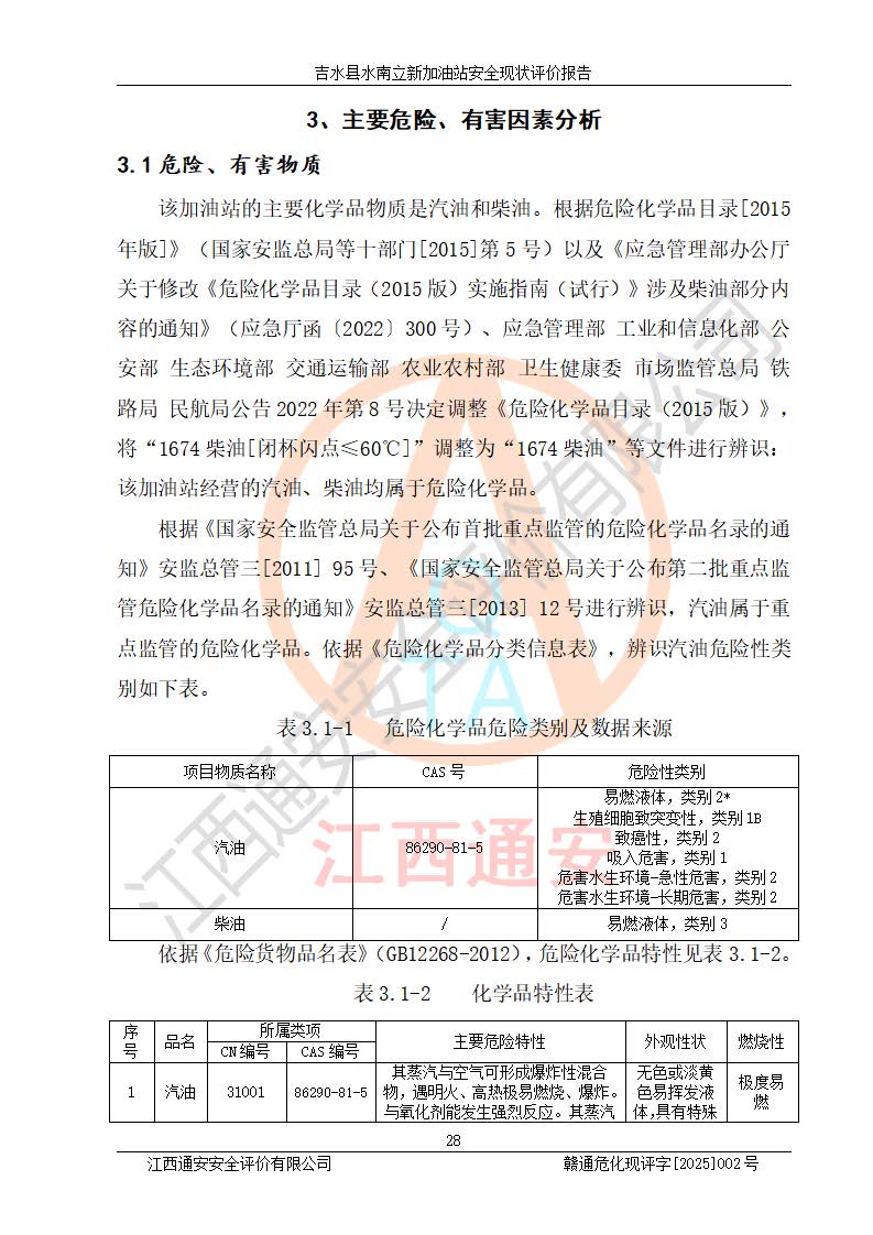 項目簡介 | 吉水縣水南立新加油站是一家從事汽油、柴油零售經營的企業(yè)。該加油站于2019年04月22日經吉水縣市場監(jiān)督管理局核準注冊成立,營業(yè)場所位于江西省吉安市吉水縣水南鎮(zhèn)水北村。屬于個人獨資企業(yè),投資人楊志紅,營業(yè)執(zhí)照統一社會信用代碼為:91360822MA38JLP188。營業(yè)執(zhí)照核準經營范圍:成品油(汽油、柴油)、潤滑油零售:洗車服務。(依法須經批準的項目,經相關部門批準后方可開展經營活動)。 吉水縣水南立新加油站占地面積約1200㎡,加油站中設有1臺0#柴油/92#汽油雙槍加油機、1臺92#汽油/95#汽油雙槍加油機;1臺30m3的0#柴油雙層埋地儲罐、1臺30m3的92#汽油雙層埋地儲罐、1臺20m3的95#汽油雙層埋地儲罐,油品*大儲存能力為65m3(柴油罐容積折半計入油罐總容積),屬三級加油站,汽油卸油、加油設置了油氣回收系統。 吉水縣水南立新加油站于2022年03月29日經吉安市應急管理局核準,換發(fā)了新的《危險化學品經營許可證》,證書編號:贛吉?;涀諿2022]360800000013號,許可經營范圍:成品油。**期2022年03月29日至2025年03月28日。 吉水縣水南立新加油站2020年12月15日經吉安市商務局核準,換取了新的《成品油零售經營批準證書》,證書編號:油零售證書第吉0070號,批準從事成品油(汽油、柴油)零售業(yè)務。證書**期至2020年12月15日至2025年12月14日。 項目生產過程中涉及的危險化學品有:汽油、柴油等。 項目各生產和儲存單元均未構成危險化學品重大危險源。 | |||
