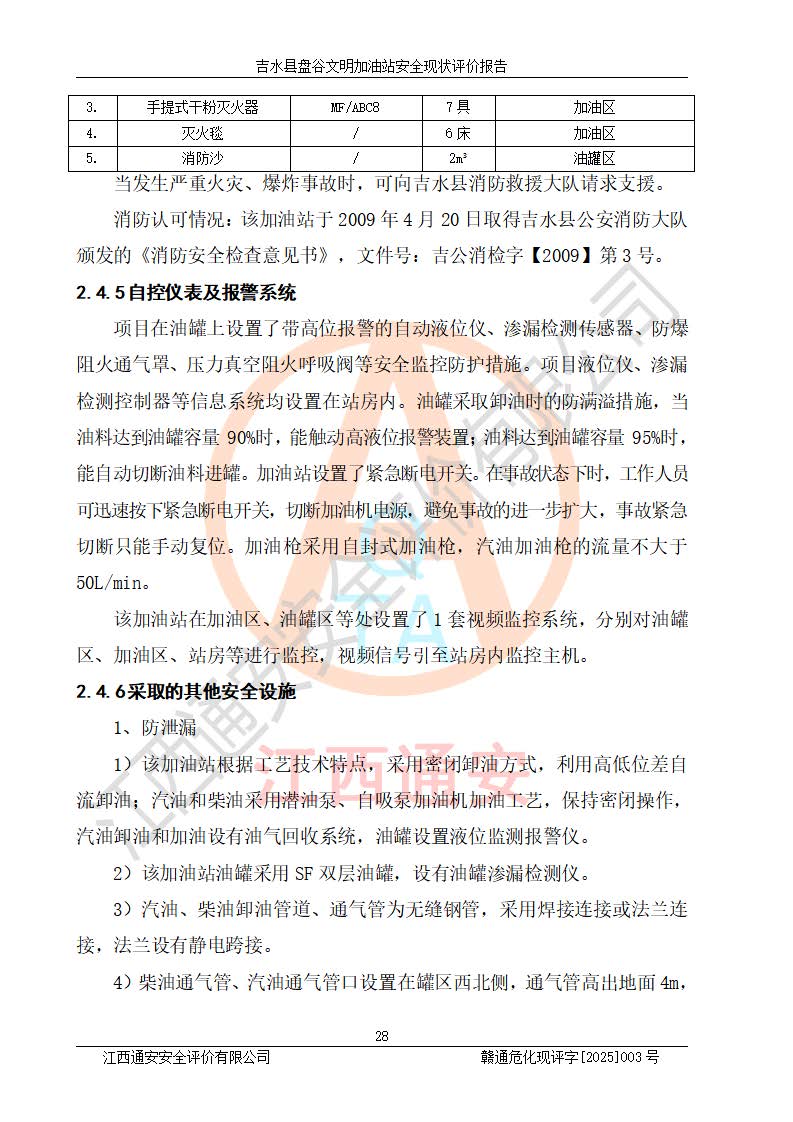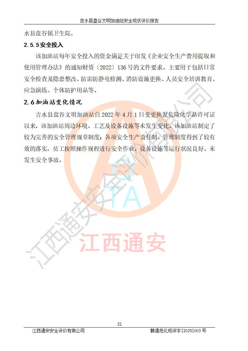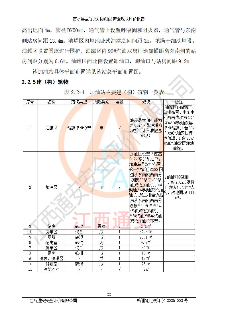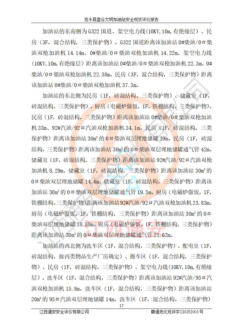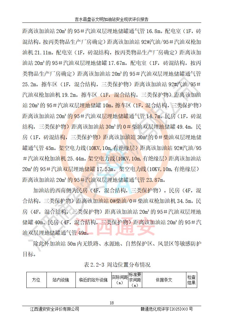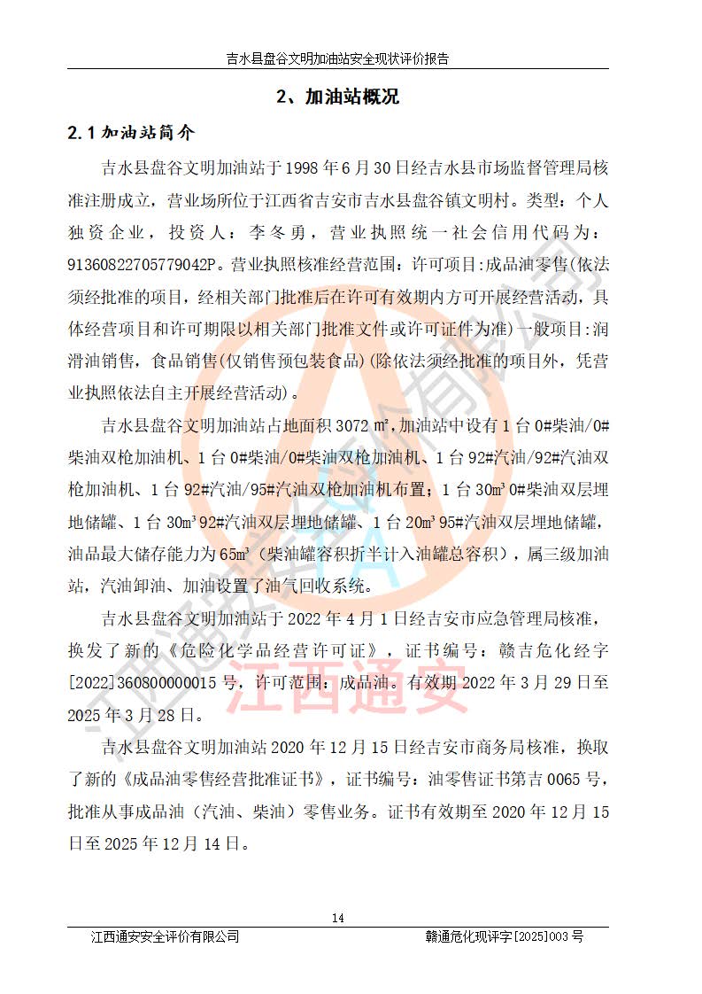 項(xiàng)目簡(jiǎn)介 | 吉水縣盤(pán)谷文明加油站于1998年6月30日經(jīng)吉水縣市場(chǎng)監(jiān)督管理局核準(zhǔn)注冊(cè)成立,營(yíng)業(yè)場(chǎng)所位于江西省吉安市吉水縣盤(pán)谷鎮(zhèn)文明村。類(lèi)型:個(gè)人獨(dú)資企業(yè),投資人:李冬勇,營(yíng)業(yè)執(zhí)照統(tǒng)一社會(huì)信用代碼為:91360822705779042P。營(yíng)業(yè)執(zhí)照核準(zhǔn)經(jīng)營(yíng)范圍:許可項(xiàng)目:成品油零售(依法須經(jīng)批準(zhǔn)的項(xiàng)目,經(jīng)相關(guān)部門(mén)批準(zhǔn)后在許可**期內(nèi)方可開(kāi)展經(jīng)營(yíng)活動(dòng),具體經(jīng)營(yíng)項(xiàng)目和許可期限以相關(guān)部門(mén)批準(zhǔn)文件或許可證件為準(zhǔn))一般項(xiàng)目:潤(rùn)滑油銷(xiāo)售,食品銷(xiāo)售(僅銷(xiāo)售預(yù)包裝食品)(除依法須經(jīng)批準(zhǔn)的項(xiàng)目外,憑營(yíng)業(yè)執(zhí)照依法自主開(kāi)展經(jīng)營(yíng)活動(dòng))。 吉水縣盤(pán)谷文明加油站占地面積3072㎡,加油站中設(shè)有1臺(tái)0#柴油/0#柴油雙槍加油機(jī)、1臺(tái)0#柴油/0#柴油雙槍加油機(jī)、1臺(tái)92#汽油/92#汽油雙槍加油機(jī)、1臺(tái)92#汽油/95#汽油雙槍加油機(jī)布置;1臺(tái)30m30#柴油雙層埋地儲(chǔ)罐、1臺(tái)30m392#汽油雙層埋地儲(chǔ)罐、1臺(tái)20m395#汽油雙層埋地儲(chǔ)罐,油品*大儲(chǔ)存能力為65m3(柴油罐容積折半計(jì)入油罐總?cè)莘e),屬三級(jí)加油站,汽油卸油、加油設(shè)置了油氣回收系統(tǒng)。 吉水縣盤(pán)谷文明加油站于2022年4月1日經(jīng)吉安市應(yīng)急管理局核準(zhǔn),換發(fā)了新的《危險(xiǎn)化學(xué)品經(jīng)營(yíng)許可證》,證書(shū)編號(hào):贛吉危化經(jīng)字[2022]360800000015號(hào),許可范圍:成品油。**期2022年3月29日至2025年3月28日。 吉水縣盤(pán)谷文明加油站2020年12月15日經(jīng)吉安市商務(wù)局核準(zhǔn),換取了新的《成品油零售經(jīng)營(yíng)批準(zhǔn)證書(shū)》,證書(shū)編號(hào):油零售證書(shū)第吉0065號(hào),批準(zhǔn)從事成品油(汽油、柴油)零售業(yè)務(wù)。證書(shū)**期至2020年12月15日至2025年12月14日。 | ||||