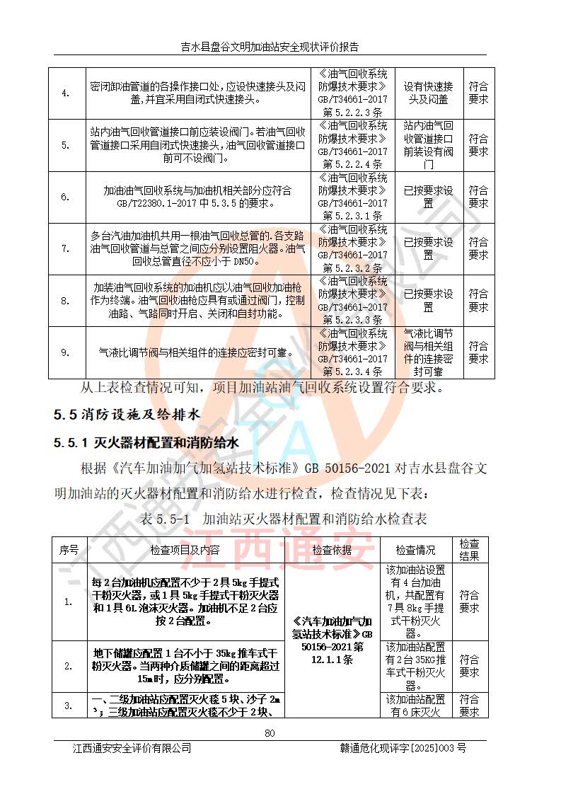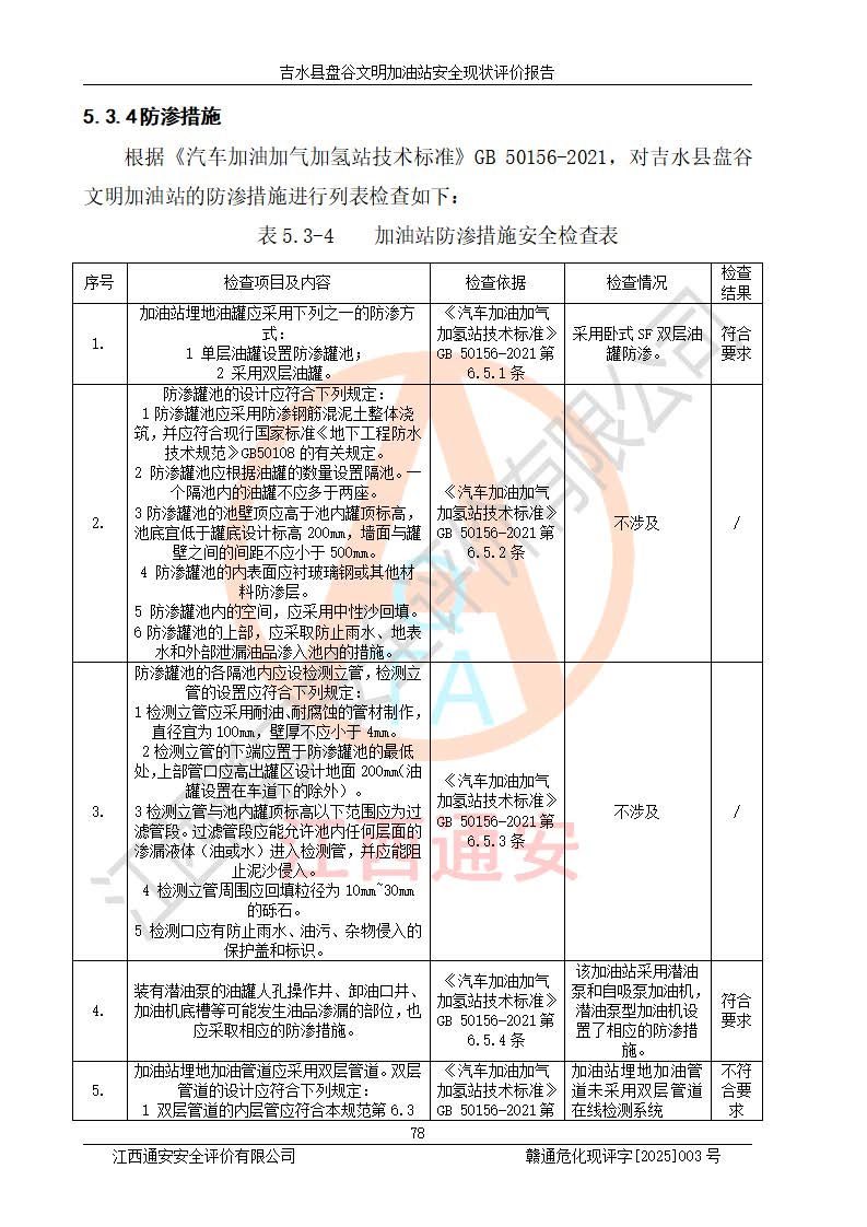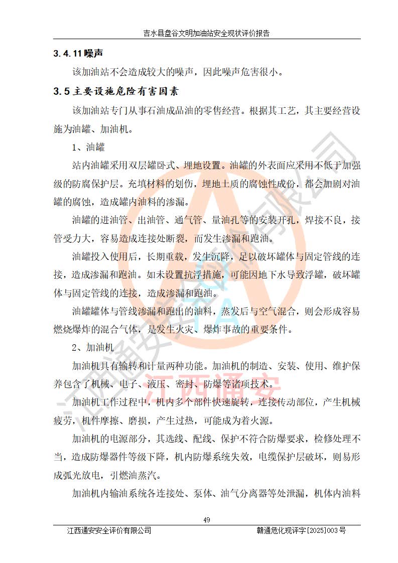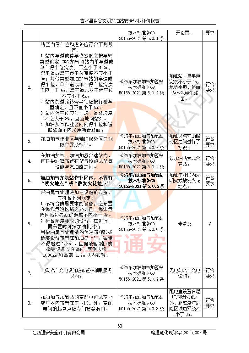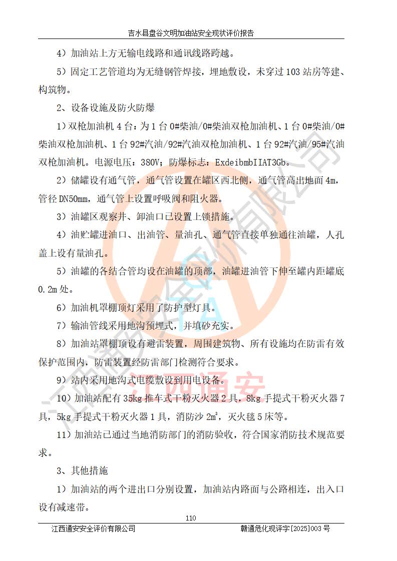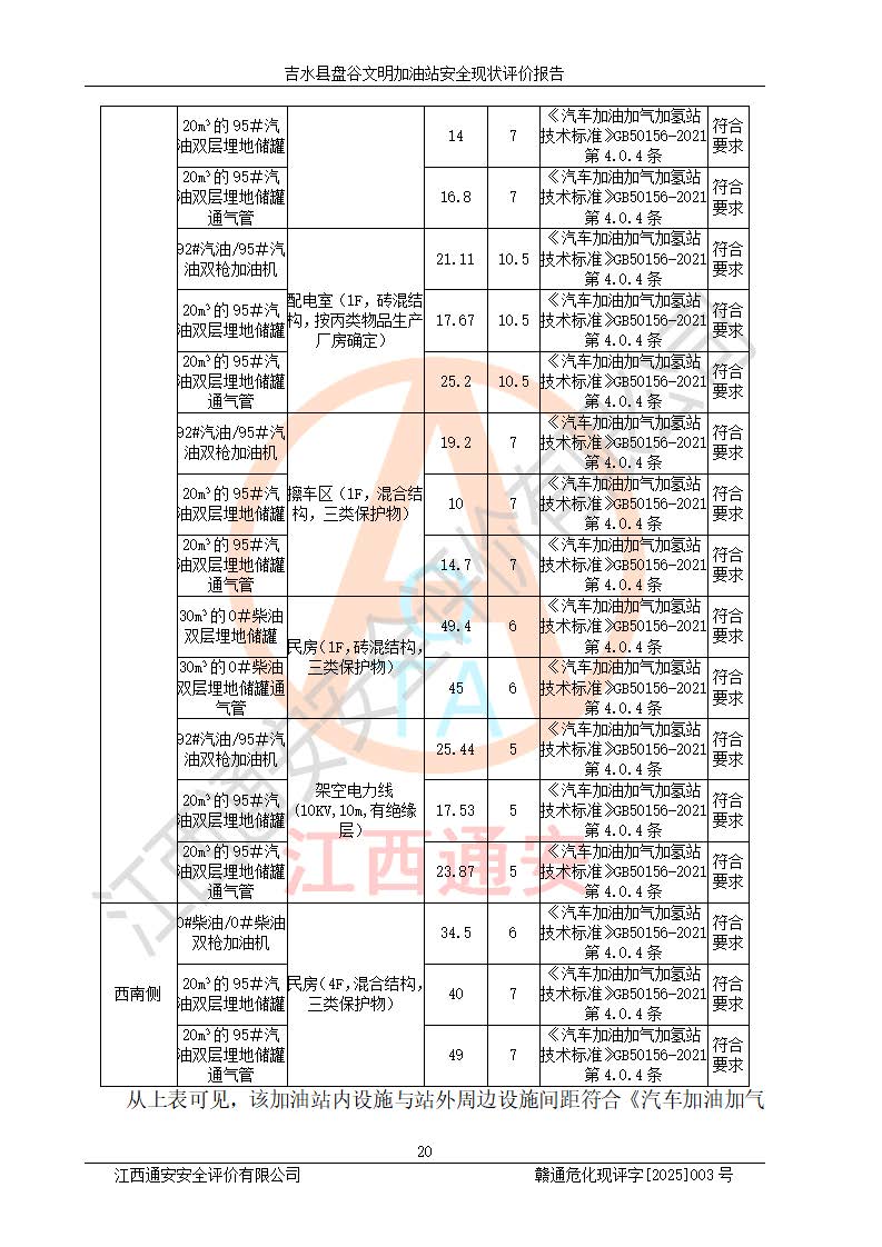 項(xiàng)目簡(jiǎn)介 | 吉水縣盤(pán)谷文明加油站于1998年6月30日經(jīng)吉水縣市場(chǎng)監(jiān)督管理局核準(zhǔn)注冊(cè)成立,營(yíng)業(yè)場(chǎng)所位于江西省吉安市吉水縣盤(pán)谷鎮(zhèn)文明村。類(lèi)型:個(gè)人獨(dú)資企業(yè),投資人:李冬勇,營(yíng)業(yè)執(zhí)照統(tǒng)一社會(huì)信用代碼為:91360822705779042P。營(yíng)業(yè)執(zhí)照核準(zhǔn)經(jīng)營(yíng)范圍:許可項(xiàng)目:成品油零售(依法須經(jīng)批準(zhǔn)的項(xiàng)目,經(jīng)相關(guān)部門(mén)批準(zhǔn)后在許可**期內(nèi)方可開(kāi)展經(jīng)營(yíng)活動(dòng),具體經(jīng)營(yíng)項(xiàng)目和許可期限以相關(guān)部門(mén)批準(zhǔn)文件或許可證件為準(zhǔn))一般項(xiàng)目:潤(rùn)滑油銷(xiāo)售,食品銷(xiāo)售(僅銷(xiāo)售預(yù)包裝食品)(除依法須經(jīng)批準(zhǔn)的項(xiàng)目外,憑營(yíng)業(yè)執(zhí)照依法自主開(kāi)展經(jīng)營(yíng)活動(dòng))。 吉水縣盤(pán)谷文明加油站占地面積3072㎡,加油站中設(shè)有1臺(tái)0#柴油/0#柴油雙槍加油機(jī)、1臺(tái)0#柴油/0#柴油雙槍加油機(jī)、1臺(tái)92#汽油/92#汽油雙槍加油機(jī)、1臺(tái)92#汽油/95#汽油雙槍加油機(jī)布置;1臺(tái)30m30#柴油雙層埋地儲(chǔ)罐、1臺(tái)30m392#汽油雙層埋地儲(chǔ)罐、1臺(tái)20m395#汽油雙層埋地儲(chǔ)罐,油品*大儲(chǔ)存能力為65m3(柴油罐容積折半計(jì)入油罐總?cè)莘e),屬三級(jí)加油站,汽油卸油、加油設(shè)置了油氣回收系統(tǒng)。 吉水縣盤(pán)谷文明加油站于2022年4月1日經(jīng)吉安市應(yīng)急管理局核準(zhǔn),換發(fā)了新的《危險(xiǎn)化學(xué)品經(jīng)營(yíng)許可證》,證書(shū)編號(hào):贛吉危化經(jīng)字[2022]360800000015號(hào),許可范圍:成品油。**期2022年3月29日至2025年3月28日。 吉水縣盤(pán)谷文明加油站2020年12月15日經(jīng)吉安市商務(wù)局核準(zhǔn),換取了新的《成品油零售經(jīng)營(yíng)批準(zhǔn)證書(shū)》,證書(shū)編號(hào):油零售證書(shū)第吉0065號(hào),批準(zhǔn)從事成品油(汽油、柴油)零售業(yè)務(wù)。證書(shū)**期至2020年12月15日至2025年12月14日。 | ||||