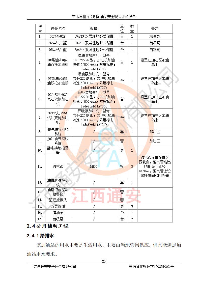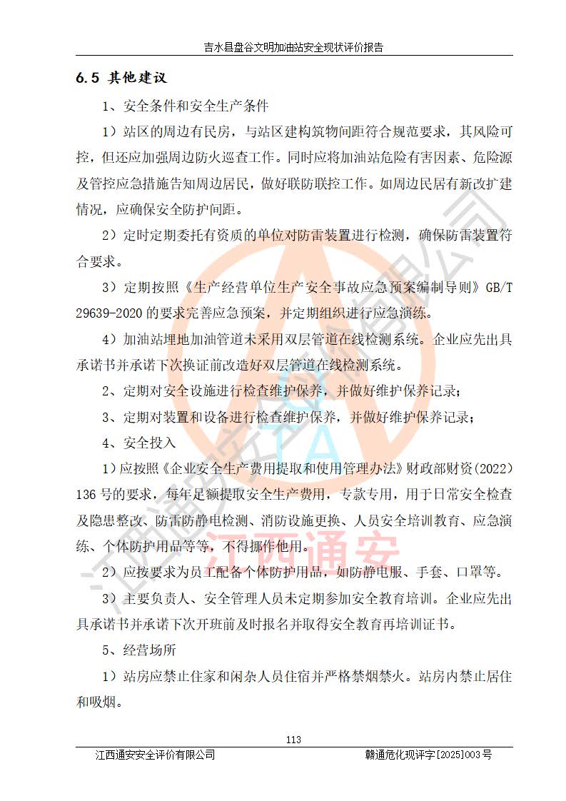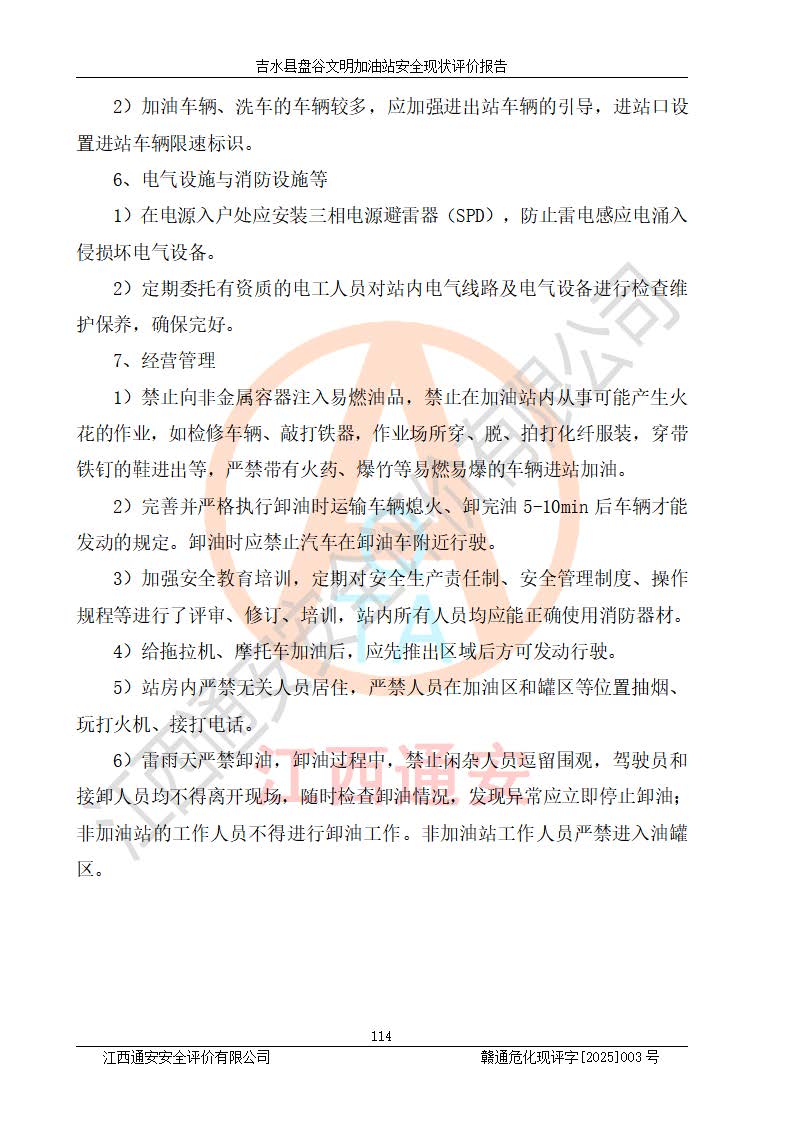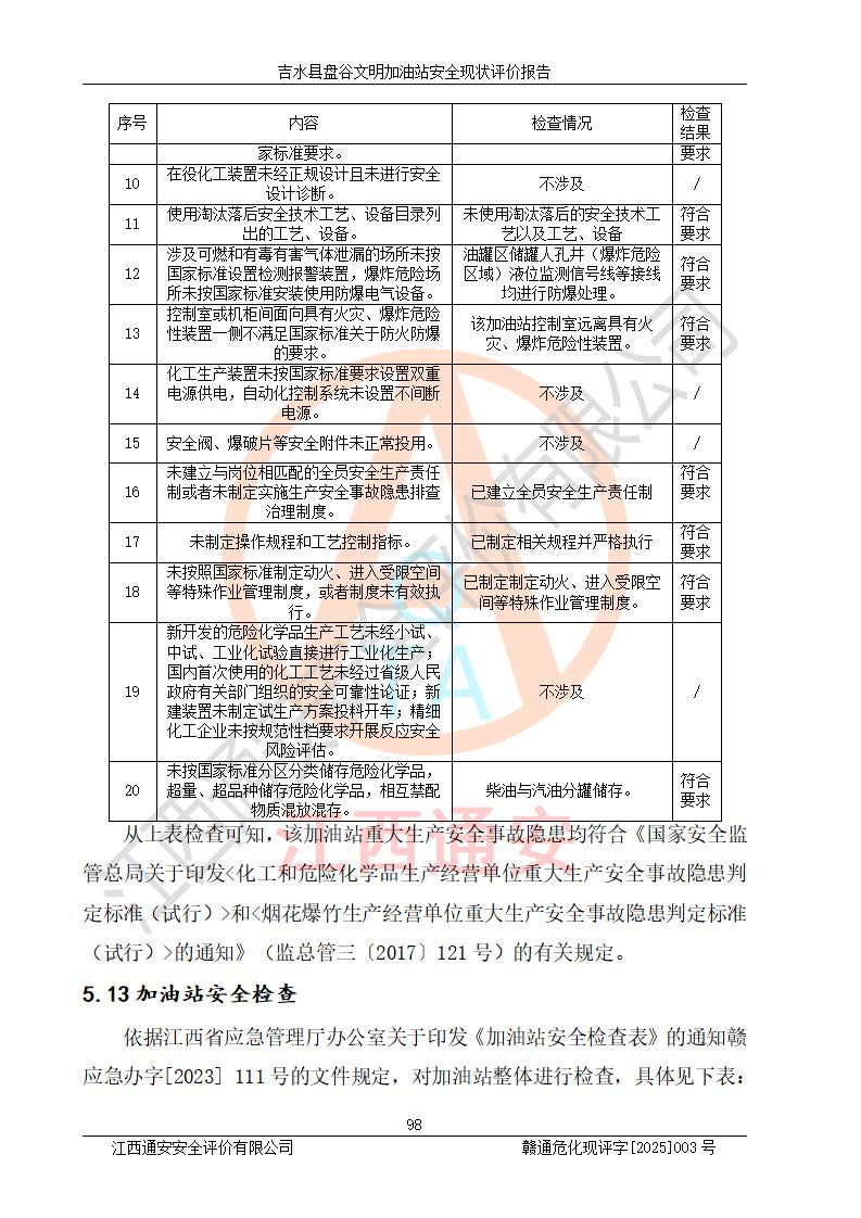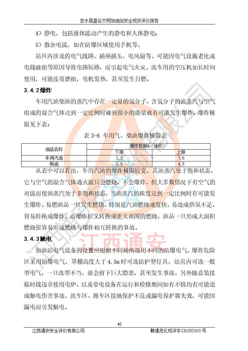 項(xiàng)目簡(jiǎn)介 | 吉水縣盤(pán)谷文明加油站于1998年6月30日經(jīng)吉水縣市場(chǎng)監(jiān)督管理局核準(zhǔn)注冊(cè)成立,營(yíng)業(yè)場(chǎng)所位于江西省吉安市吉水縣盤(pán)谷鎮(zhèn)文明村。類(lèi)型:個(gè)人獨(dú)資企業(yè),投資人:李冬勇,營(yíng)業(yè)執(zhí)照統(tǒng)一社會(huì)信用代碼為:91360822705779042P。營(yíng)業(yè)執(zhí)照核準(zhǔn)經(jīng)營(yíng)范圍:許可項(xiàng)目:成品油零售(依法須經(jīng)批準(zhǔn)的項(xiàng)目,經(jīng)相關(guān)部門(mén)批準(zhǔn)后在許可**期內(nèi)方可開(kāi)展經(jīng)營(yíng)活動(dòng),具體經(jīng)營(yíng)項(xiàng)目和許可期限以相關(guān)部門(mén)批準(zhǔn)文件或許可證件為準(zhǔn))一般項(xiàng)目:潤(rùn)滑油銷(xiāo)售,食品銷(xiāo)售(僅銷(xiāo)售預(yù)包裝食品)(除依法須經(jīng)批準(zhǔn)的項(xiàng)目外,憑營(yíng)業(yè)執(zhí)照依法自主開(kāi)展經(jīng)營(yíng)活動(dòng))。 吉水縣盤(pán)谷文明加油站占地面積3072㎡,加油站中設(shè)有1臺(tái)0#柴油/0#柴油雙槍加油機(jī)、1臺(tái)0#柴油/0#柴油雙槍加油機(jī)、1臺(tái)92#汽油/92#汽油雙槍加油機(jī)、1臺(tái)92#汽油/95#汽油雙槍加油機(jī)布置;1臺(tái)30m30#柴油雙層埋地儲(chǔ)罐、1臺(tái)30m392#汽油雙層埋地儲(chǔ)罐、1臺(tái)20m395#汽油雙層埋地儲(chǔ)罐,油品*大儲(chǔ)存能力為65m3(柴油罐容積折半計(jì)入油罐總?cè)莘e),屬三級(jí)加油站,汽油卸油、加油設(shè)置了油氣回收系統(tǒng)。 吉水縣盤(pán)谷文明加油站于2022年4月1日經(jīng)吉安市應(yīng)急管理局核準(zhǔn),換發(fā)了新的《危險(xiǎn)化學(xué)品經(jīng)營(yíng)許可證》,證書(shū)編號(hào):贛吉危化經(jīng)字[2022]360800000015號(hào),許可范圍:成品油。**期2022年3月29日至2025年3月28日。 吉水縣盤(pán)谷文明加油站2020年12月15日經(jīng)吉安市商務(wù)局核準(zhǔn),換取了新的《成品油零售經(jīng)營(yíng)批準(zhǔn)證書(shū)》,證書(shū)編號(hào):油零售證書(shū)第吉0065號(hào),批準(zhǔn)從事成品油(汽油、柴油)零售業(yè)務(wù)。證書(shū)**期至2020年12月15日至2025年12月14日。 | ||||