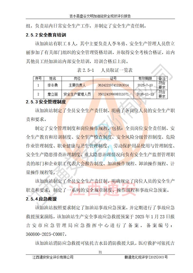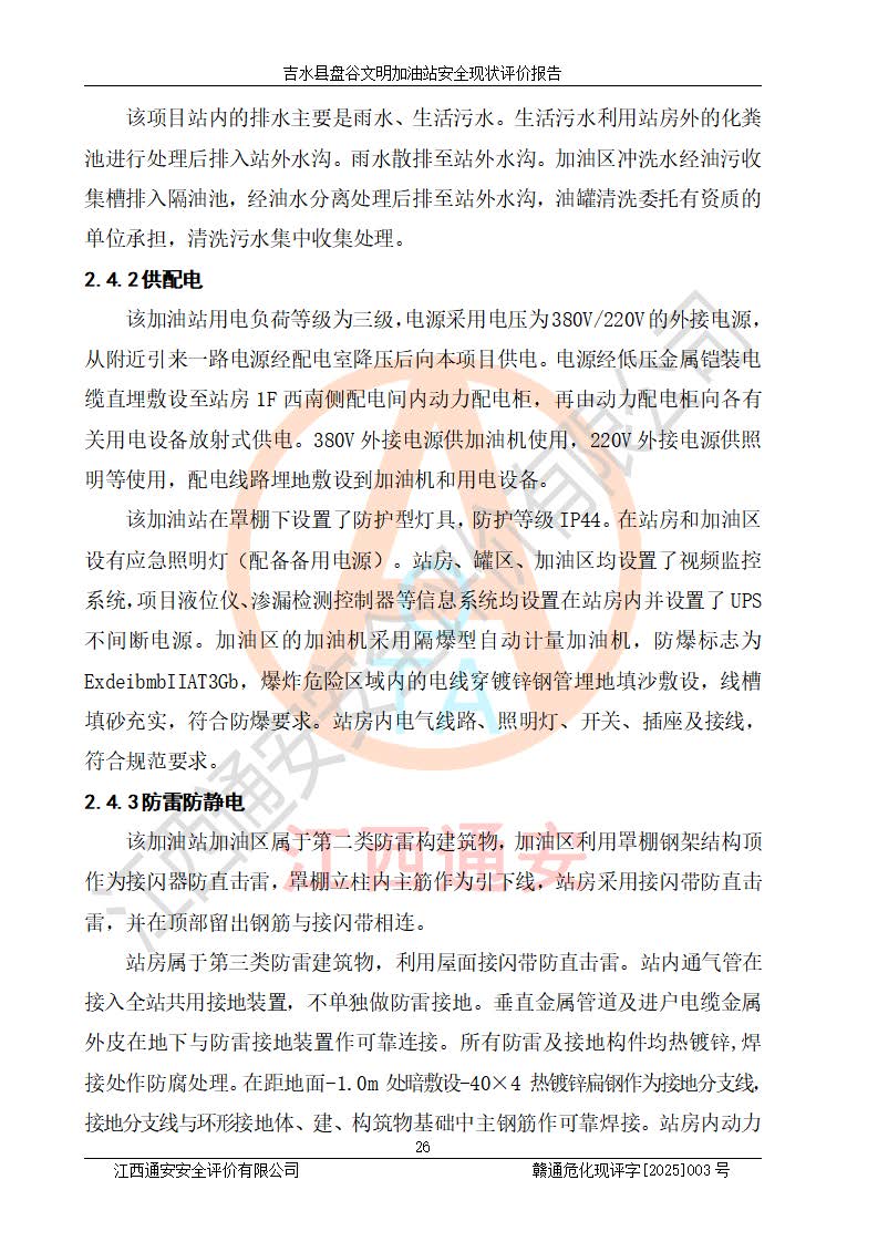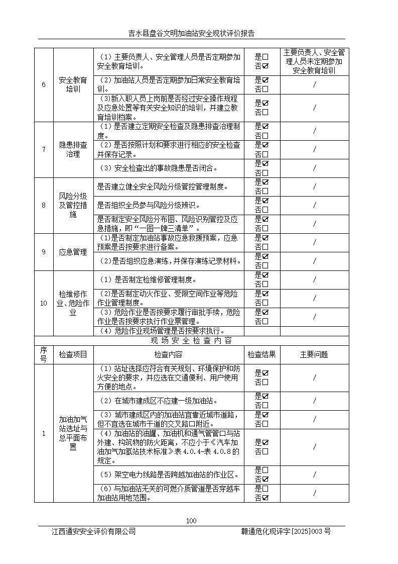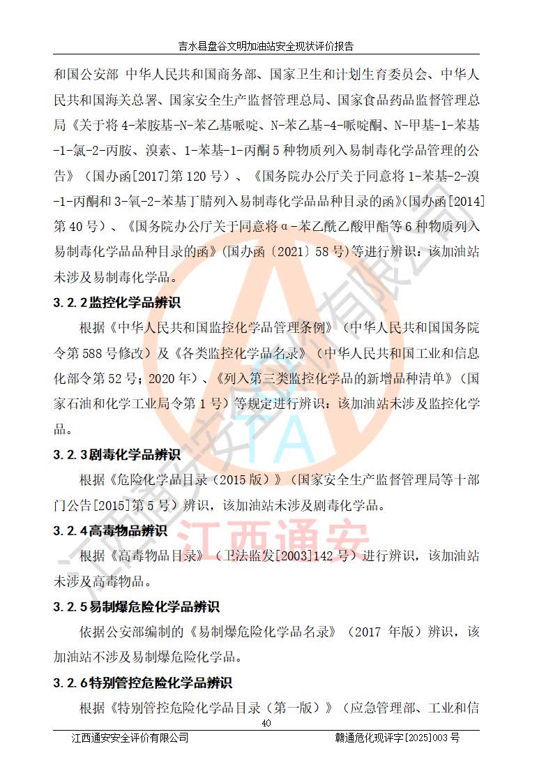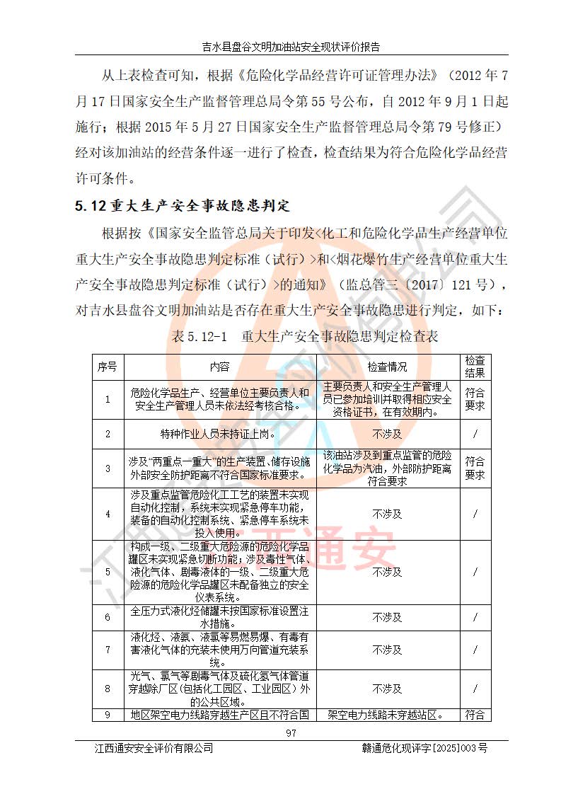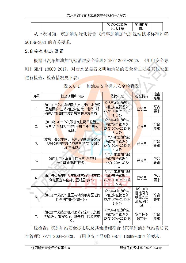 項(xiàng)目簡(jiǎn)介 | 吉水縣盤(pán)谷文明加油站于1998年6月30日經(jīng)吉水縣市場(chǎng)監(jiān)督管理局核準(zhǔn)注冊(cè)成立,營(yíng)業(yè)場(chǎng)所位于江西省吉安市吉水縣盤(pán)谷鎮(zhèn)文明村。類(lèi)型:個(gè)人獨(dú)資企業(yè),投資人:李冬勇,營(yíng)業(yè)執(zhí)照統(tǒng)一社會(huì)信用代碼為:91360822705779042P。營(yíng)業(yè)執(zhí)照核準(zhǔn)經(jīng)營(yíng)范圍:許可項(xiàng)目:成品油零售(依法須經(jīng)批準(zhǔn)的項(xiàng)目,經(jīng)相關(guān)部門(mén)批準(zhǔn)后在許可**期內(nèi)方可開(kāi)展經(jīng)營(yíng)活動(dòng),具體經(jīng)營(yíng)項(xiàng)目和許可期限以相關(guān)部門(mén)批準(zhǔn)文件或許可證件為準(zhǔn))一般項(xiàng)目:潤(rùn)滑油銷(xiāo)售,食品銷(xiāo)售(僅銷(xiāo)售預(yù)包裝食品)(除依法須經(jīng)批準(zhǔn)的項(xiàng)目外,憑營(yíng)業(yè)執(zhí)照依法自主開(kāi)展經(jīng)營(yíng)活動(dòng))。 吉水縣盤(pán)谷文明加油站占地面積3072㎡,加油站中設(shè)有1臺(tái)0#柴油/0#柴油雙槍加油機(jī)、1臺(tái)0#柴油/0#柴油雙槍加油機(jī)、1臺(tái)92#汽油/92#汽油雙槍加油機(jī)、1臺(tái)92#汽油/95#汽油雙槍加油機(jī)布置;1臺(tái)30m30#柴油雙層埋地儲(chǔ)罐、1臺(tái)30m392#汽油雙層埋地儲(chǔ)罐、1臺(tái)20m395#汽油雙層埋地儲(chǔ)罐,油品*大儲(chǔ)存能力為65m3(柴油罐容積折半計(jì)入油罐總?cè)莘e),屬三級(jí)加油站,汽油卸油、加油設(shè)置了油氣回收系統(tǒng)。 吉水縣盤(pán)谷文明加油站于2022年4月1日經(jīng)吉安市應(yīng)急管理局核準(zhǔn),換發(fā)了新的《危險(xiǎn)化學(xué)品經(jīng)營(yíng)許可證》,證書(shū)編號(hào):贛吉危化經(jīng)字[2022]360800000015號(hào),許可范圍:成品油。**期2022年3月29日至2025年3月28日。 吉水縣盤(pán)谷文明加油站2020年12月15日經(jīng)吉安市商務(wù)局核準(zhǔn),換取了新的《成品油零售經(jīng)營(yíng)批準(zhǔn)證書(shū)》,證書(shū)編號(hào):油零售證書(shū)第吉0065號(hào),批準(zhǔn)從事成品油(汽油、柴油)零售業(yè)務(wù)。證書(shū)**期至2020年12月15日至2025年12月14日。 | ||||