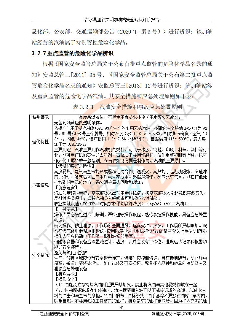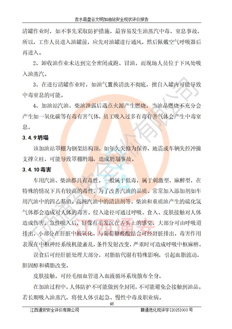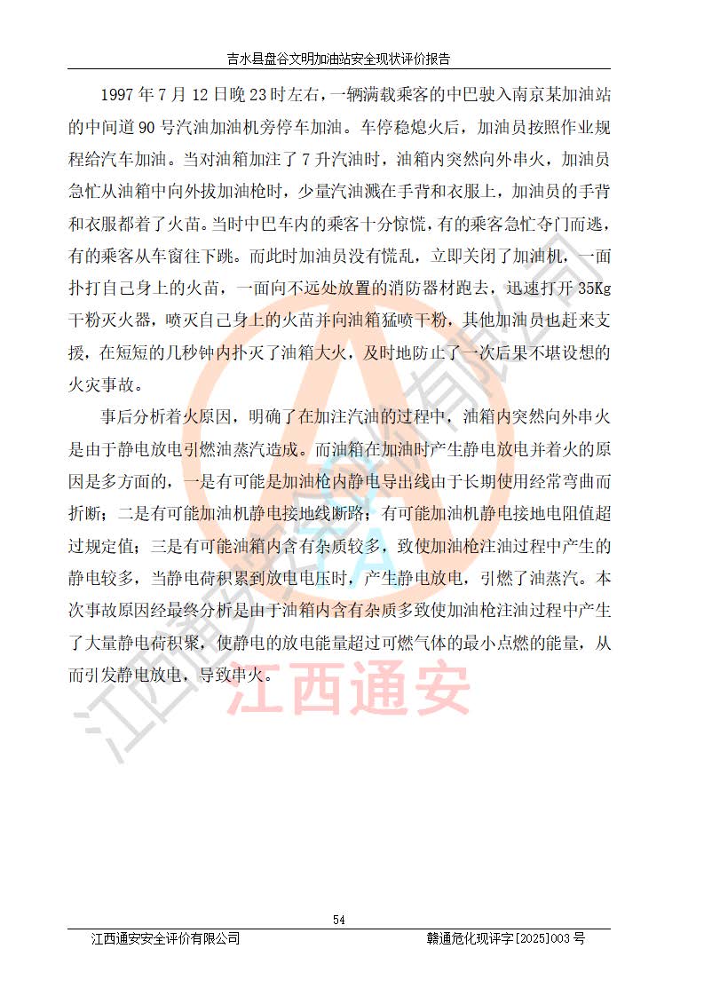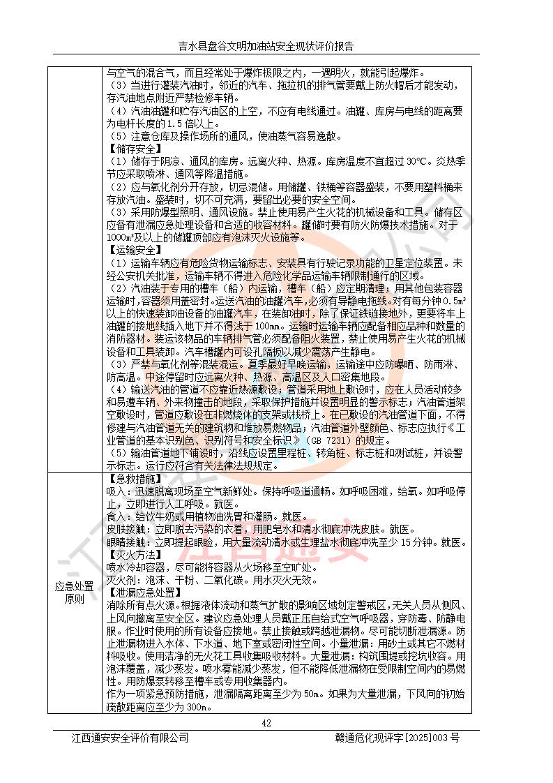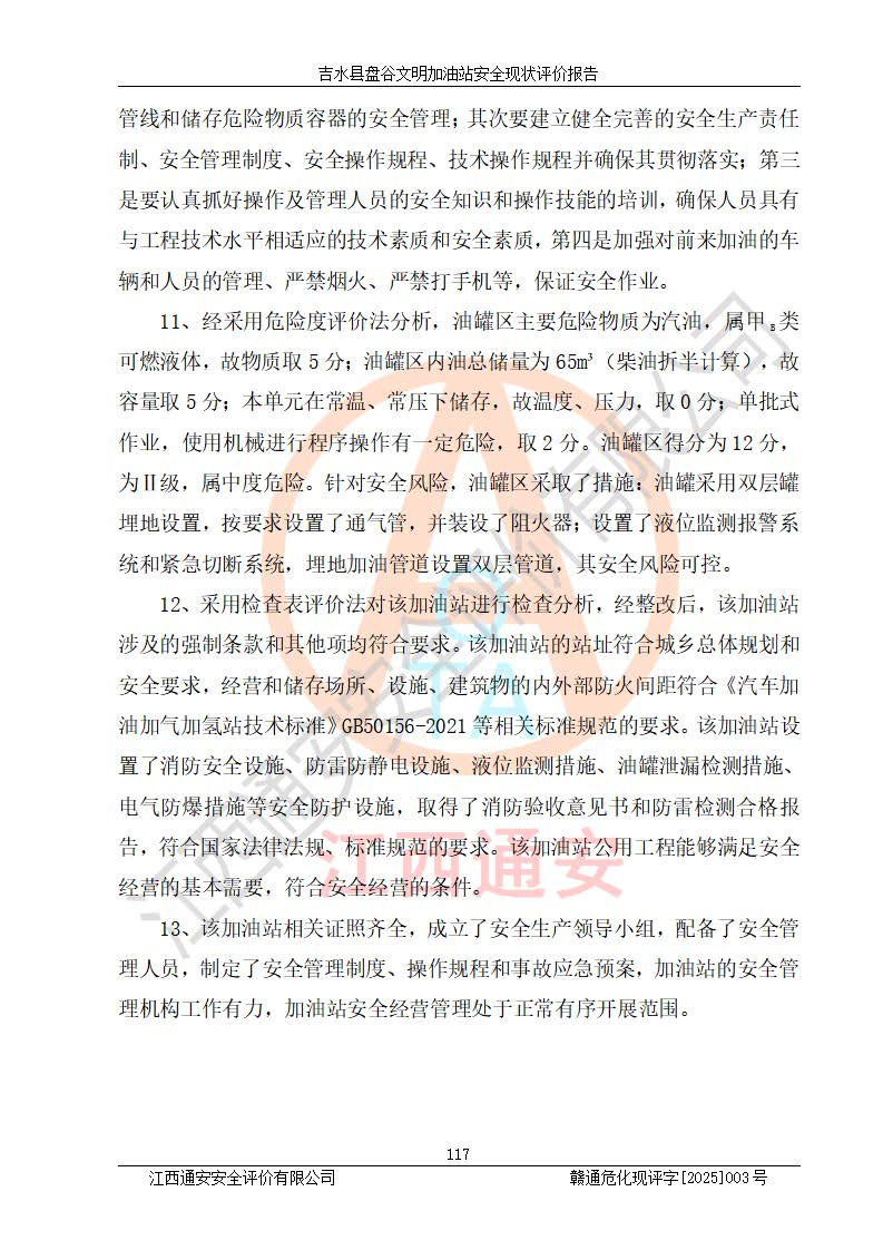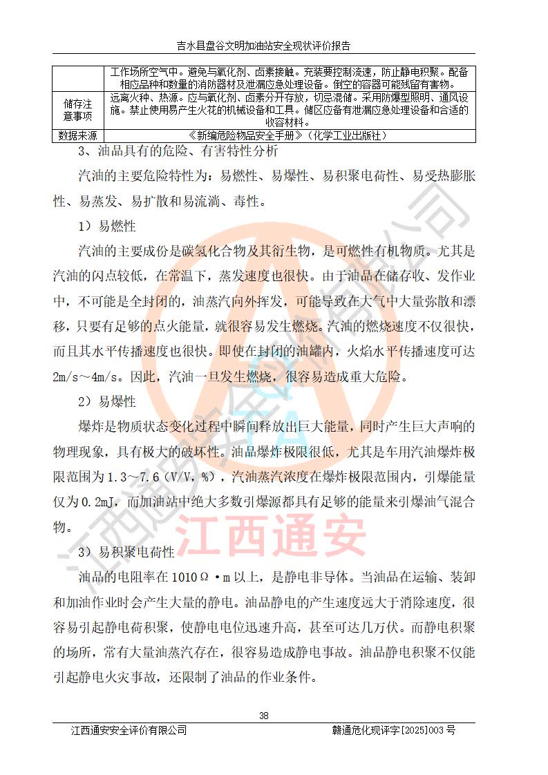 其它 | 在對(duì)該項(xiàng)目危險(xiǎn)、有害因素辨識(shí)分析的基礎(chǔ)上,運(yùn)用安全檢查表、預(yù)作業(yè)條件危險(xiǎn)性分析法、危險(xiǎn)度評(píng)價(jià)、重大事故后果分析結(jié)果等評(píng)價(jià)方法對(duì)該項(xiàng)目進(jìn)行了分析評(píng)價(jià),評(píng)價(jià)結(jié)果如下: 1、該項(xiàng)目位于江西省吉安市吉水縣盤(pán)谷鎮(zhèn)文明村,符合當(dāng)?shù)匾?guī)劃,與周邊環(huán)境的距離符合有關(guān)標(biāo)準(zhǔn)、規(guī)范的要求。 2、總圖布置分區(qū)明確,布局合理,各建構(gòu)筑物的防火間距滿(mǎn)足規(guī)范要求。 3、該項(xiàng)目無(wú)**明令淘汰的工藝,設(shè)備、設(shè)施與工藝條件、內(nèi)部介質(zhì)相適應(yīng),特種設(shè)備及設(shè)施較齊全,按規(guī)定設(shè)置防雷、防靜電接地,爆炸危險(xiǎn)環(huán)境加油機(jī)按要求采用防爆型,符合相關(guān)標(biāo)準(zhǔn)規(guī)范要求。 5、企業(yè)設(shè)置了安全生產(chǎn)管理機(jī)構(gòu),配備了專(zhuān)職安全生產(chǎn)管理人員,建立了安全生產(chǎn)責(zé)任制和安全生產(chǎn)管理制度,編制了崗位操作規(guī)程,編制了生產(chǎn)安全事故應(yīng)急預(yù)案,人員經(jīng)過(guò)相應(yīng)的培訓(xùn),企業(yè)的安全生產(chǎn)管理正常。 6、作業(yè)條件危險(xiǎn)性評(píng)價(jià)結(jié)果:在選定的評(píng)價(jià)單元中,作業(yè)危險(xiǎn)程度均為“一般危險(xiǎn),需要注意”,作業(yè)條件相對(duì)安全。 7、危險(xiǎn)度評(píng)價(jià)結(jié)果:汽油儲(chǔ)罐的危險(xiǎn)程度為中度危險(xiǎn)。油罐采用雙層罐埋地設(shè)置,按要求設(shè)置了通氣管,并裝設(shè)了阻火器;設(shè)置了液位監(jiān)測(cè)報(bào)警系統(tǒng)和緊急切斷系統(tǒng),埋地加油管道設(shè)置雙層管道,可以滿(mǎn)足安全生產(chǎn)條件要求。 評(píng)價(jià)結(jié)論: 吉水縣盤(pán)谷文明加油站符合《汽車(chē)加油加氣加氫站技術(shù)標(biāo)準(zhǔn)》GB50156-2021等標(biāo)準(zhǔn)規(guī)范的要求,安全風(fēng)險(xiǎn)可控,滿(mǎn)足危險(xiǎn)化學(xué)品經(jīng)營(yíng)的安全條件。 | ||||