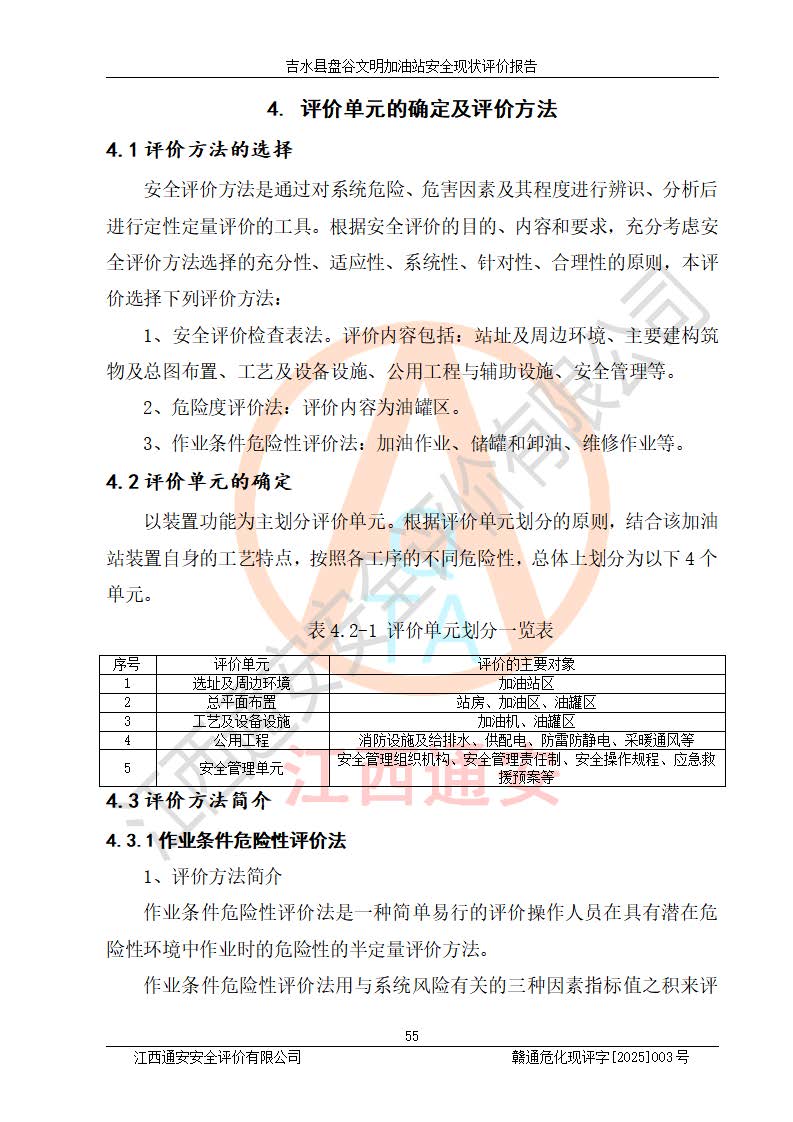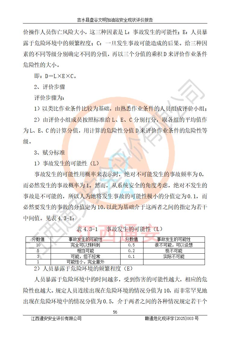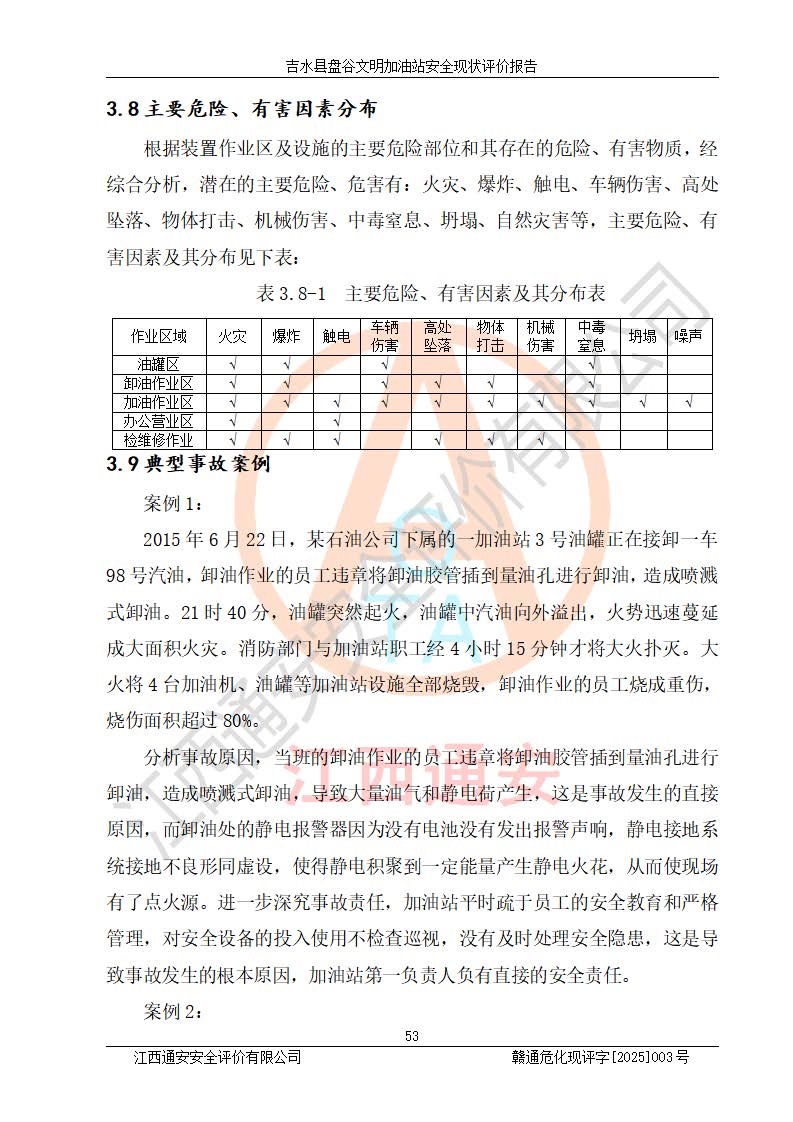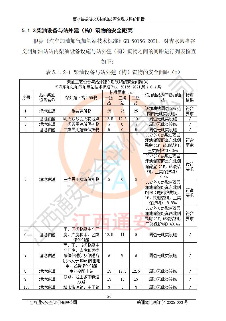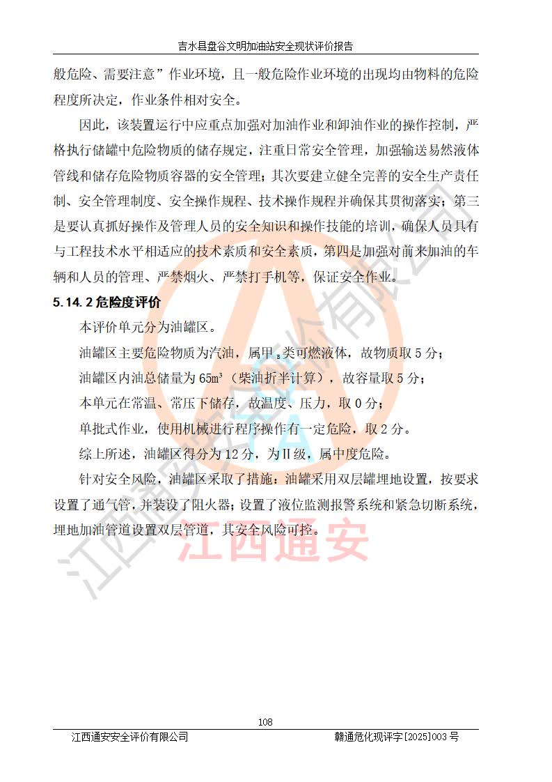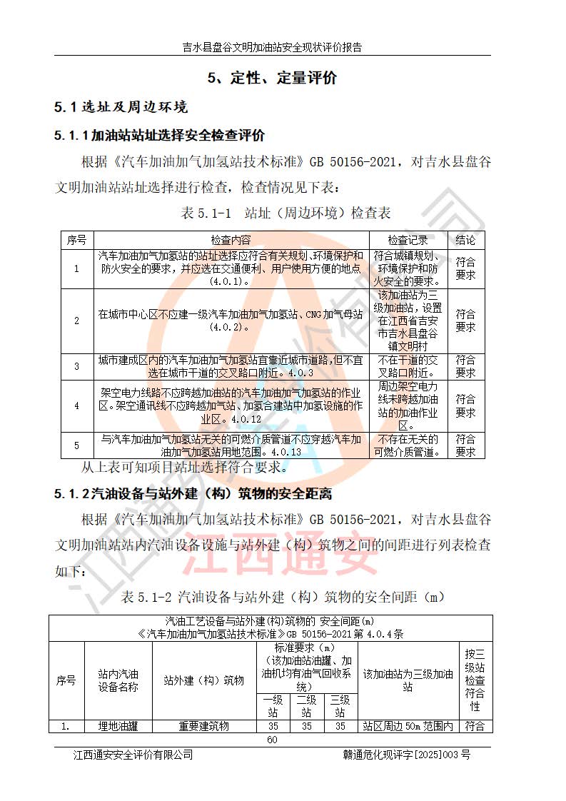 其它 | 在對(duì)該項(xiàng)目危險(xiǎn)、有害因素辨識(shí)分析的基礎(chǔ)上,運(yùn)用安全檢查表、預(yù)作業(yè)條件危險(xiǎn)性分析法、危險(xiǎn)度評(píng)價(jià)、重大事故后果分析結(jié)果等評(píng)價(jià)方法對(duì)該項(xiàng)目進(jìn)行了分析評(píng)價(jià),評(píng)價(jià)結(jié)果如下: 1、該項(xiàng)目位于江西省吉安市吉水縣盤(pán)谷鎮(zhèn)文明村,符合當(dāng)?shù)匾?guī)劃,與周邊環(huán)境的距離符合有關(guān)標(biāo)準(zhǔn)、規(guī)范的要求。 2、總圖布置分區(qū)明確,布局合理,各建構(gòu)筑物的防火間距滿(mǎn)足規(guī)范要求。 3、該項(xiàng)目無(wú)**明令淘汰的工藝,設(shè)備、設(shè)施與工藝條件、內(nèi)部介質(zhì)相適應(yīng),特種設(shè)備及設(shè)施較齊全,按規(guī)定設(shè)置防雷、防靜電接地,爆炸危險(xiǎn)環(huán)境加油機(jī)按要求采用防爆型,符合相關(guān)標(biāo)準(zhǔn)規(guī)范要求。 5、企業(yè)設(shè)置了安全生產(chǎn)管理機(jī)構(gòu),配備了專(zhuān)職安全生產(chǎn)管理人員,建立了安全生產(chǎn)責(zé)任制和安全生產(chǎn)管理制度,編制了崗位操作規(guī)程,編制了生產(chǎn)安全事故應(yīng)急預(yù)案,人員經(jīng)過(guò)相應(yīng)的培訓(xùn),企業(yè)的安全生產(chǎn)管理正常。 6、作業(yè)條件危險(xiǎn)性評(píng)價(jià)結(jié)果:在選定的評(píng)價(jià)單元中,作業(yè)危險(xiǎn)程度均為“一般危險(xiǎn),需要注意”,作業(yè)條件相對(duì)安全。 7、危險(xiǎn)度評(píng)價(jià)結(jié)果:汽油儲(chǔ)罐的危險(xiǎn)程度為中度危險(xiǎn)。油罐采用雙層罐埋地設(shè)置,按要求設(shè)置了通氣管,并裝設(shè)了阻火器;設(shè)置了液位監(jiān)測(cè)報(bào)警系統(tǒng)和緊急切斷系統(tǒng),埋地加油管道設(shè)置雙層管道,可以滿(mǎn)足安全生產(chǎn)條件要求。 評(píng)價(jià)結(jié)論: 吉水縣盤(pán)谷文明加油站符合《汽車(chē)加油加氣加氫站技術(shù)標(biāo)準(zhǔn)》GB50156-2021等標(biāo)準(zhǔn)規(guī)范的要求,安全風(fēng)險(xiǎn)可控,滿(mǎn)足危險(xiǎn)化學(xué)品經(jīng)營(yíng)的安全條件。 | ||||