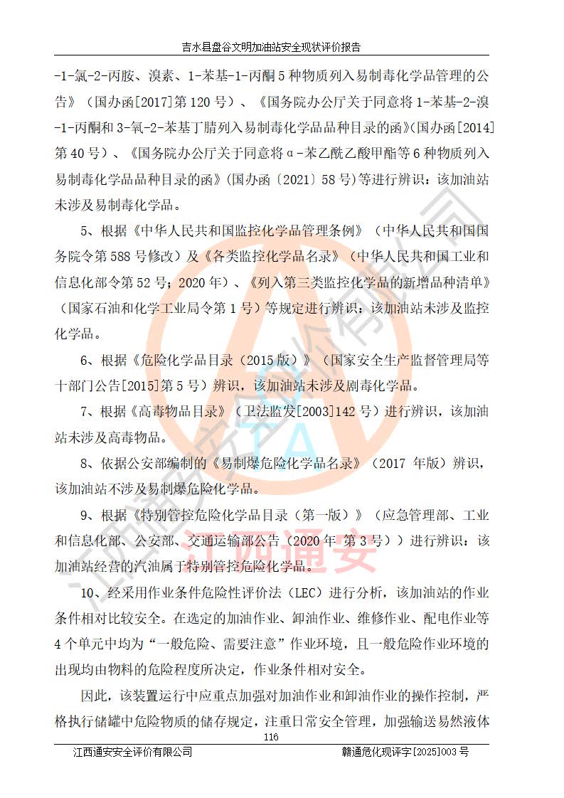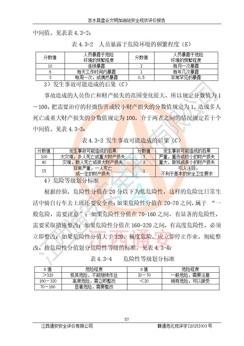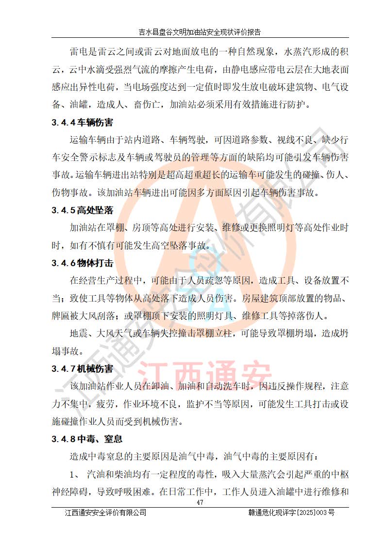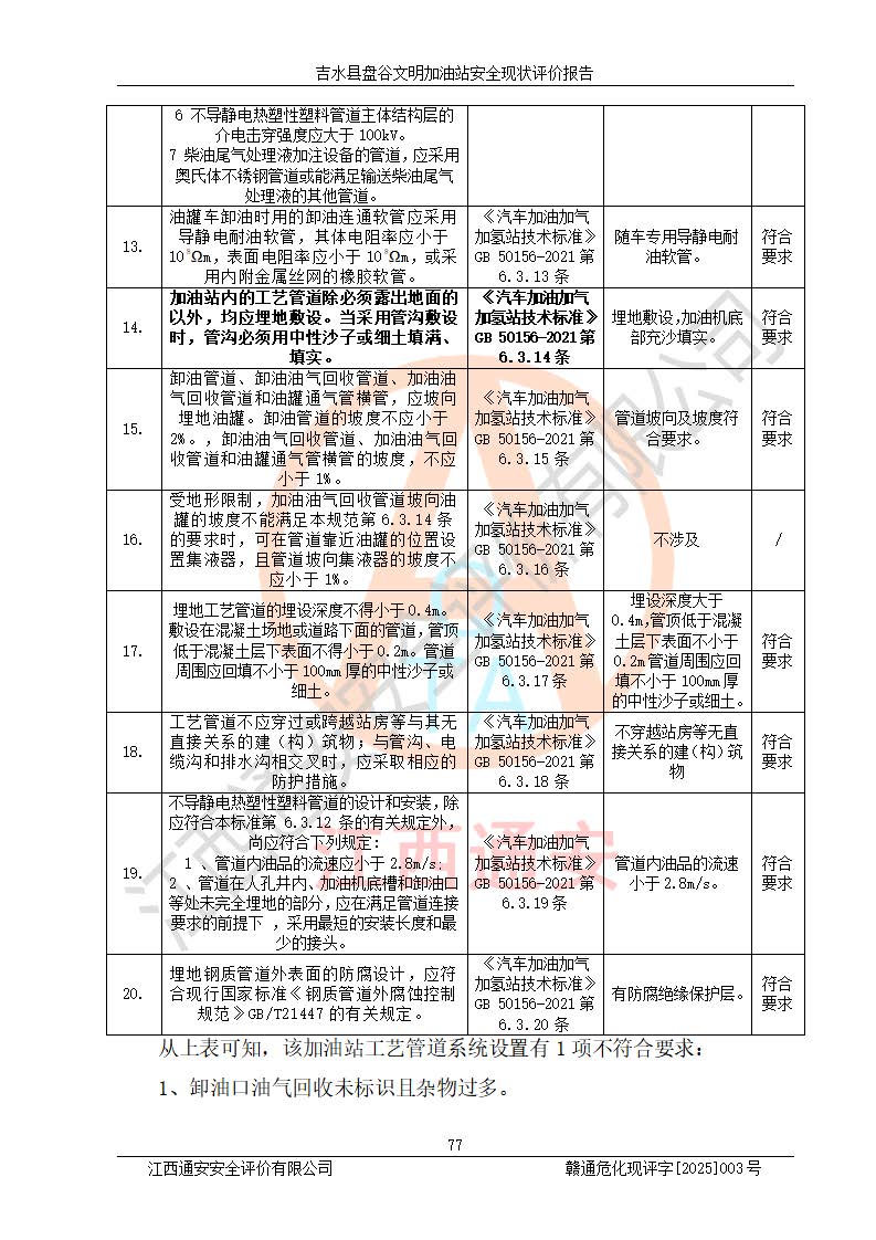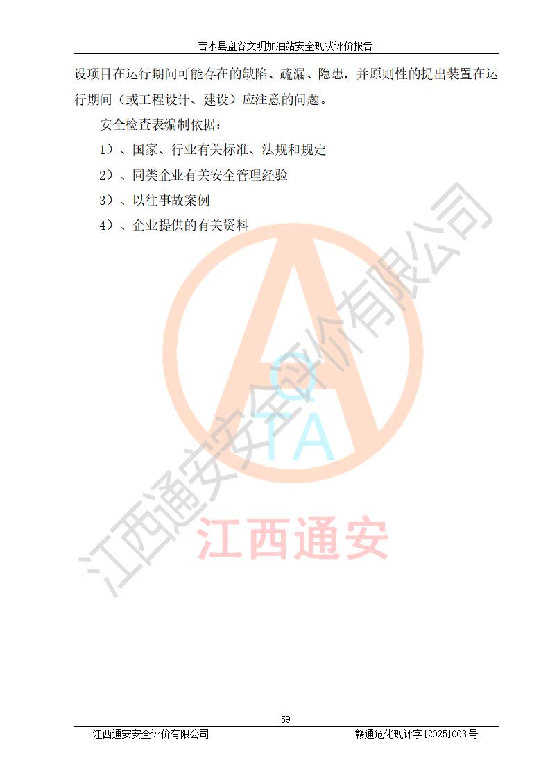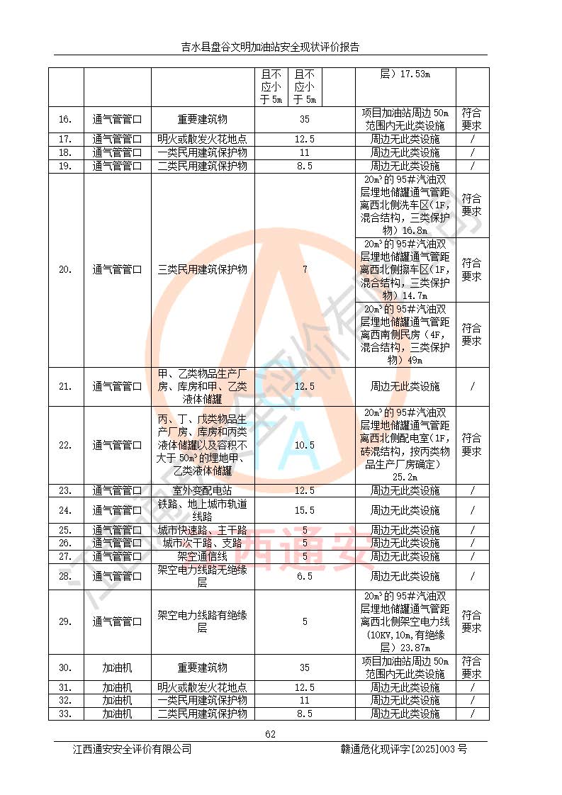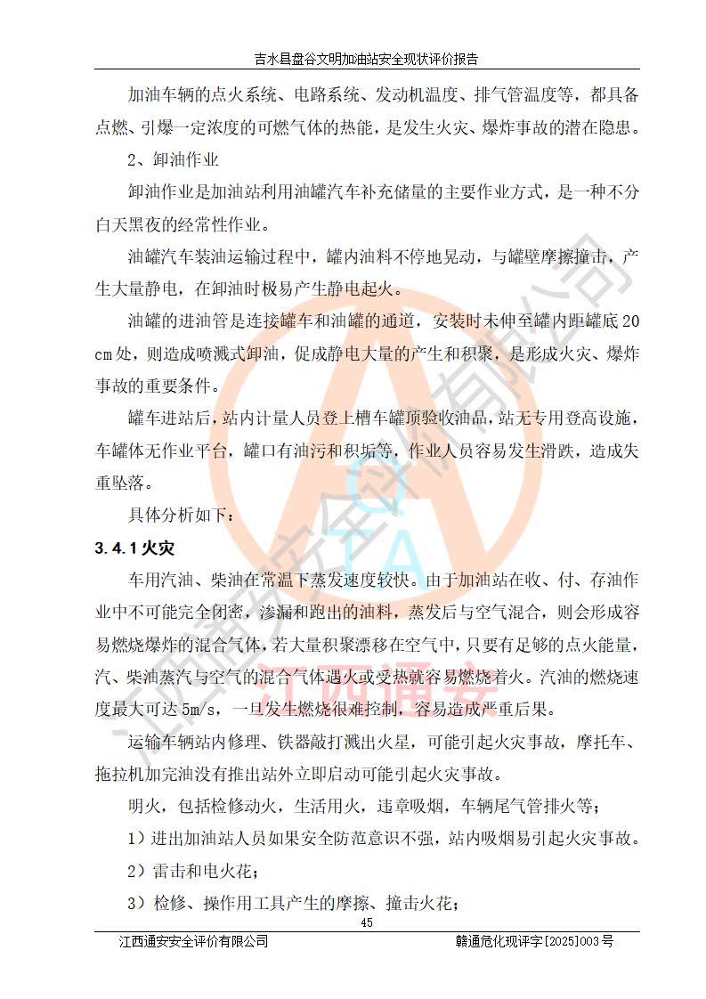 其它 | 在對(duì)該項(xiàng)目危險(xiǎn)、有害因素辨識(shí)分析的基礎(chǔ)上,運(yùn)用安全檢查表、預(yù)作業(yè)條件危險(xiǎn)性分析法、危險(xiǎn)度評(píng)價(jià)、重大事故后果分析結(jié)果等評(píng)價(jià)方法對(duì)該項(xiàng)目進(jìn)行了分析評(píng)價(jià),評(píng)價(jià)結(jié)果如下: 1、該項(xiàng)目位于江西省吉安市吉水縣盤(pán)谷鎮(zhèn)文明村,符合當(dāng)?shù)匾?guī)劃,與周邊環(huán)境的距離符合有關(guān)標(biāo)準(zhǔn)、規(guī)范的要求。 2、總圖布置分區(qū)明確,布局合理,各建構(gòu)筑物的防火間距滿(mǎn)足規(guī)范要求。 3、該項(xiàng)目無(wú)**明令淘汰的工藝,設(shè)備、設(shè)施與工藝條件、內(nèi)部介質(zhì)相適應(yīng),特種設(shè)備及設(shè)施較齊全,按規(guī)定設(shè)置防雷、防靜電接地,爆炸危險(xiǎn)環(huán)境加油機(jī)按要求采用防爆型,符合相關(guān)標(biāo)準(zhǔn)規(guī)范要求。 5、企業(yè)設(shè)置了安全生產(chǎn)管理機(jī)構(gòu),配備了專(zhuān)職安全生產(chǎn)管理人員,建立了安全生產(chǎn)責(zé)任制和安全生產(chǎn)管理制度,編制了崗位操作規(guī)程,編制了生產(chǎn)安全事故應(yīng)急預(yù)案,人員經(jīng)過(guò)相應(yīng)的培訓(xùn),企業(yè)的安全生產(chǎn)管理正常。 6、作業(yè)條件危險(xiǎn)性評(píng)價(jià)結(jié)果:在選定的評(píng)價(jià)單元中,作業(yè)危險(xiǎn)程度均為“一般危險(xiǎn),需要注意”,作業(yè)條件相對(duì)安全。 7、危險(xiǎn)度評(píng)價(jià)結(jié)果:汽油儲(chǔ)罐的危險(xiǎn)程度為中度危險(xiǎn)。油罐采用雙層罐埋地設(shè)置,按要求設(shè)置了通氣管,并裝設(shè)了阻火器;設(shè)置了液位監(jiān)測(cè)報(bào)警系統(tǒng)和緊急切斷系統(tǒng),埋地加油管道設(shè)置雙層管道,可以滿(mǎn)足安全生產(chǎn)條件要求。 評(píng)價(jià)結(jié)論: 吉水縣盤(pán)谷文明加油站符合《汽車(chē)加油加氣加氫站技術(shù)標(biāo)準(zhǔn)》GB50156-2021等標(biāo)準(zhǔn)規(guī)范的要求,安全風(fēng)險(xiǎn)可控,滿(mǎn)足危險(xiǎn)化學(xué)品經(jīng)營(yíng)的安全條件。 | ||||