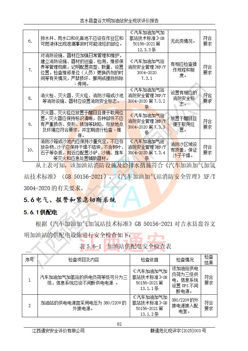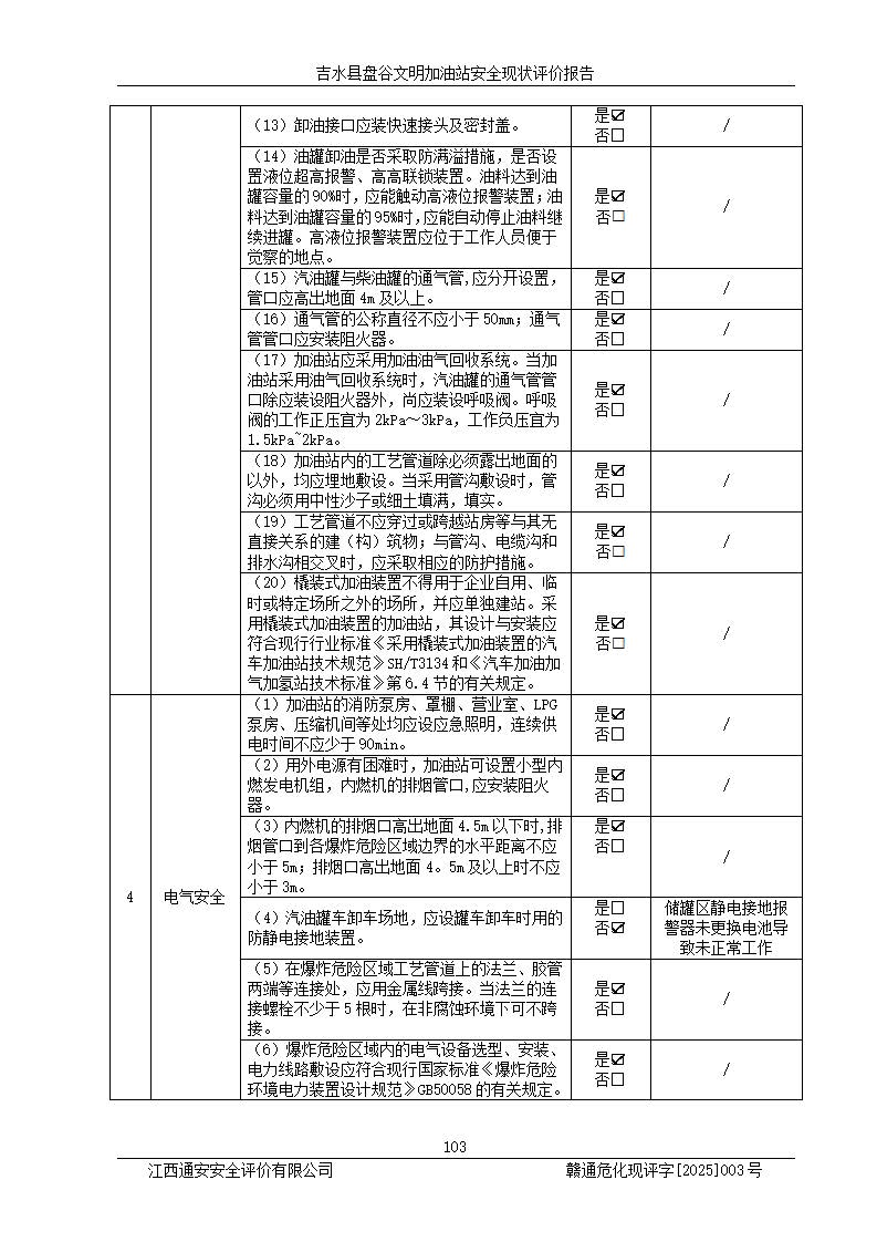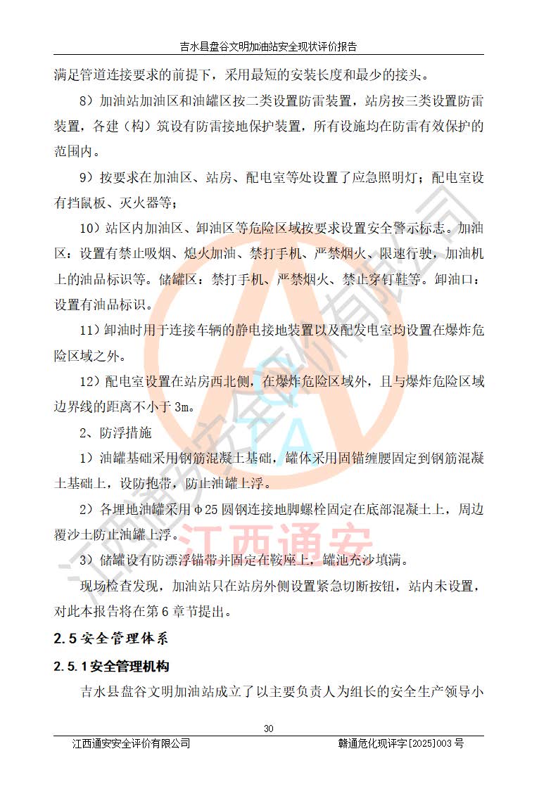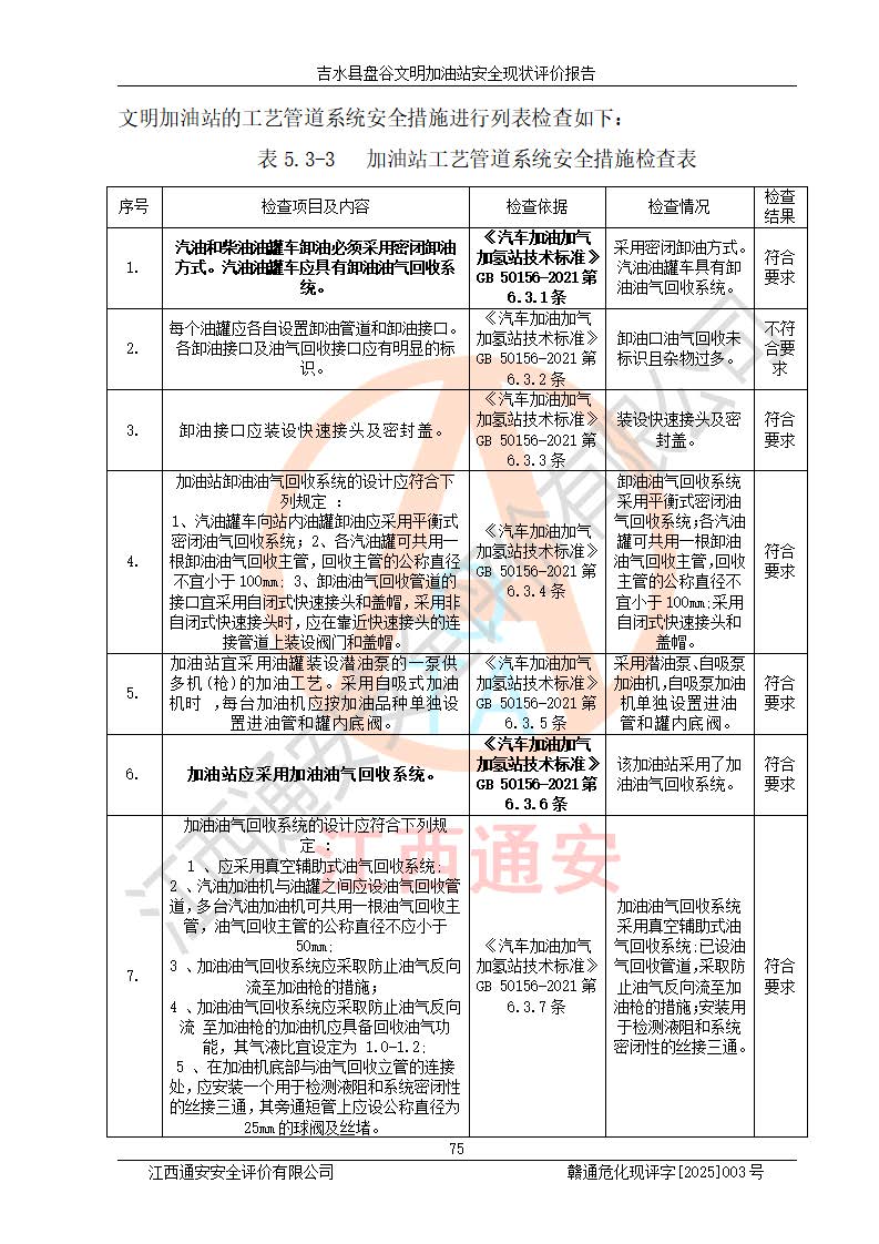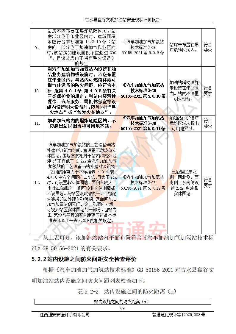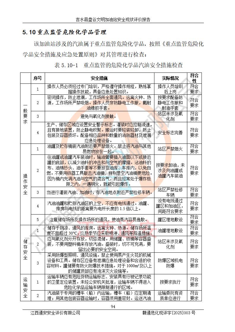 其它 | 在對(duì)該項(xiàng)目危險(xiǎn)、有害因素辨識(shí)分析的基礎(chǔ)上,運(yùn)用安全檢查表、預(yù)作業(yè)條件危險(xiǎn)性分析法、危險(xiǎn)度評(píng)價(jià)、重大事故后果分析結(jié)果等評(píng)價(jià)方法對(duì)該項(xiàng)目進(jìn)行了分析評(píng)價(jià),評(píng)價(jià)結(jié)果如下: 1、該項(xiàng)目位于江西省吉安市吉水縣盤(pán)谷鎮(zhèn)文明村,符合當(dāng)?shù)匾?guī)劃,與周邊環(huán)境的距離符合有關(guān)標(biāo)準(zhǔn)、規(guī)范的要求。 2、總圖布置分區(qū)明確,布局合理,各建構(gòu)筑物的防火間距滿(mǎn)足規(guī)范要求。 3、該項(xiàng)目無(wú)**明令淘汰的工藝,設(shè)備、設(shè)施與工藝條件、內(nèi)部介質(zhì)相適應(yīng),特種設(shè)備及設(shè)施較齊全,按規(guī)定設(shè)置防雷、防靜電接地,爆炸危險(xiǎn)環(huán)境加油機(jī)按要求采用防爆型,符合相關(guān)標(biāo)準(zhǔn)規(guī)范要求。 5、企業(yè)設(shè)置了安全生產(chǎn)管理機(jī)構(gòu),配備了專(zhuān)職安全生產(chǎn)管理人員,建立了安全生產(chǎn)責(zé)任制和安全生產(chǎn)管理制度,編制了崗位操作規(guī)程,編制了生產(chǎn)安全事故應(yīng)急預(yù)案,人員經(jīng)過(guò)相應(yīng)的培訓(xùn),企業(yè)的安全生產(chǎn)管理正常。 6、作業(yè)條件危險(xiǎn)性評(píng)價(jià)結(jié)果:在選定的評(píng)價(jià)單元中,作業(yè)危險(xiǎn)程度均為“一般危險(xiǎn),需要注意”,作業(yè)條件相對(duì)安全。 7、危險(xiǎn)度評(píng)價(jià)結(jié)果:汽油儲(chǔ)罐的危險(xiǎn)程度為中度危險(xiǎn)。油罐采用雙層罐埋地設(shè)置,按要求設(shè)置了通氣管,并裝設(shè)了阻火器;設(shè)置了液位監(jiān)測(cè)報(bào)警系統(tǒng)和緊急切斷系統(tǒng),埋地加油管道設(shè)置雙層管道,可以滿(mǎn)足安全生產(chǎn)條件要求。 評(píng)價(jià)結(jié)論: 吉水縣盤(pán)谷文明加油站符合《汽車(chē)加油加氣加氫站技術(shù)標(biāo)準(zhǔn)》GB50156-2021等標(biāo)準(zhǔn)規(guī)范的要求,安全風(fēng)險(xiǎn)可控,滿(mǎn)足危險(xiǎn)化學(xué)品經(jīng)營(yíng)的安全條件。 | ||||