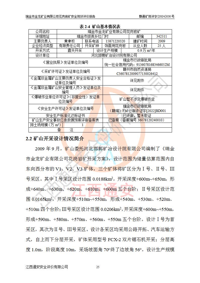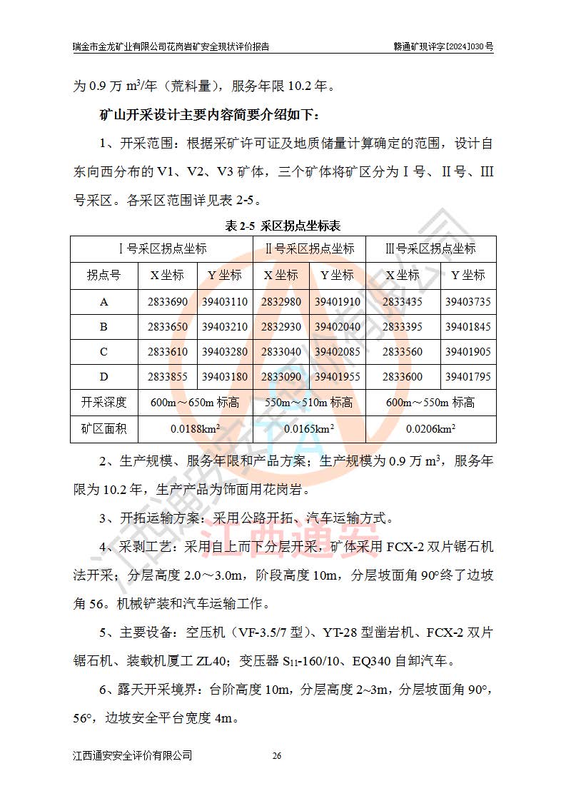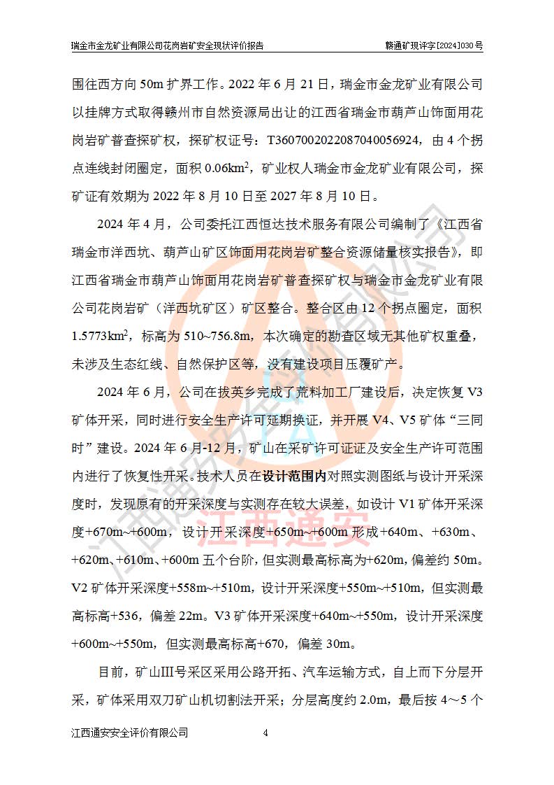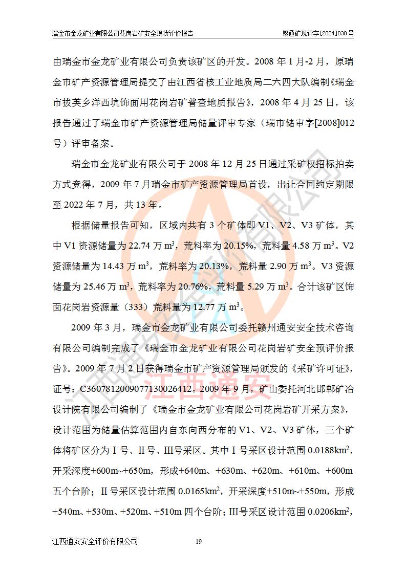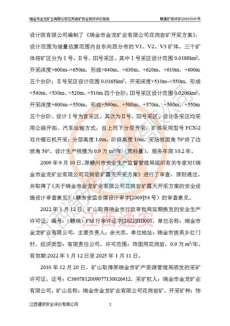 項(xiàng)目簡(jiǎn)介 | 瑞金市金龍礦業(yè)有限公司花崗巖礦位于瑞金市170°方位,直線(xiàn)距離約30**處。行政區(qū)隸屬于瑞金市拔英鄉(xiāng)紅門(mén)村管轄。拔英鄉(xiāng)有村級(jí)水泥公路通往紅門(mén)村,紅門(mén)村有簡(jiǎn)易公路通往洋西坑(礦區(qū))。礦區(qū)距206國(guó)道約25km,交通上屬方便。 瑞金市金龍礦業(yè)有限公司花崗巖礦是瑞金市**招商引資項(xiàng)目。項(xiàng)目由瑞金市金龍礦業(yè)有限公司負(fù)責(zé)該礦區(qū)的開(kāi)發(fā)。2008年1月-2月,原瑞金市礦產(chǎn)資源管理局提交了由江西省核工業(yè)地質(zhì)局二六四大隊(duì)編制《瑞金市拔英鄉(xiāng)洋西坑飾面用花崗巖礦普查地質(zhì)報(bào)告》,2008年4月25日,該報(bào)告通過(guò)了瑞金市礦產(chǎn)資源管理局儲(chǔ)量評(píng)審專(zhuān)家(瑞市儲(chǔ)審字[2008]012 號(hào))評(píng)審備案。 瑞金市金龍礦業(yè)有限公司于2008年12月25日通過(guò)采礦權(quán)招標(biāo)拍賣(mài)方式競(jìng)得,2009年7月瑞金市礦產(chǎn)資源管理局首設(shè),出讓合同約定期限至2022年7月,共13年。 根據(jù)儲(chǔ)量報(bào)告可知,區(qū)域內(nèi)共有3個(gè)礦體即V1、V2、V3礦體,其中V1資源儲(chǔ)量為22.74萬(wàn)m3,荒料率為20.15%,荒料量4.58萬(wàn)m3。V2資源儲(chǔ)量為14.43萬(wàn)m3,荒料率為20.13%,荒料量2.90萬(wàn)m3。V3資源儲(chǔ)量為25.46萬(wàn)m3,荒料率為20.76%,荒料量5.29萬(wàn)m3。合計(jì)該礦區(qū)飾面花崗巖資源量(333)荒料量為12.77萬(wàn)m3。 2009年3月,瑞金市金龍礦業(yè)有限公司委托贛州通安安全技術(shù)咨詢(xún)有限公司編制完成了《瑞金市金龍礦業(yè)有限公司花崗巖礦安全預(yù)評(píng)價(jià)報(bào)告》。2009年7月2日獲得瑞金市礦產(chǎn)資源管理局頒發(fā)的《采礦許可證》,證號(hào):C3607812009077130026412。2009年9月,礦山委托河北邯鄲礦冶設(shè)計(jì)院有限公司編制了《瑞金市金龍礦業(yè)有限公司花崗巖礦開(kāi)采方案》,設(shè)計(jì)范圍為儲(chǔ)量估算范圍內(nèi)自東向西分布的V1、V2、V3礦體,三個(gè)礦體將礦區(qū)分為Ⅰ號(hào)、Ⅱ號(hào)、Ⅲ號(hào)采區(qū)。其中Ⅰ號(hào)采區(qū)設(shè)計(jì)范圍0.0188km2,開(kāi)采深度+600m~+650m,形成+640m、+630m、+620m、+610m、+600m五個(gè)臺(tái)階;Ⅱ號(hào)采區(qū)設(shè)計(jì)范圍0.0165km2,開(kāi)采深度+510m~+550m,形成+540m、+530m、+520m、+510m四個(gè)臺(tái)階;Ⅲ號(hào)采區(qū)設(shè)計(jì)范圍0.0206km2,開(kāi)采深度+600m~+550m,形成+590m、+580m、+570m、+560m、+550m五個(gè)臺(tái)階。設(shè)計(jì)Ⅰ號(hào)為首采區(qū),其次為Ⅱ號(hào)、Ⅲ號(hào)采區(qū)。設(shè)計(jì)各采區(qū)均采用公路開(kāi)拓、汽車(chē)運(yùn)輸方式,自上而下分層開(kāi)采,礦體采用型號(hào)FCX-2雙片鋸石機(jī)開(kāi)采;分層**1.0m,階段**10m,采場(chǎng)坡面角70°終了邊坡角56°。設(shè)計(jì)生產(chǎn)規(guī)模為0.9萬(wàn)m3/年(荒料量),服務(wù)年限10.2年。 2009年9月10日,原贛州市安全生產(chǎn)監(jiān)督管理局組織有關(guān)專(zhuān)家對(duì)《瑞金市金龍礦業(yè)有限公司花崗巖礦露天開(kāi)采方案》進(jìn)行了審查,原則通過(guò),并取得了《關(guān)于瑞金市金龍礦業(yè)有限公司花崗巖礦露天開(kāi)采方案的安全設(shè)施設(shè)計(jì)審查意見(jiàn)》(贛市安監(jiān)非煤設(shè)計(jì)審字[2009]54號(hào))的審查意見(jiàn)。 2022年1月12日,礦山取得瑞金市行政審批局延期換發(fā)的安全生產(chǎn)許可證。編號(hào):(贛瑞)FM行審許證字[2022]BD001,單位名稱(chēng):瑞金市金龍礦業(yè)有限公司,主要負(fù)責(zé)人:余光忠,單位地址:瑞金市拔英鄉(xiāng)紅門(mén)村,經(jīng)濟(jì)類(lèi)型:有限責(zé)任公司,許可范圍:飾面用花崗巖,0.9萬(wàn)m3/年。**期:2022年1月12日至2025年1月11日。 2010年12月20日,礦山取得原瑞金市礦產(chǎn)資源管理局頒發(fā)的采礦許可證,證號(hào):C3607812009077130026412,采礦權(quán)人:瑞金市金龍礦業(yè)有限公司,礦山名稱(chēng):瑞金市金龍礦業(yè)有限公司花崗巖礦,開(kāi)采礦種:飾面用花崗巖,開(kāi)采方式:露天開(kāi)采,生產(chǎn)規(guī)模:0.9萬(wàn)m3/a,礦區(qū)面積;1.807km2,**期限:壹拾貳年,自2010年7月2日至2022年7月2日。開(kāi)采深度由670m至510m標(biāo)高,共有6個(gè)拐點(diǎn)圈定。 礦山取得安全生產(chǎn)許可證第二輪延期換證后,主要集中在Ⅲ號(hào)采區(qū)進(jìn)行開(kāi)采,Ⅰ號(hào)、Ⅱ號(hào)采區(qū)暫未開(kāi)采。2019年至2022年期間,礦山內(nèi)部進(jìn)行了股權(quán)變更,加上新建荒料加工廠(chǎng)未投產(chǎn),故礦山處于半停產(chǎn)狀態(tài)。該期間礦山主要進(jìn)行了綠色礦山建設(shè)工程及Ⅲ號(hào)采區(qū)原有荒料搬運(yùn)工作。 2022年采礦許可證到期后,公司開(kāi)展了延期換證工作,并進(jìn)行了儲(chǔ)量增儲(chǔ)工作,新增了V4、V5、V6(后期V5與V6礦體合并為V5礦體)。因原采礦許可證坐標(biāo)系為80系坐標(biāo),新采礦許可證坐標(biāo)系為2000坐標(biāo)系,在坐標(biāo)系轉(zhuǎn)換過(guò)程中存在采礦許可證平面范圍整體往東方向偏移50m左右,造成東邊有部分礦區(qū)范圍在福建省境內(nèi),西邊V3礦體原設(shè)計(jì)開(kāi)采范圍部分在界外(大約50m)。 為更好的管理該采礦權(quán),本次采礦許可證延期換證對(duì)其在福建省境