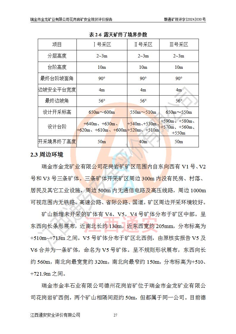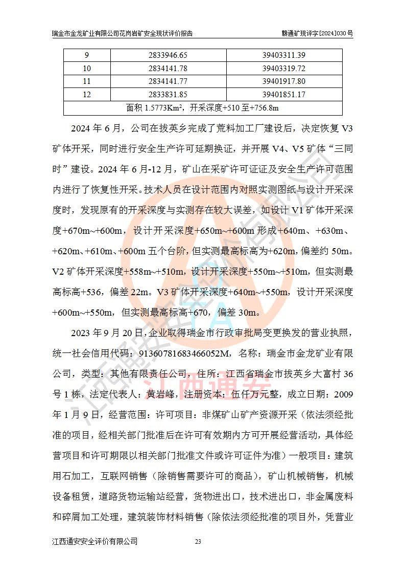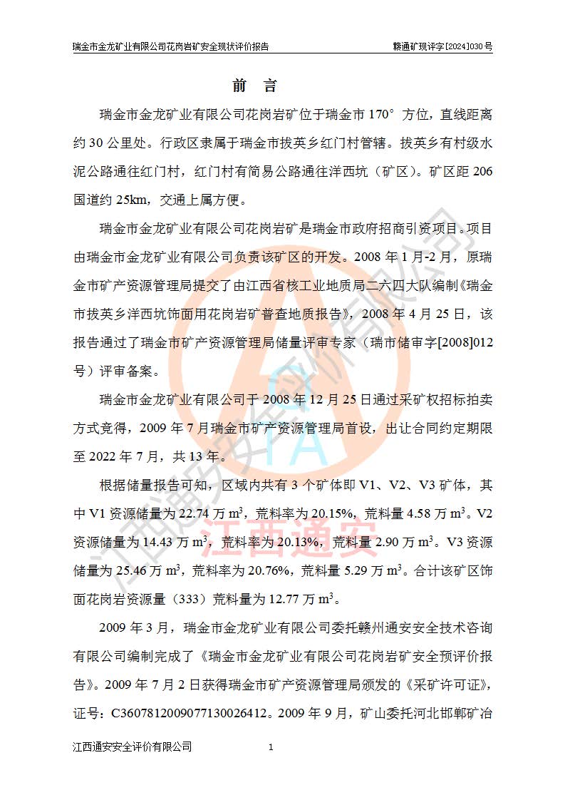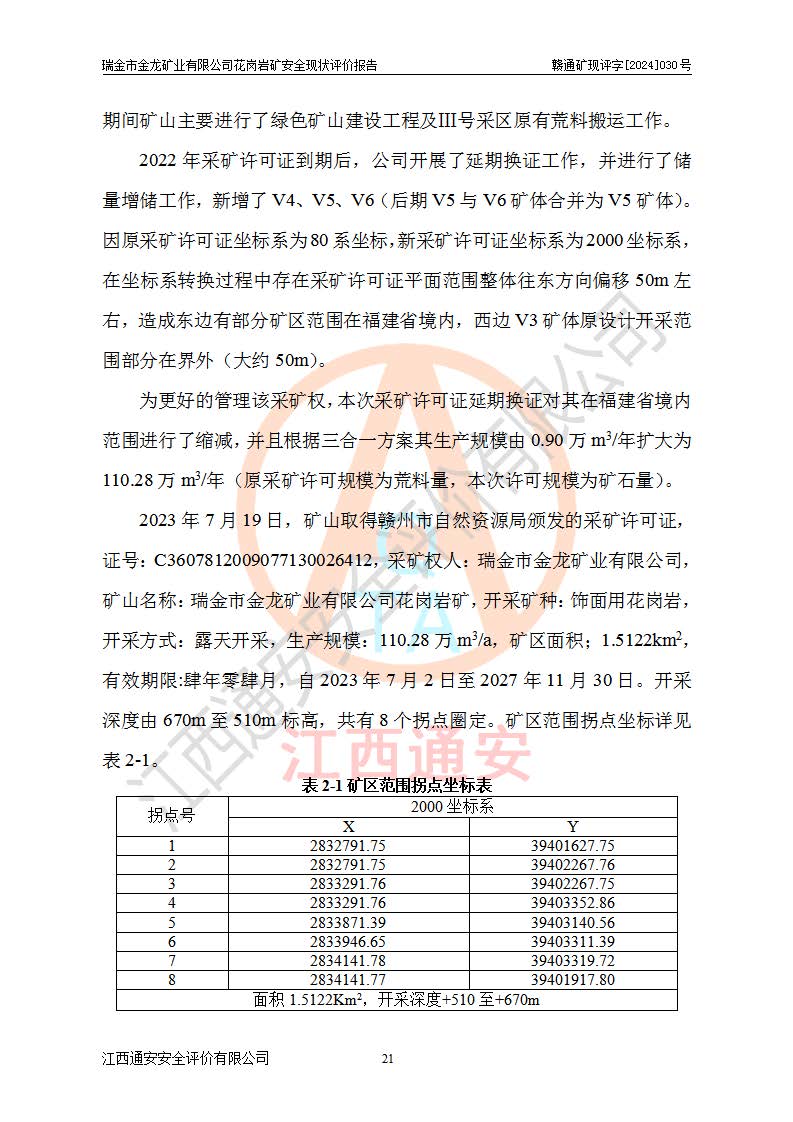項(xiàng)目簡(jiǎn)介 | 瑞金市金龍礦業(yè)有限公司花崗巖礦位于瑞金市170°方位,直線(xiàn)距離約30**處。行政區(qū)隸屬于瑞金市拔英鄉(xiāng)紅門(mén)村管轄。拔英鄉(xiāng)有村級(jí)水泥公路通往紅門(mén)村,紅門(mén)村有簡(jiǎn)易公路通往洋西坑(礦區(qū))。礦區(qū)距206國(guó)道約25km,交通上屬方便。 瑞金市金龍礦業(yè)有限公司花崗巖礦是瑞金市**招商引資項(xiàng)目。項(xiàng)目由瑞金市金龍礦業(yè)有限公司負(fù)責(zé)該礦區(qū)的開(kāi)發(fā)。2008年1月-2月,原瑞金市礦產(chǎn)資源管理局提交了由江西省核工業(yè)地質(zhì)局二六四大隊(duì)編制《瑞金市拔英鄉(xiāng)洋西坑飾面用花崗巖礦普查地質(zhì)報(bào)告》,2008年4月25日,該報(bào)告通過(guò)了瑞金市礦產(chǎn)資源管理局儲(chǔ)量評(píng)審專(zhuān)家(瑞市儲(chǔ)審字[2008]012 號(hào))評(píng)審備案。 瑞金市金龍礦業(yè)有限公司于2008年12月25日通過(guò)采礦權(quán)招標(biāo)拍賣(mài)方式競(jìng)得,2009年7月瑞金市礦產(chǎn)資源管理局首設(shè),出讓合同約定期限至2022年7月,共13年。 根據(jù)儲(chǔ)量報(bào)告可知,區(qū)域內(nèi)共有3個(gè)礦體即V1、V2、V3礦體,其中V1資源儲(chǔ)量為22.74萬(wàn)m3,荒料率為20.15%,荒料量4.58萬(wàn)m3。V2資源儲(chǔ)量為14.43萬(wàn)m3,荒料率為20.13%,荒料量2.90萬(wàn)m3。V3資源儲(chǔ)量為25.46萬(wàn)m3,荒料率為20.76%,荒料量5.29萬(wàn)m3。合計(jì)該礦區(qū)飾面花崗巖資源量(333)荒料量為12.77萬(wàn)m3。 2009年3月,瑞金市金龍礦業(yè)有限公司委托贛州通安安全技術(shù)咨詢(xún)有限公司編制完成了《瑞金市金龍礦業(yè)有限公司花崗巖礦安全預(yù)評(píng)價(jià)報(bào)告》。2009年7月2日獲得瑞金市礦產(chǎn)資源管理局頒發(fā)的《采礦許可證》,證號(hào):C3607812009077130026412。2009年9月,礦山委托河北邯鄲礦冶設(shè)計(jì)院有限公司編制了《瑞金市金龍礦業(yè)有限公司花崗巖礦開(kāi)采方案》,設(shè)計(jì)范圍為儲(chǔ)量估算范圍內(nèi)自東向西分布的V1、V2、V3礦體,三個(gè)礦體將礦區(qū)分為Ⅰ號(hào)、Ⅱ號(hào)、Ⅲ號(hào)采區(qū)。其中Ⅰ號(hào)采區(qū)設(shè)計(jì)范圍0.0188km2,開(kāi)采深度+600m~+650m,形成+640m、+630m、+620m、+610m、+600m五個(gè)臺(tái)階;Ⅱ號(hào)采區(qū)設(shè)計(jì)范圍0.0165km2,開(kāi)采深度+510m~+550m,形成+540m、+530m、+520m、+510m四個(gè)臺(tái)階;Ⅲ號(hào)采區(qū)設(shè)計(jì)范圍0.0206km2,開(kāi)采深度+600m~+550m,形成+590m、+580m、+570m、+560m、+550m五個(gè)臺(tái)階。設(shè)計(jì)Ⅰ號(hào)為首采區(qū),其次為Ⅱ號(hào)、Ⅲ號(hào)采區(qū)。設(shè)計(jì)各采區(qū)均采用公路開(kāi)拓、汽車(chē)運(yùn)輸方式,自上而下分層開(kāi)采,礦體采用型號(hào)FCX-2雙片鋸石機(jī)開(kāi)采;分層**1.0m,階段**10m,采場(chǎng)坡面角70°終了邊坡角56°。設(shè)計(jì)生產(chǎn)規(guī)模為0.9萬(wàn)m3/年(荒料量),服務(wù)年限10.2年。 2009年9月10日,原贛州市安全生產(chǎn)監(jiān)督管理局組織有關(guān)專(zhuān)家對(duì)《瑞金市金龍礦業(yè)有限公司花崗巖礦露天開(kāi)采方案》進(jìn)行了審查,原則通過(guò),并取得了《關(guān)于瑞金市金龍礦業(yè)有限公司花崗巖礦露天開(kāi)采方案的安全設(shè)施設(shè)計(jì)審查意見(jiàn)》(贛市安監(jiān)非煤設(shè)計(jì)審字[2009]54號(hào))的審查意見(jiàn)。 2022年1月12日,礦山取得瑞金市行政審批局延期換發(fā)的安全生產(chǎn)許可證。編號(hào):(贛瑞)FM行審許證字[2022]BD001,單位名稱(chēng):瑞金市金龍礦業(yè)有限公司,主要負(fù)責(zé)人:余光忠,單位地址:瑞金市拔英鄉(xiāng)紅門(mén)村,經(jīng)濟(jì)類(lèi)型:有限責(zé)任公司,許可范圍:飾面用花崗巖,0.9萬(wàn)m3/年。**期:2022年1月12日至2025年1月11日。 2010年12月20日,礦山取得原瑞金市礦產(chǎn)資源管理局頒發(fā)的采礦許可證,證號(hào):C3607812009077130026412,采礦權(quán)人:瑞金市金龍礦業(yè)有限公司,礦山名稱(chēng):瑞金市金龍礦業(yè)有限公司花崗巖礦,開(kāi)采礦種:飾面用花崗巖,開(kāi)采方式:露天開(kāi)采,生產(chǎn)規(guī)模:0.9萬(wàn)m3/a,礦區(qū)面積;1.807km2,**期限:壹拾貳年,自2010年7月2日至2022年7月2日。開(kāi)采深度由670m至510m標(biāo)高,共有6個(gè)拐點(diǎn)圈定。 礦山取得安全生產(chǎn)許可證第二輪延期換證后,主要集中在Ⅲ號(hào)采區(qū)進(jìn)行開(kāi)采,Ⅰ號(hào)、Ⅱ號(hào)采區(qū)暫未開(kāi)采。2019年至2022年期間,礦山內(nèi)部進(jìn)行了股權(quán)變更,加上新建荒料加工廠(chǎng)未投產(chǎn),故礦山處于半停產(chǎn)狀態(tài)。該期間礦山主要進(jìn)行了綠色礦山建設(shè)工程及Ⅲ號(hào)采區(qū)原有荒料搬運(yùn)工作。 2022年采礦許可證到期后,公司開(kāi)展了延期換證工作,并進(jìn)行了儲(chǔ)量增儲(chǔ)工作,新增了V4、V5、V6(后期V5與V6礦體合并為V5礦體)。因原采礦許可證坐標(biāo)系為80系坐標(biāo),新采礦許可證坐標(biāo)系為2000坐標(biāo)系,在坐標(biāo)系轉(zhuǎn)換過(guò)程中存在采礦許可證平面范圍整體往東方向偏移50m左右,造成東邊有部分礦區(qū)范圍在福建省境內(nèi),西邊V3礦體原設(shè)計(jì)開(kāi)采范圍部分在界外(大約50m)。 為更好的管理該采礦權(quán),本次采礦許可證延期換證對(duì)其在福建省境