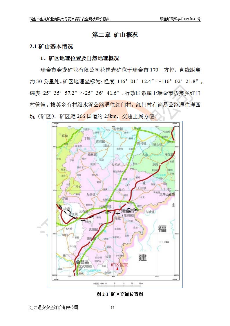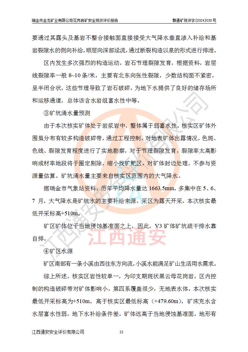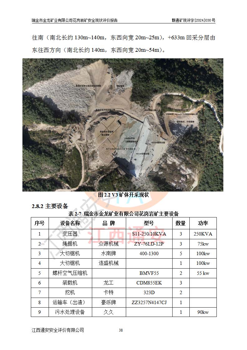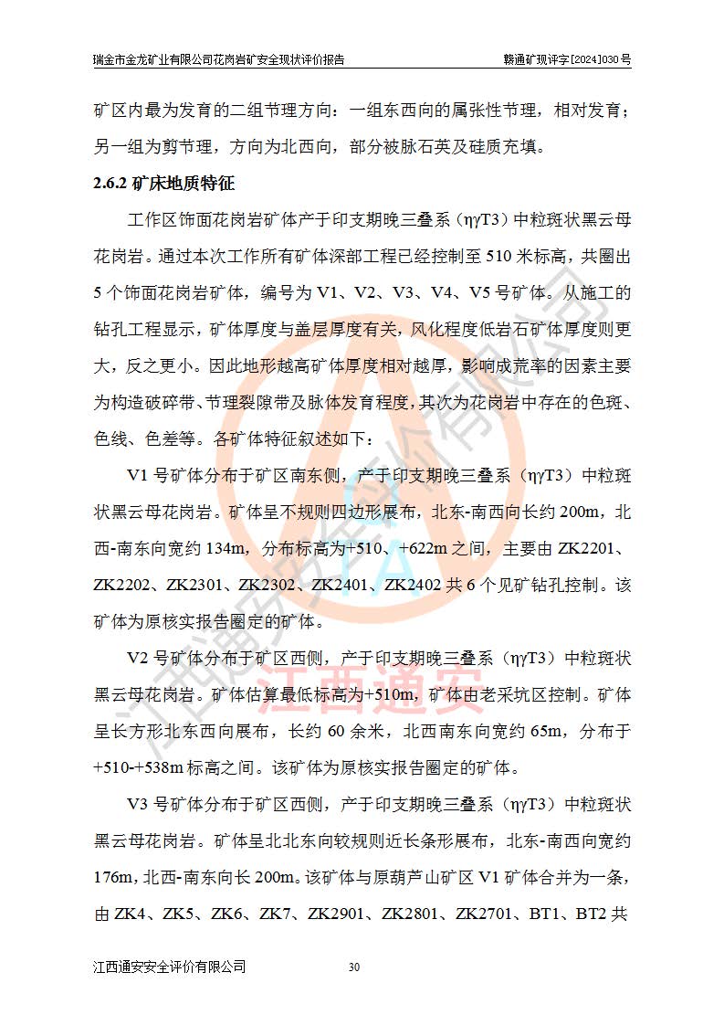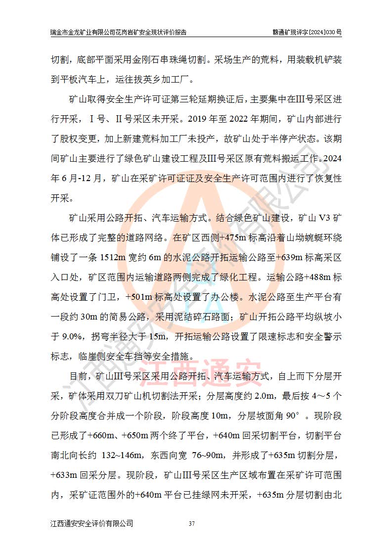 項(xiàng)目簡(jiǎn)介 | 瑞金市金龍礦業(yè)有限公司花崗巖礦位于瑞金市170°方位,直線(xiàn)距離約30**處。行政區(qū)隸屬于瑞金市拔英鄉(xiāng)紅門(mén)村管轄。拔英鄉(xiāng)有村級(jí)水泥公路通往紅門(mén)村,紅門(mén)村有簡(jiǎn)易公路通往洋西坑(礦區(qū))。礦區(qū)距206國(guó)道約25km,交通上屬方便。 瑞金市金龍礦業(yè)有限公司花崗巖礦是瑞金市**招商引資項(xiàng)目。項(xiàng)目由瑞金市金龍礦業(yè)有限公司負(fù)責(zé)該礦區(qū)的開(kāi)發(fā)。2008年1月-2月,原瑞金市礦產(chǎn)資源管理局提交了由江西省核工業(yè)地質(zhì)局二六四大隊(duì)編制《瑞金市拔英鄉(xiāng)洋西坑飾面用花崗巖礦普查地質(zhì)報(bào)告》,2008年4月25日,該報(bào)告通過(guò)了瑞金市礦產(chǎn)資源管理局儲(chǔ)量評(píng)審專(zhuān)家(瑞市儲(chǔ)審字[2008]012 號(hào))評(píng)審備案。 瑞金市金龍礦業(yè)有限公司于2008年12月25日通過(guò)采礦權(quán)招標(biāo)拍賣(mài)方式競(jìng)得,2009年7月瑞金市礦產(chǎn)資源管理局首設(shè),出讓合同約定期限至2022年7月,共13年。 根據(jù)儲(chǔ)量報(bào)告可知,區(qū)域內(nèi)共有3個(gè)礦體即V1、V2、V3礦體,其中V1資源儲(chǔ)量為22.74萬(wàn)m3,荒料率為20.15%,荒料量4.58萬(wàn)m3。V2資源儲(chǔ)量為14.43萬(wàn)m3,荒料率為20.13%,荒料量2.90萬(wàn)m3。V3資源儲(chǔ)量為25.46萬(wàn)m3,荒料率為20.76%,荒料量5.29萬(wàn)m3。合計(jì)該礦區(qū)飾面花崗巖資源量(333)荒料量為12.77萬(wàn)m3。 2009年3月,瑞金市金龍礦業(yè)有限公司委托贛州通安安全技術(shù)咨詢(xún)有限公司編制完成了《瑞金市金龍礦業(yè)有限公司花崗巖礦安全預(yù)評(píng)價(jià)報(bào)告》。2009年7月2日獲得瑞金市礦產(chǎn)資源管理局頒發(fā)的《采礦許可證》,證號(hào):C3607812009077130026412。2009年9月,礦山委托河北邯鄲礦冶設(shè)計(jì)院有限公司編制了《瑞金市金龍礦業(yè)有限公司花崗巖礦開(kāi)采方案》,設(shè)計(jì)范圍為儲(chǔ)量估算范圍內(nèi)自東向西分布的V1、V2、V3礦體,三個(gè)礦體將礦區(qū)分為Ⅰ號(hào)、Ⅱ號(hào)、Ⅲ號(hào)采區(qū)。其中Ⅰ號(hào)采區(qū)設(shè)計(jì)范圍0.0188km2,開(kāi)采深度+600m~+650m,形成+640m、+630m、+620m、+610m、+600m五個(gè)臺(tái)階;Ⅱ號(hào)采區(qū)設(shè)計(jì)范圍0.0165km2,開(kāi)采深度+510m~+550m,形成+540m、+530m、+520m、+510m四個(gè)臺(tái)階;Ⅲ號(hào)采區(qū)設(shè)計(jì)范圍0.0206km2,開(kāi)采深度+600m~+550m,形成+590m、+580m、+570m、+560m、+550m五個(gè)臺(tái)階。設(shè)計(jì)Ⅰ號(hào)為首采區(qū),其次為Ⅱ號(hào)、Ⅲ號(hào)采區(qū)。設(shè)計(jì)各采區(qū)均采用公路開(kāi)拓、汽車(chē)運(yùn)輸方式,自上而下分層開(kāi)采,礦體采用型號(hào)FCX-2雙片鋸石機(jī)開(kāi)采;分層**1.0m,階段**10m,采場(chǎng)坡面角70°終了邊坡角56°。設(shè)計(jì)生產(chǎn)規(guī)模為0.9萬(wàn)m3/年(荒料量),服務(wù)年限10.2年。 2009年9月10日,原贛州市安全生產(chǎn)監(jiān)督管理局組織有關(guān)專(zhuān)家對(duì)《瑞金市金龍礦業(yè)有限公司花崗巖礦露天開(kāi)采方案》進(jìn)行了審查,原則通過(guò),并取得了《關(guān)于瑞金市金龍礦業(yè)有限公司花崗巖礦露天開(kāi)采方案的安全設(shè)施設(shè)計(jì)審查意見(jiàn)》(贛市安監(jiān)非煤設(shè)計(jì)審字[2009]54號(hào))的審查意見(jiàn)。 2022年1月12日,礦山取得瑞金市行政審批局延期換發(fā)的安全生產(chǎn)許可證。編號(hào):(贛瑞)FM行審許證字[2022]BD001,單位名稱(chēng):瑞金市金龍礦業(yè)有限公司,主要負(fù)責(zé)人:余光忠,單位地址:瑞金市拔英鄉(xiāng)紅門(mén)村,經(jīng)濟(jì)類(lèi)型:有限責(zé)任公司,許可范圍:飾面用花崗巖,0.9萬(wàn)m3/年。**期:2022年1月12日至2025年1月11日。 2010年12月20日,礦山取得原瑞金市礦產(chǎn)資源管理局頒發(fā)的采礦許可證,證號(hào):C3607812009077130026412,采礦權(quán)人:瑞金市金龍礦業(yè)有限公司,礦山名稱(chēng):瑞金市金龍礦業(yè)有限公司花崗巖礦,開(kāi)采礦種:飾面用花崗巖,開(kāi)采方式:露天開(kāi)采,生產(chǎn)規(guī)模:0.9萬(wàn)m3/a,礦區(qū)面積;1.807km2,**期限:壹拾貳年,自2010年7月2日至2022年7月2日。開(kāi)采深度由670m至510m標(biāo)高,共有6個(gè)拐點(diǎn)圈定。 礦山取得安全生產(chǎn)許可證第二輪延期換證后,主要集中在Ⅲ號(hào)采區(qū)進(jìn)行開(kāi)采,Ⅰ號(hào)、Ⅱ號(hào)采區(qū)暫未開(kāi)采。2019年至2022年期間,礦山內(nèi)部進(jìn)行了股權(quán)變更,加上新建荒料加工廠(chǎng)未投產(chǎn),故礦山處于半停產(chǎn)狀態(tài)。該期間礦山主要進(jìn)行了綠色礦山建設(shè)工程及Ⅲ號(hào)采區(qū)原有荒料搬運(yùn)工作。 2022年采礦許可證到期后,公司開(kāi)展了延期換證工作,并進(jìn)行了儲(chǔ)量增儲(chǔ)工作,新增了V4、V5、V6(后期V5與V6礦體合并為V5礦體)。因原采礦許可證坐標(biāo)系為80系坐標(biāo),新采礦許可證坐標(biāo)系為2000坐標(biāo)系,在坐標(biāo)系轉(zhuǎn)換過(guò)程中存在采礦許可證平面范圍整體往東方向偏移50m左右,造成東邊有部分礦區(qū)范圍在福建省境內(nèi),西邊V3礦體原設(shè)計(jì)開(kāi)采范圍部分在界外(大約50m)。 為更好的管理該采礦權(quán),本次采礦許可證延期換證對(duì)其在福建省境