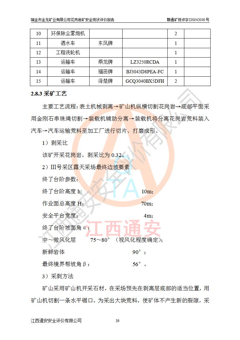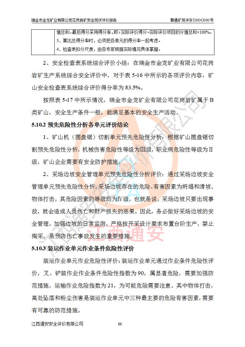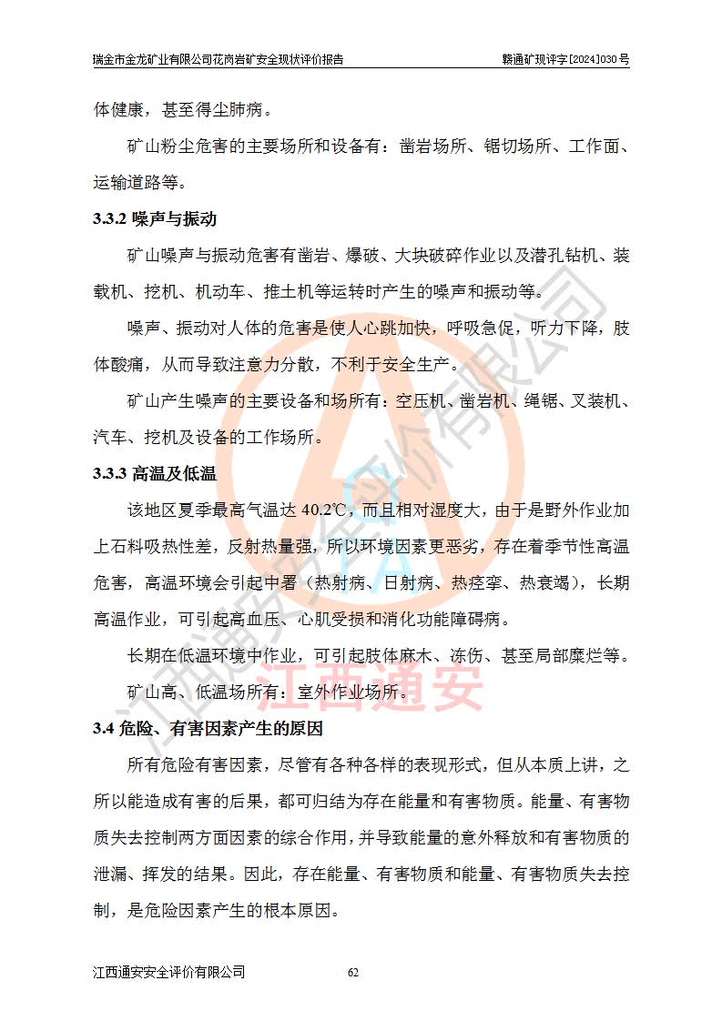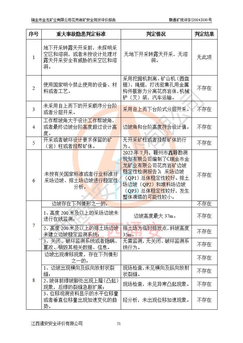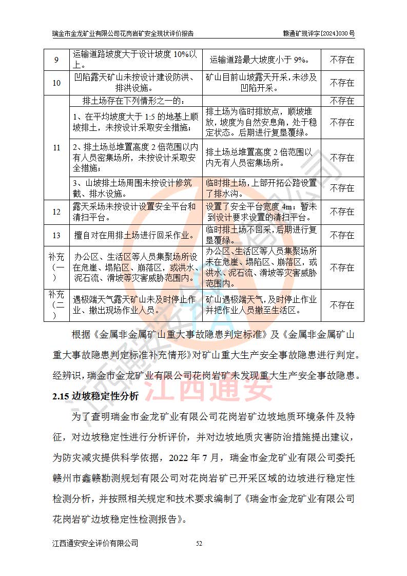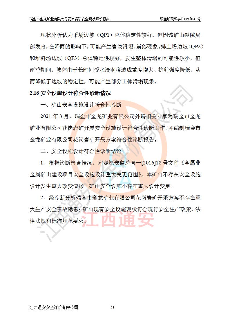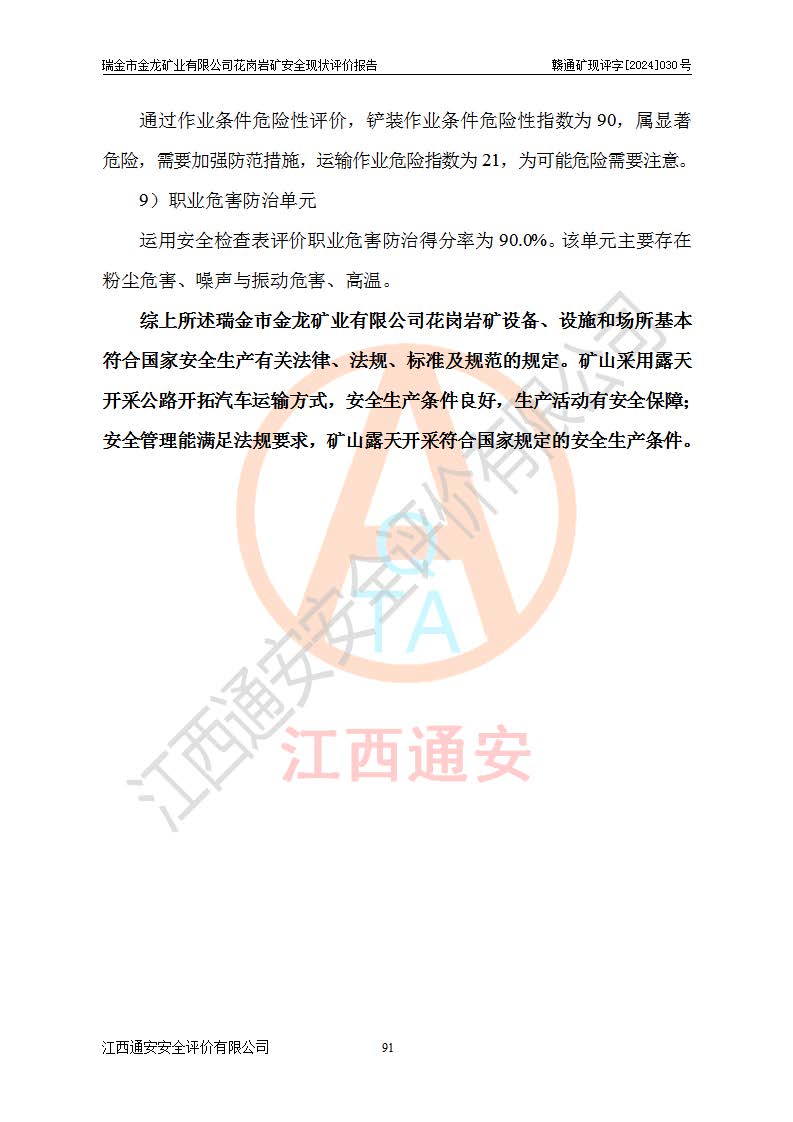 其它 | 瑞金市金龍礦業(yè)有限公司花崗巖礦設(shè)備、設(shè)施和場(chǎng)所基本符合**安全生產(chǎn)有關(guān)法律、法規(guī)、標(biāo)準(zhǔn)及規(guī)范的規(guī)定。礦山采用露天開(kāi)采公路開(kāi)拓汽車(chē)運(yùn)輸方式,安全生產(chǎn)條件良好,生產(chǎn)活動(dòng)有安全保障;安全管理能滿(mǎn)足法規(guī)要求,礦山露天開(kāi)采符合**規(guī)定的安全生產(chǎn)條件。 | ||||