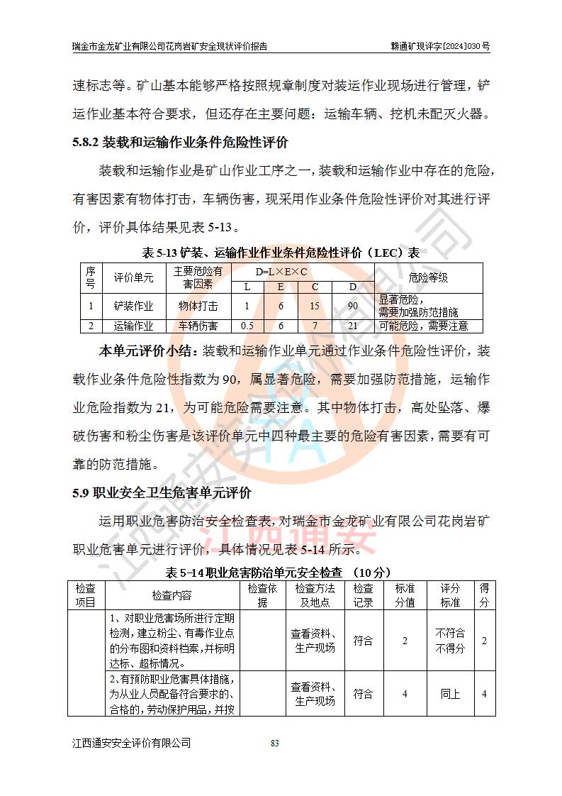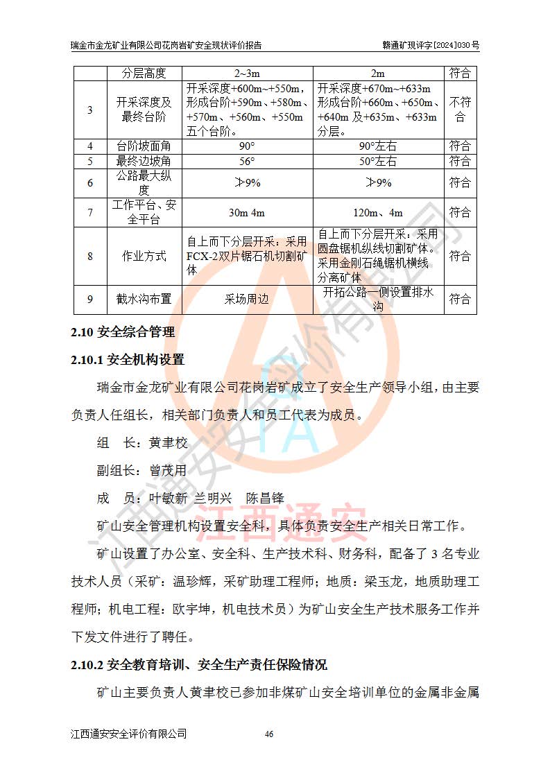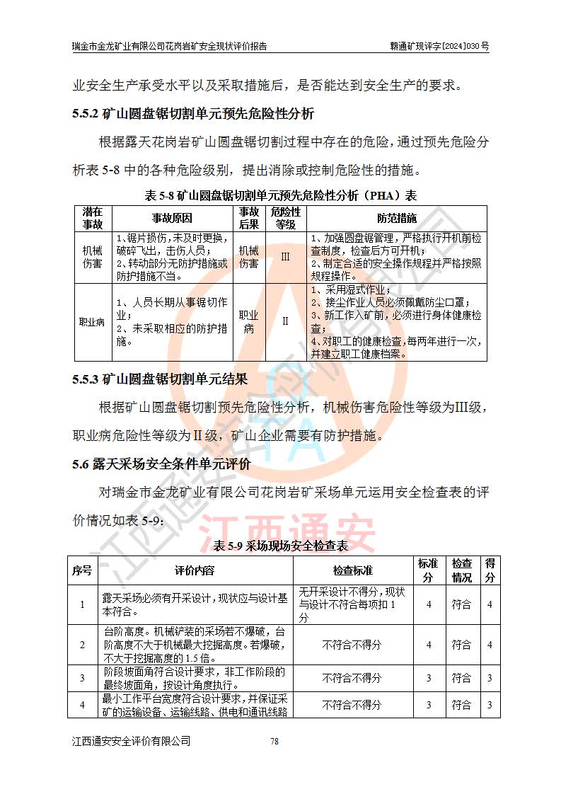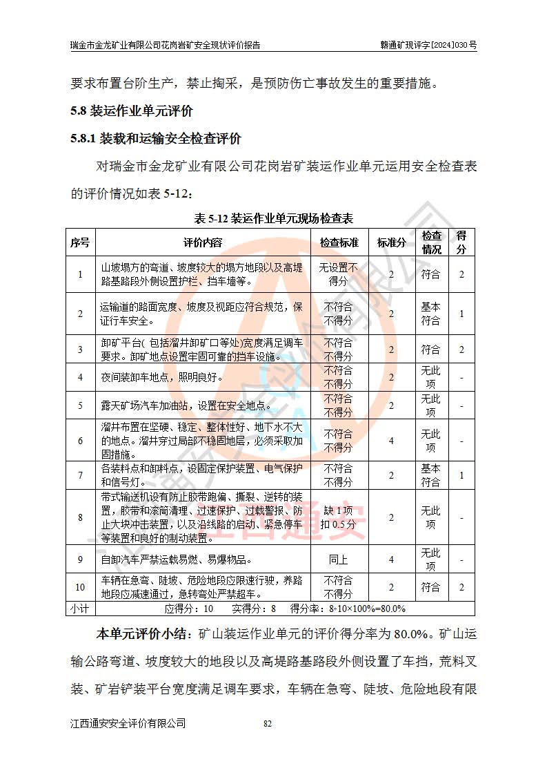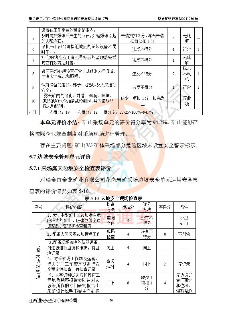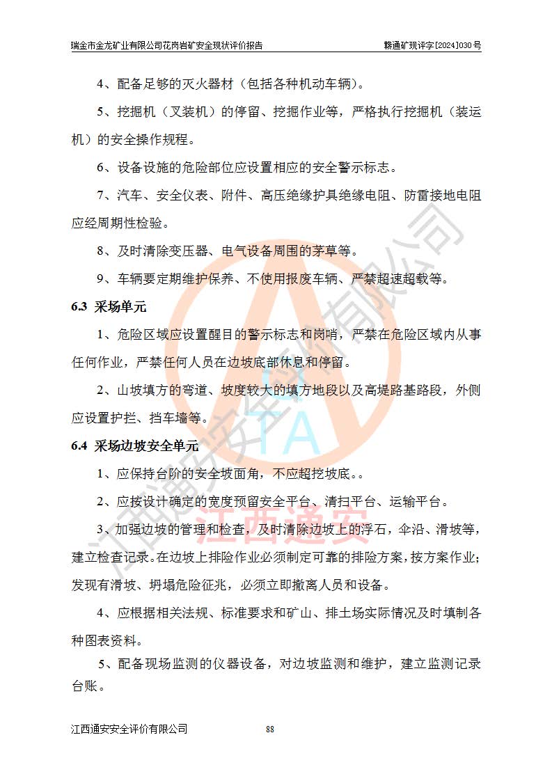 其它 | 瑞金市金龍礦業(yè)有限公司花崗巖礦設(shè)備、設(shè)施和場(chǎng)所基本符合**安全生產(chǎn)有關(guān)法律、法規(guī)、標(biāo)準(zhǔn)及規(guī)范的規(guī)定。礦山采用露天開(kāi)采公路開(kāi)拓汽車(chē)運(yùn)輸方式,安全生產(chǎn)條件良好,生產(chǎn)活動(dòng)有安全保障;安全管理能滿(mǎn)足法規(guī)要求,礦山露天開(kāi)采符合**規(guī)定的安全生產(chǎn)條件。 | ||||