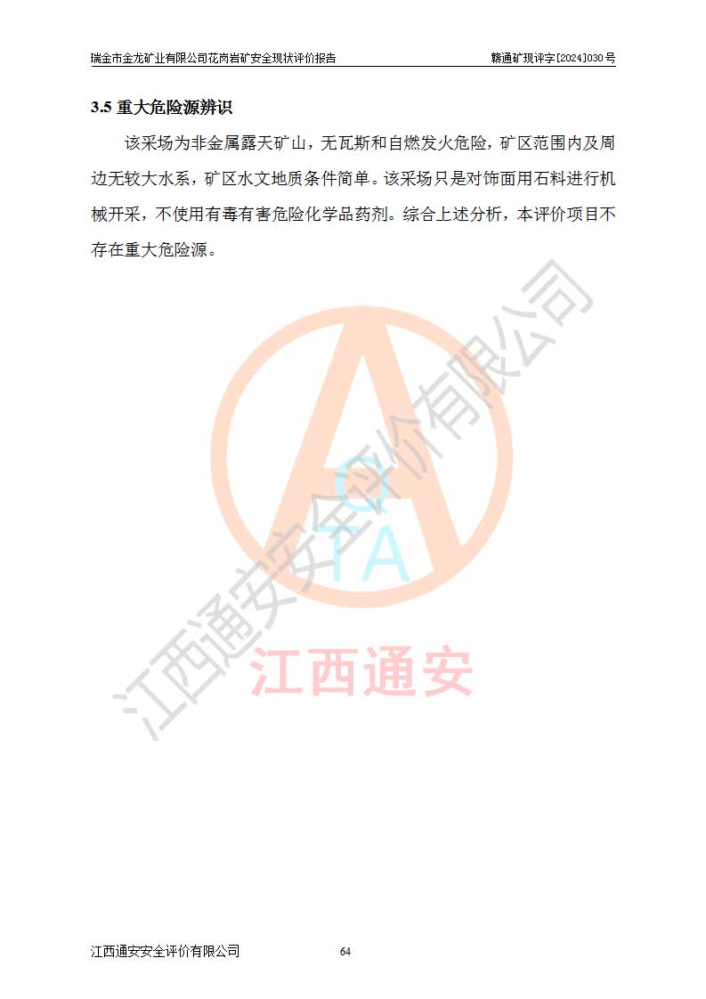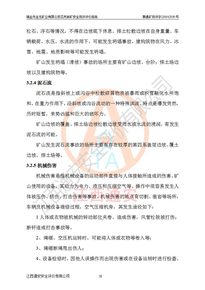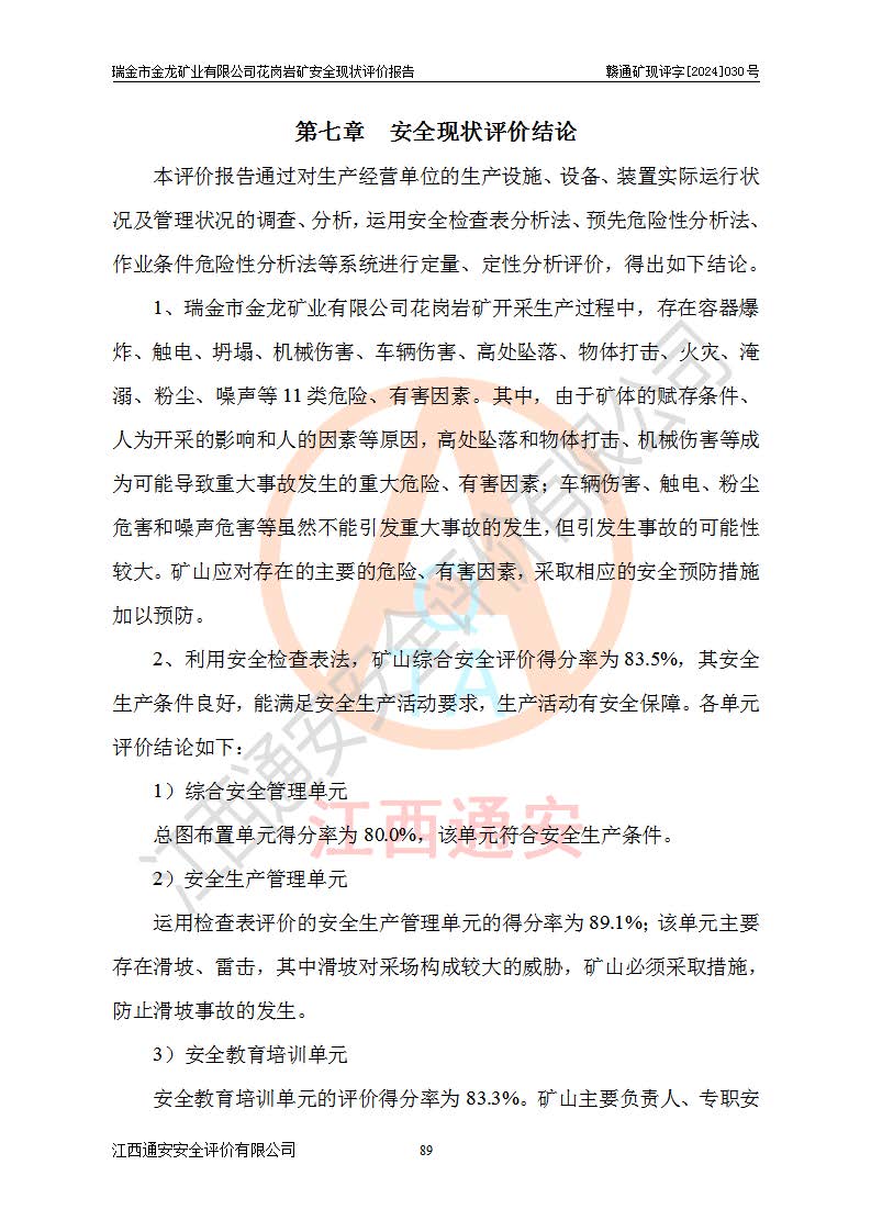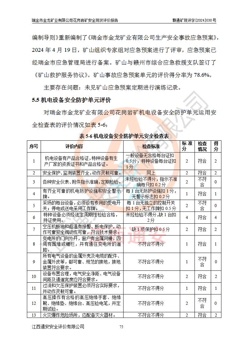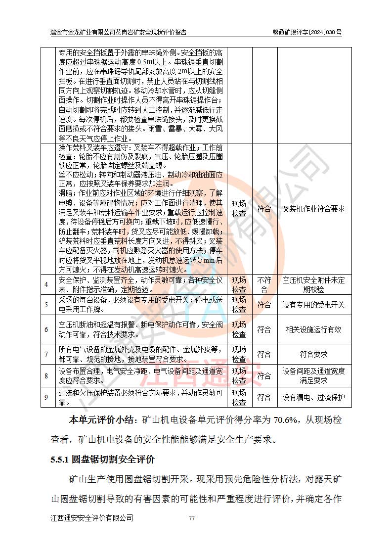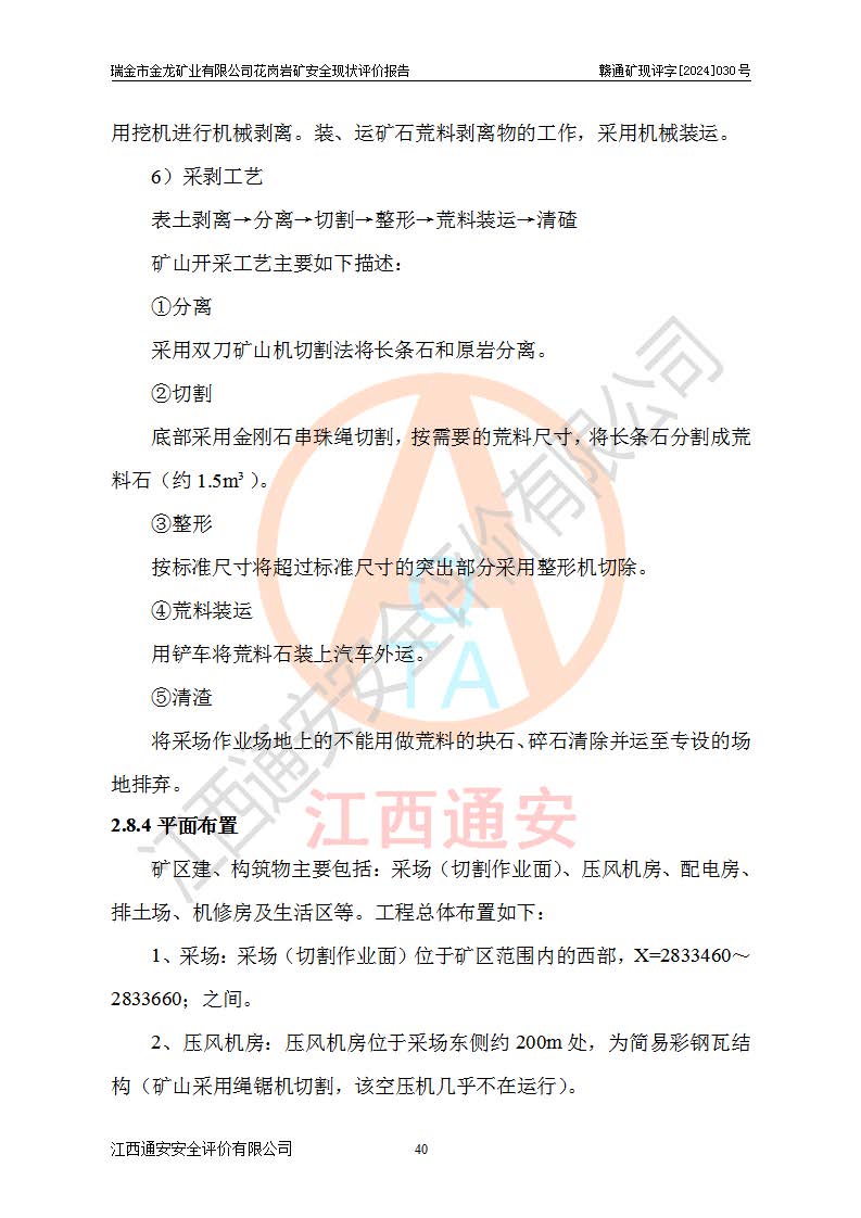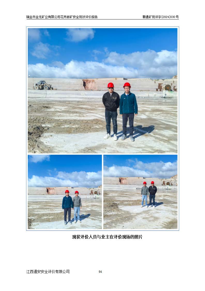 其它 | 瑞金市金龍礦業(yè)有限公司花崗巖礦設(shè)備、設(shè)施和場(chǎng)所基本符合**安全生產(chǎn)有關(guān)法律、法規(guī)、標(biāo)準(zhǔn)及規(guī)范的規(guī)定。礦山采用露天開(kāi)采公路開(kāi)拓汽車(chē)運(yùn)輸方式,安全生產(chǎn)條件良好,生產(chǎn)活動(dòng)有安全保障;安全管理能滿(mǎn)足法規(guī)要求,礦山露天開(kāi)采符合**規(guī)定的安全生產(chǎn)條件。 | ||||