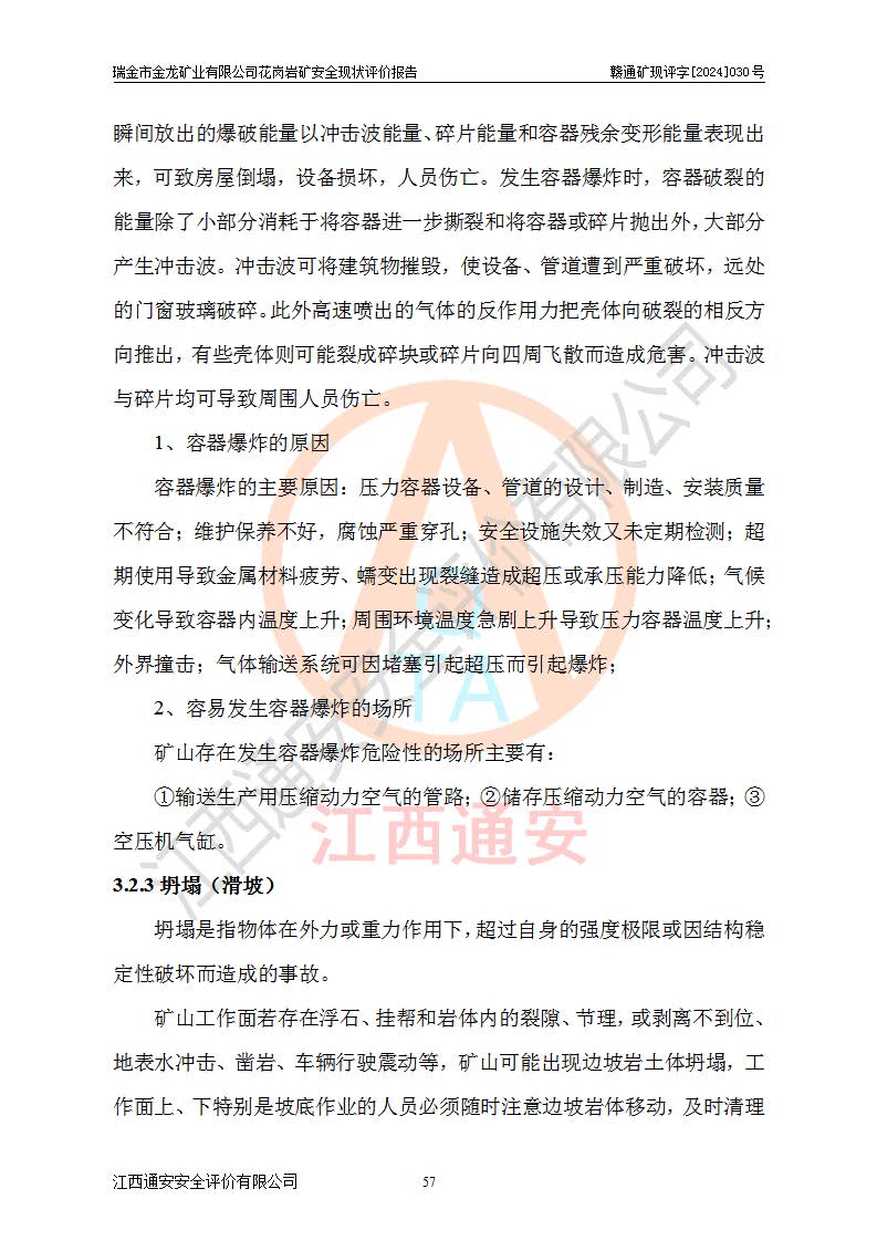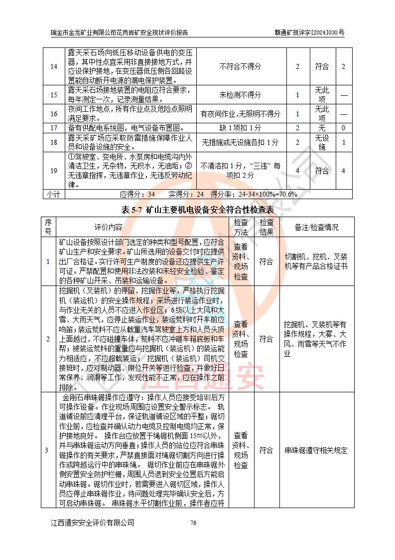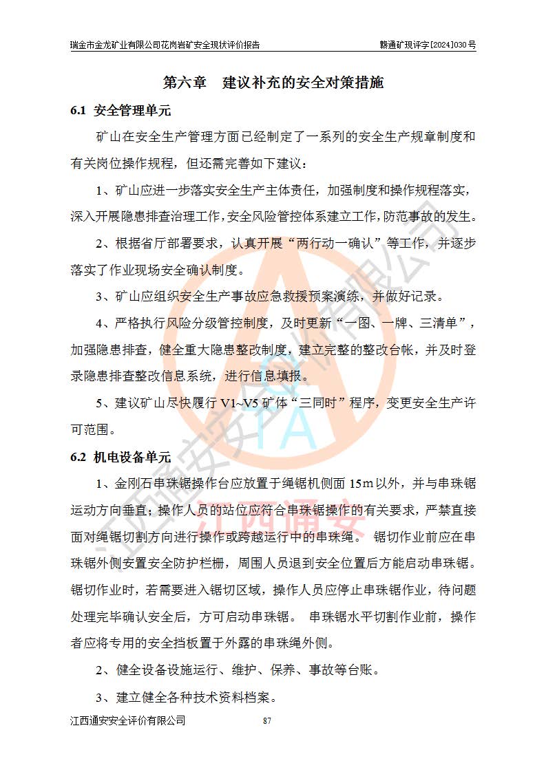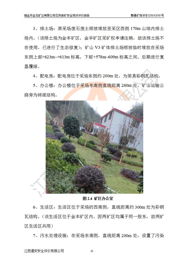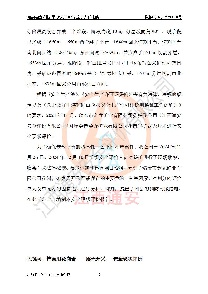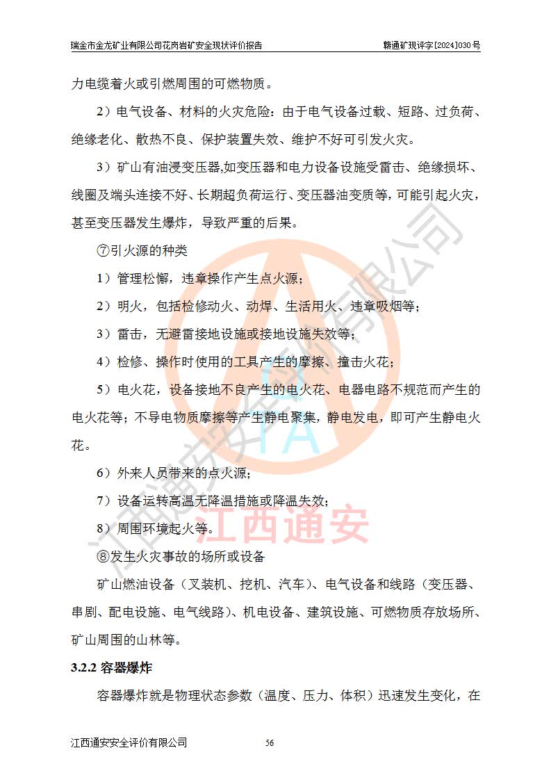 其它 | 瑞金市金龍礦業(yè)有限公司花崗巖礦設(shè)備、設(shè)施和場(chǎng)所基本符合**安全生產(chǎn)有關(guān)法律、法規(guī)、標(biāo)準(zhǔn)及規(guī)范的規(guī)定。礦山采用露天開(kāi)采公路開(kāi)拓汽車(chē)運(yùn)輸方式,安全生產(chǎn)條件良好,生產(chǎn)活動(dòng)有安全保障;安全管理能滿(mǎn)足法規(guī)要求,礦山露天開(kāi)采符合**規(guī)定的安全生產(chǎn)條件。 | ||||