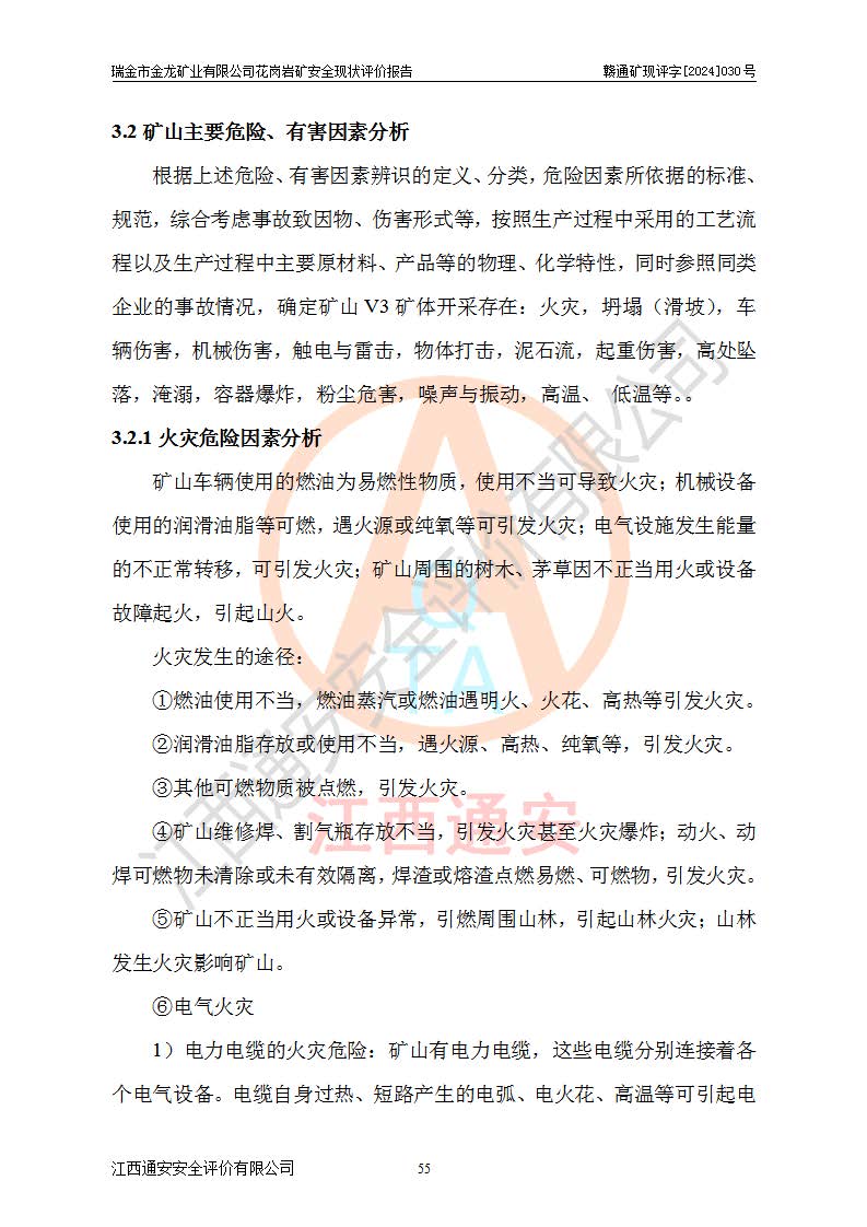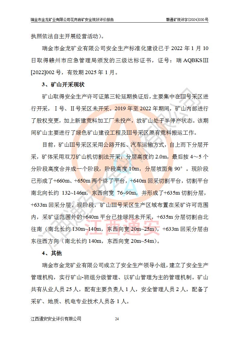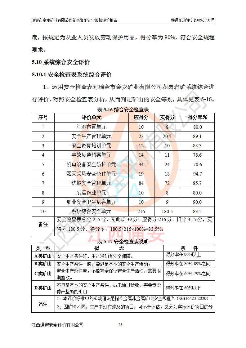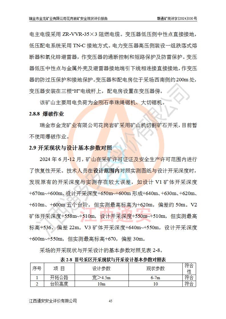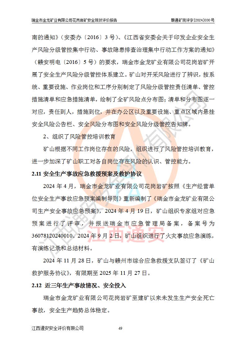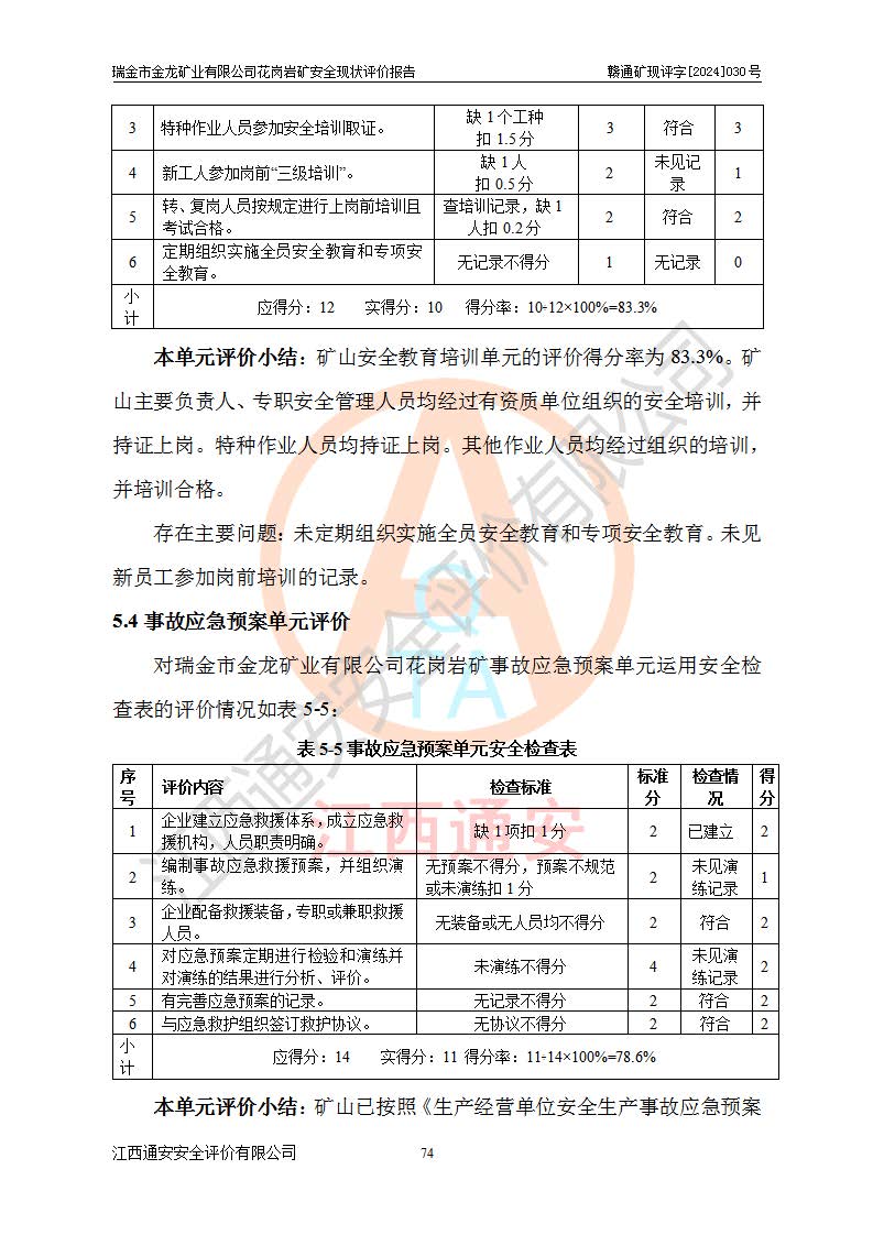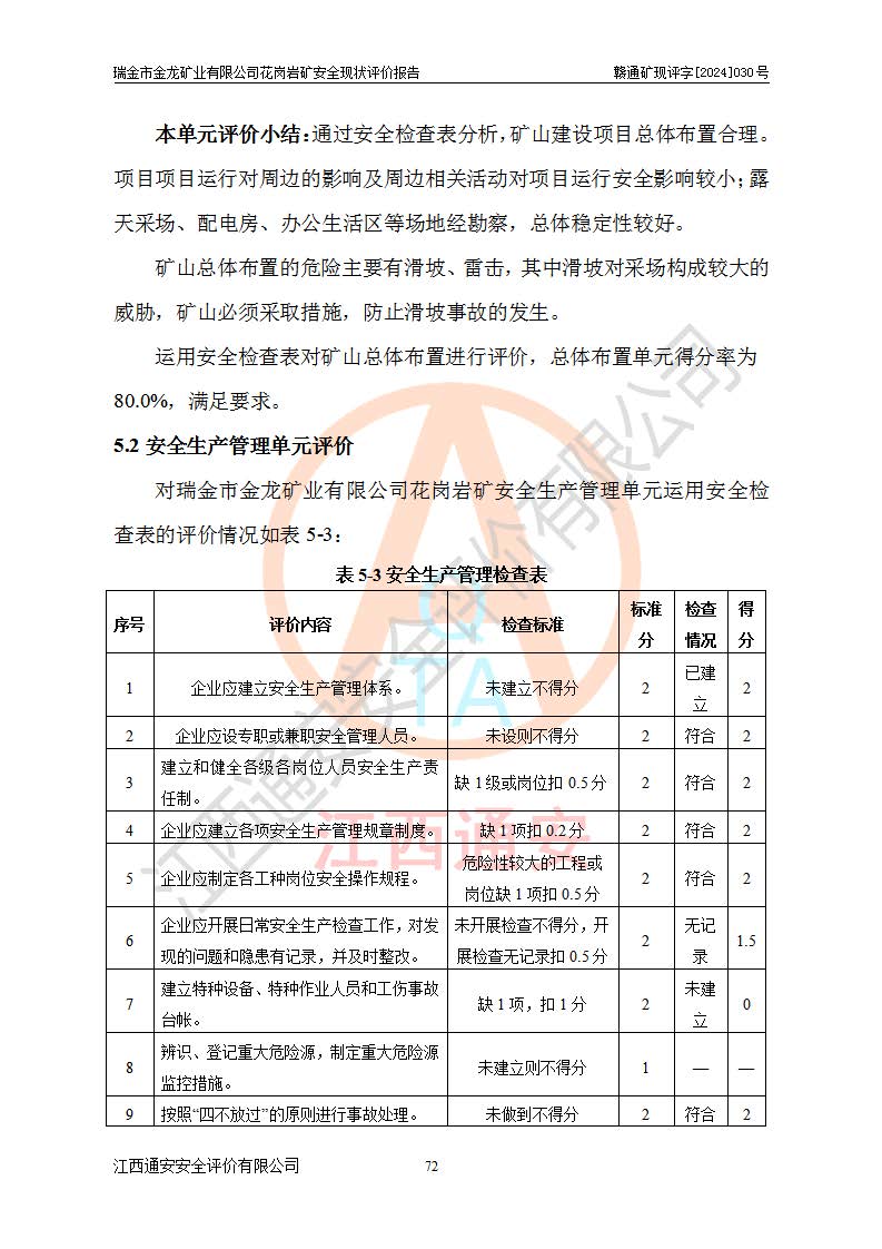 其它 | 瑞金市金龍礦業(yè)有限公司花崗巖礦設(shè)備、設(shè)施和場(chǎng)所基本符合**安全生產(chǎn)有關(guān)法律、法規(guī)、標(biāo)準(zhǔn)及規(guī)范的規(guī)定。礦山采用露天開(kāi)采公路開(kāi)拓汽車(chē)運(yùn)輸方式,安全生產(chǎn)條件良好,生產(chǎn)活動(dòng)有安全保障;安全管理能滿(mǎn)足法規(guī)要求,礦山露天開(kāi)采符合**規(guī)定的安全生產(chǎn)條件。 | ||||