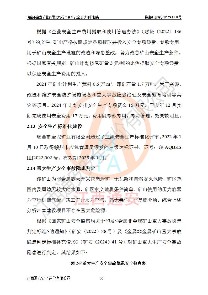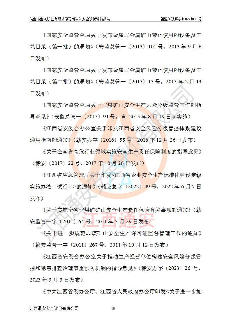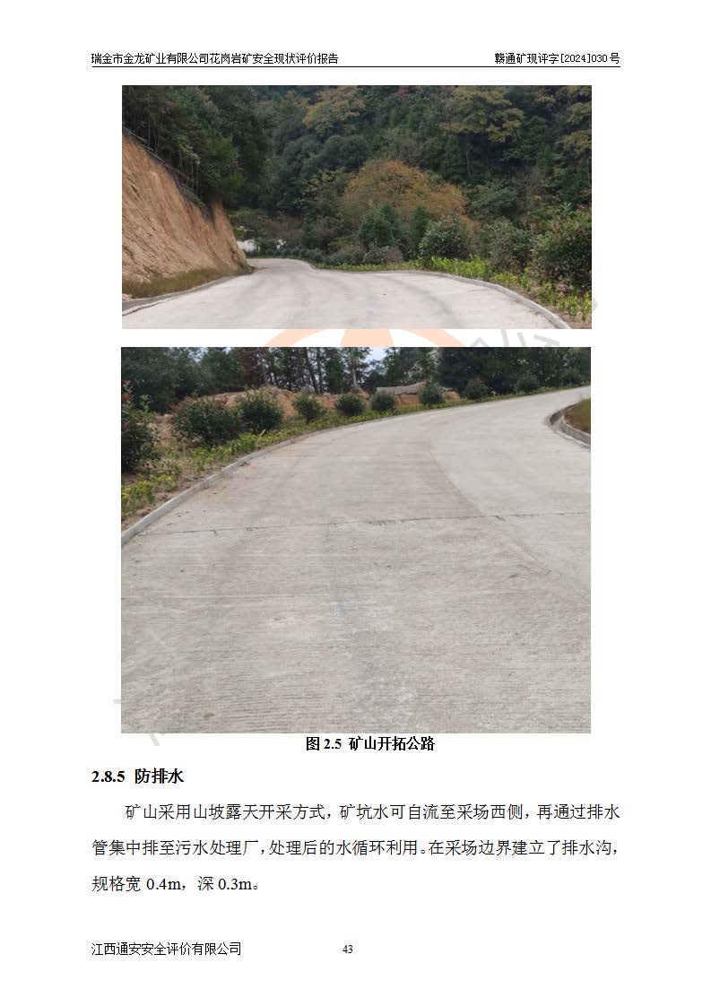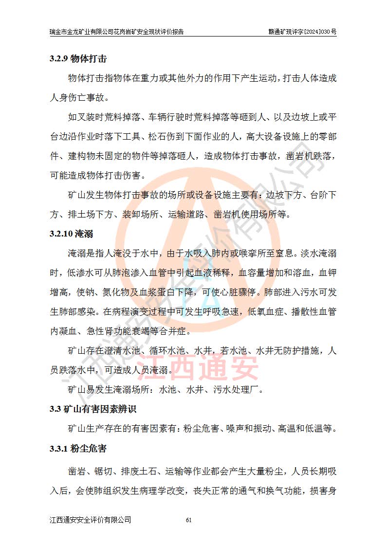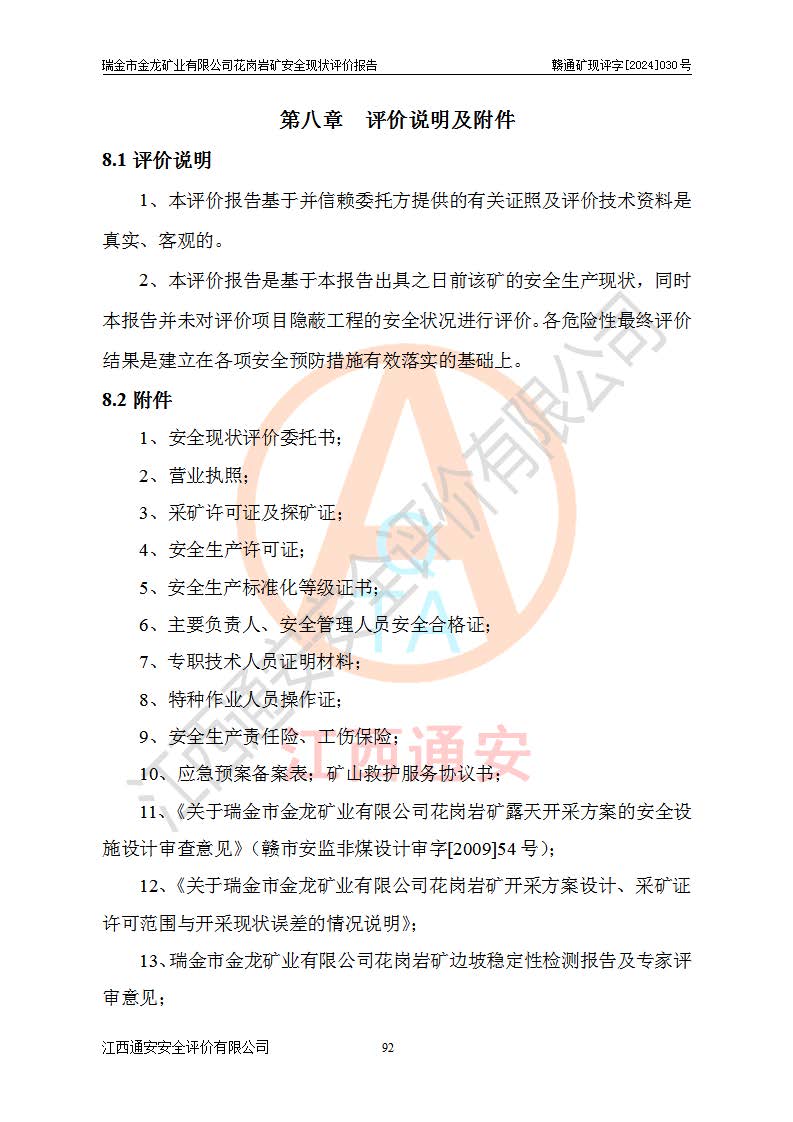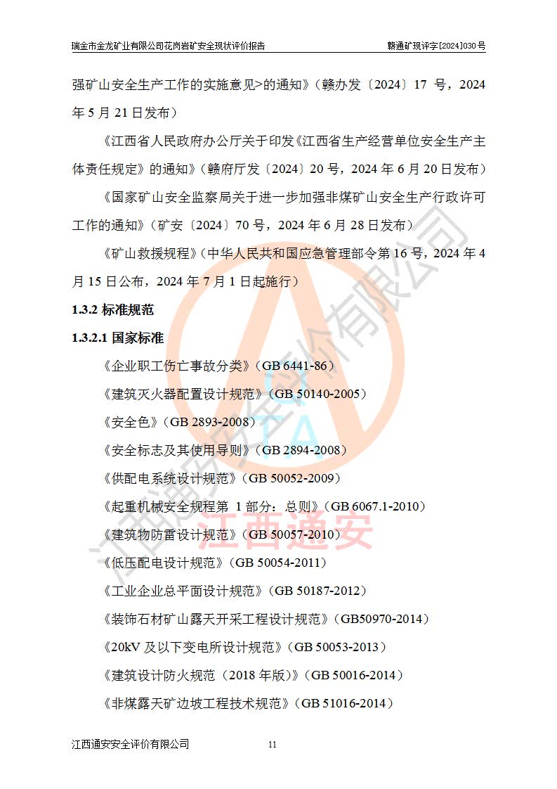 其它 | 瑞金市金龍礦業(yè)有限公司花崗巖礦設(shè)備、設(shè)施和場(chǎng)所基本符合**安全生產(chǎn)有關(guān)法律、法規(guī)、標(biāo)準(zhǔn)及規(guī)范的規(guī)定。礦山采用露天開(kāi)采公路開(kāi)拓汽車(chē)運(yùn)輸方式,安全生產(chǎn)條件良好,生產(chǎn)活動(dòng)有安全保障;安全管理能滿(mǎn)足法規(guī)要求,礦山露天開(kāi)采符合**規(guī)定的安全生產(chǎn)條件。 | ||||