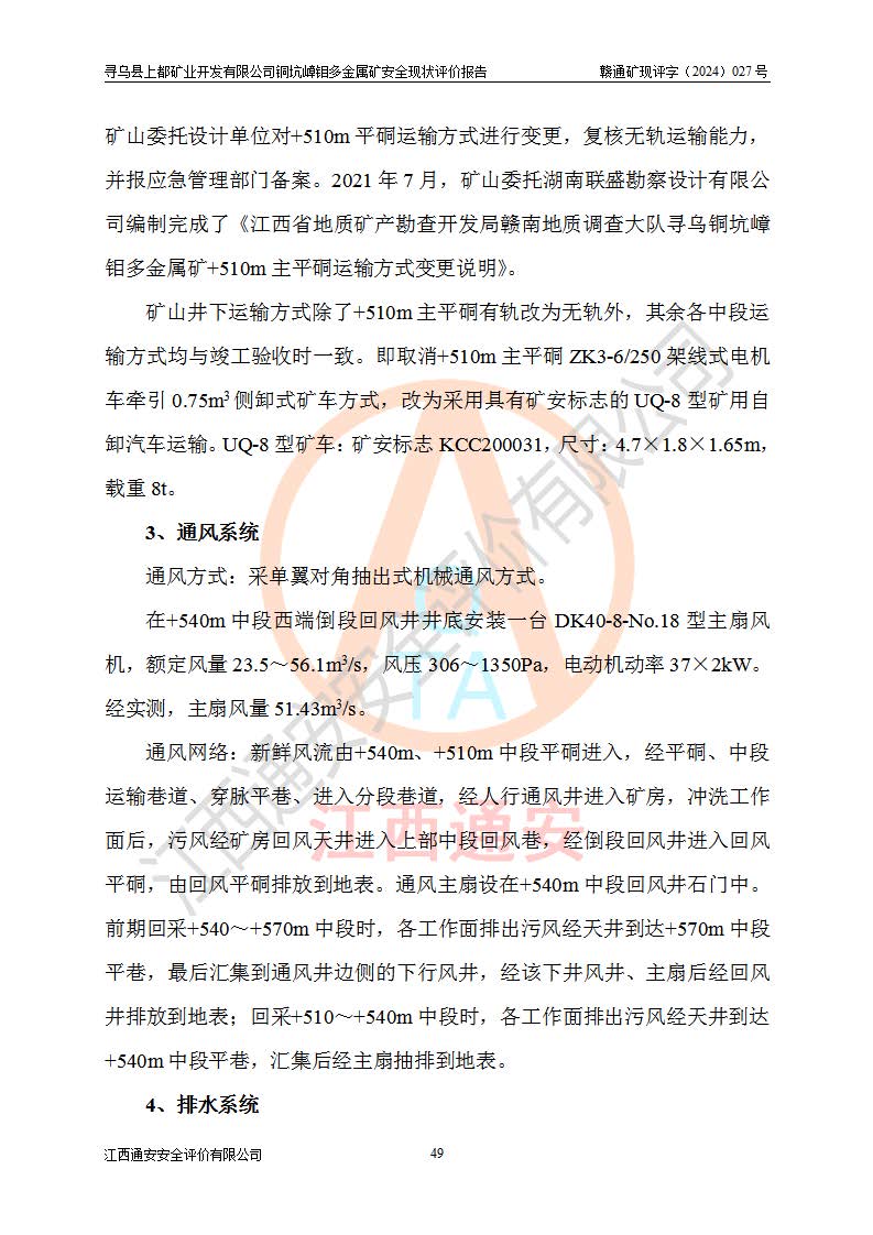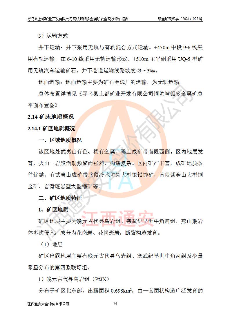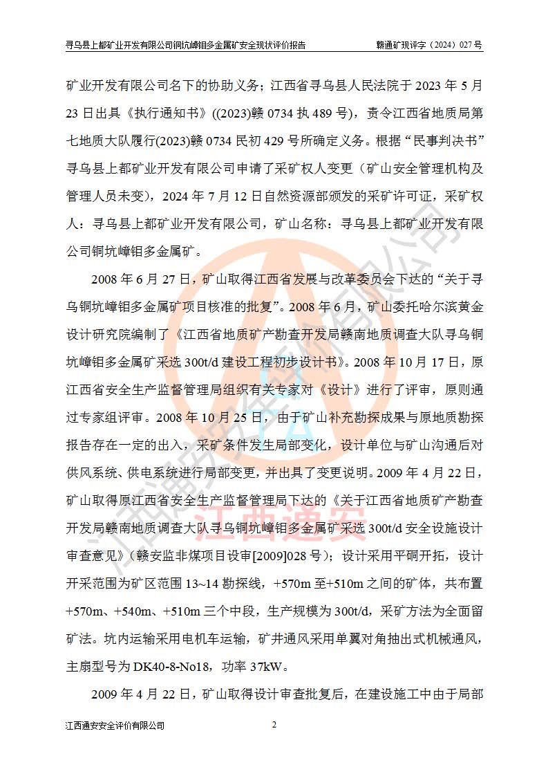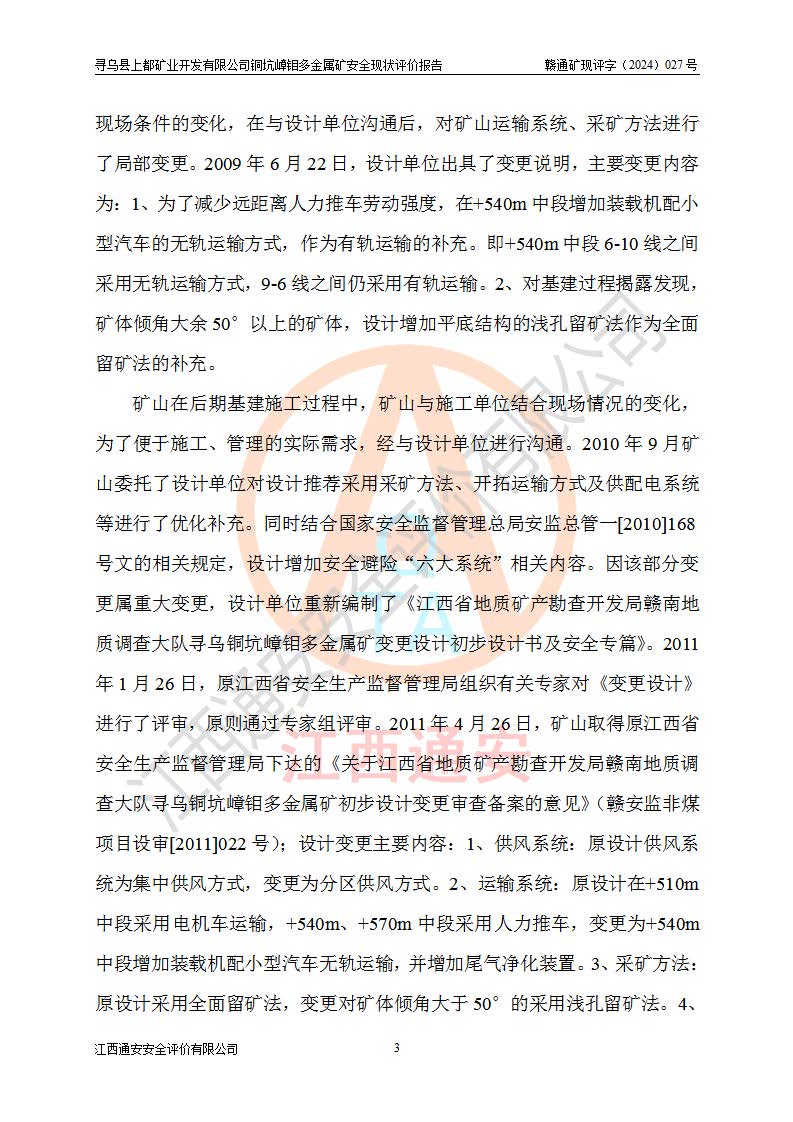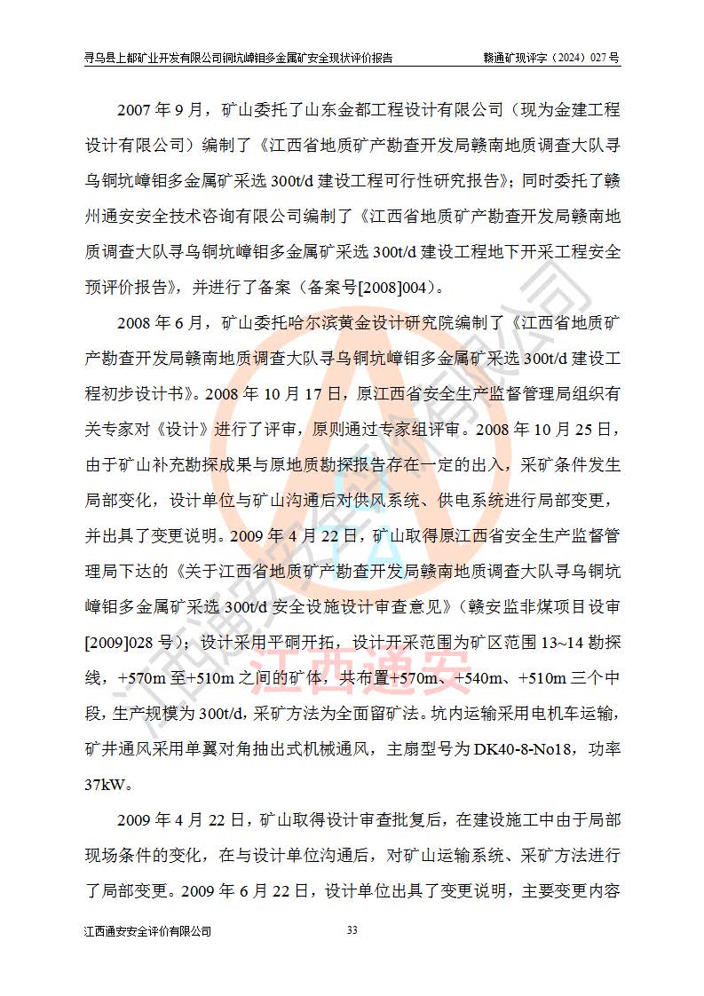 項(xiàng)目簡介 | 尋烏縣上都礦業(yè)開發(fā)有限公司銅坑嶂鉬多金屬礦位于江西省尋烏縣城32°方向8km處,地理坐標(biāo):東徑115°40′00″~115°42′45″,北緯:25°00′15″~25°02′15″,面積3.3753km2。行政區(qū)劃屬尋烏縣澄江鎮(zhèn)、文峰鄉(xiāng)管轄。 尋烏縣上都礦業(yè)開發(fā)有限公司于2006年7月注冊成立,現(xiàn)由江西華威礦業(yè)有限公司、廈門市萬旗科技股份有限公司、尋烏天宇貿(mào)易有限公司三家股東合資組建的有限責(zé)任公司,負(fù)責(zé)銅坑嶂鉬多金屬礦建設(shè)及生產(chǎn)經(jīng)營工作,公司注冊資金為2500萬元。 2006-2007年,公司委托了江西省地質(zhì)礦產(chǎn)勘查開發(fā)局贛南地質(zhì)調(diào)查大隊(duì)(現(xiàn)更名為江西省地質(zhì)局第七地質(zhì)大隊(duì))對尋烏銅坑嶂鉬多金屬礦進(jìn)行前期探礦,2007年4月地調(diào)隊(duì)提交的《江西省尋烏縣銅坑嶂礦區(qū)鉬銅錫礦普查地質(zhì)報(bào)告》。2007-2008年,委托了江西省地礦局贛南地質(zhì)調(diào)查大隊(duì)對本區(qū)進(jìn)行了以鉬為主的詳查找礦工作,提交了《江西省尋烏縣銅坑嶂礦區(qū)鉬礦詳查地質(zhì)報(bào)告》,經(jīng)原江西省國土資源廳評審備案(贛國土資儲備字[2008]024號)。礦山2008年8月3日取得了原江西省國土資源廳頒發(fā)的《采礦許可證》,礦區(qū)面積3.4km2,開采深度為+800m至+100m標(biāo)高,共有4個(gè)拐點(diǎn)圈定;采礦權(quán)人為江西省地質(zhì)礦產(chǎn)勘查開發(fā)局贛南地質(zhì)調(diào)查大隊(duì);礦山名稱為江西省地質(zhì)礦產(chǎn)勘查開發(fā)局贛南地質(zhì)調(diào)查大隊(duì)尋烏銅坑嶂鉬多金屬礦;經(jīng)濟(jì)類型為國有企業(yè)。2023年4月,江西省尋烏縣人民法院于2023年3月31日出具《民事判決書》“[2023]贛0734民初429號”,確認(rèn)“江西省地質(zhì)礦產(chǎn)勘查開發(fā)局贛南地質(zhì)調(diào)查大隊(duì)尋烏銅坑嶂鉬多金屬礦采礦權(quán)”歸尋烏縣上都礦業(yè)開發(fā)有限公司所有,履行將該采礦權(quán)變更至尋烏縣上都礦業(yè)開發(fā)有限公司名下的協(xié)助義務(wù);江西省尋烏縣人民法院于2023年5月23日出具《執(zhí)行通知書》((2023)贛0734執(zhí)489號),責(zé)令江西省地質(zhì)局第七地質(zhì)大隊(duì)履行(2023)贛0734民初429號所確定義務(wù)。根據(jù)“民事判決書”尋烏縣上都礦業(yè)開發(fā)有限公司申請了采礦權(quán)人變更(礦山安全管理機(jī)構(gòu)及管理人員未變),2024年7月12日自然資源部頒發(fā)的采礦許可證,采礦權(quán)人:尋烏縣上都礦業(yè)開發(fā)有限公司,礦山名稱:尋烏縣上都礦業(yè)開發(fā)有限公司銅坑嶂鉬多金屬礦。 2008年6月27日,礦山取得江西省發(fā)展與改革委員會下達(dá)的“關(guān)于尋烏銅坑嶂鉬多金屬礦項(xiàng)目核準(zhǔn)的批復(fù)”。2008年6月,礦山委托哈爾濱黃金設(shè)計(jì)研究院編制了《江西省地質(zhì)礦產(chǎn)勘查開發(fā)局贛南地質(zhì)調(diào)查大隊(duì)尋烏銅坑嶂鉬多金屬礦采選300t/d建設(shè)工程初步設(shè)計(jì)書》。2008年10月17日,原江西省安全生產(chǎn)監(jiān)督管理局組織有關(guān)專家對《設(shè)計(jì)》進(jìn)行了評審,原則通過專家組評審。2008年10月25日,由于礦山補(bǔ)充勘探成果與原地質(zhì)勘探報(bào)告存在**的出入,采礦條件發(fā)生局部變化,設(shè)計(jì)單位與礦山溝通后對供風(fēng)系統(tǒng)、供電系統(tǒng)進(jìn)行局部變更,并出具了變更說明。2009年4月22日,礦山取得原江西省安全生產(chǎn)監(jiān)督管理局下達(dá)的《關(guān)于江西省地質(zhì)礦產(chǎn)勘查開發(fā)局贛南地質(zhì)調(diào)查大隊(duì)尋烏銅坑嶂鉬多金屬礦采選300t/d安全設(shè)施設(shè)計(jì)審查意見》(贛安監(jiān)非煤項(xiàng)目設(shè)審[2009]028號);設(shè)計(jì)采用平硐開拓,設(shè)計(jì)開采范圍為礦區(qū)范圍13~14勘探線,+570m至+510m之間的礦體,共布置+570m、+540m、+510m三個(gè)中段,生產(chǎn)規(guī)模為300t/d,采礦方法為全面留礦法。坑內(nèi)運(yùn)輸采用電機(jī)車運(yùn)輸,礦井通風(fēng)采用單翼對角抽出式機(jī)械通風(fēng),主扇型號為DK40-8-No18,功率37kW。 2009年4月22日,礦山取得設(shè)計(jì)審查批復(fù)后,在建設(shè)施工中由于局部現(xiàn)場條件的變化,在與設(shè)計(jì)單位溝通后,對礦山運(yùn)輸系統(tǒng)、采礦方法進(jìn)行了局部變更。2009年6月22日,設(shè)計(jì)單位出具了變更說明,主要變更內(nèi)容為:1、為了減少遠(yuǎn)距離人力推車勞動強(qiáng)度,在+540m中段增加裝載機(jī)配小型汽車的無軌運(yùn)輸方式,作為有軌運(yùn)輸?shù)难a(bǔ)充。即+540m中段6-10線之間采用無軌運(yùn)輸方式,9-6線之間仍采用有軌運(yùn)輸。2、對基建過程揭露發(fā)現(xiàn),礦體傾角大余50°以上的礦體,設(shè)計(jì)增加平底結(jié)構(gòu)的淺孔留礦法作為全面留礦法的補(bǔ)充。 礦山在后期基建施工過程中,礦山與施工單位結(jié)合現(xiàn)場情況的變化,為了便于施工、管理的實(shí)際需求,經(jīng)與設(shè)計(jì)單位進(jìn)行溝通。2010年9月礦山委托了設(shè)計(jì)單位對設(shè)計(jì)**采用采礦方法、開拓運(yùn)輸方式及供配電系統(tǒng)等進(jìn)行了優(yōu)化補(bǔ)充。同時(shí)結(jié)合**安全監(jiān)督管理總局安監(jiān)總管一[2010]168號文的相關(guān
