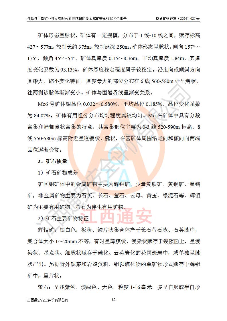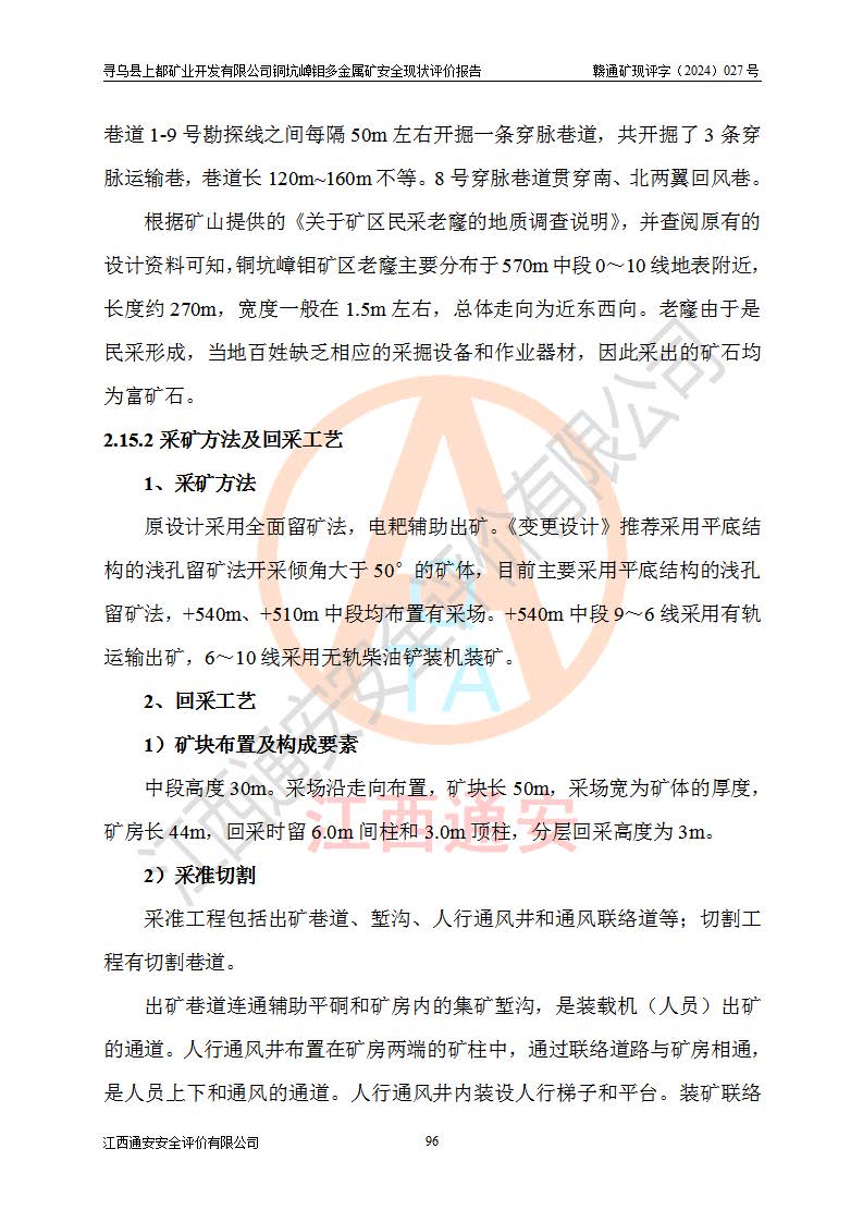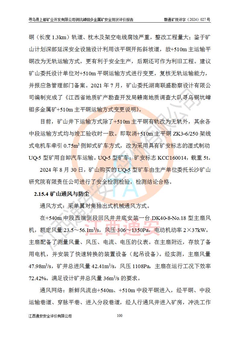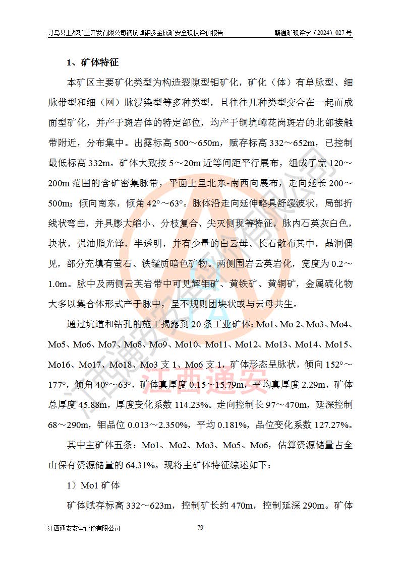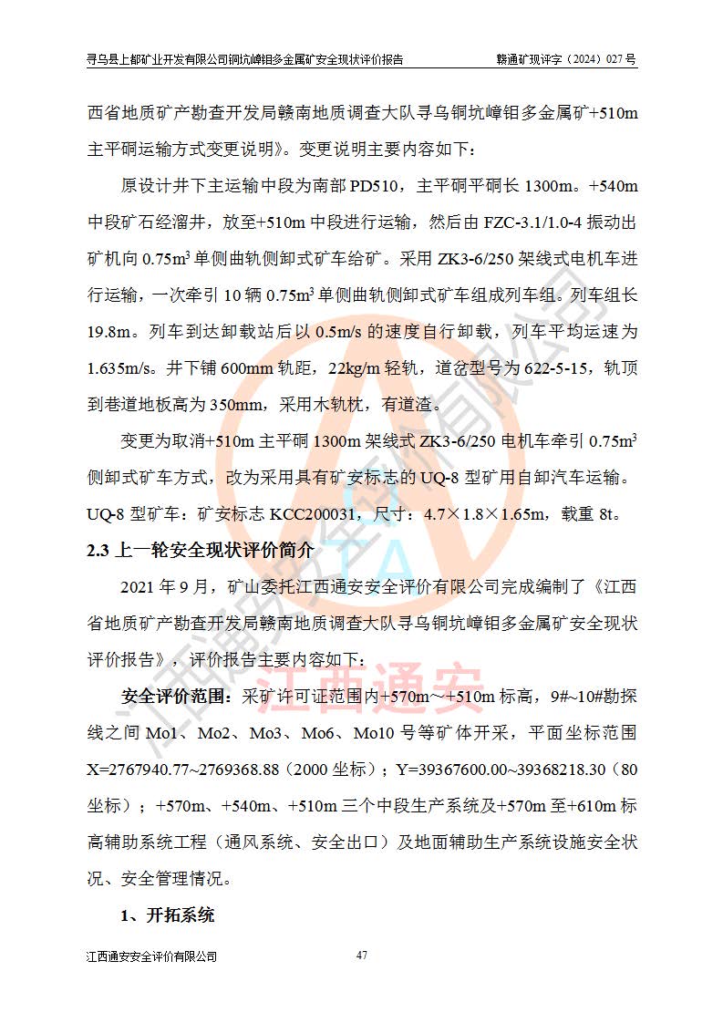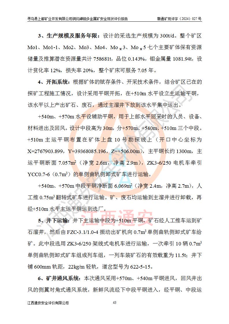項(xiàng)目簡介 | 尋烏縣上都礦業(yè)開發(fā)有限公司銅坑嶂鉬多金屬礦位于江西省尋烏縣城32°方向8km處,地理坐標(biāo):東徑115°40′00″~115°42′45″,北緯:25°00′15″~25°02′15″,面積3.3753km2。行政區(qū)劃屬尋烏縣澄江鎮(zhèn)、文峰鄉(xiāng)管轄。 尋烏縣上都礦業(yè)開發(fā)有限公司于2006年7月注冊成立,現(xiàn)由江西華威礦業(yè)有限公司、廈門市萬旗科技股份有限公司、尋烏天宇貿(mào)易有限公司三家股東合資組建的有限責(zé)任公司,負(fù)責(zé)銅坑嶂鉬多金屬礦建設(shè)及生產(chǎn)經(jīng)營工作,公司注冊資金為2500萬元。 2006-2007年,公司委托了江西省地質(zhì)礦產(chǎn)勘查開發(fā)局贛南地質(zhì)調(diào)查大隊(duì)(現(xiàn)更名為江西省地質(zhì)局第七地質(zhì)大隊(duì))對尋烏銅坑嶂鉬多金屬礦進(jìn)行前期探礦,2007年4月地調(diào)隊(duì)提交的《江西省尋烏縣銅坑嶂礦區(qū)鉬銅錫礦普查地質(zhì)報(bào)告》。2007-2008年,委托了江西省地礦局贛南地質(zhì)調(diào)查大隊(duì)對本區(qū)進(jìn)行了以鉬為主的詳查找礦工作,提交了《江西省尋烏縣銅坑嶂礦區(qū)鉬礦詳查地質(zhì)報(bào)告》,經(jīng)原江西省國土資源廳評審備案(贛國土資儲備字[2008]024號)。礦山2008年8月3日取得了原江西省國土資源廳頒發(fā)的《采礦許可證》,礦區(qū)面積3.4km2,開采深度為+800m至+100m標(biāo)高,共有4個(gè)拐點(diǎn)圈定;采礦權(quán)人為江西省地質(zhì)礦產(chǎn)勘查開發(fā)局贛南地質(zhì)調(diào)查大隊(duì);礦山名稱為江西省地質(zhì)礦產(chǎn)勘查開發(fā)局贛南地質(zhì)調(diào)查大隊(duì)尋烏銅坑嶂鉬多金屬礦;經(jīng)濟(jì)類型為國有企業(yè)。2023年4月,江西省尋烏縣人民法院于2023年3月31日出具《民事判決書》“[2023]贛0734民初429號”,確認(rèn)“江西省地質(zhì)礦產(chǎn)勘查開發(fā)局贛南地質(zhì)調(diào)查大隊(duì)尋烏銅坑嶂鉬多金屬礦采礦權(quán)”歸尋烏縣上都礦業(yè)開發(fā)有限公司所有,履行將該采礦權(quán)變更至尋烏縣上都礦業(yè)開發(fā)有限公司名下的協(xié)助義務(wù);江西省尋烏縣人民法院于2023年5月23日出具《執(zhí)行通知書》((2023)贛0734執(zhí)489號),責(zé)令江西省地質(zhì)局第七地質(zhì)大隊(duì)履行(2023)贛0734民初429號所確定義務(wù)。根據(jù)“民事判決書”尋烏縣上都礦業(yè)開發(fā)有限公司申請了采礦權(quán)人變更(礦山安全管理機(jī)構(gòu)及管理人員未變),2024年7月12日自然資源部頒發(fā)的采礦許可證,采礦權(quán)人:尋烏縣上都礦業(yè)開發(fā)有限公司,礦山名稱:尋烏縣上都礦業(yè)開發(fā)有限公司銅坑嶂鉬多金屬礦。 2008年6月27日,礦山取得江西省發(fā)展與改革委員會下達(dá)的“關(guān)于尋烏銅坑嶂鉬多金屬礦項(xiàng)目核準(zhǔn)的批復(fù)”。2008年6月,礦山委托哈爾濱黃金設(shè)計(jì)研究院編制了《江西省地質(zhì)礦產(chǎn)勘查開發(fā)局贛南地質(zhì)調(diào)查大隊(duì)尋烏銅坑嶂鉬多金屬礦采選300t/d建設(shè)工程初步設(shè)計(jì)書》。2008年10月17日,原江西省安全生產(chǎn)監(jiān)督管理局組織有關(guān)專家對《設(shè)計(jì)》進(jìn)行了評審,原則通過專家組評審。2008年10月25日,由于礦山補(bǔ)充勘探成果與原地質(zhì)勘探報(bào)告存在**的出入,采礦條件發(fā)生局部變化,設(shè)計(jì)單位與礦山溝通后對供風(fēng)系統(tǒng)、供電系統(tǒng)進(jìn)行局部變更,并出具了變更說明。2009年4月22日,礦山取得原江西省安全生產(chǎn)監(jiān)督管理局下達(dá)的《關(guān)于江西省地質(zhì)礦產(chǎn)勘查開發(fā)局贛南地質(zhì)調(diào)查大隊(duì)尋烏銅坑嶂鉬多金屬礦采選300t/d安全設(shè)施設(shè)計(jì)審查意見》(贛安監(jiān)非煤項(xiàng)目設(shè)審[2009]028號);設(shè)計(jì)采用平硐開拓,設(shè)計(jì)開采范圍為礦區(qū)范圍13~14勘探線,+570m至+510m之間的礦體,共布置+570m、+540m、+510m三個(gè)中段,生產(chǎn)規(guī)模為300t/d,采礦方法為全面留礦法。坑內(nèi)運(yùn)輸采用電機(jī)車運(yùn)輸,礦井通風(fēng)采用單翼對角抽出式機(jī)械通風(fēng),主扇型號為DK40-8-No18,功率37kW。 2009年4月22日,礦山取得設(shè)計(jì)審查批復(fù)后,在建設(shè)施工中由于局部現(xiàn)場條件的變化,在與設(shè)計(jì)單位溝通后,對礦山運(yùn)輸系統(tǒng)、采礦方法進(jìn)行了局部變更。2009年6月22日,設(shè)計(jì)單位出具了變更說明,主要變更內(nèi)容為:1、為了減少遠(yuǎn)距離人力推車勞動強(qiáng)度,在+540m中段增加裝載機(jī)配小型汽車的無軌運(yùn)輸方式,作為有軌運(yùn)輸?shù)难a(bǔ)充。即+540m中段6-10線之間采用無軌運(yùn)輸方式,9-6線之間仍采用有軌運(yùn)輸。2、對基建過程揭露發(fā)現(xiàn),礦體傾角大余50°以上的礦體,設(shè)計(jì)增加平底結(jié)構(gòu)的淺孔留礦法作為全面留礦法的補(bǔ)充。 礦山在后期基建施工過程中,礦山與施工單位結(jié)合現(xiàn)場情況的變化,為了便于施工、管理的實(shí)際需求,經(jīng)與設(shè)計(jì)單位進(jìn)行溝通。2010年9月礦山委托了設(shè)計(jì)單位對設(shè)計(jì)**采用采礦方法、開拓運(yùn)輸方式及供配電系統(tǒng)等進(jìn)行了優(yōu)化補(bǔ)充。同時(shí)結(jié)合**安全監(jiān)督管理總局安監(jiān)總管一[2010]168號文的相關(guān