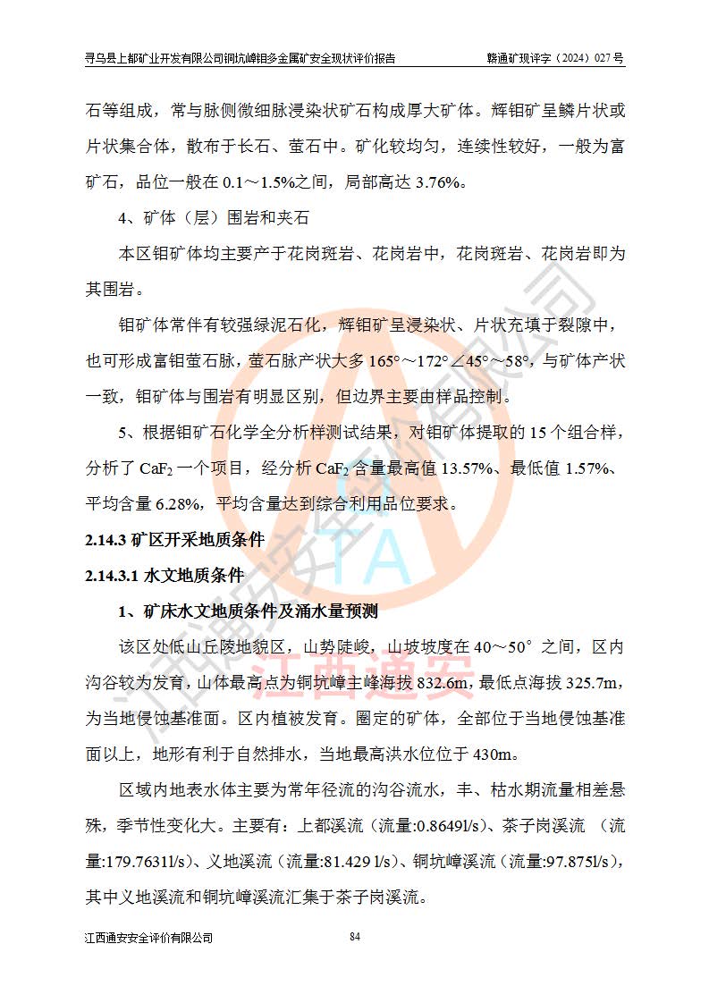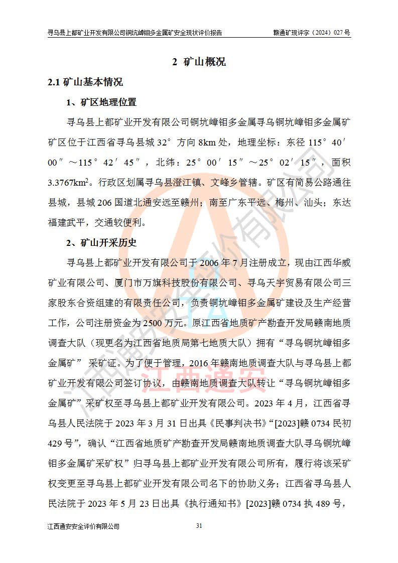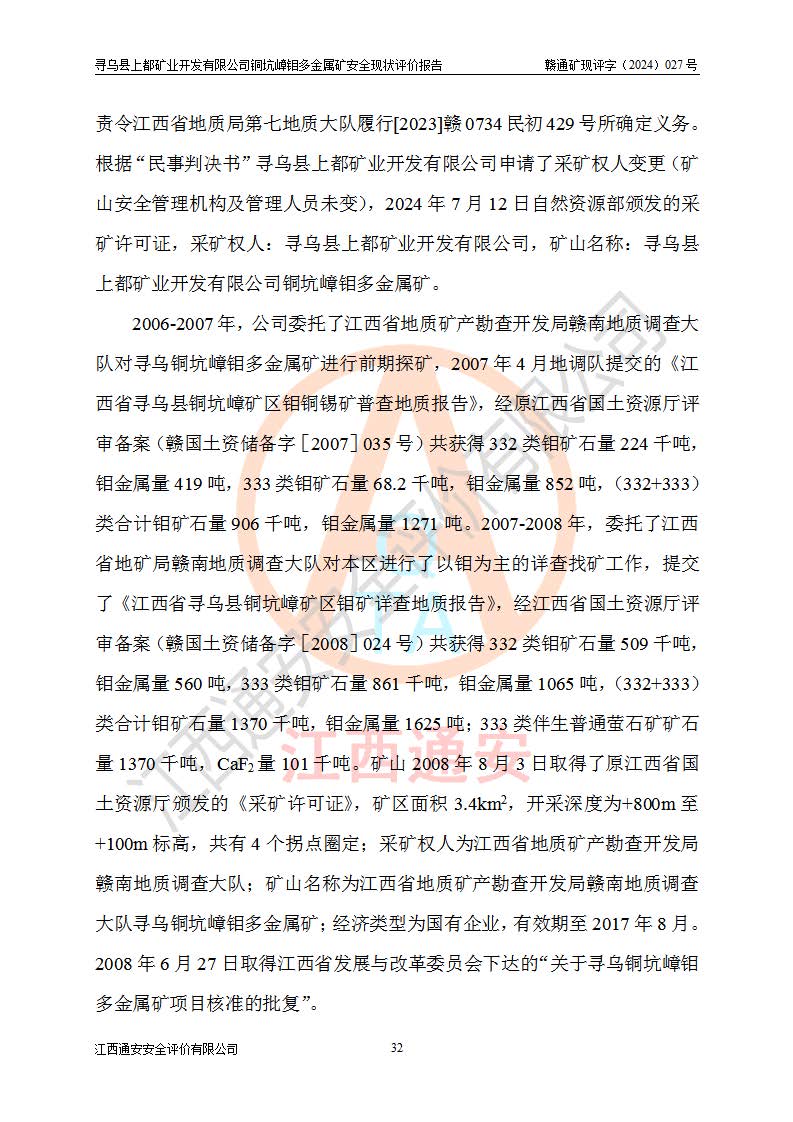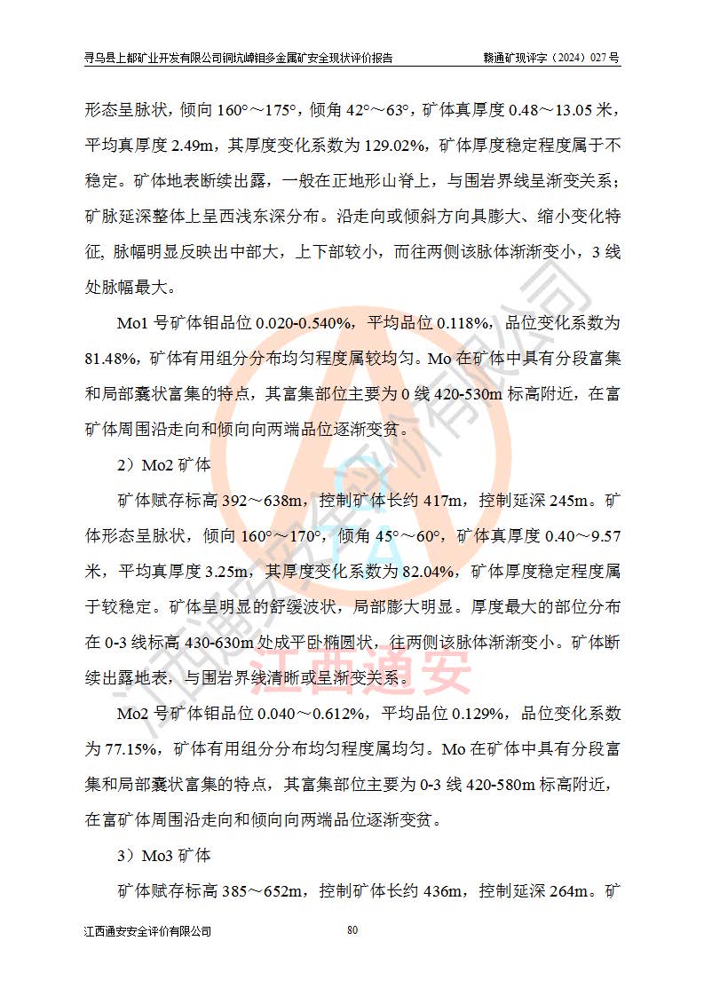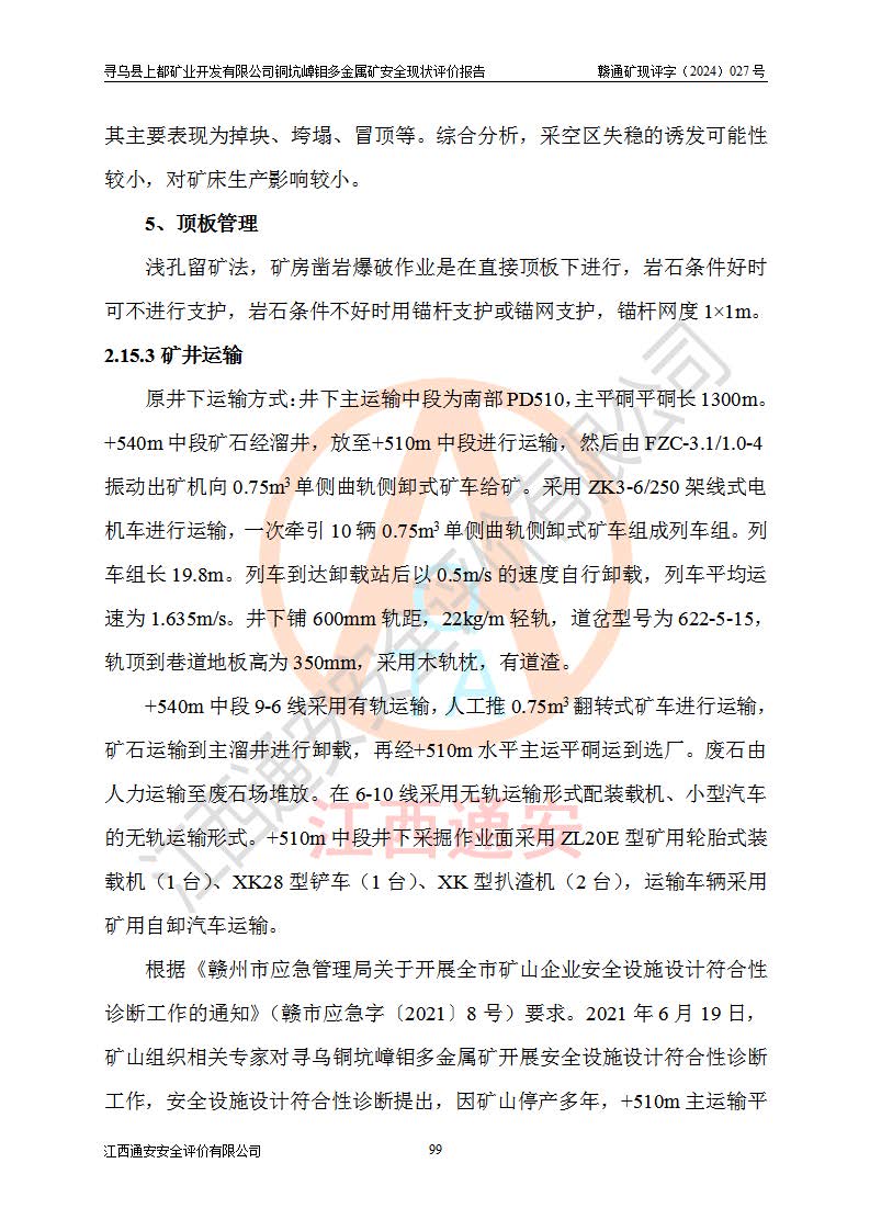 項(xiàng)目簡介 | 尋烏縣上都礦業(yè)開發(fā)有限公司銅坑嶂鉬多金屬礦位于江西省尋烏縣城32°方向8km處,地理坐標(biāo):東徑115°40′00″~115°42′45″,北緯:25°00′15″~25°02′15″,面積3.3753km2。行政區(qū)劃屬尋烏縣澄江鎮(zhèn)、文峰鄉(xiāng)管轄。 尋烏縣上都礦業(yè)開發(fā)有限公司于2006年7月注冊成立,現(xiàn)由江西華威礦業(yè)有限公司、廈門市萬旗科技股份有限公司、尋烏天宇貿(mào)易有限公司三家股東合資組建的有限責(zé)任公司,負(fù)責(zé)銅坑嶂鉬多金屬礦建設(shè)及生產(chǎn)經(jīng)營工作,公司注冊資金為2500萬元。 2006-2007年,公司委托了江西省地質(zhì)礦產(chǎn)勘查開發(fā)局贛南地質(zhì)調(diào)查大隊(duì)(現(xiàn)更名為江西省地質(zhì)局第七地質(zhì)大隊(duì))對尋烏銅坑嶂鉬多金屬礦進(jìn)行前期探礦,2007年4月地調(diào)隊(duì)提交的《江西省尋烏縣銅坑嶂礦區(qū)鉬銅錫礦普查地質(zhì)報(bào)告》。2007-2008年,委托了江西省地礦局贛南地質(zhì)調(diào)查大隊(duì)對本區(qū)進(jìn)行了以鉬為主的詳查找礦工作,提交了《江西省尋烏縣銅坑嶂礦區(qū)鉬礦詳查地質(zhì)報(bào)告》,經(jīng)原江西省國土資源廳評審備案(贛國土資儲備字[2008]024號)。礦山2008年8月3日取得了原江西省國土資源廳頒發(fā)的《采礦許可證》,礦區(qū)面積3.4km2,開采深度為+800m至+100m標(biāo)高,共有4個(gè)拐點(diǎn)圈定;采礦權(quán)人為江西省地質(zhì)礦產(chǎn)勘查開發(fā)局贛南地質(zhì)調(diào)查大隊(duì);礦山名稱為江西省地質(zhì)礦產(chǎn)勘查開發(fā)局贛南地質(zhì)調(diào)查大隊(duì)尋烏銅坑嶂鉬多金屬礦;經(jīng)濟(jì)類型為國有企業(yè)。2023年4月,江西省尋烏縣人民法院于2023年3月31日出具《民事判決書》“[2023]贛0734民初429號”,確認(rèn)“江西省地質(zhì)礦產(chǎn)勘查開發(fā)局贛南地質(zhì)調(diào)查大隊(duì)尋烏銅坑嶂鉬多金屬礦采礦權(quán)”歸尋烏縣上都礦業(yè)開發(fā)有限公司所有,履行將該采礦權(quán)變更至尋烏縣上都礦業(yè)開發(fā)有限公司名下的協(xié)助義務(wù);江西省尋烏縣人民法院于2023年5月23日出具《執(zhí)行通知書》((2023)贛0734執(zhí)489號),責(zé)令江西省地質(zhì)局第七地質(zhì)大隊(duì)履行(2023)贛0734民初429號所確定義務(wù)。根據(jù)“民事判決書”尋烏縣上都礦業(yè)開發(fā)有限公司申請了采礦權(quán)人變更(礦山安全管理機(jī)構(gòu)及管理人員未變),2024年7月12日自然資源部頒發(fā)的采礦許可證,采礦權(quán)人:尋烏縣上都礦業(yè)開發(fā)有限公司,礦山名稱:尋烏縣上都礦業(yè)開發(fā)有限公司銅坑嶂鉬多金屬礦。 2008年6月27日,礦山取得江西省發(fā)展與改革委員會下達(dá)的“關(guān)于尋烏銅坑嶂鉬多金屬礦項(xiàng)目核準(zhǔn)的批復(fù)”。2008年6月,礦山委托哈爾濱黃金設(shè)計(jì)研究院編制了《江西省地質(zhì)礦產(chǎn)勘查開發(fā)局贛南地質(zhì)調(diào)查大隊(duì)尋烏銅坑嶂鉬多金屬礦采選300t/d建設(shè)工程初步設(shè)計(jì)書》。2008年10月17日,原江西省安全生產(chǎn)監(jiān)督管理局組織有關(guān)專家對《設(shè)計(jì)》進(jìn)行了評審,原則通過專家組評審。2008年10月25日,由于礦山補(bǔ)充勘探成果與原地質(zhì)勘探報(bào)告存在**的出入,采礦條件發(fā)生局部變化,設(shè)計(jì)單位與礦山溝通后對供風(fēng)系統(tǒng)、供電系統(tǒng)進(jìn)行局部變更,并出具了變更說明。2009年4月22日,礦山取得原江西省安全生產(chǎn)監(jiān)督管理局下達(dá)的《關(guān)于江西省地質(zhì)礦產(chǎn)勘查開發(fā)局贛南地質(zhì)調(diào)查大隊(duì)尋烏銅坑嶂鉬多金屬礦采選300t/d安全設(shè)施設(shè)計(jì)審查意見》(贛安監(jiān)非煤項(xiàng)目設(shè)審[2009]028號);設(shè)計(jì)采用平硐開拓,設(shè)計(jì)開采范圍為礦區(qū)范圍13~14勘探線,+570m至+510m之間的礦體,共布置+570m、+540m、+510m三個(gè)中段,生產(chǎn)規(guī)模為300t/d,采礦方法為全面留礦法。坑內(nèi)運(yùn)輸采用電機(jī)車運(yùn)輸,礦井通風(fēng)采用單翼對角抽出式機(jī)械通風(fēng),主扇型號為DK40-8-No18,功率37kW。 2009年4月22日,礦山取得設(shè)計(jì)審查批復(fù)后,在建設(shè)施工中由于局部現(xiàn)場條件的變化,在與設(shè)計(jì)單位溝通后,對礦山運(yùn)輸系統(tǒng)、采礦方法進(jìn)行了局部變更。2009年6月22日,設(shè)計(jì)單位出具了變更說明,主要變更內(nèi)容為:1、為了減少遠(yuǎn)距離人力推車勞動強(qiáng)度,在+540m中段增加裝載機(jī)配小型汽車的無軌運(yùn)輸方式,作為有軌運(yùn)輸?shù)难a(bǔ)充。即+540m中段6-10線之間采用無軌運(yùn)輸方式,9-6線之間仍采用有軌運(yùn)輸。2、對基建過程揭露發(fā)現(xiàn),礦體傾角大余50°以上的礦體,設(shè)計(jì)增加平底結(jié)構(gòu)的淺孔留礦法作為全面留礦法的補(bǔ)充。 礦山在后期基建施工過程中,礦山與施工單位結(jié)合現(xiàn)場情況的變化,為了便于施工、管理的實(shí)際需求,經(jīng)與設(shè)計(jì)單位進(jìn)行溝通。2010年9月礦山委托了設(shè)計(jì)單位對設(shè)計(jì)**采用采礦方法、開拓運(yùn)輸方式及供配電系統(tǒng)等進(jìn)行了優(yōu)化補(bǔ)充。同時(shí)結(jié)合**安全監(jiān)督管理總局安監(jiān)總管一[2010]168號文的相關(guān