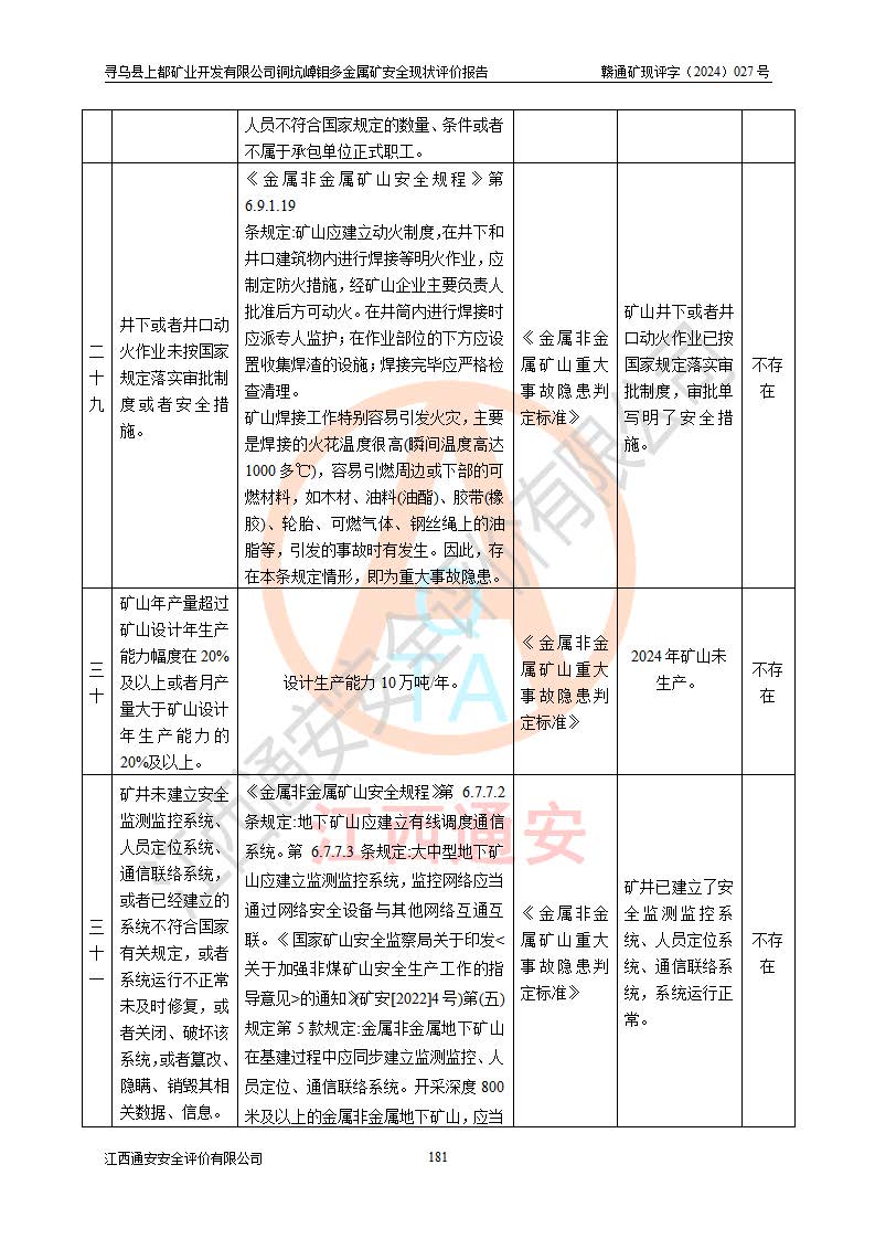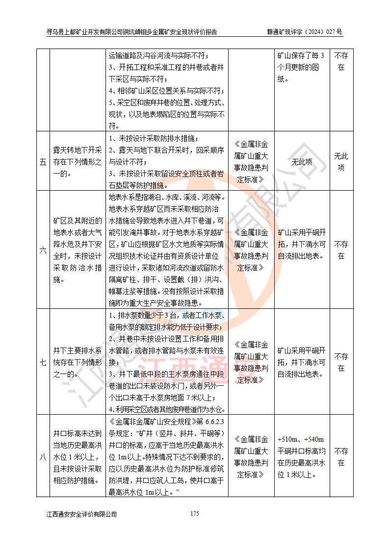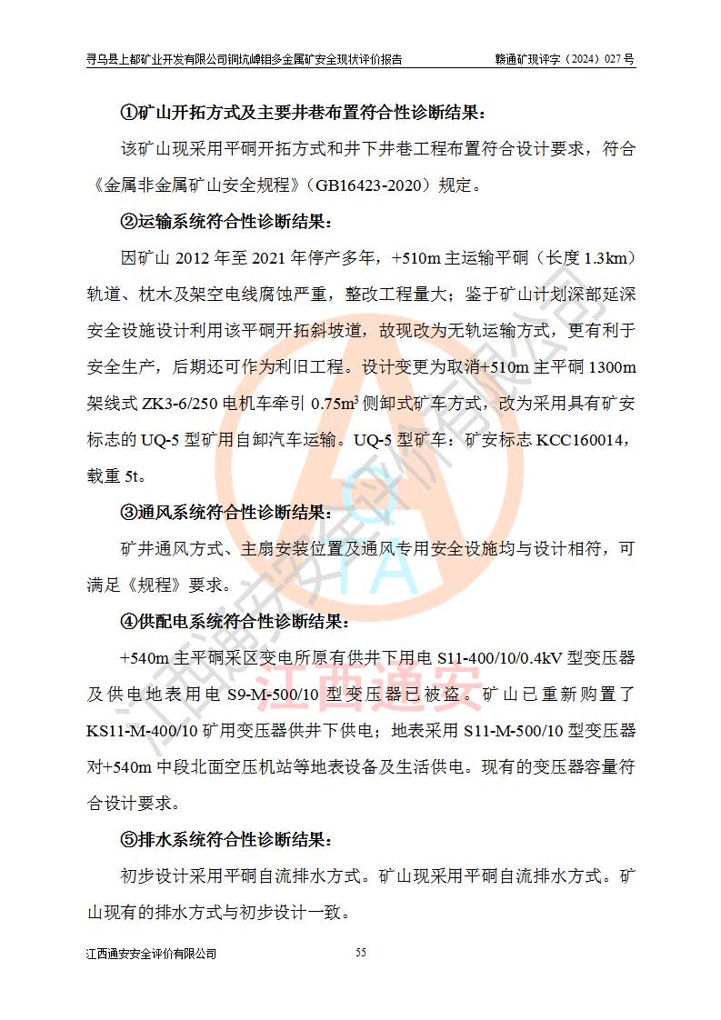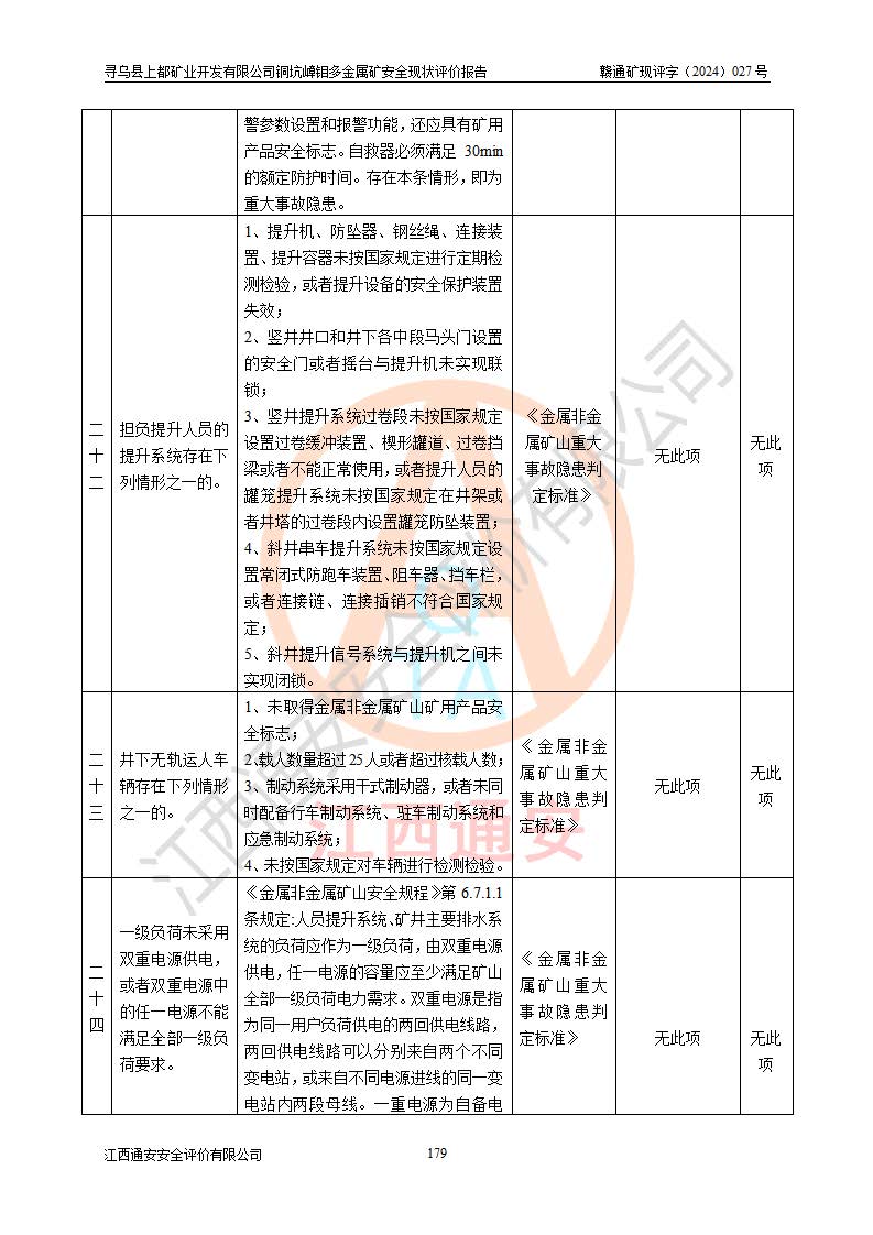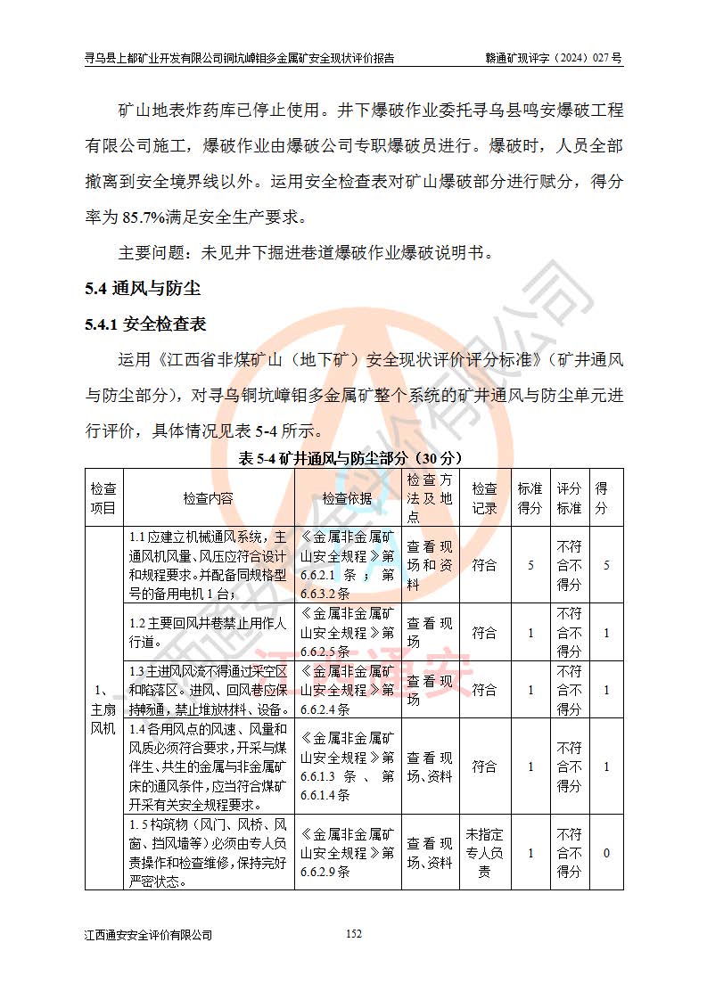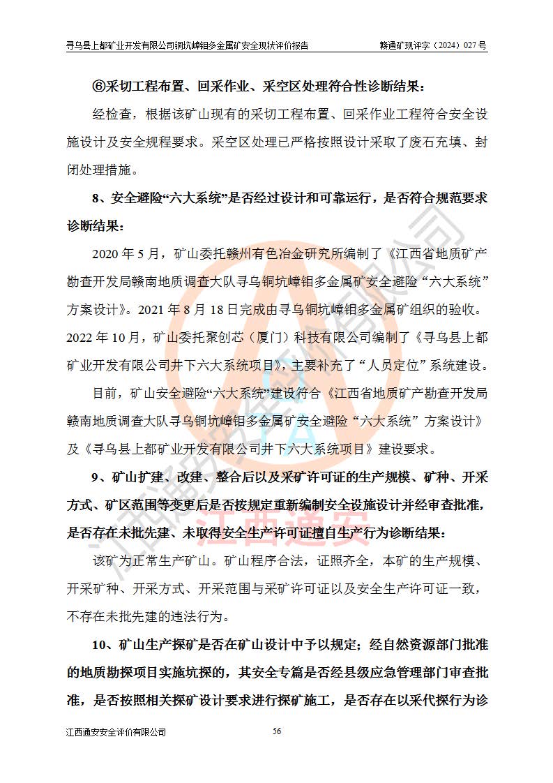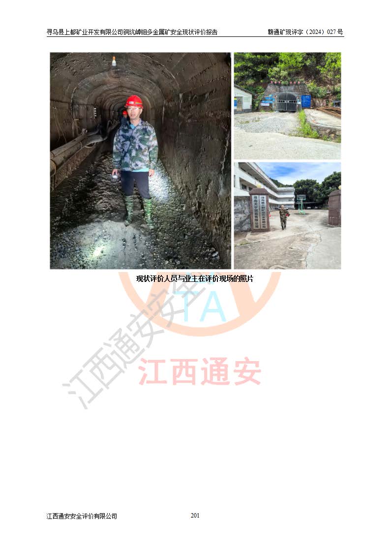 其它 | 尋烏縣上都礦業(yè)開發(fā)有限公司銅坑嶂鉬多金屬礦的主要生產(chǎn)及輔助系統(tǒng):運(yùn)輸、排水、供配電、通風(fēng)、供風(fēng)、采掘、安全避險(xiǎn)“六大系統(tǒng)”等基本符合法律法規(guī)要求和規(guī)程、規(guī)范要求;各種危險(xiǎn)有害因素及不可接受的風(fēng)險(xiǎn)在運(yùn)行中認(rèn)真落實(shí)行之**的技術(shù)措施或管理措施,嚴(yán)格按規(guī)程,按要求加強(qiáng)管理,可以避免和控制各類事故,**安全生產(chǎn)?,F(xiàn)階段礦山設(shè)備、設(shè)施和場所符合**安全生產(chǎn)有關(guān)法律、法規(guī)、標(biāo)準(zhǔn)及規(guī)范的規(guī)定。礦山采用平硐開拓方式,安全生產(chǎn)條件一般;安全管理能滿足法規(guī)要求,礦山地下開采符合**規(guī)定的安全生產(chǎn)條件。 | ||||