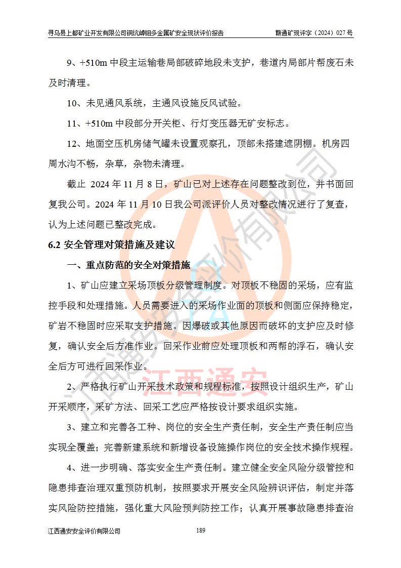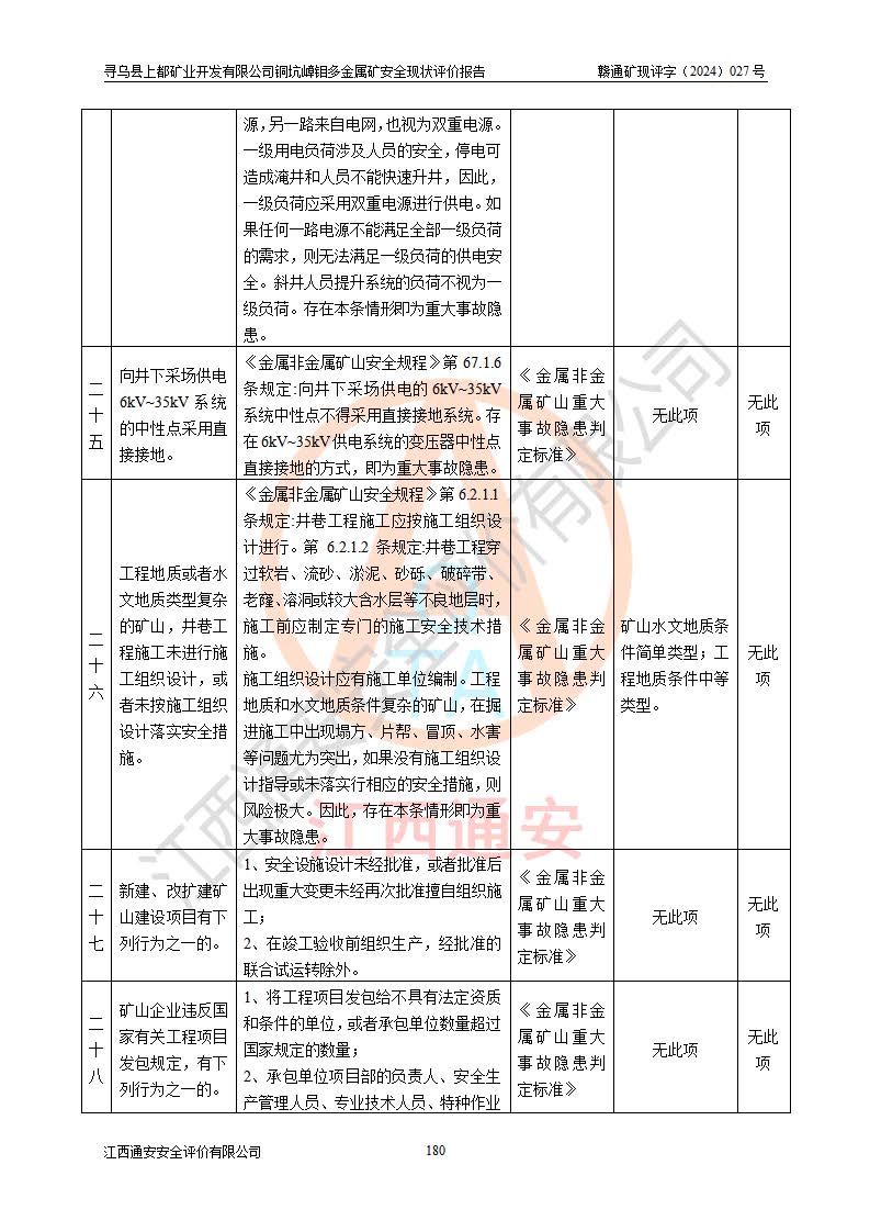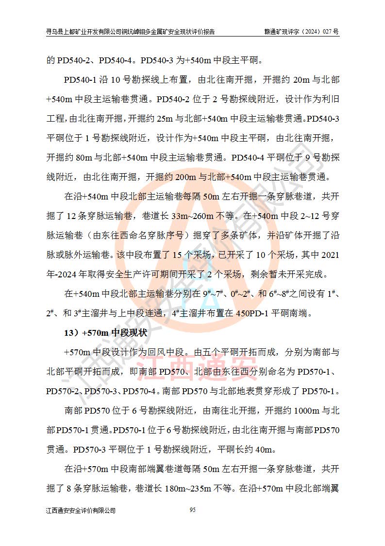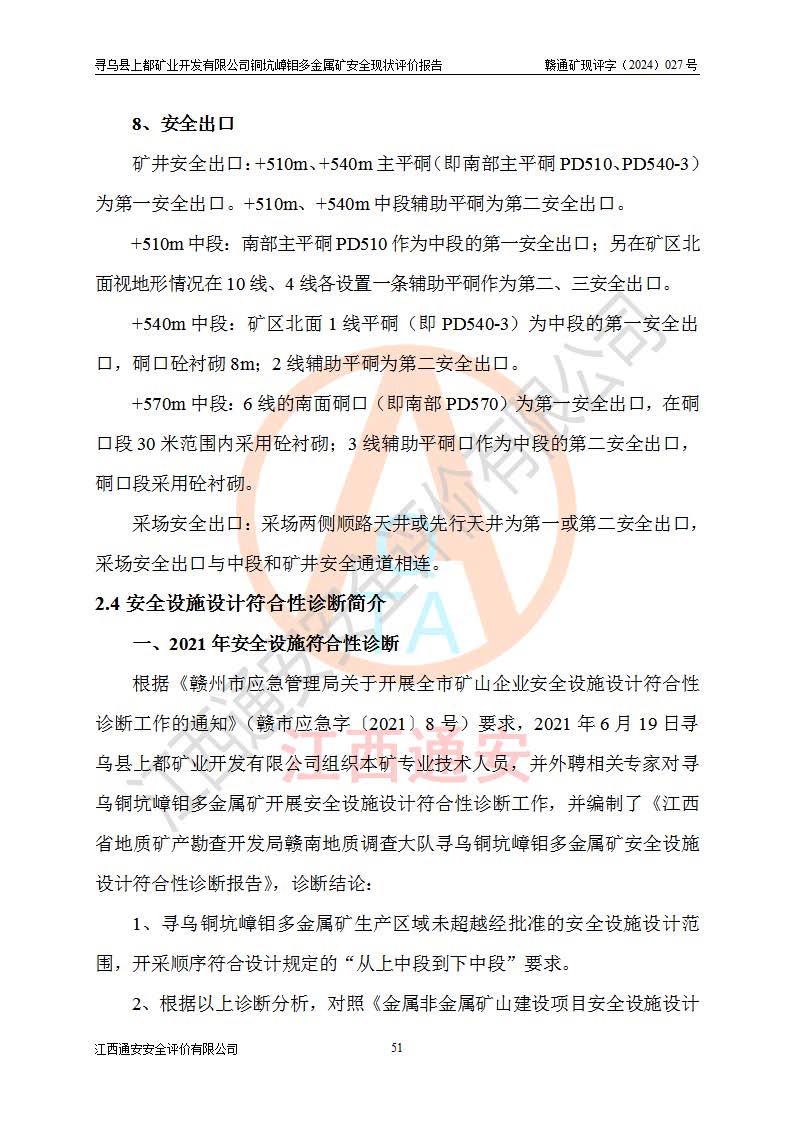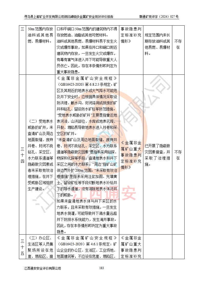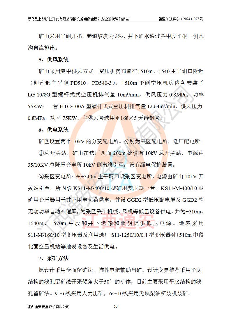 其它 | 尋烏縣上都礦業(yè)開發(fā)有限公司銅坑嶂鉬多金屬礦的主要生產(chǎn)及輔助系統(tǒng):運(yùn)輸、排水、供配電、通風(fēng)、供風(fēng)、采掘、安全避險(xiǎn)“六大系統(tǒng)”等基本符合法律法規(guī)要求和規(guī)程、規(guī)范要求;各種危險(xiǎn)有害因素及不可接受的風(fēng)險(xiǎn)在運(yùn)行中認(rèn)真落實(shí)行之**的技術(shù)措施或管理措施,嚴(yán)格按規(guī)程,按要求加強(qiáng)管理,可以避免和控制各類事故,**安全生產(chǎn)?,F(xiàn)階段礦山設(shè)備、設(shè)施和場所符合**安全生產(chǎn)有關(guān)法律、法規(guī)、標(biāo)準(zhǔn)及規(guī)范的規(guī)定。礦山采用平硐開拓方式,安全生產(chǎn)條件一般;安全管理能滿足法規(guī)要求,礦山地下開采符合**規(guī)定的安全生產(chǎn)條件。 | ||||