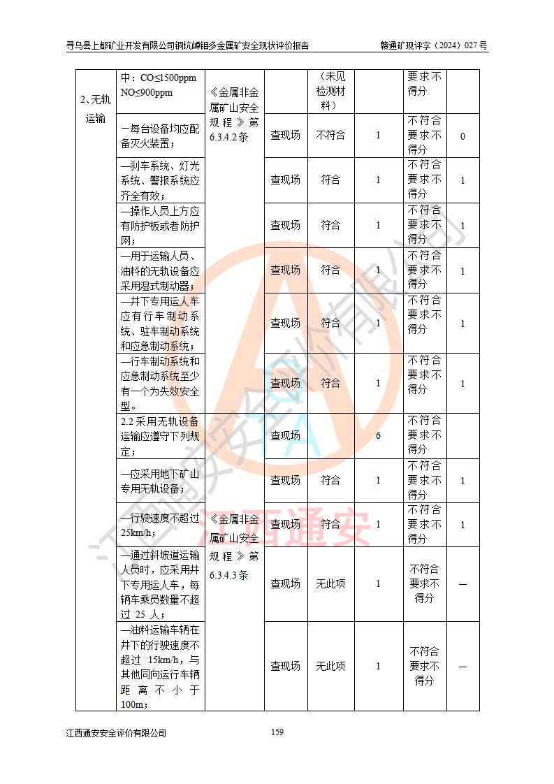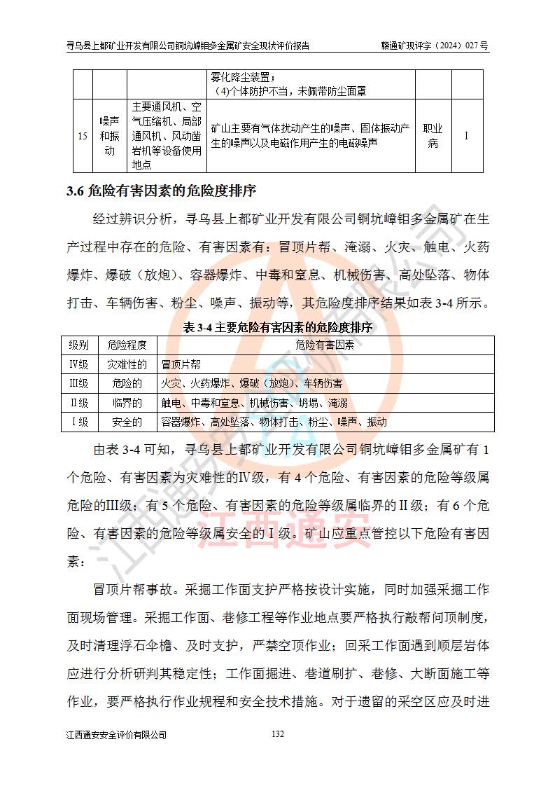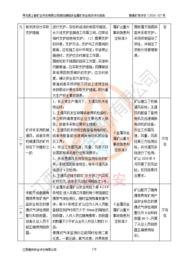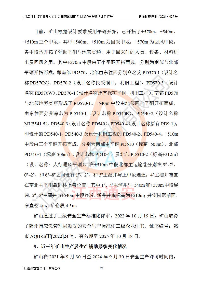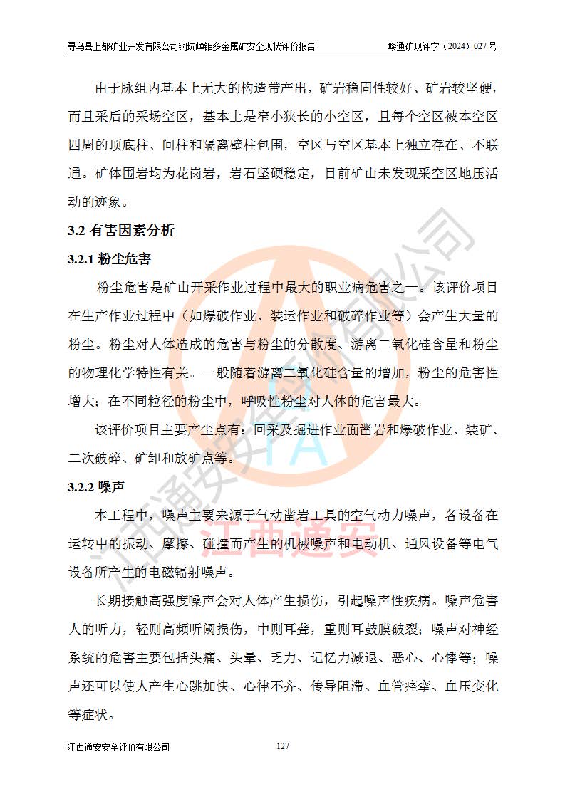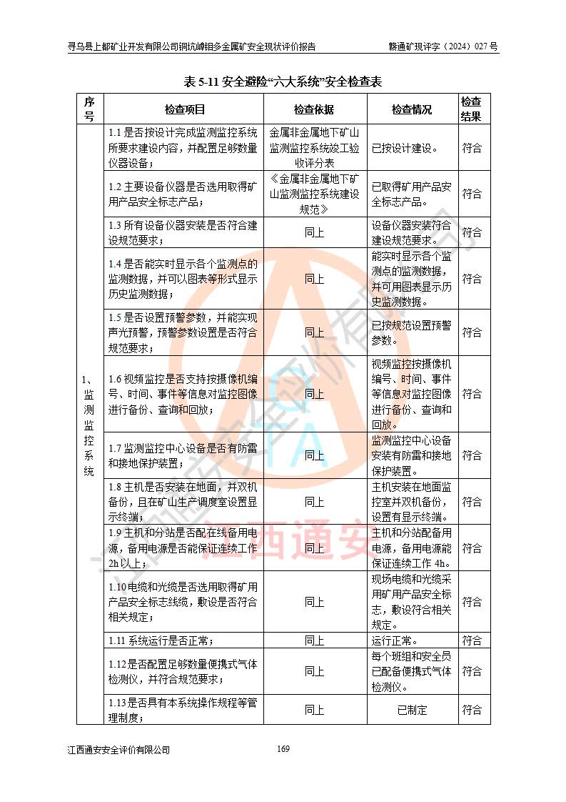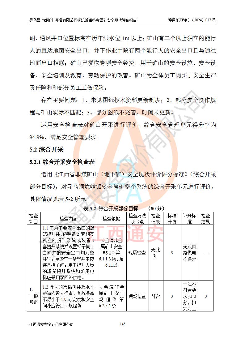 其它 | 尋烏縣上都礦業(yè)開發(fā)有限公司銅坑嶂鉬多金屬礦的主要生產(chǎn)及輔助系統(tǒng):運(yùn)輸、排水、供配電、通風(fēng)、供風(fēng)、采掘、安全避險(xiǎn)“六大系統(tǒng)”等基本符合法律法規(guī)要求和規(guī)程、規(guī)范要求;各種危險(xiǎn)有害因素及不可接受的風(fēng)險(xiǎn)在運(yùn)行中認(rèn)真落實(shí)行之**的技術(shù)措施或管理措施,嚴(yán)格按規(guī)程,按要求加強(qiáng)管理,可以避免和控制各類事故,**安全生產(chǎn)?,F(xiàn)階段礦山設(shè)備、設(shè)施和場所符合**安全生產(chǎn)有關(guān)法律、法規(guī)、標(biāo)準(zhǔn)及規(guī)范的規(guī)定。礦山采用平硐開拓方式,安全生產(chǎn)條件一般;安全管理能滿足法規(guī)要求,礦山地下開采符合**規(guī)定的安全生產(chǎn)條件。 | ||||
