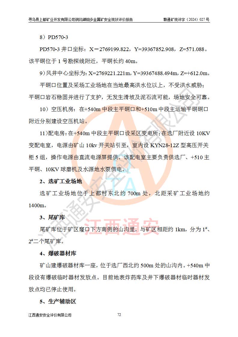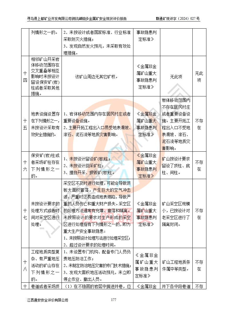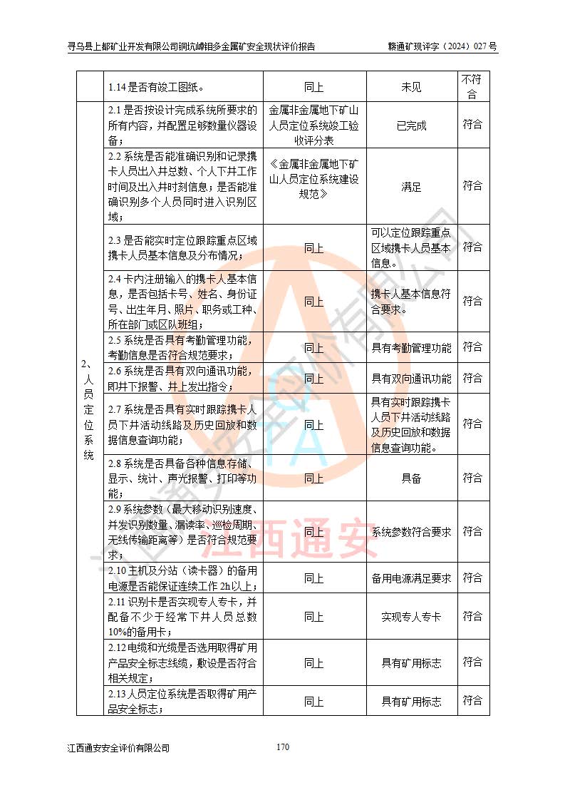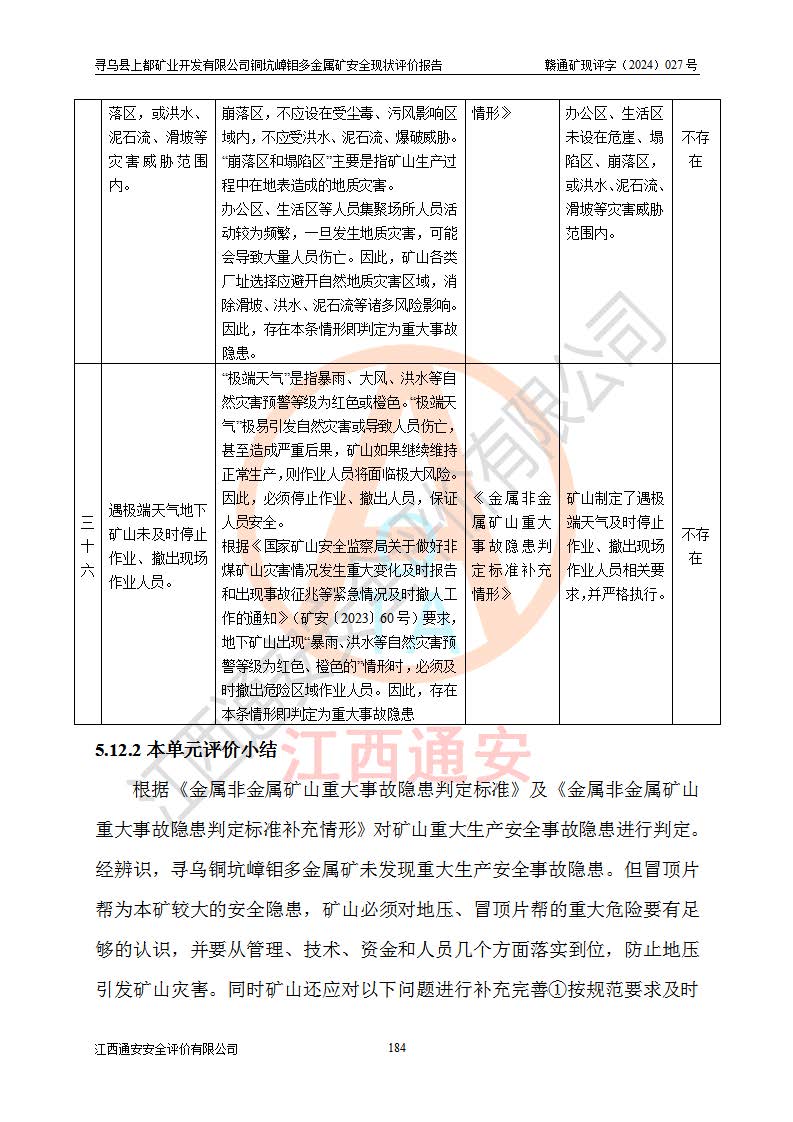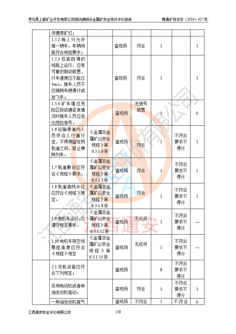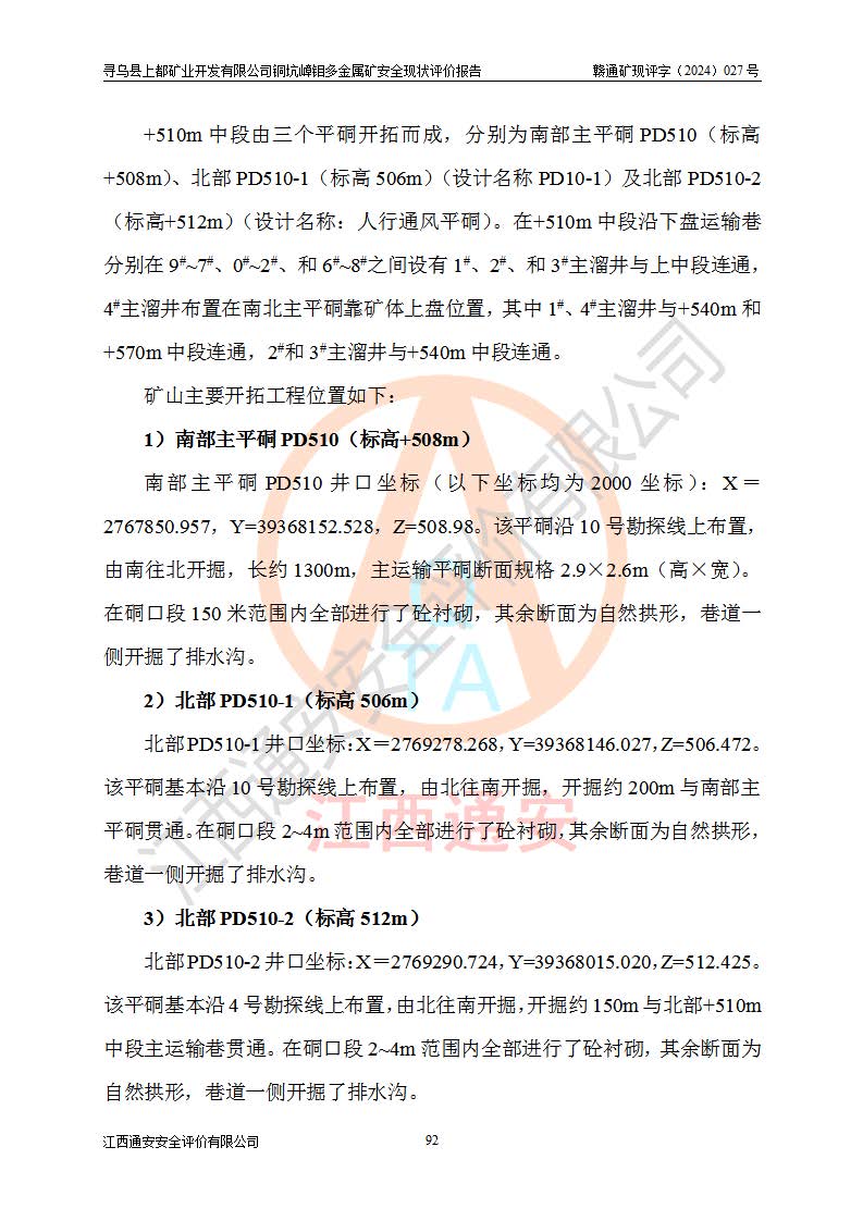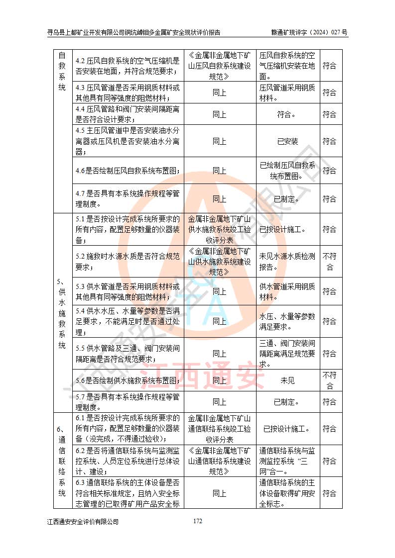 其它 | 尋烏縣上都礦業(yè)開發(fā)有限公司銅坑嶂鉬多金屬礦的主要生產(chǎn)及輔助系統(tǒng):運(yùn)輸、排水、供配電、通風(fēng)、供風(fēng)、采掘、安全避險(xiǎn)“六大系統(tǒng)”等基本符合法律法規(guī)要求和規(guī)程、規(guī)范要求;各種危險(xiǎn)有害因素及不可接受的風(fēng)險(xiǎn)在運(yùn)行中認(rèn)真落實(shí)行之**的技術(shù)措施或管理措施,嚴(yán)格按規(guī)程,按要求加強(qiáng)管理,可以避免和控制各類事故,**安全生產(chǎn)?,F(xiàn)階段礦山設(shè)備、設(shè)施和場所符合**安全生產(chǎn)有關(guān)法律、法規(guī)、標(biāo)準(zhǔn)及規(guī)范的規(guī)定。礦山采用平硐開拓方式,安全生產(chǎn)條件一般;安全管理能滿足法規(guī)要求,礦山地下開采符合**規(guī)定的安全生產(chǎn)條件。 | ||||