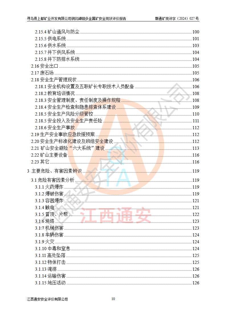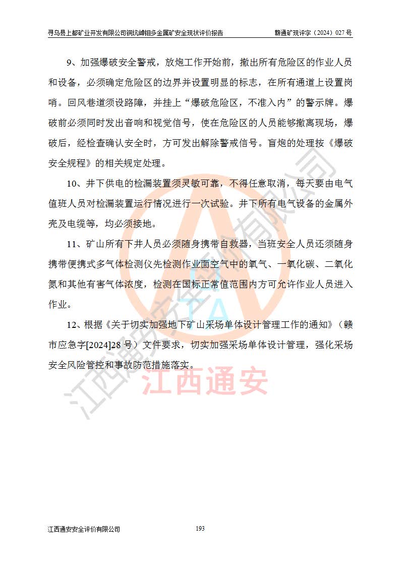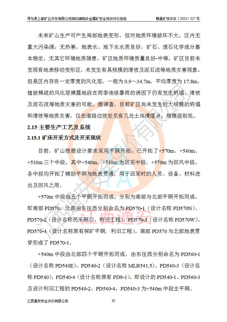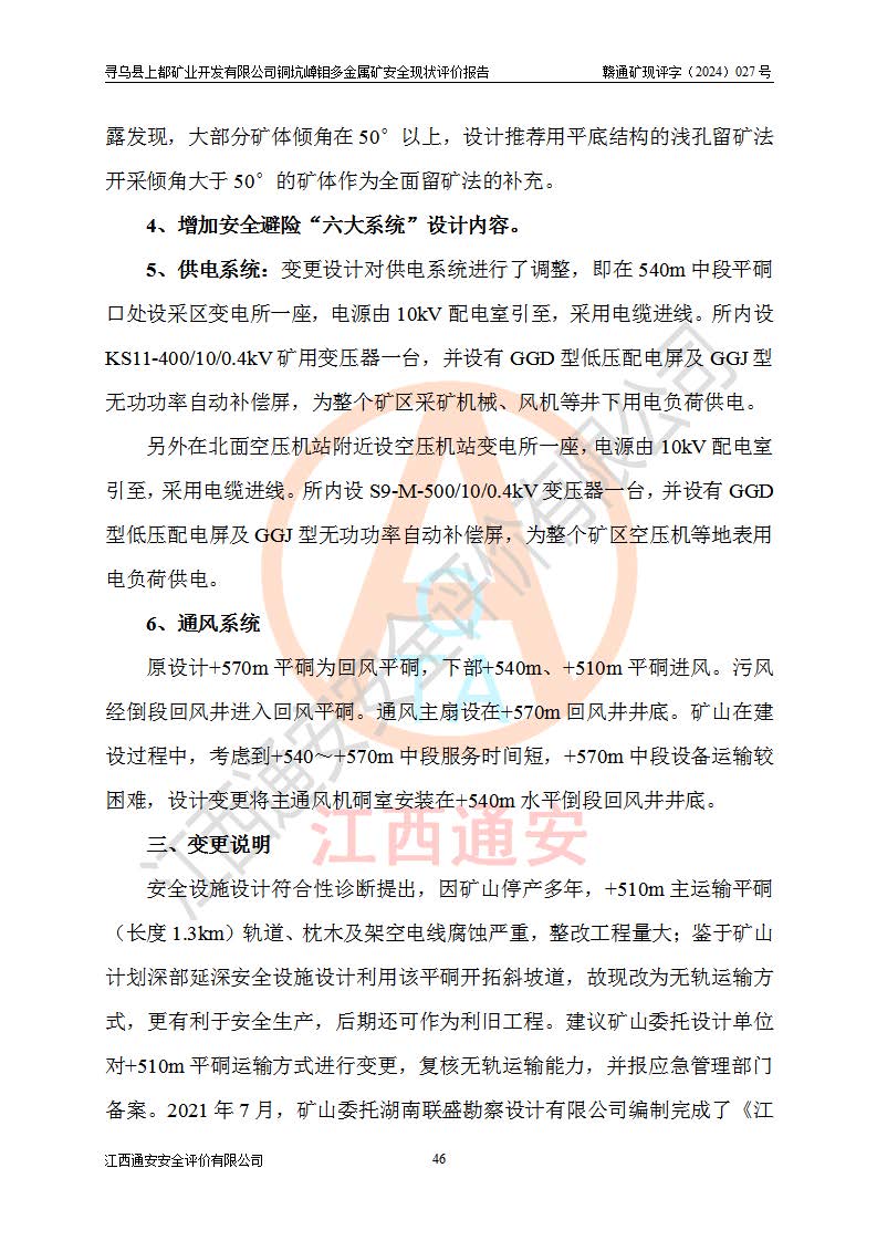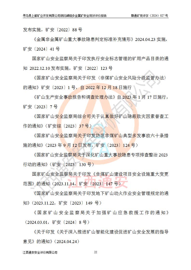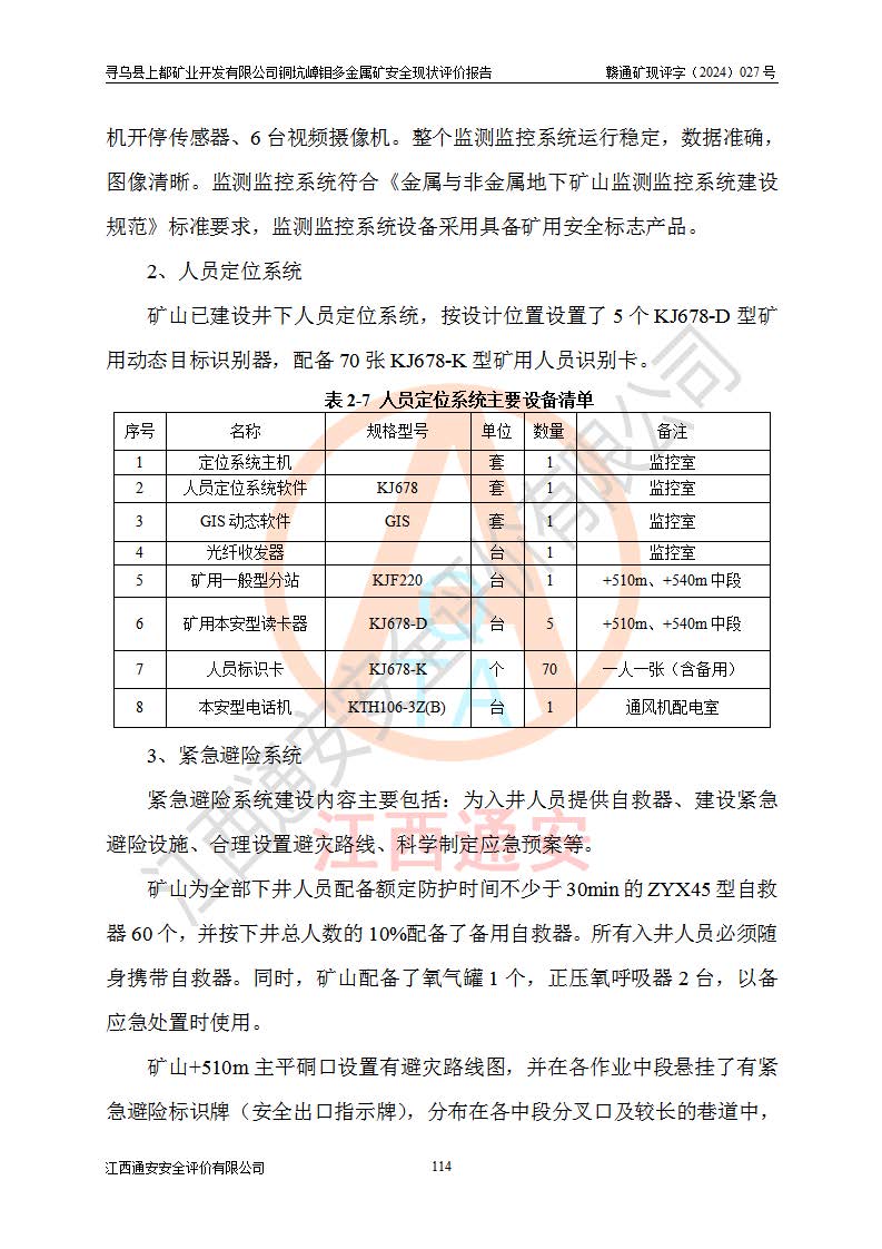 其它 | 尋烏縣上都礦業(yè)開發(fā)有限公司銅坑嶂鉬多金屬礦的主要生產(chǎn)及輔助系統(tǒng):運(yùn)輸、排水、供配電、通風(fēng)、供風(fēng)、采掘、安全避險(xiǎn)“六大系統(tǒng)”等基本符合法律法規(guī)要求和規(guī)程、規(guī)范要求;各種危險(xiǎn)有害因素及不可接受的風(fēng)險(xiǎn)在運(yùn)行中認(rèn)真落實(shí)行之**的技術(shù)措施或管理措施,嚴(yán)格按規(guī)程,按要求加強(qiáng)管理,可以避免和控制各類事故,**安全生產(chǎn)?,F(xiàn)階段礦山設(shè)備、設(shè)施和場所符合**安全生產(chǎn)有關(guān)法律、法規(guī)、標(biāo)準(zhǔn)及規(guī)范的規(guī)定。礦山采用平硐開拓方式,安全生產(chǎn)條件一般;安全管理能滿足法規(guī)要求,礦山地下開采符合**規(guī)定的安全生產(chǎn)條件。 | ||||