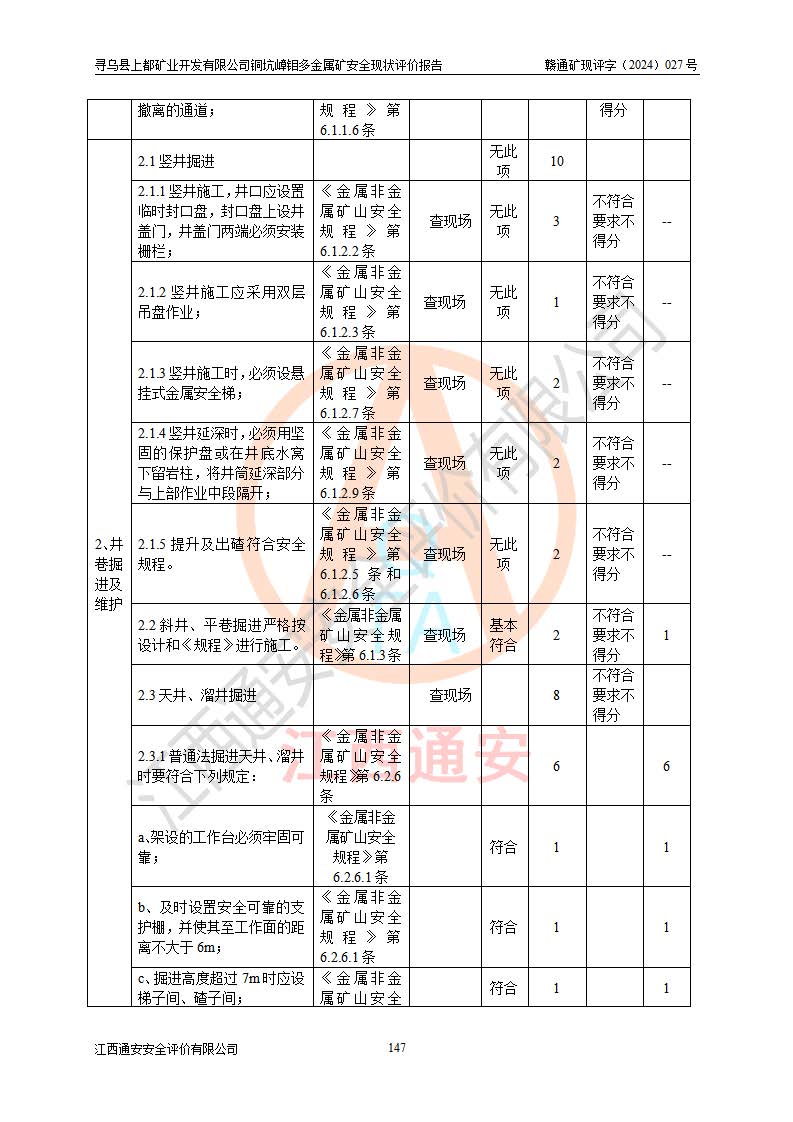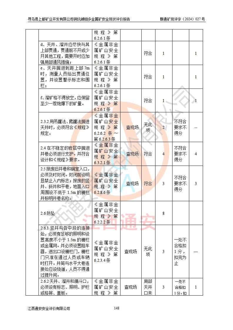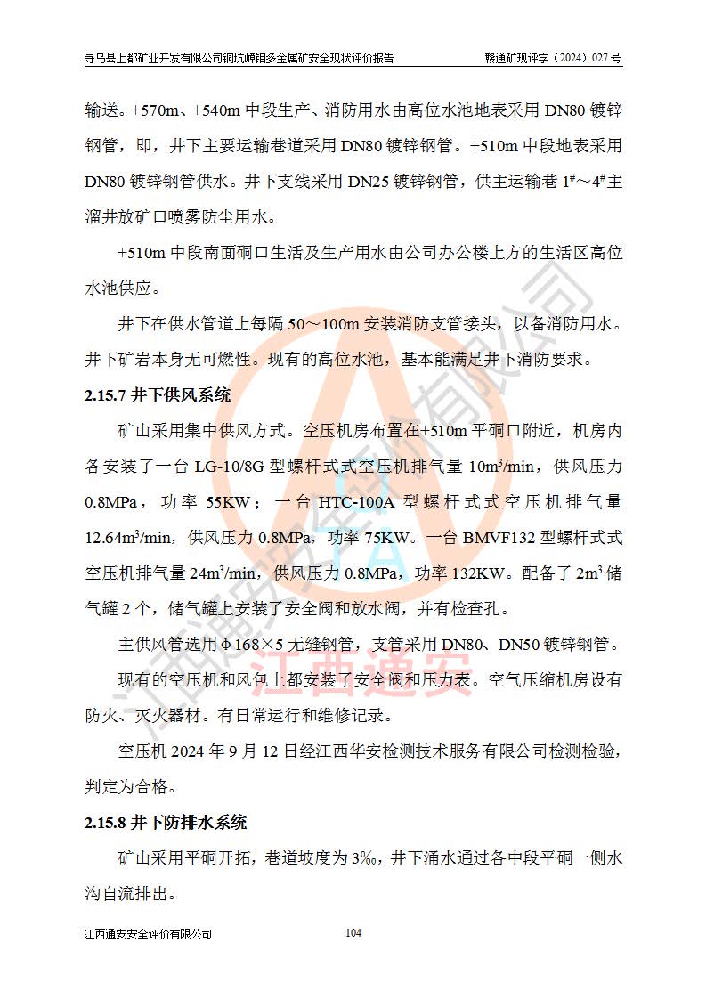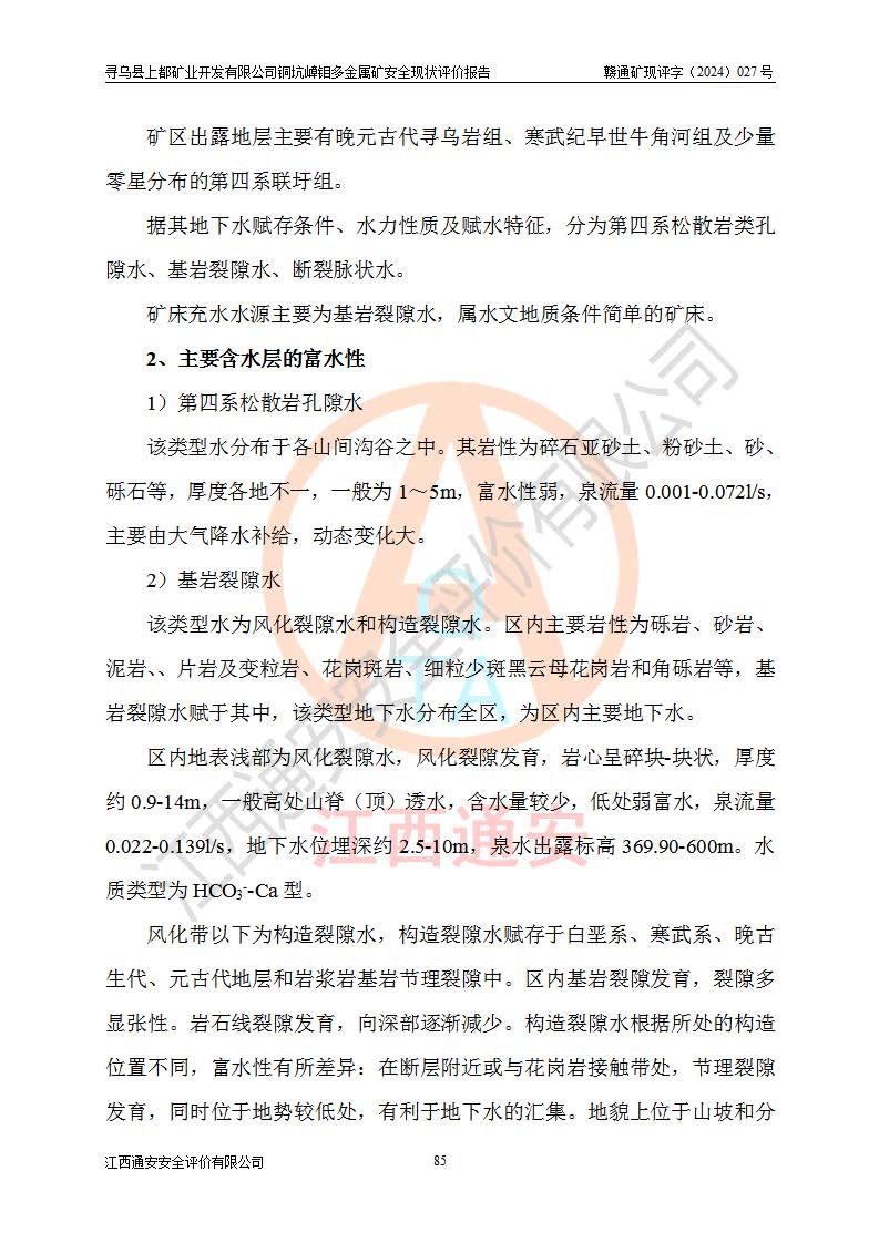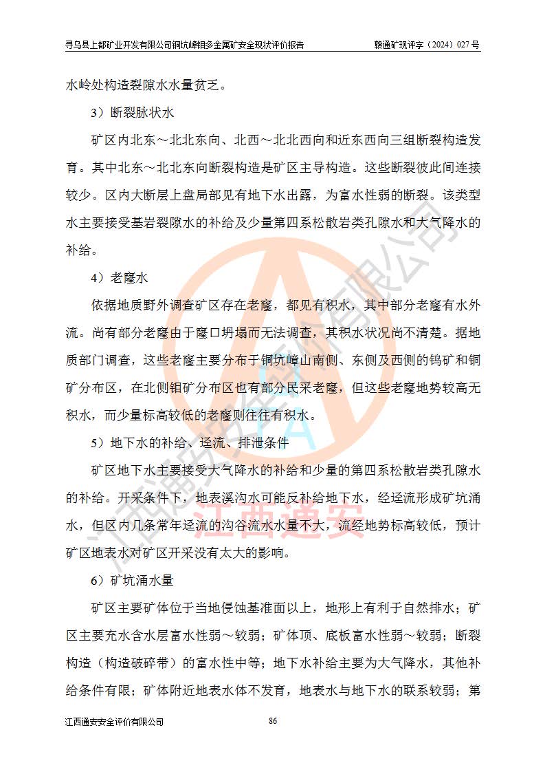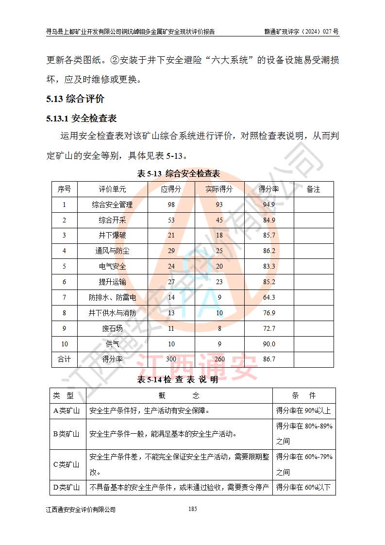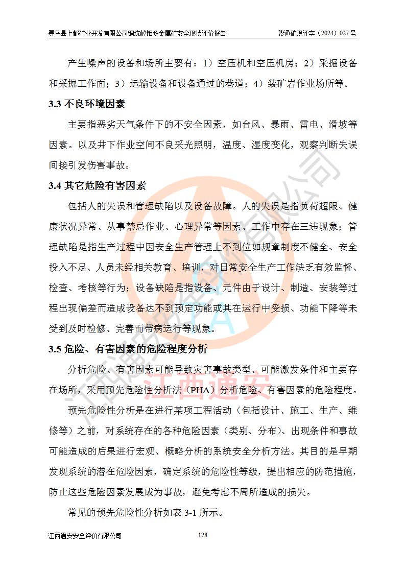 其它 | 尋烏縣上都礦業(yè)開發(fā)有限公司銅坑嶂鉬多金屬礦的主要生產(chǎn)及輔助系統(tǒng):運(yùn)輸、排水、供配電、通風(fēng)、供風(fēng)、采掘、安全避險(xiǎn)“六大系統(tǒng)”等基本符合法律法規(guī)要求和規(guī)程、規(guī)范要求;各種危險(xiǎn)有害因素及不可接受的風(fēng)險(xiǎn)在運(yùn)行中認(rèn)真落實(shí)行之**的技術(shù)措施或管理措施,嚴(yán)格按規(guī)程,按要求加強(qiáng)管理,可以避免和控制各類事故,**安全生產(chǎn)?,F(xiàn)階段礦山設(shè)備、設(shè)施和場所符合**安全生產(chǎn)有關(guān)法律、法規(guī)、標(biāo)準(zhǔn)及規(guī)范的規(guī)定。礦山采用平硐開拓方式,安全生產(chǎn)條件一般;安全管理能滿足法規(guī)要求,礦山地下開采符合**規(guī)定的安全生產(chǎn)條件。 | ||||