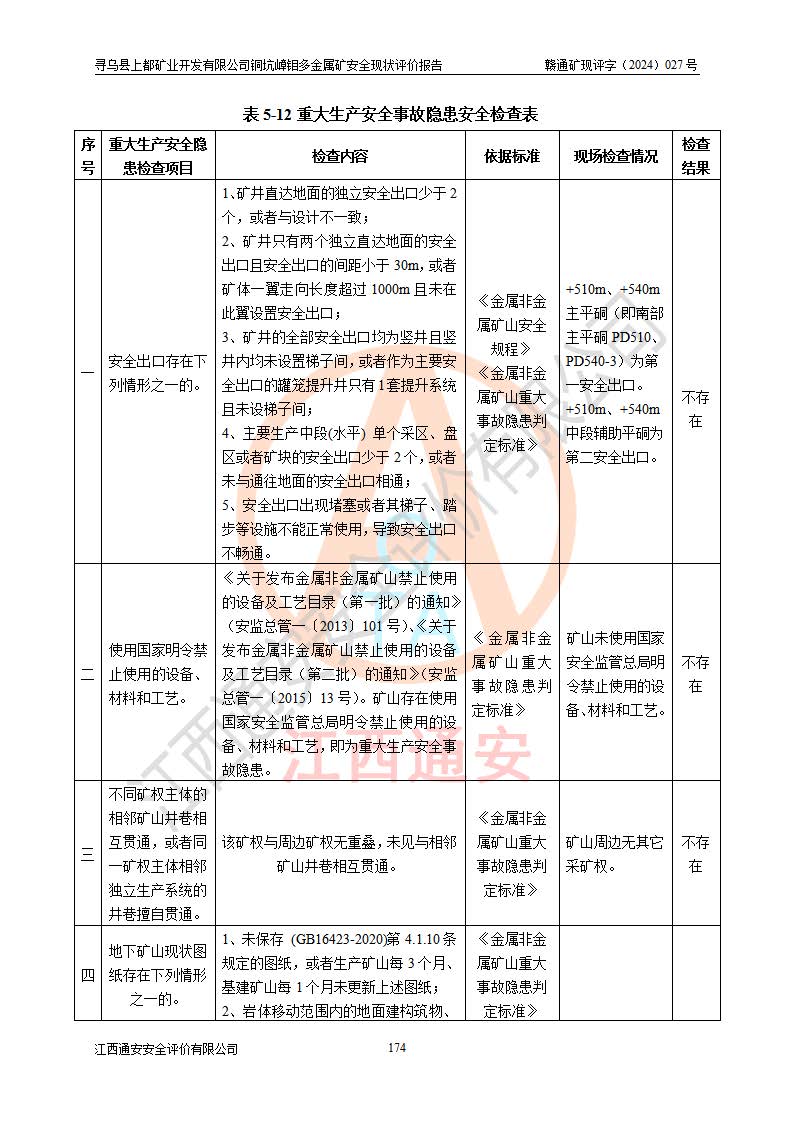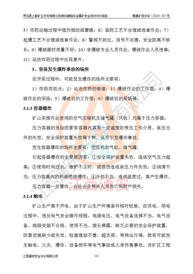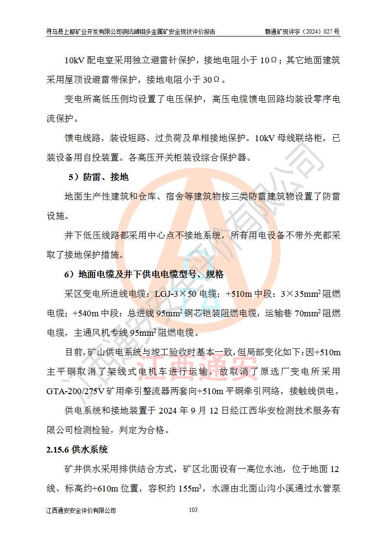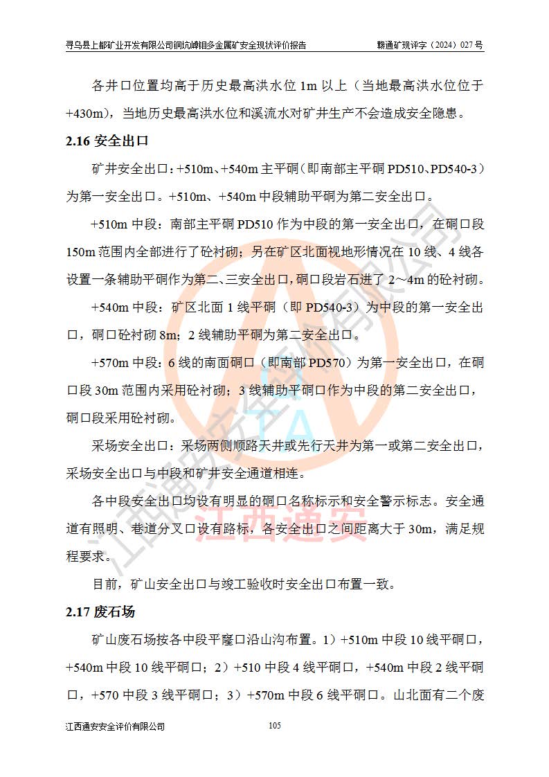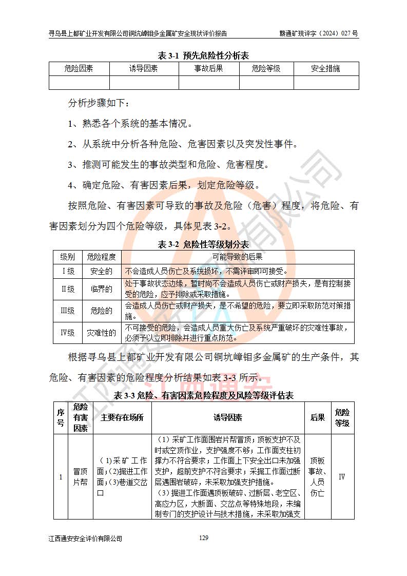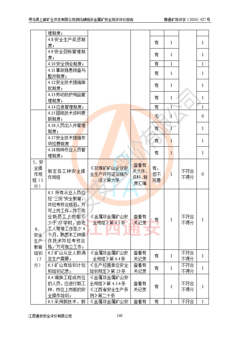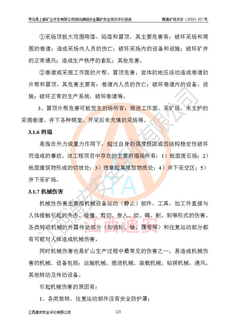 其它 | 尋烏縣上都礦業(yè)開發(fā)有限公司銅坑嶂鉬多金屬礦的主要生產(chǎn)及輔助系統(tǒng):運(yùn)輸、排水、供配電、通風(fēng)、供風(fēng)、采掘、安全避險(xiǎn)“六大系統(tǒng)”等基本符合法律法規(guī)要求和規(guī)程、規(guī)范要求;各種危險(xiǎn)有害因素及不可接受的風(fēng)險(xiǎn)在運(yùn)行中認(rèn)真落實(shí)行之**的技術(shù)措施或管理措施,嚴(yán)格按規(guī)程,按要求加強(qiáng)管理,可以避免和控制各類事故,**安全生產(chǎn)?,F(xiàn)階段礦山設(shè)備、設(shè)施和場所符合**安全生產(chǎn)有關(guān)法律、法規(guī)、標(biāo)準(zhǔn)及規(guī)范的規(guī)定。礦山采用平硐開拓方式,安全生產(chǎn)條件一般;安全管理能滿足法規(guī)要求,礦山地下開采符合**規(guī)定的安全生產(chǎn)條件。 | ||||