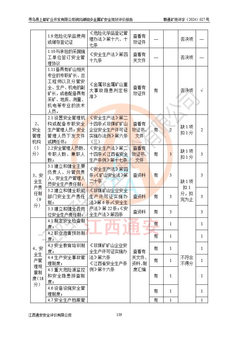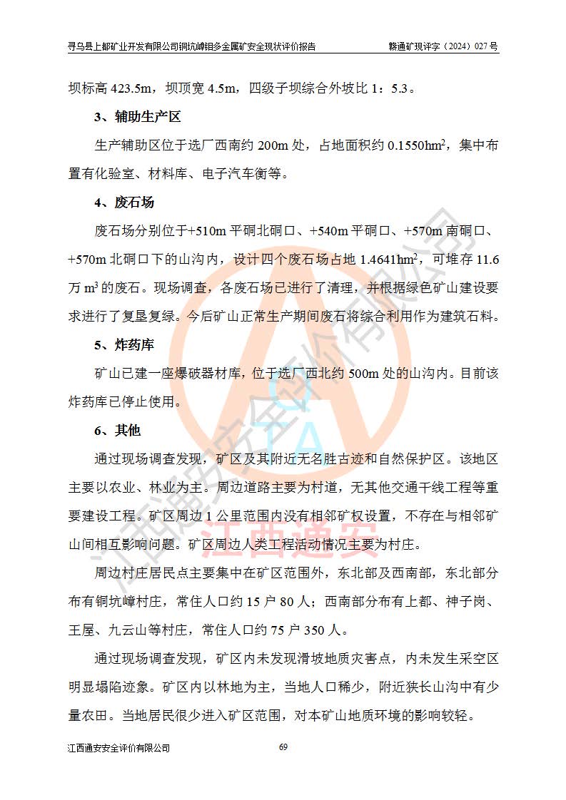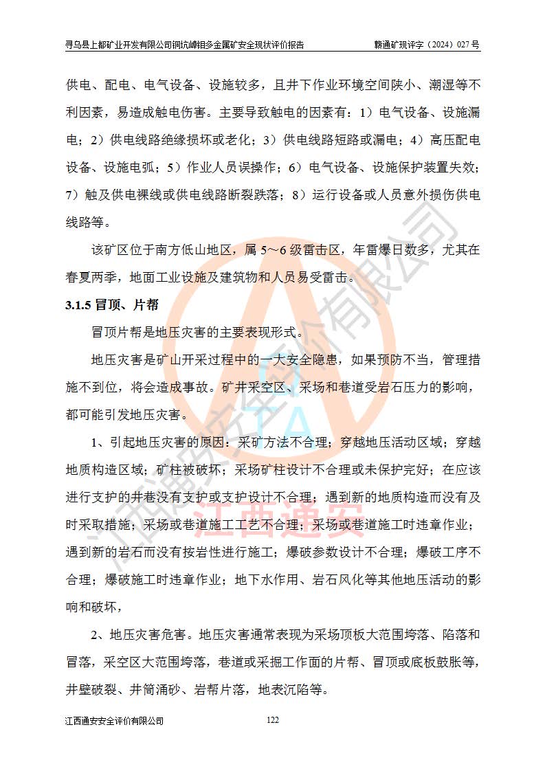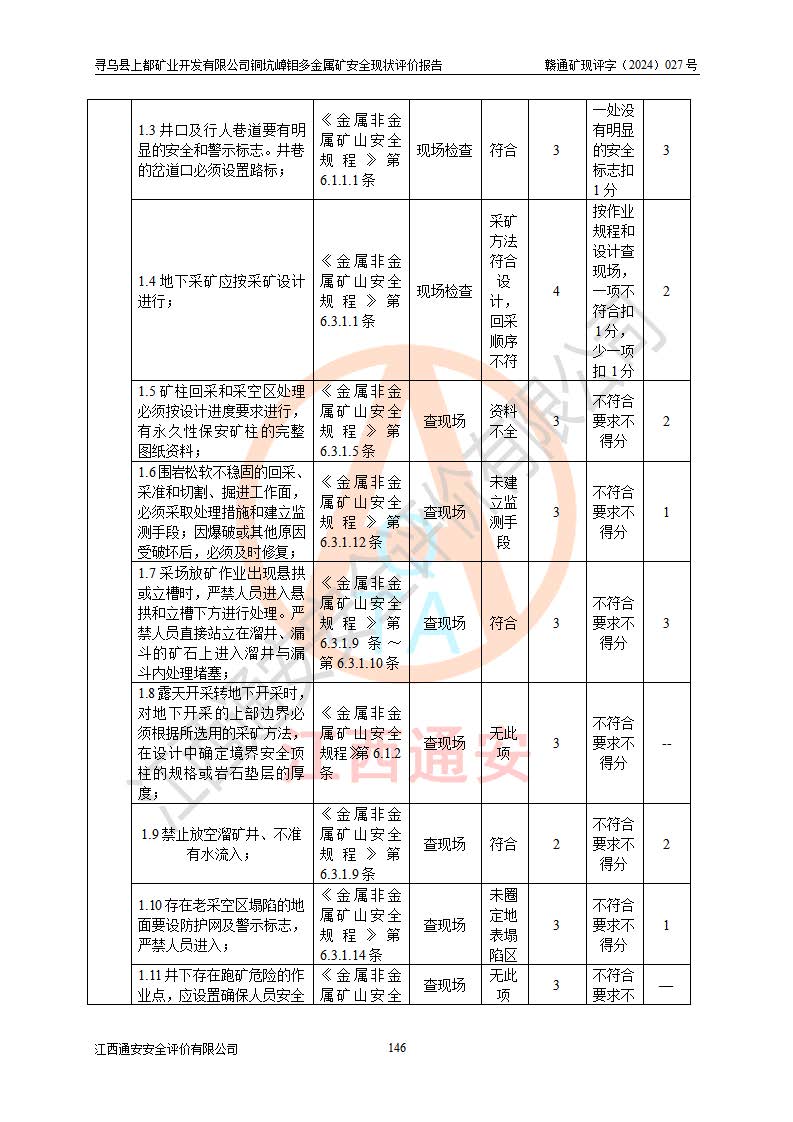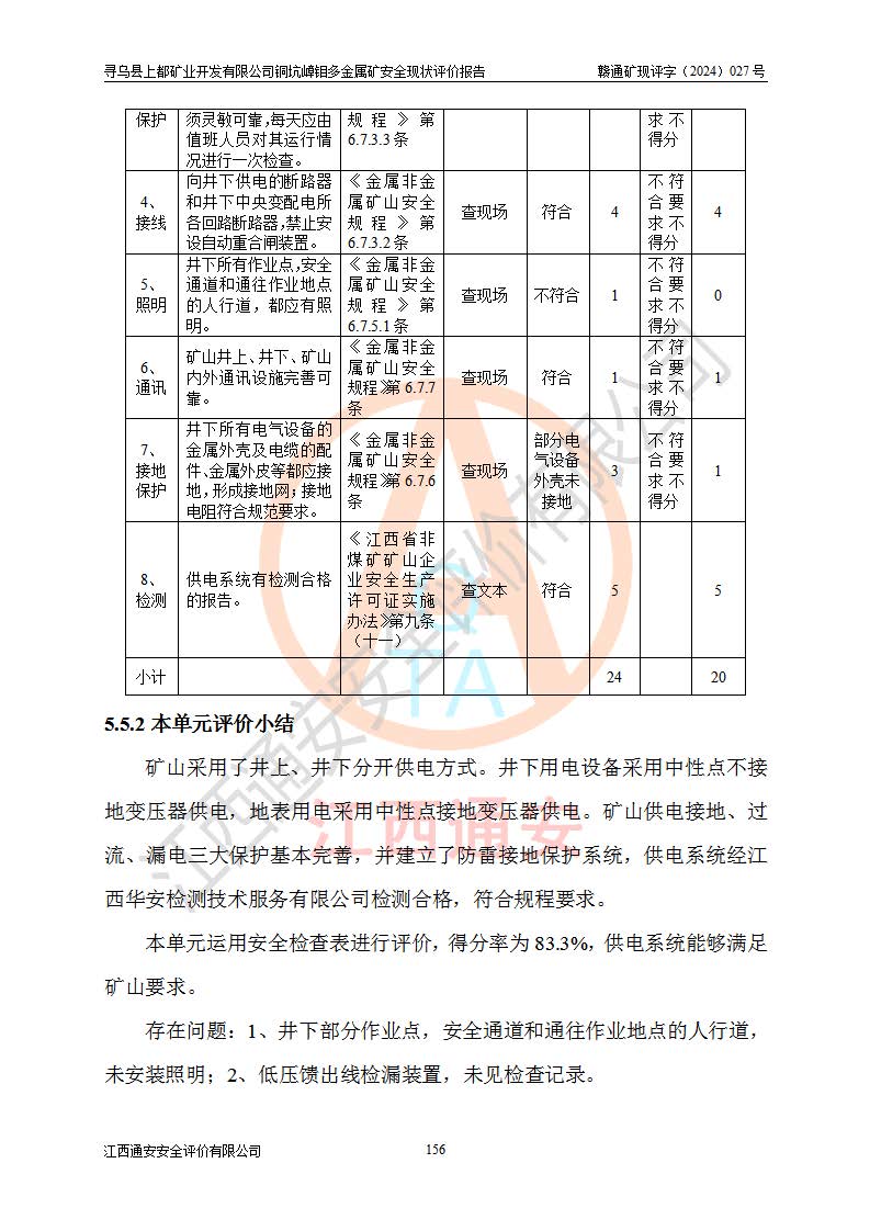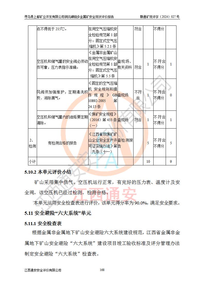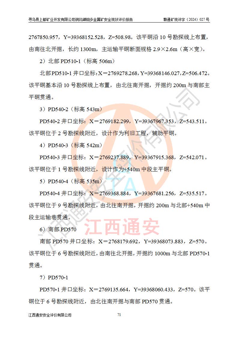 其它 | 尋烏縣上都礦業(yè)開發(fā)有限公司銅坑嶂鉬多金屬礦的主要生產(chǎn)及輔助系統(tǒng):運(yùn)輸、排水、供配電、通風(fēng)、供風(fēng)、采掘、安全避險(xiǎn)“六大系統(tǒng)”等基本符合法律法規(guī)要求和規(guī)程、規(guī)范要求;各種危險(xiǎn)有害因素及不可接受的風(fēng)險(xiǎn)在運(yùn)行中認(rèn)真落實(shí)行之**的技術(shù)措施或管理措施,嚴(yán)格按規(guī)程,按要求加強(qiáng)管理,可以避免和控制各類事故,**安全生產(chǎn)?,F(xiàn)階段礦山設(shè)備、設(shè)施和場所符合**安全生產(chǎn)有關(guān)法律、法規(guī)、標(biāo)準(zhǔn)及規(guī)范的規(guī)定。礦山采用平硐開拓方式,安全生產(chǎn)條件一般;安全管理能滿足法規(guī)要求,礦山地下開采符合**規(guī)定的安全生產(chǎn)條件。 | ||||