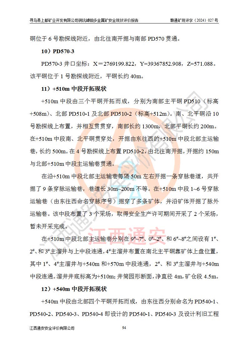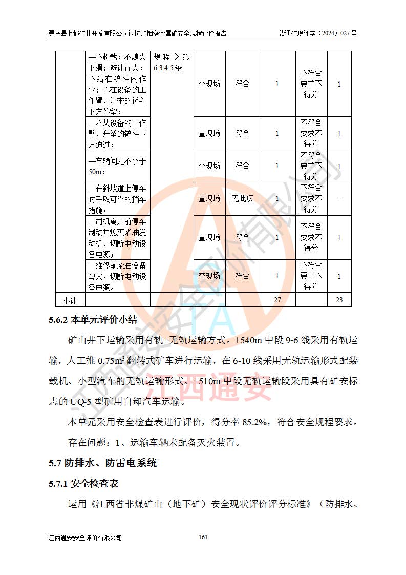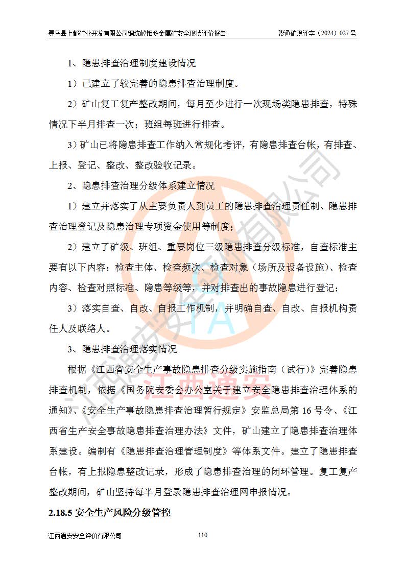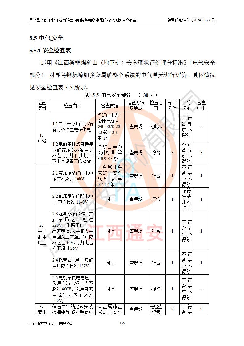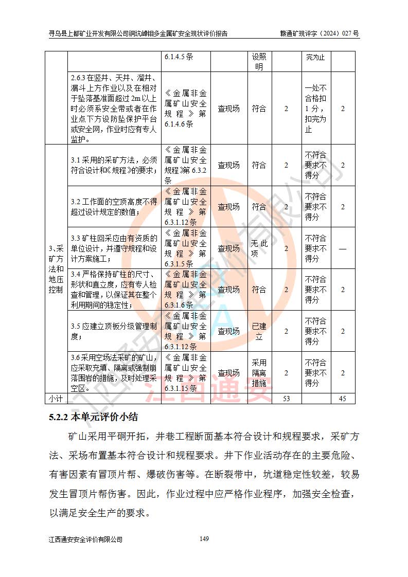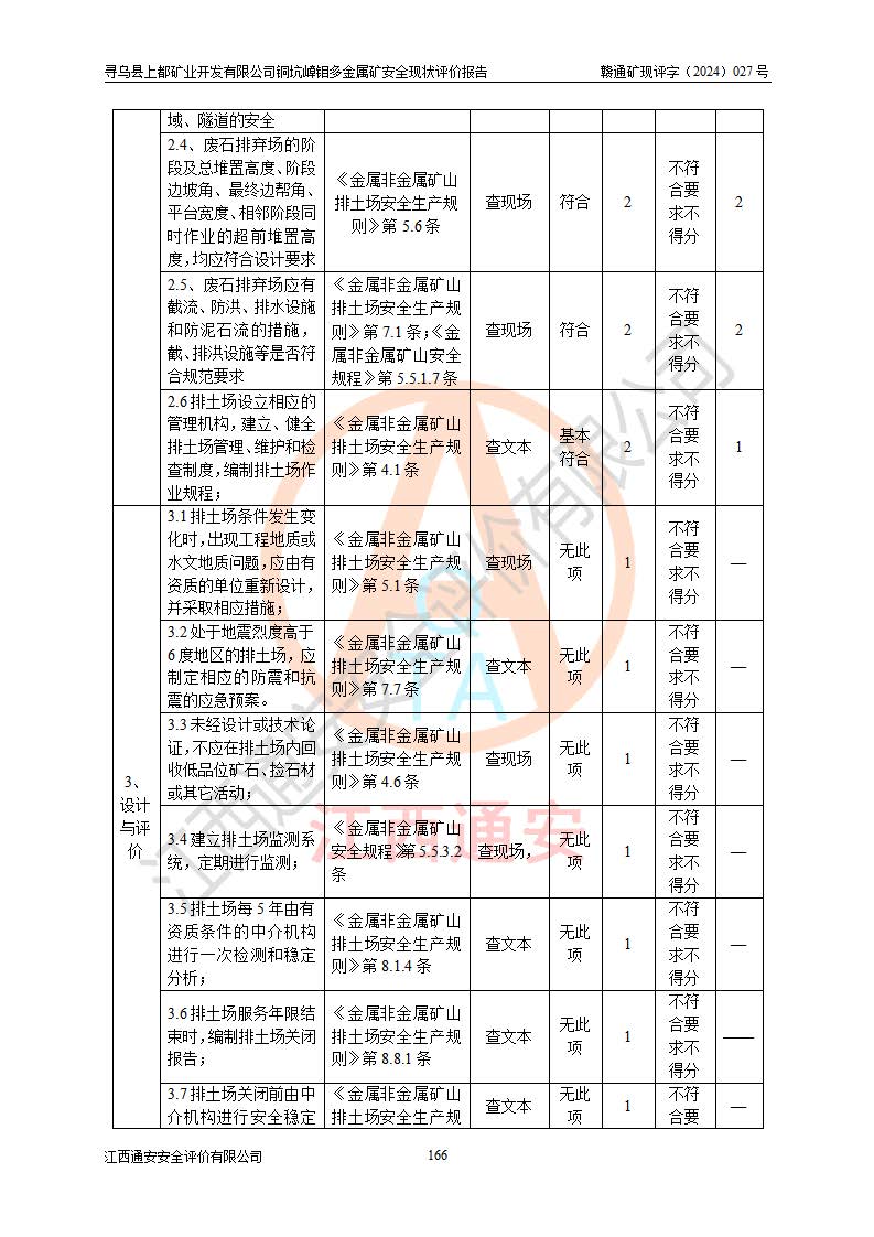 其它 | 尋烏縣上都礦業(yè)開發(fā)有限公司銅坑嶂鉬多金屬礦的主要生產(chǎn)及輔助系統(tǒng):運(yùn)輸、排水、供配電、通風(fēng)、供風(fēng)、采掘、安全避險(xiǎn)“六大系統(tǒng)”等基本符合法律法規(guī)要求和規(guī)程、規(guī)范要求;各種危險(xiǎn)有害因素及不可接受的風(fēng)險(xiǎn)在運(yùn)行中認(rèn)真落實(shí)行之**的技術(shù)措施或管理措施,嚴(yán)格按規(guī)程,按要求加強(qiáng)管理,可以避免和控制各類事故,**安全生產(chǎn)?,F(xiàn)階段礦山設(shè)備、設(shè)施和場所符合**安全生產(chǎn)有關(guān)法律、法規(guī)、標(biāo)準(zhǔn)及規(guī)范的規(guī)定。礦山采用平硐開拓方式,安全生產(chǎn)條件一般;安全管理能滿足法規(guī)要求,礦山地下開采符合**規(guī)定的安全生產(chǎn)條件。 | ||||