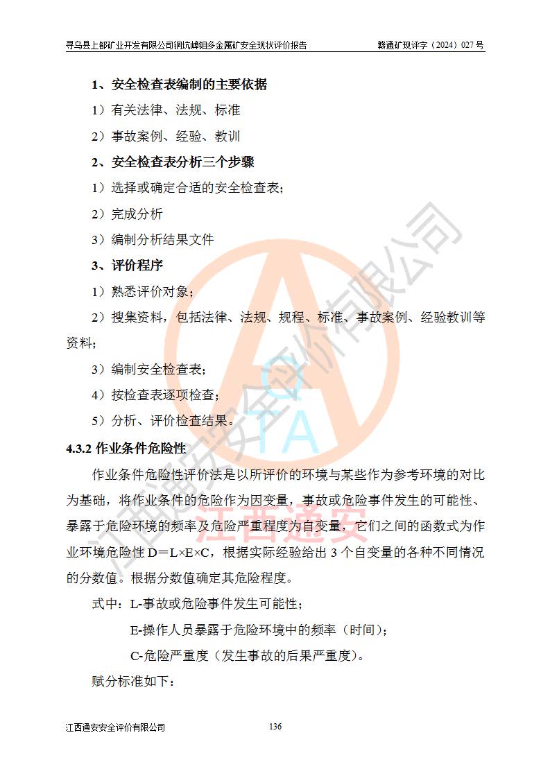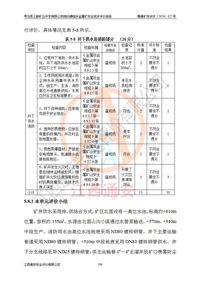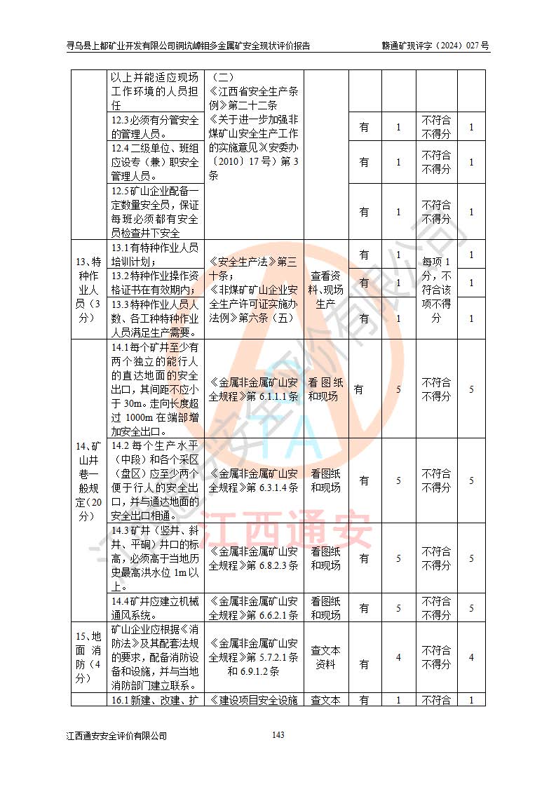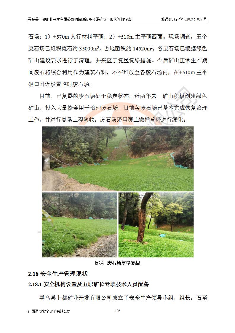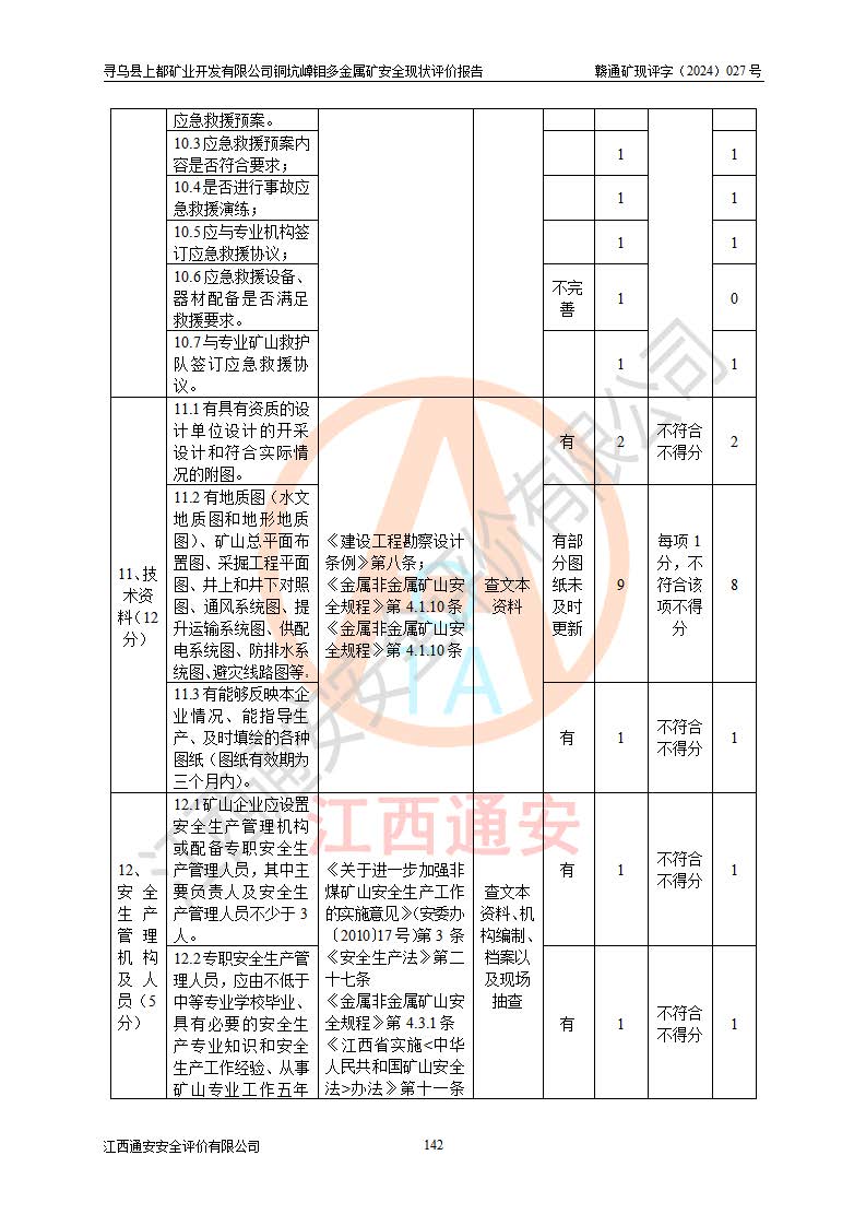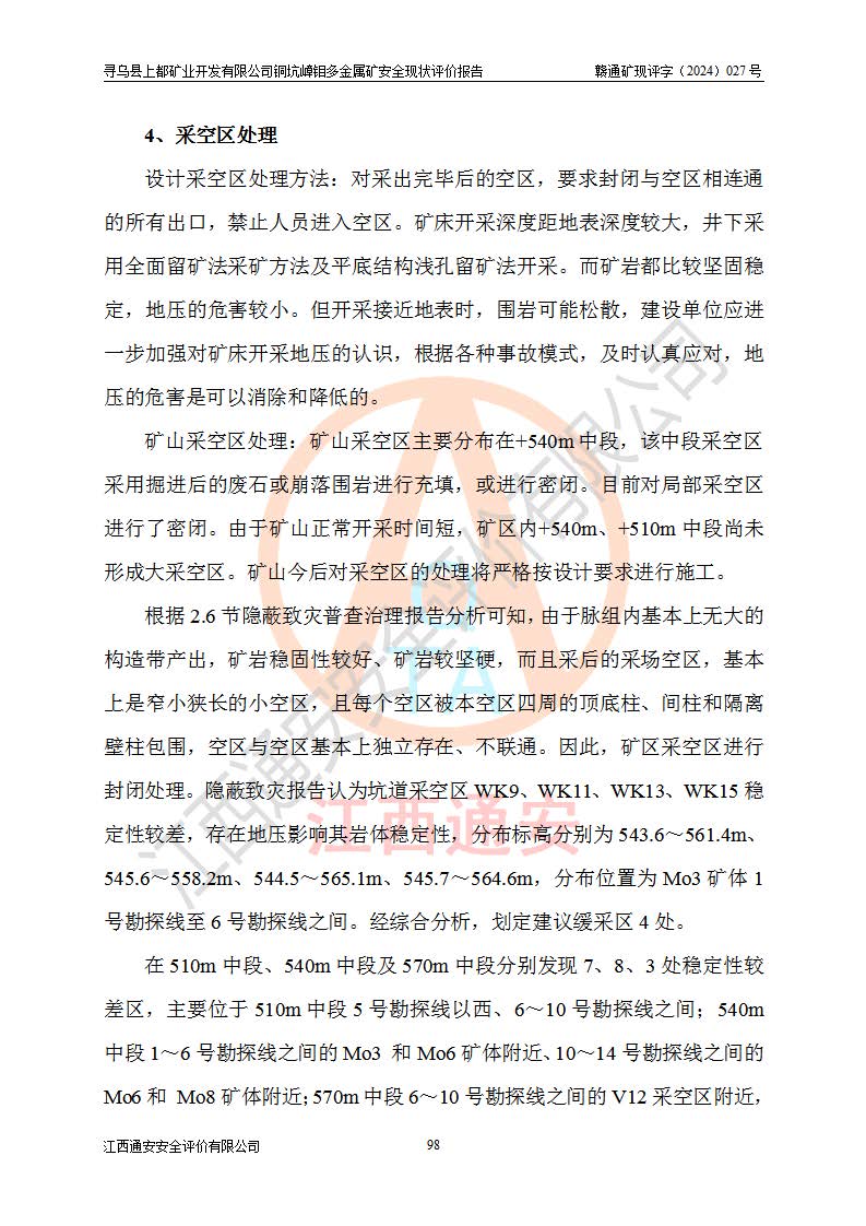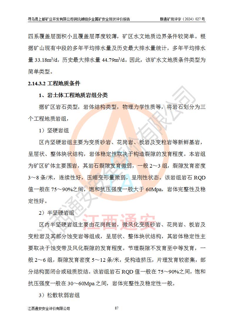 其它 | 尋烏縣上都礦業(yè)開發(fā)有限公司銅坑嶂鉬多金屬礦的主要生產(chǎn)及輔助系統(tǒng):運(yùn)輸、排水、供配電、通風(fēng)、供風(fēng)、采掘、安全避險(xiǎn)“六大系統(tǒng)”等基本符合法律法規(guī)要求和規(guī)程、規(guī)范要求;各種危險(xiǎn)有害因素及不可接受的風(fēng)險(xiǎn)在運(yùn)行中認(rèn)真落實(shí)行之**的技術(shù)措施或管理措施,嚴(yán)格按規(guī)程,按要求加強(qiáng)管理,可以避免和控制各類事故,**安全生產(chǎn)?,F(xiàn)階段礦山設(shè)備、設(shè)施和場所符合**安全生產(chǎn)有關(guān)法律、法規(guī)、標(biāo)準(zhǔn)及規(guī)范的規(guī)定。礦山采用平硐開拓方式,安全生產(chǎn)條件一般;安全管理能滿足法規(guī)要求,礦山地下開采符合**規(guī)定的安全生產(chǎn)條件。 | ||||