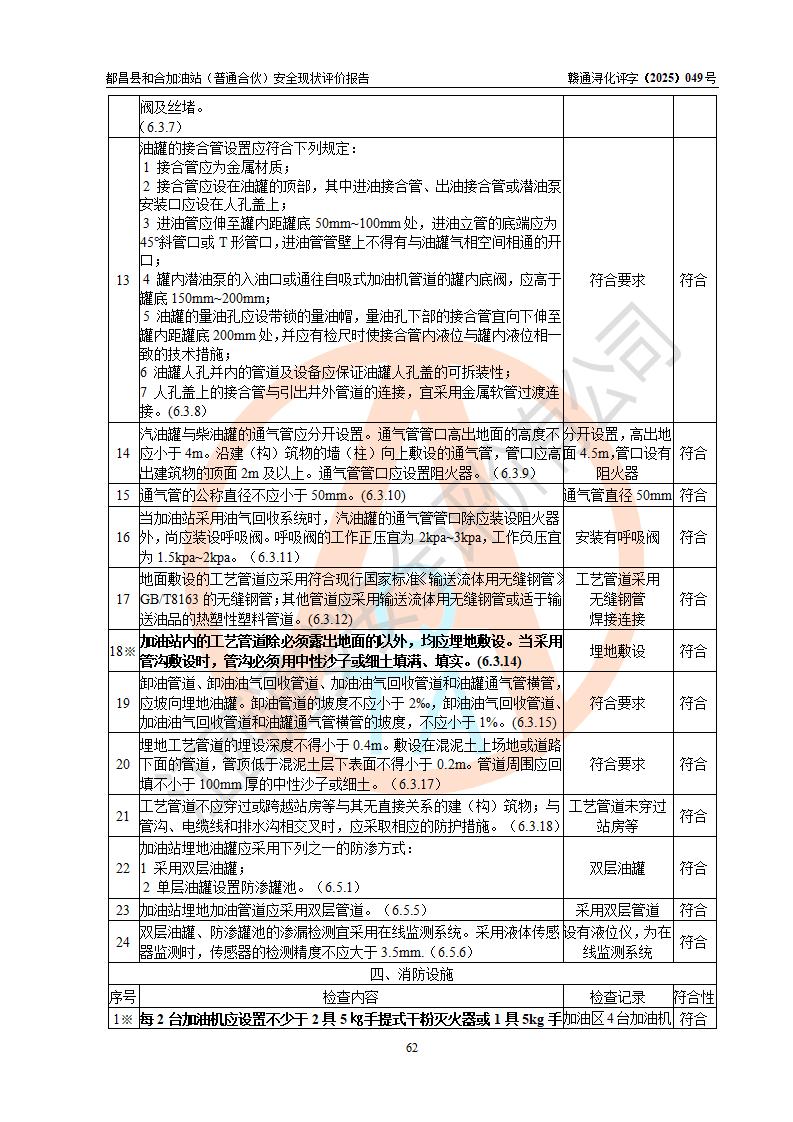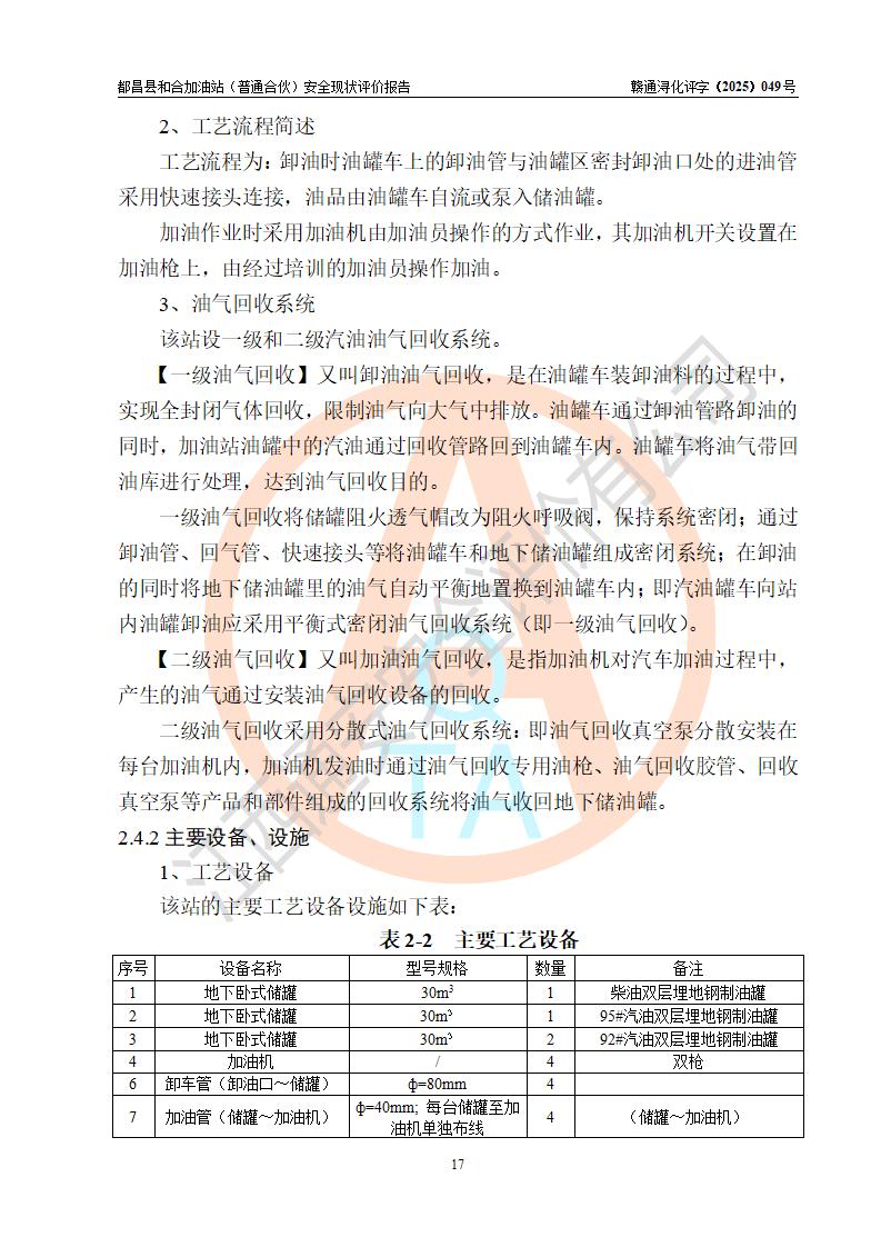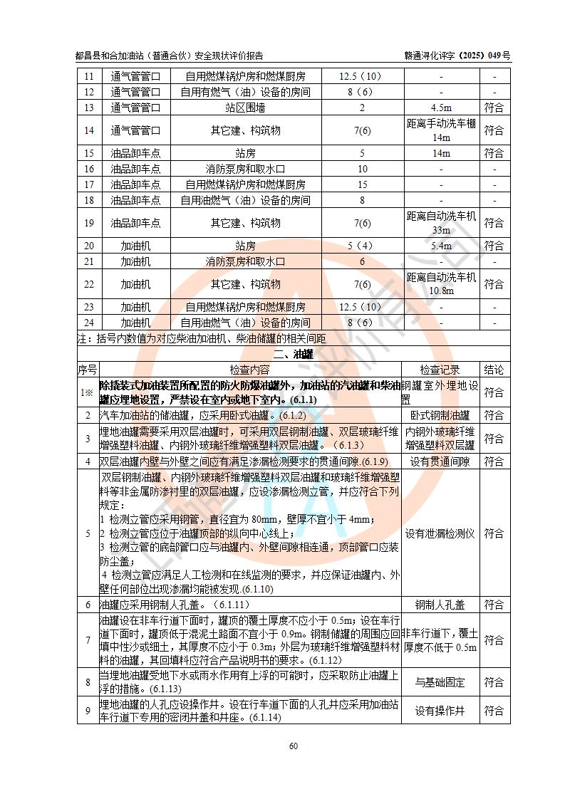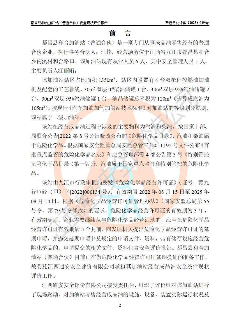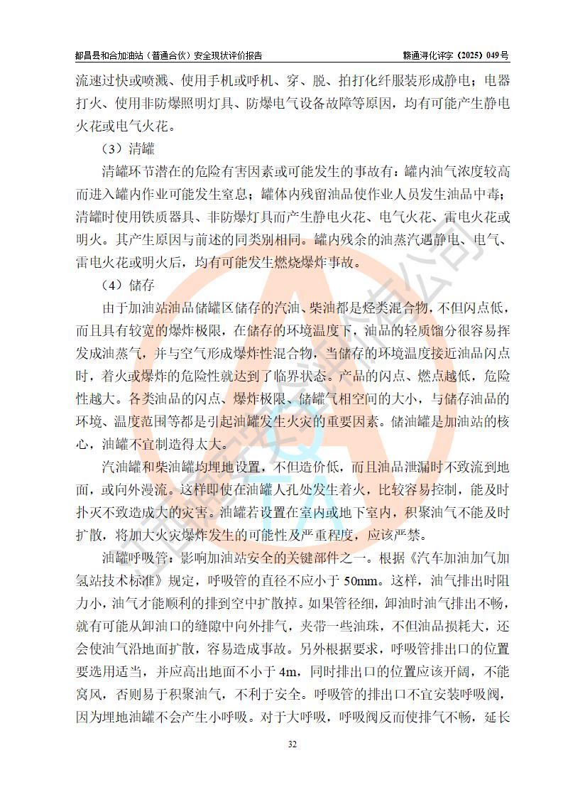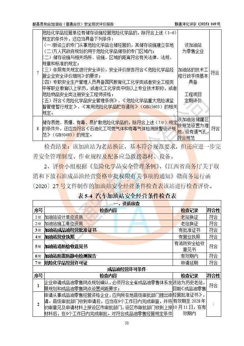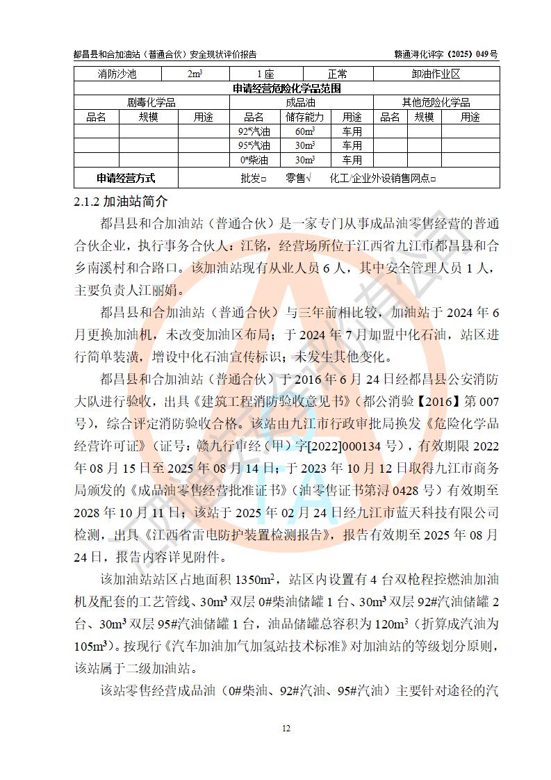 都昌縣和合加油站(普通合伙)是一家專門(mén)從事成品油零售經(jīng)營(yíng)的普通合伙企業(yè),執(zhí)行事務(wù)合伙人:江銘,經(jīng)營(yíng)場(chǎng)所位于江西省九江市都昌縣和合鄉(xiāng)南溪村和合路口。該加油站現(xiàn)有從業(yè)人員6人,其中安全管理人員1人,主要負(fù)責(zé)人江麗娟。 該加油站站區(qū)占地面積1350m2,站區(qū)內(nèi)設(shè)置有4臺(tái)雙槍程控燃油加油機(jī)及配套的工藝管線、30m3雙層0#柴油儲(chǔ)罐1臺(tái)、30m3雙層92#汽油儲(chǔ)罐2臺(tái)、30m3雙層95#汽油儲(chǔ)罐1臺(tái),油品儲(chǔ)罐總?cè)莘e為120m3(折算成汽油為105m3)。按現(xiàn)行《汽車加油加氣加氫站技術(shù)標(biāo)準(zhǔn)》對(duì)加油站的等級(jí)劃分原則,該站屬于二級(jí)加油站。 該站由九江市行政審批局換發(fā)《危險(xiǎn)化學(xué)品經(jīng)營(yíng)許可證》(證號(hào):贛九行審經(jīng)(甲)字[2022]000134號(hào)),**期限2022年08月15日至2025年08月14日。 |