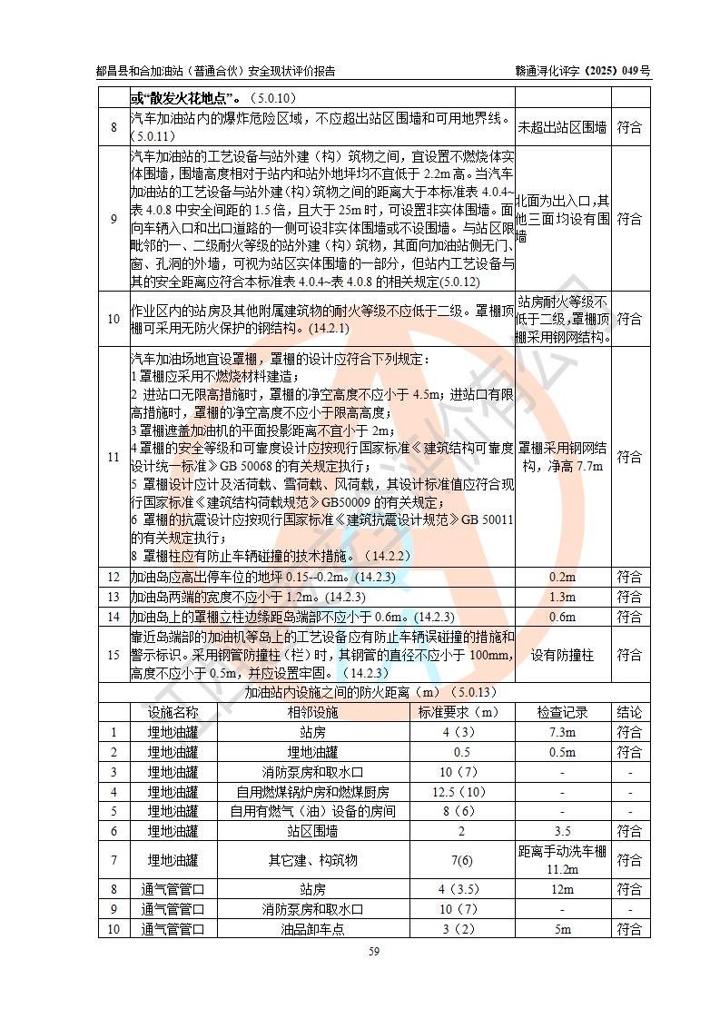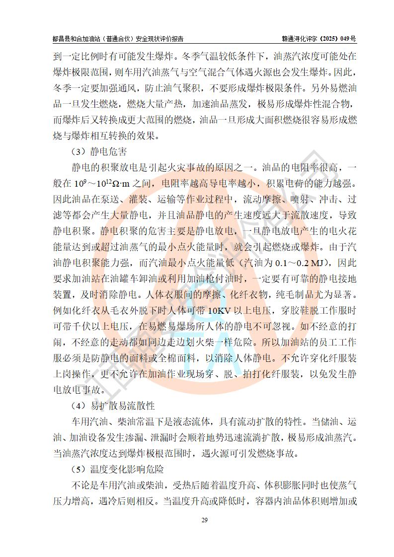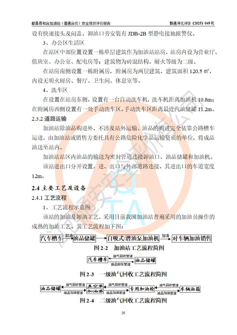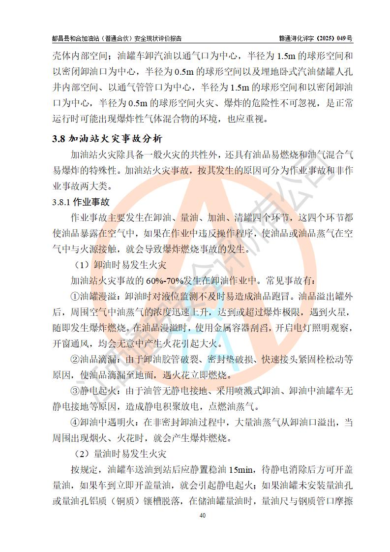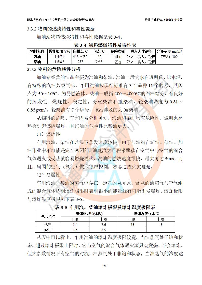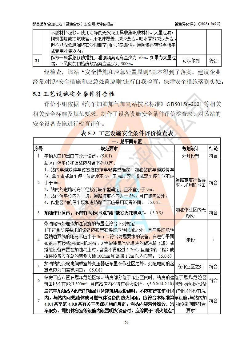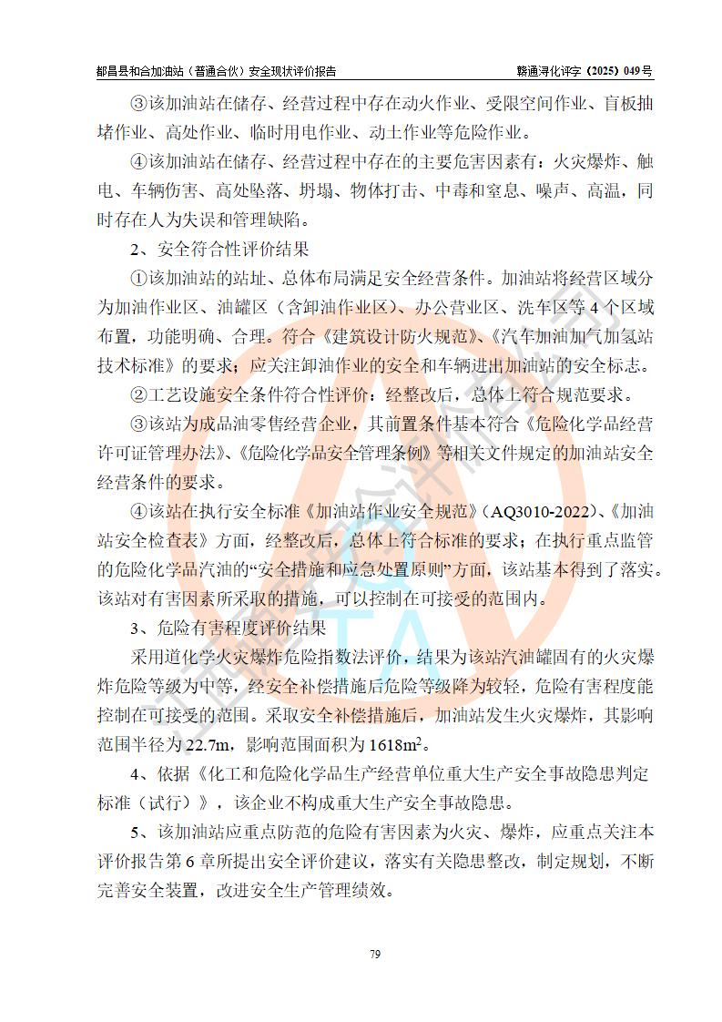 都昌縣和合加油站(普通合伙)是一家專門(mén)從事成品油零售經(jīng)營(yíng)的普通合伙企業(yè),執(zhí)行事務(wù)合伙人:江銘,經(jīng)營(yíng)場(chǎng)所位于江西省九江市都昌縣和合鄉(xiāng)南溪村和合路口。該加油站現(xiàn)有從業(yè)人員6人,其中安全管理人員1人,主要負(fù)責(zé)人江麗娟。 該加油站站區(qū)占地面積1350m2,站區(qū)內(nèi)設(shè)置有4臺(tái)雙槍程控燃油加油機(jī)及配套的工藝管線、30m3雙層0#柴油儲(chǔ)罐1臺(tái)、30m3雙層92#汽油儲(chǔ)罐2臺(tái)、30m3雙層95#汽油儲(chǔ)罐1臺(tái),油品儲(chǔ)罐總?cè)莘e為120m3(折算成汽油為105m3)。按現(xiàn)行《汽車加油加氣加氫站技術(shù)標(biāo)準(zhǔn)》對(duì)加油站的等級(jí)劃分原則,該站屬于二級(jí)加油站。 該站由九江市行政審批局換發(fā)《危險(xiǎn)化學(xué)品經(jīng)營(yíng)許可證》(證號(hào):贛九行審經(jīng)(甲)字[2022]000134號(hào)),**期限2022年08月15日至2025年08月14日。 |