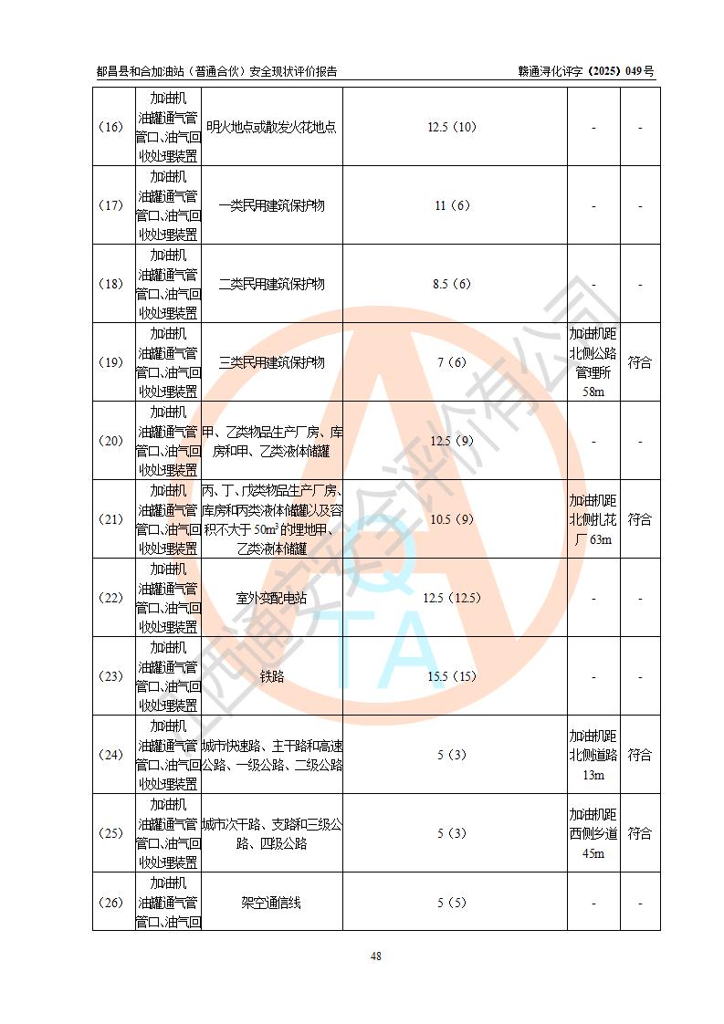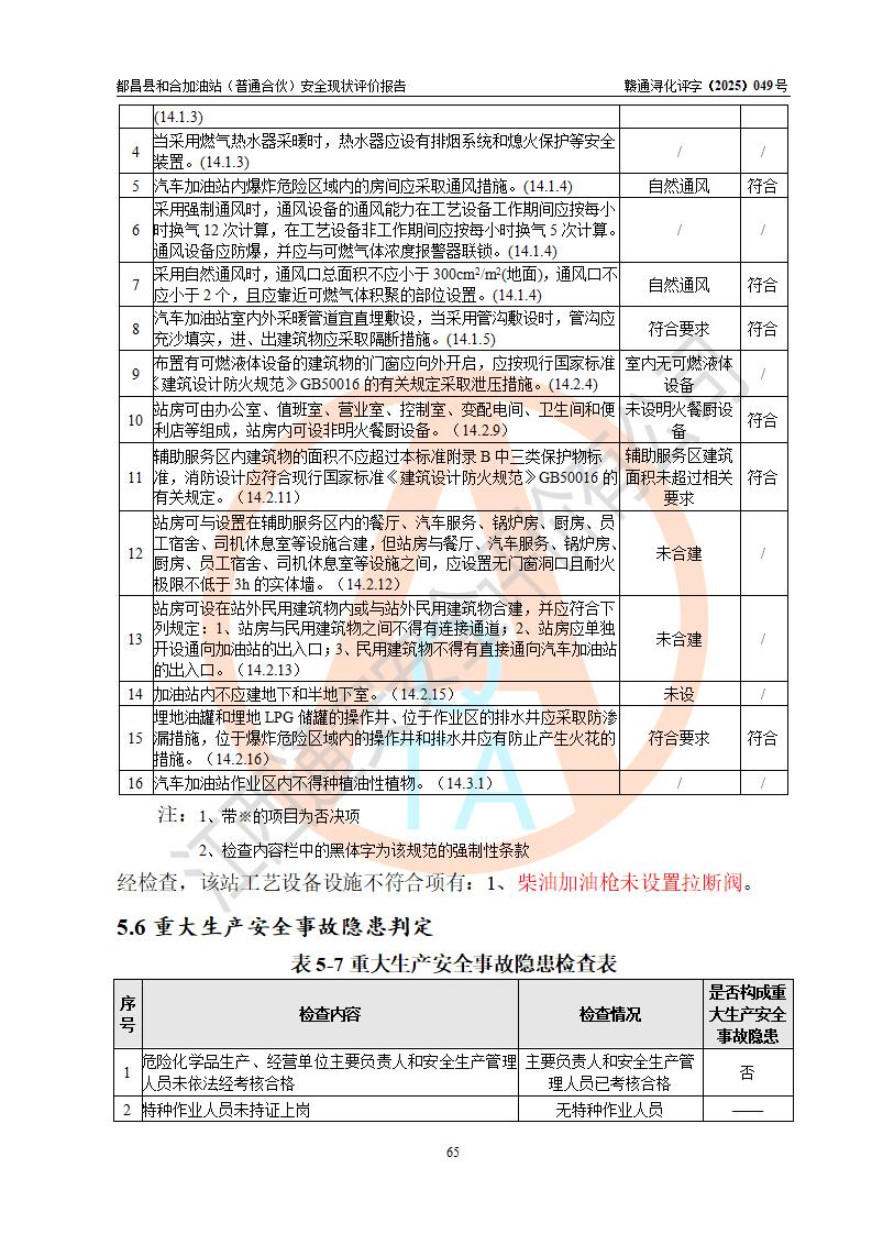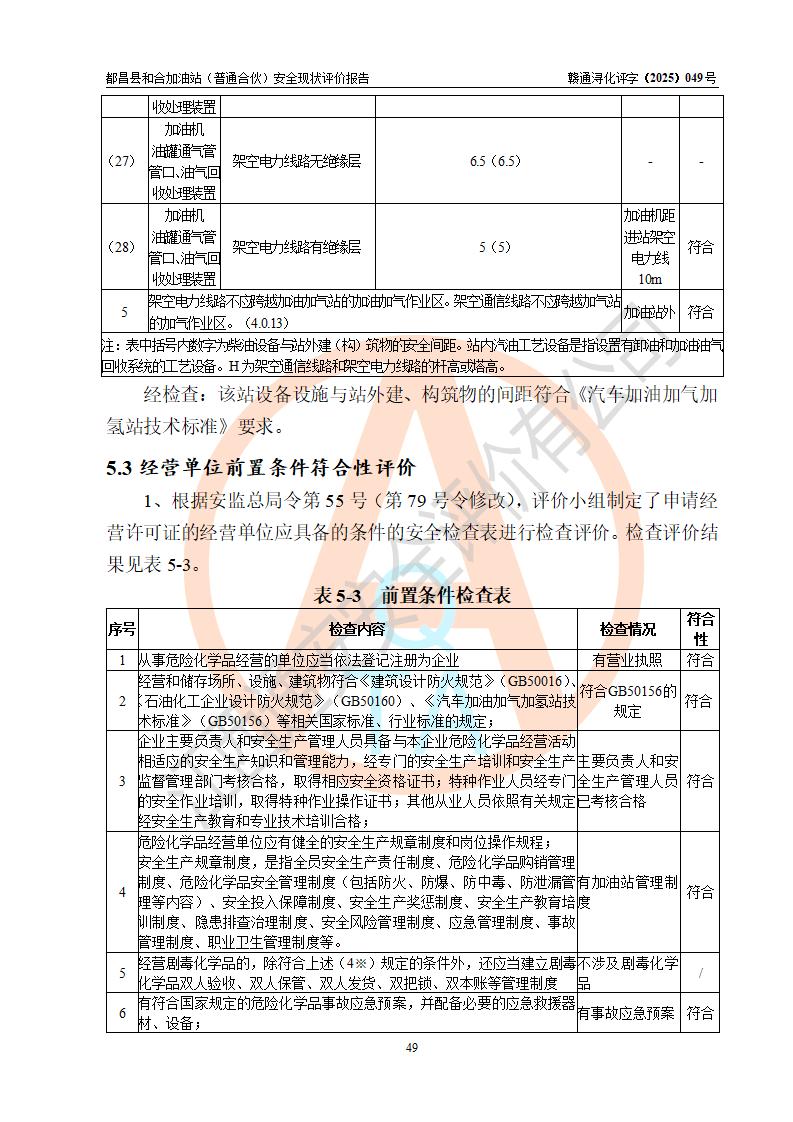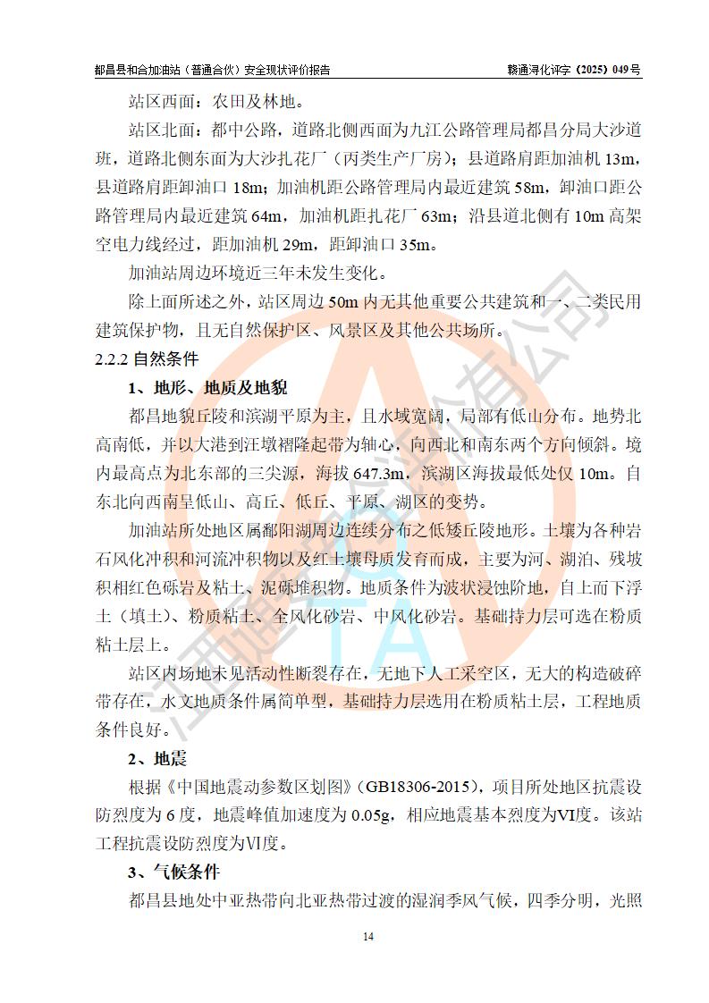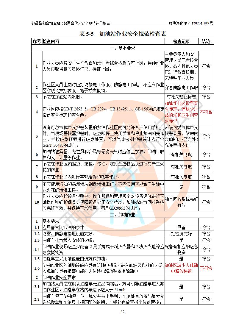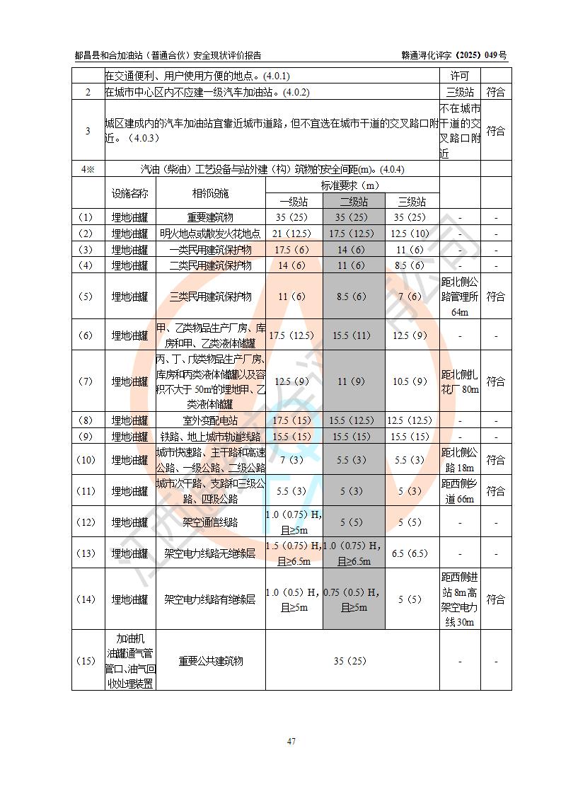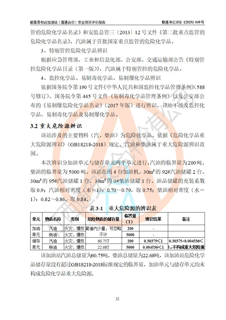 都昌縣和合加油站(普通合伙)是一家專門(mén)從事成品油零售經(jīng)營(yíng)的普通合伙企業(yè),執(zhí)行事務(wù)合伙人:江銘,經(jīng)營(yíng)場(chǎng)所位于江西省九江市都昌縣和合鄉(xiāng)南溪村和合路口。該加油站現(xiàn)有從業(yè)人員6人,其中安全管理人員1人,主要負(fù)責(zé)人江麗娟。 該加油站站區(qū)占地面積1350m2,站區(qū)內(nèi)設(shè)置有4臺(tái)雙槍程控燃油加油機(jī)及配套的工藝管線、30m3雙層0#柴油儲(chǔ)罐1臺(tái)、30m3雙層92#汽油儲(chǔ)罐2臺(tái)、30m3雙層95#汽油儲(chǔ)罐1臺(tái),油品儲(chǔ)罐總?cè)莘e為120m3(折算成汽油為105m3)。按現(xiàn)行《汽車加油加氣加氫站技術(shù)標(biāo)準(zhǔn)》對(duì)加油站的等級(jí)劃分原則,該站屬于二級(jí)加油站。 該站由九江市行政審批局換發(fā)《危險(xiǎn)化學(xué)品經(jīng)營(yíng)許可證》(證號(hào):贛九行審經(jīng)(甲)字[2022]000134號(hào)),**期限2022年08月15日至2025年08月14日。 |