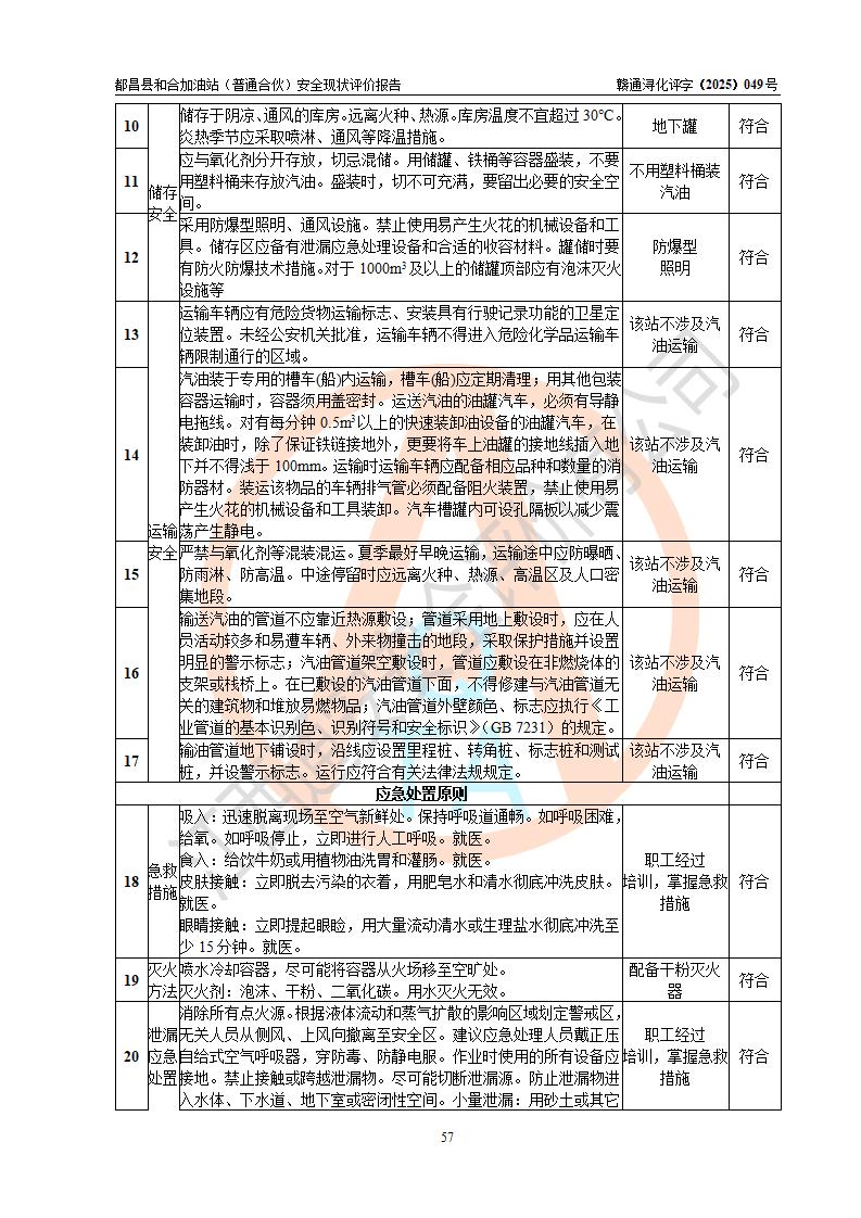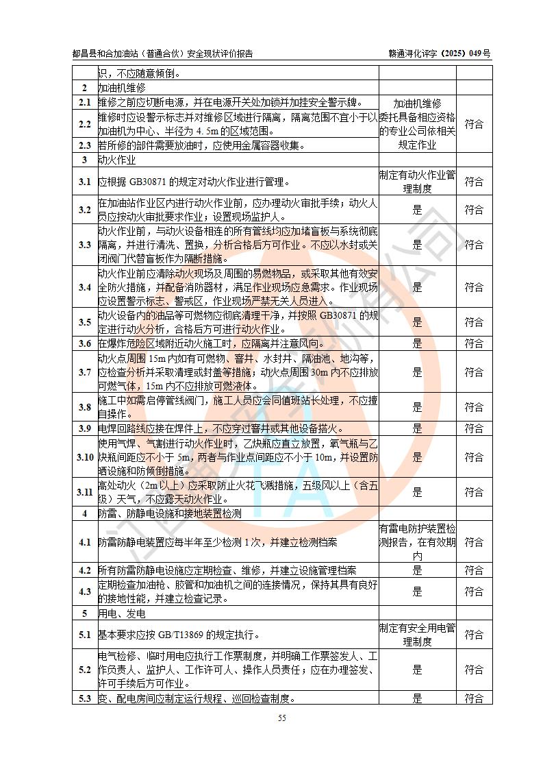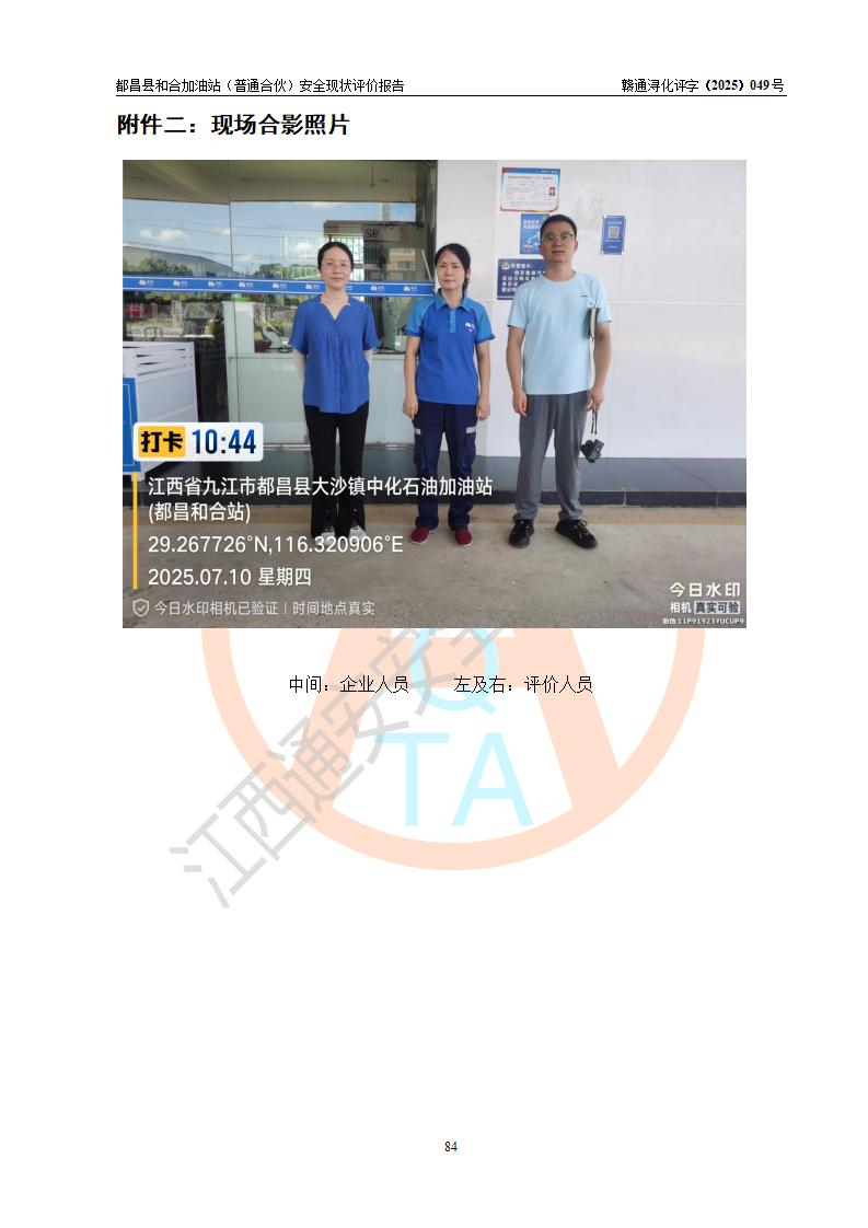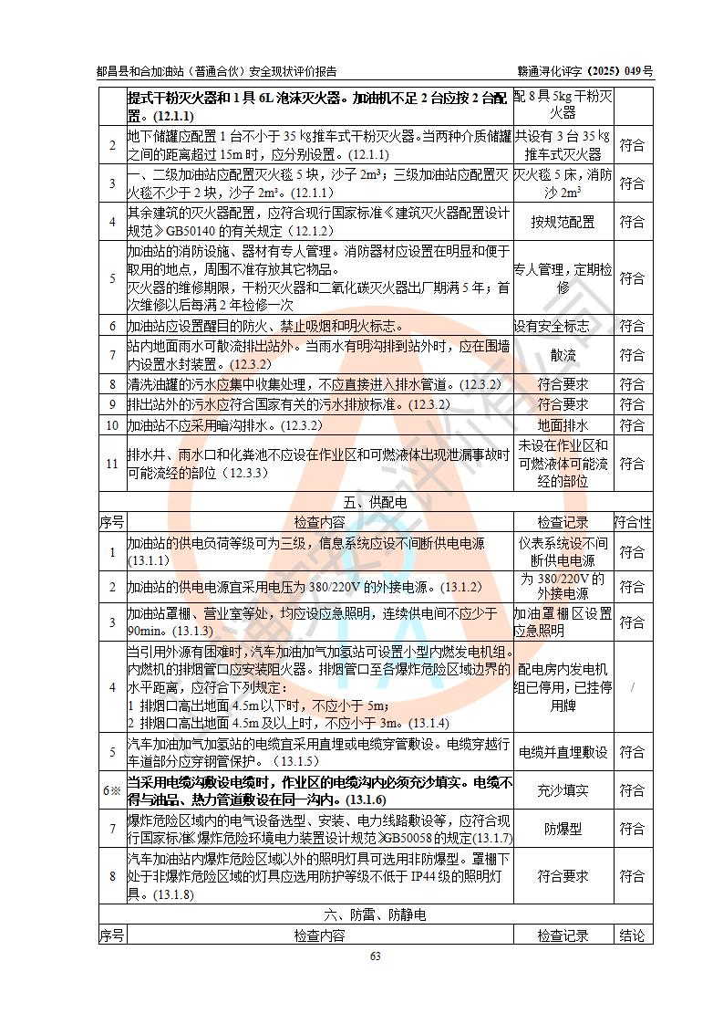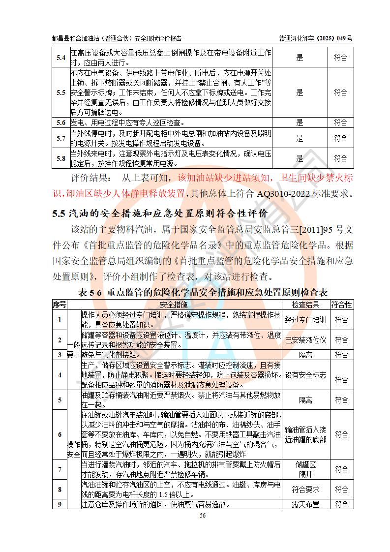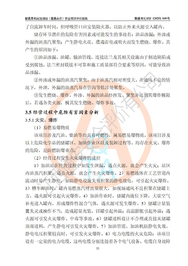 都昌縣和合加油站(普通合伙)是一家專門(mén)從事成品油零售經(jīng)營(yíng)的普通合伙企業(yè),執(zhí)行事務(wù)合伙人:江銘,經(jīng)營(yíng)場(chǎng)所位于江西省九江市都昌縣和合鄉(xiāng)南溪村和合路口。該加油站現(xiàn)有從業(yè)人員6人,其中安全管理人員1人,主要負(fù)責(zé)人江麗娟。 該加油站站區(qū)占地面積1350m2,站區(qū)內(nèi)設(shè)置有4臺(tái)雙槍程控燃油加油機(jī)及配套的工藝管線、30m3雙層0#柴油儲(chǔ)罐1臺(tái)、30m3雙層92#汽油儲(chǔ)罐2臺(tái)、30m3雙層95#汽油儲(chǔ)罐1臺(tái),油品儲(chǔ)罐總?cè)莘e為120m3(折算成汽油為105m3)。按現(xiàn)行《汽車加油加氣加氫站技術(shù)標(biāo)準(zhǔn)》對(duì)加油站的等級(jí)劃分原則,該站屬于二級(jí)加油站。 該站由九江市行政審批局換發(fā)《危險(xiǎn)化學(xué)品經(jīng)營(yíng)許可證》(證號(hào):贛九行審經(jīng)(甲)字[2022]000134號(hào)),**期限2022年08月15日至2025年08月14日。 |