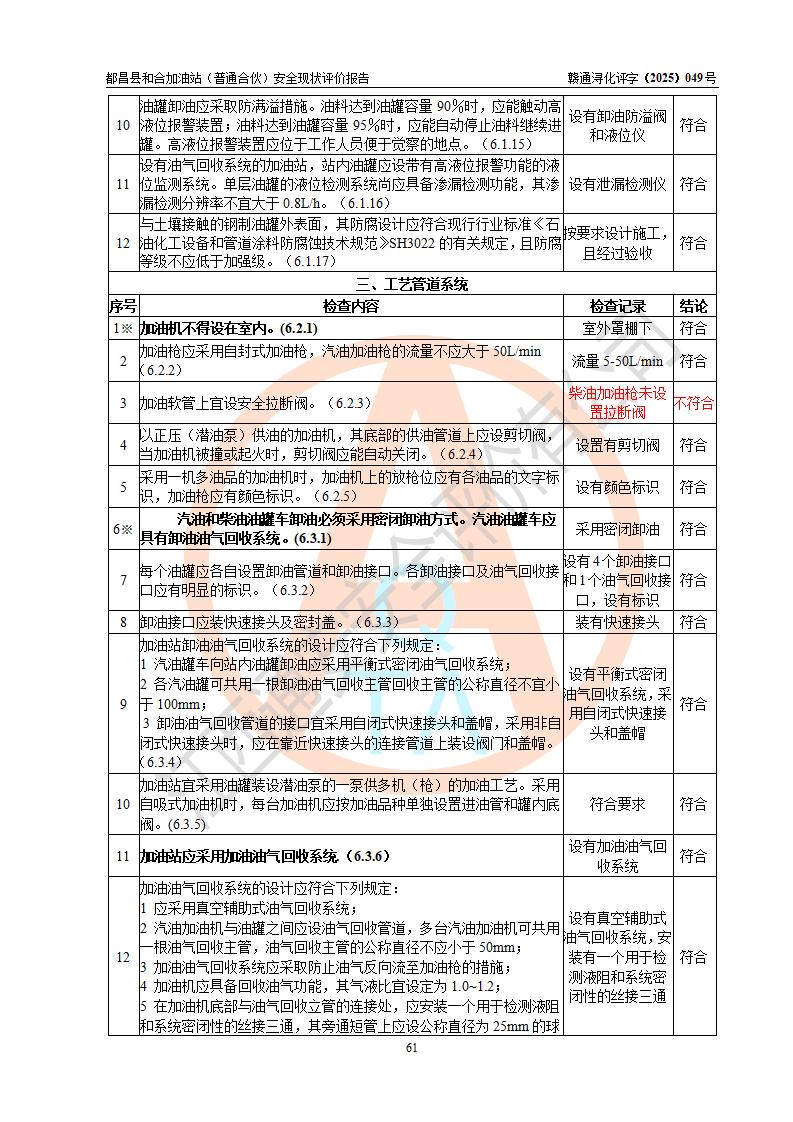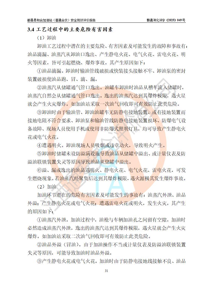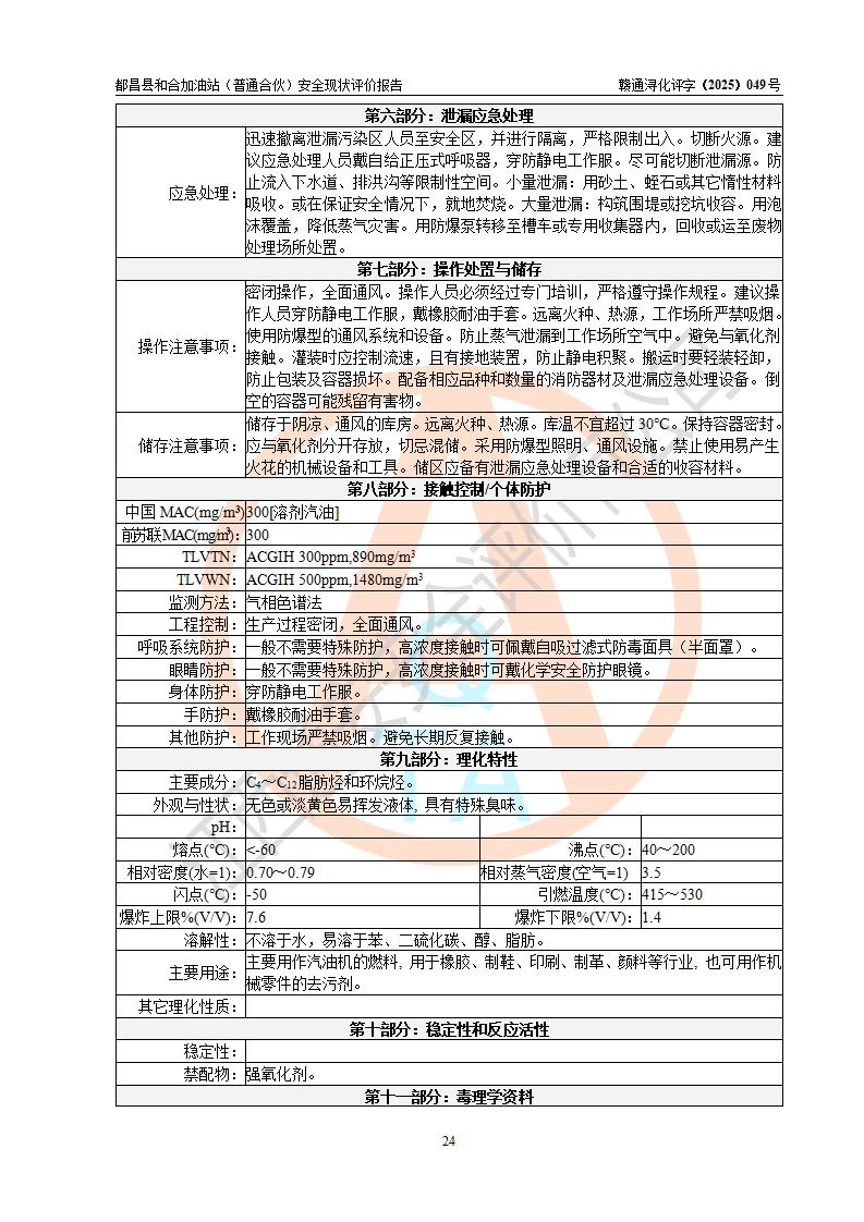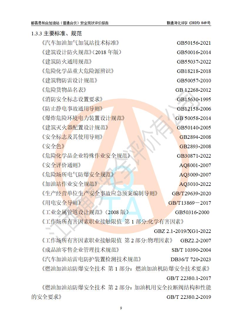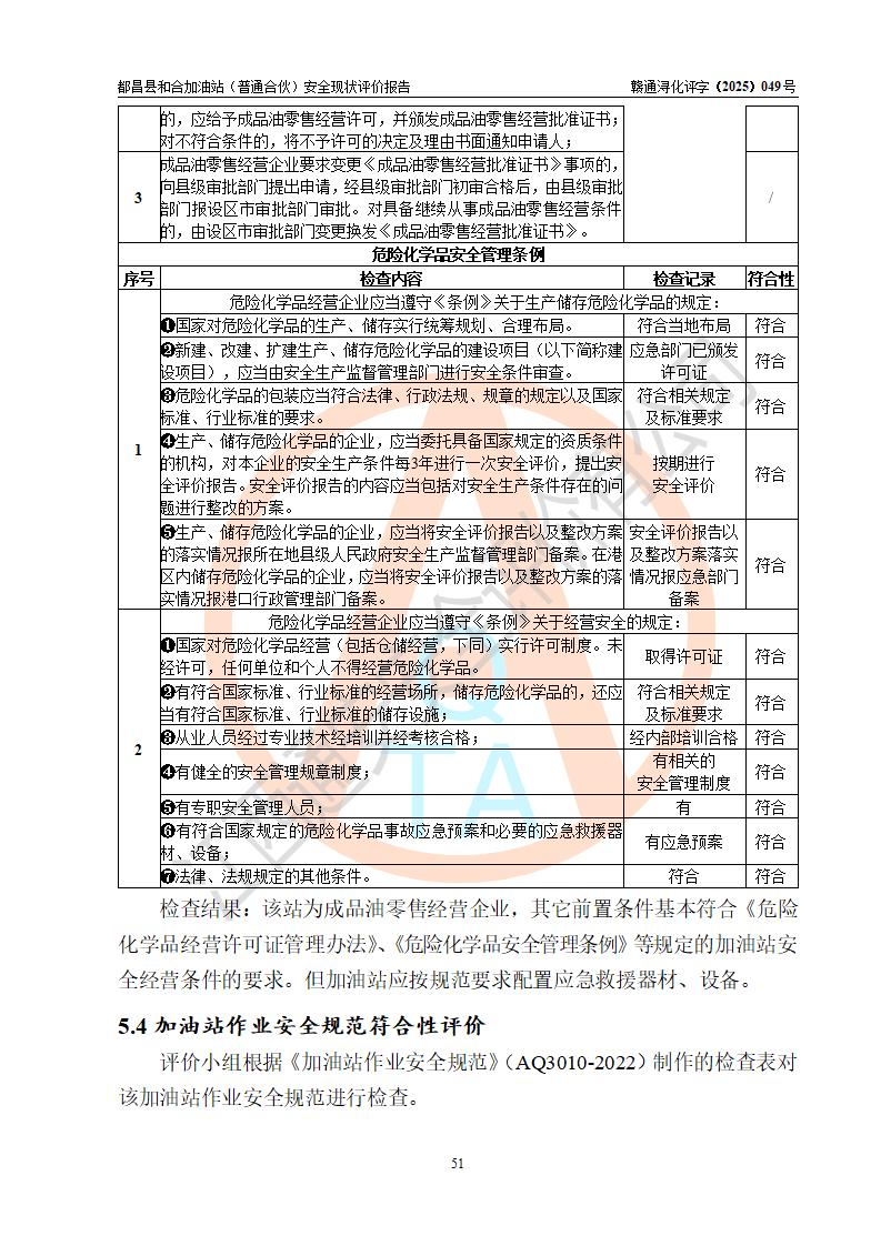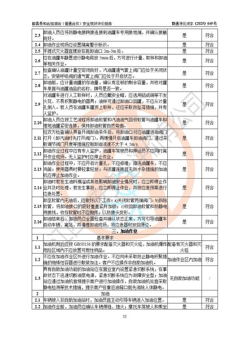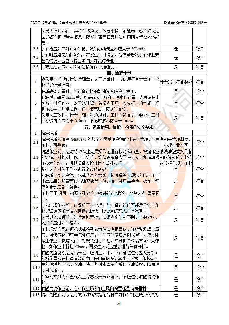 都昌縣和合加油站(普通合伙)是一家專門(mén)從事成品油零售經(jīng)營(yíng)的普通合伙企業(yè),執(zhí)行事務(wù)合伙人:江銘,經(jīng)營(yíng)場(chǎng)所位于江西省九江市都昌縣和合鄉(xiāng)南溪村和合路口。該加油站現(xiàn)有從業(yè)人員6人,其中安全管理人員1人,主要負(fù)責(zé)人江麗娟。 該加油站站區(qū)占地面積1350m2,站區(qū)內(nèi)設(shè)置有4臺(tái)雙槍程控燃油加油機(jī)及配套的工藝管線、30m3雙層0#柴油儲(chǔ)罐1臺(tái)、30m3雙層92#汽油儲(chǔ)罐2臺(tái)、30m3雙層95#汽油儲(chǔ)罐1臺(tái),油品儲(chǔ)罐總?cè)莘e為120m3(折算成汽油為105m3)。按現(xiàn)行《汽車加油加氣加氫站技術(shù)標(biāo)準(zhǔn)》對(duì)加油站的等級(jí)劃分原則,該站屬于二級(jí)加油站。 該站由九江市行政審批局換發(fā)《危險(xiǎn)化學(xué)品經(jīng)營(yíng)許可證》(證號(hào):贛九行審經(jīng)(甲)字[2022]000134號(hào)),**期限2022年08月15日至2025年08月14日。 |