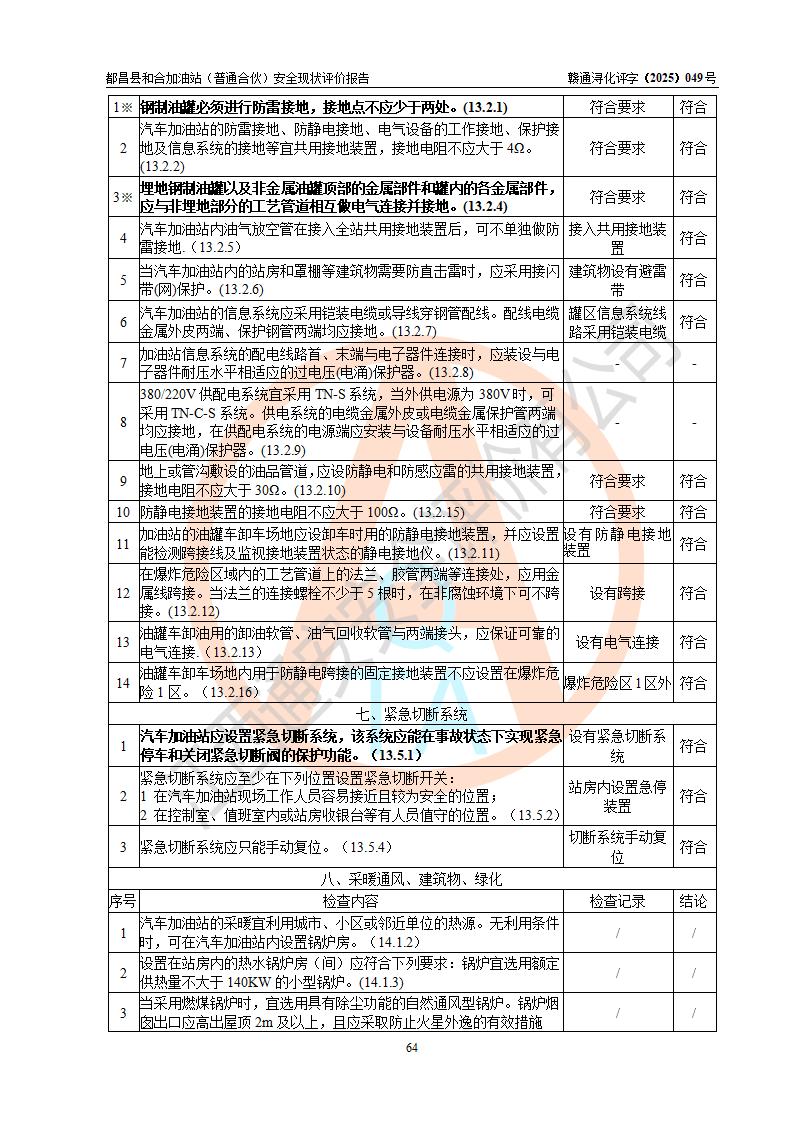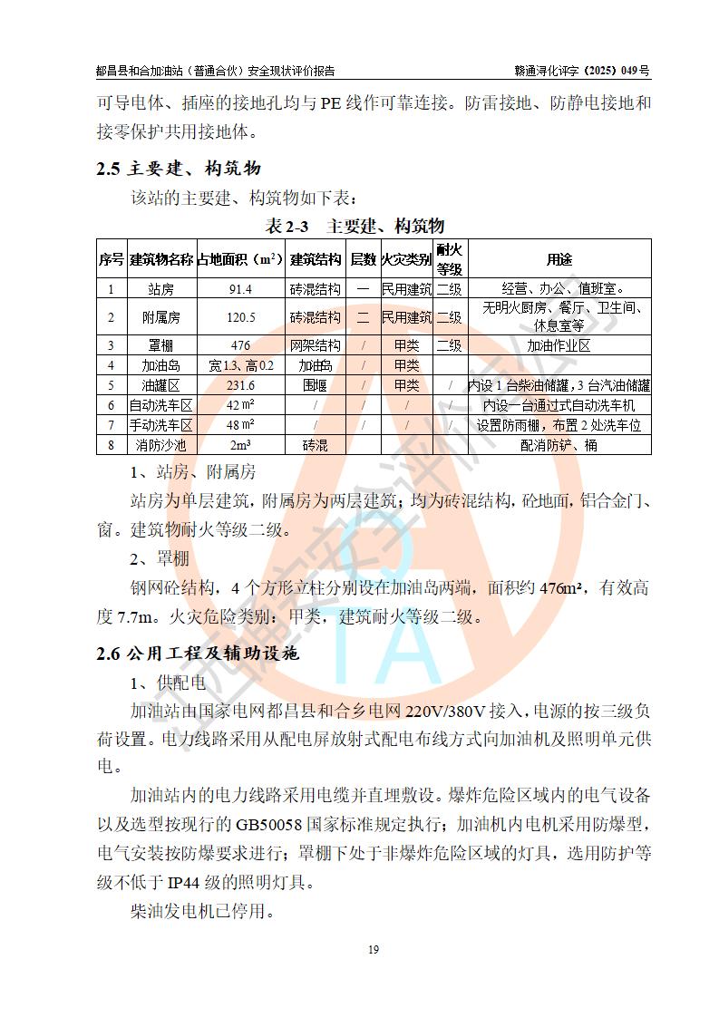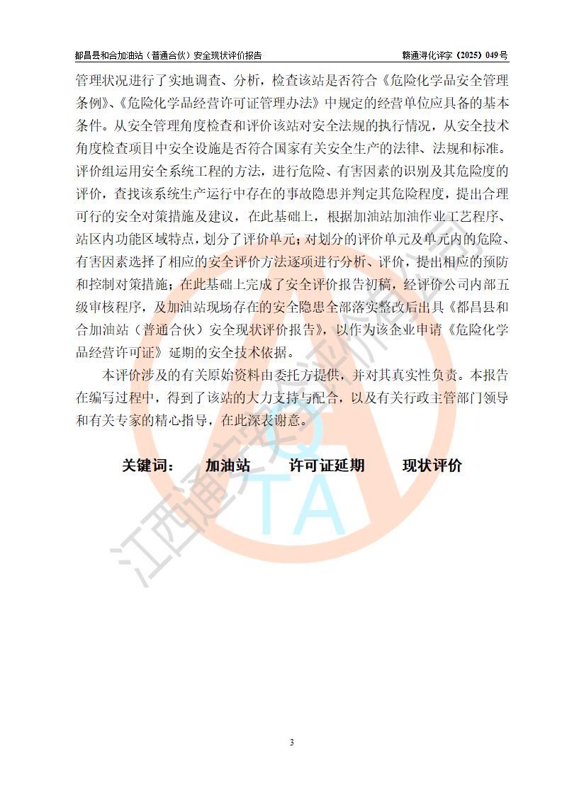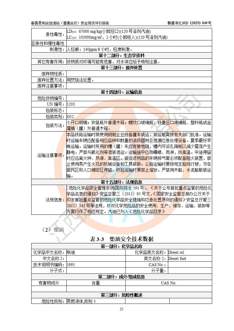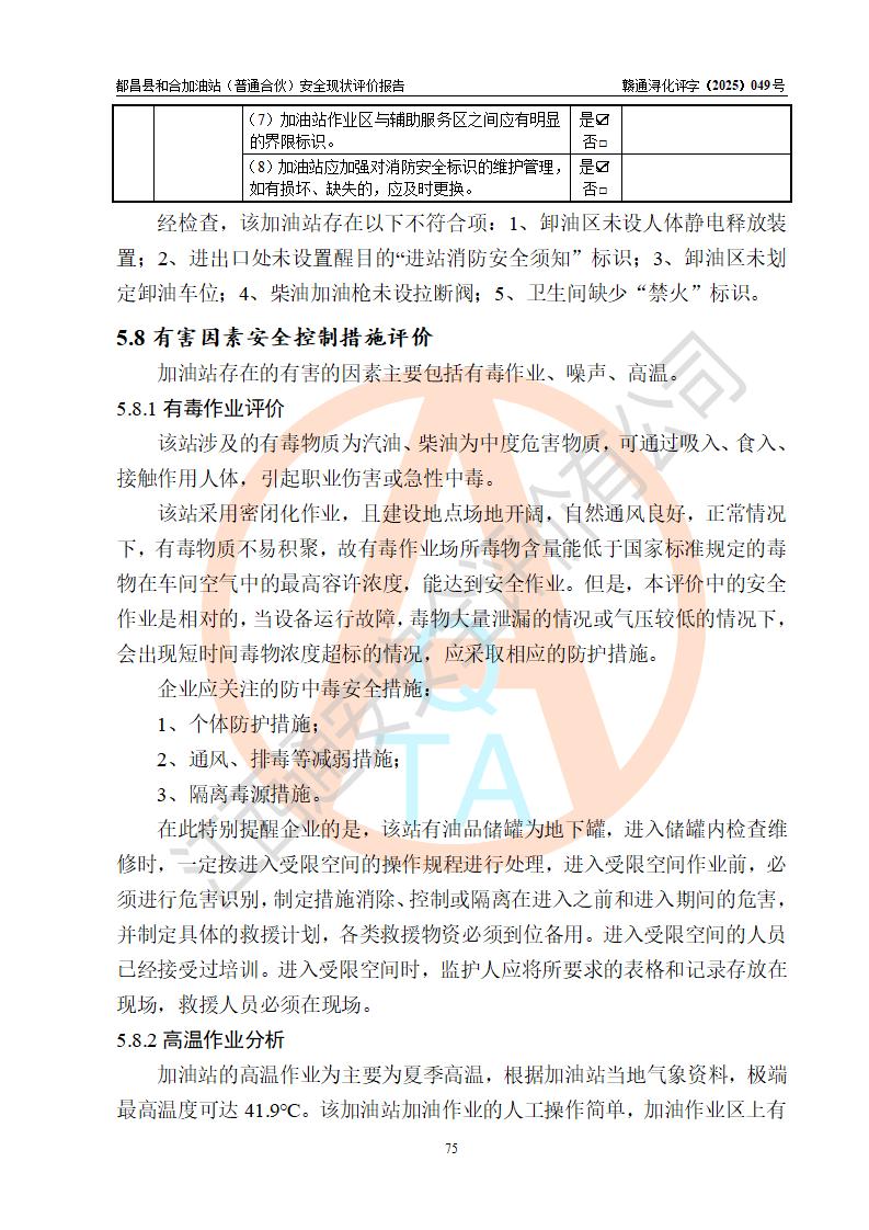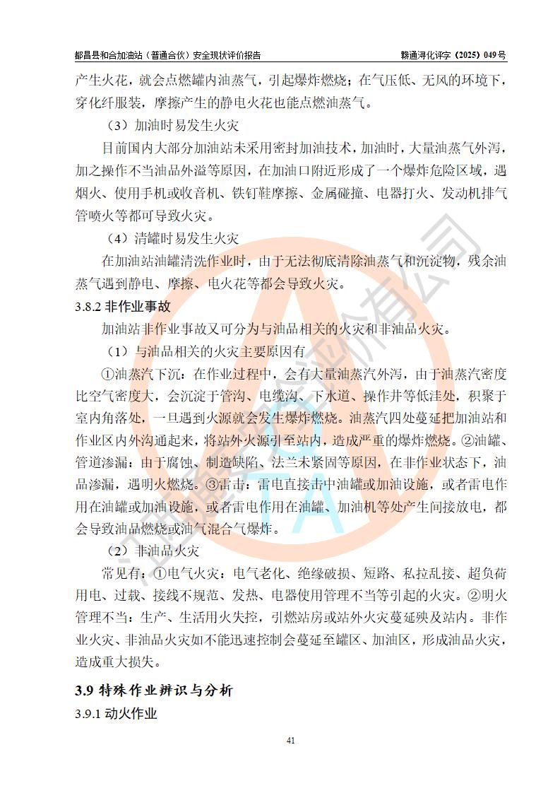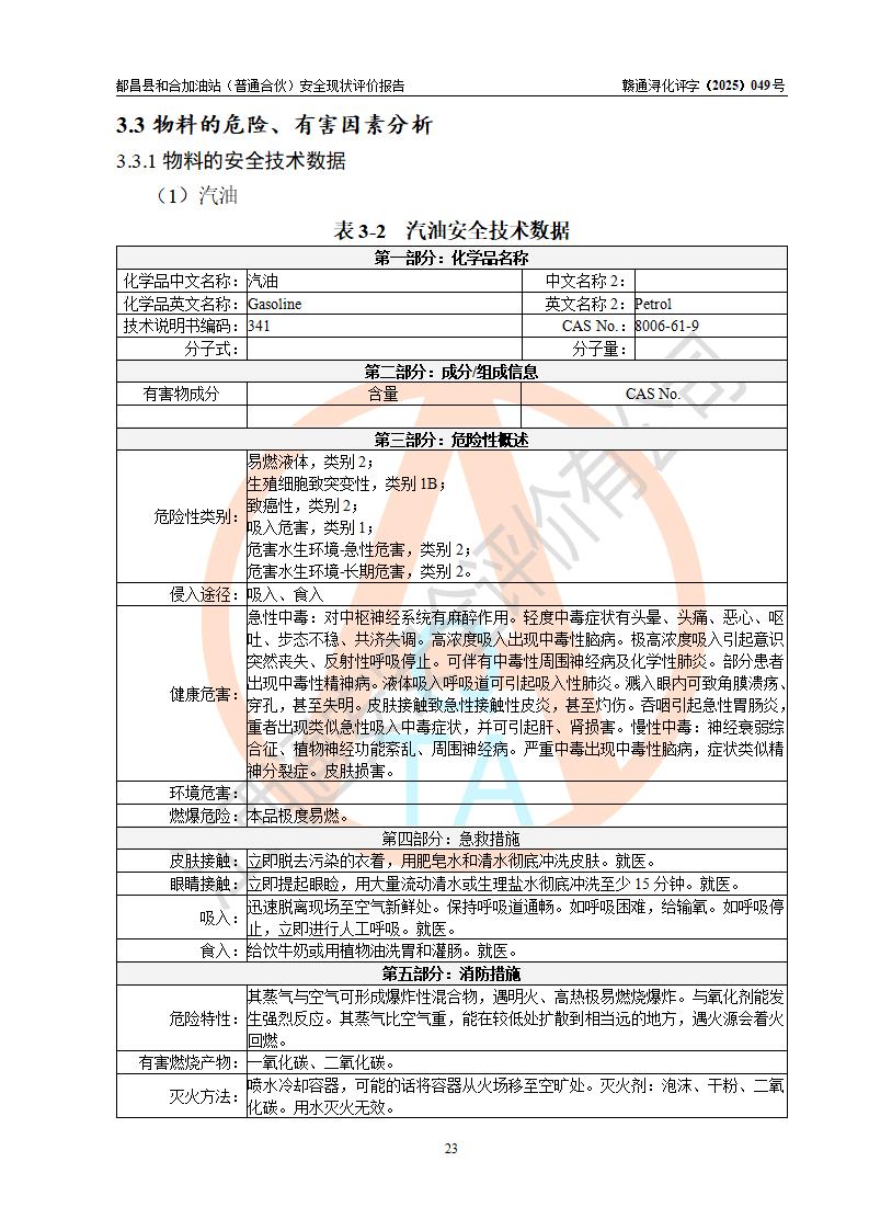 都昌縣和合加油站(普通合伙)是一家專門(mén)從事成品油零售經(jīng)營(yíng)的普通合伙企業(yè),執(zhí)行事務(wù)合伙人:江銘,經(jīng)營(yíng)場(chǎng)所位于江西省九江市都昌縣和合鄉(xiāng)南溪村和合路口。該加油站現(xiàn)有從業(yè)人員6人,其中安全管理人員1人,主要負(fù)責(zé)人江麗娟。 該加油站站區(qū)占地面積1350m2,站區(qū)內(nèi)設(shè)置有4臺(tái)雙槍程控燃油加油機(jī)及配套的工藝管線、30m3雙層0#柴油儲(chǔ)罐1臺(tái)、30m3雙層92#汽油儲(chǔ)罐2臺(tái)、30m3雙層95#汽油儲(chǔ)罐1臺(tái),油品儲(chǔ)罐總?cè)莘e為120m3(折算成汽油為105m3)。按現(xiàn)行《汽車加油加氣加氫站技術(shù)標(biāo)準(zhǔn)》對(duì)加油站的等級(jí)劃分原則,該站屬于二級(jí)加油站。 該站由九江市行政審批局換發(fā)《危險(xiǎn)化學(xué)品經(jīng)營(yíng)許可證》(證號(hào):贛九行審經(jīng)(甲)字[2022]000134號(hào)),**期限2022年08月15日至2025年08月14日。 |