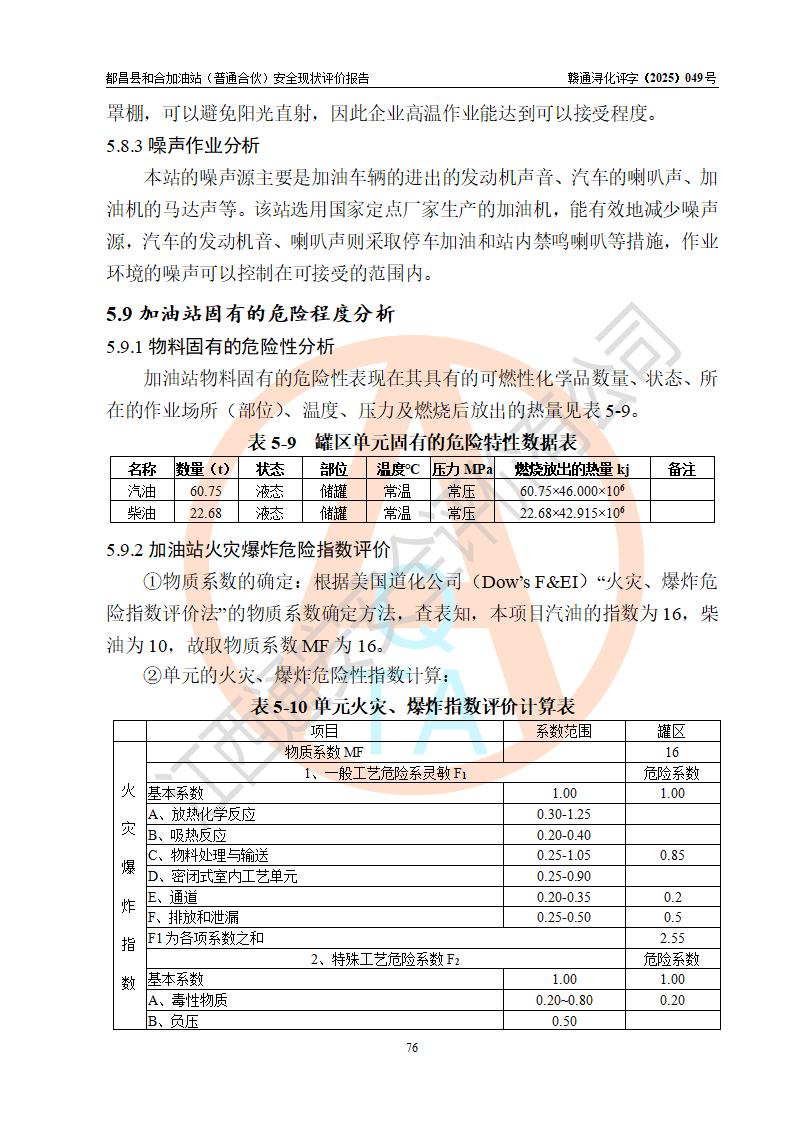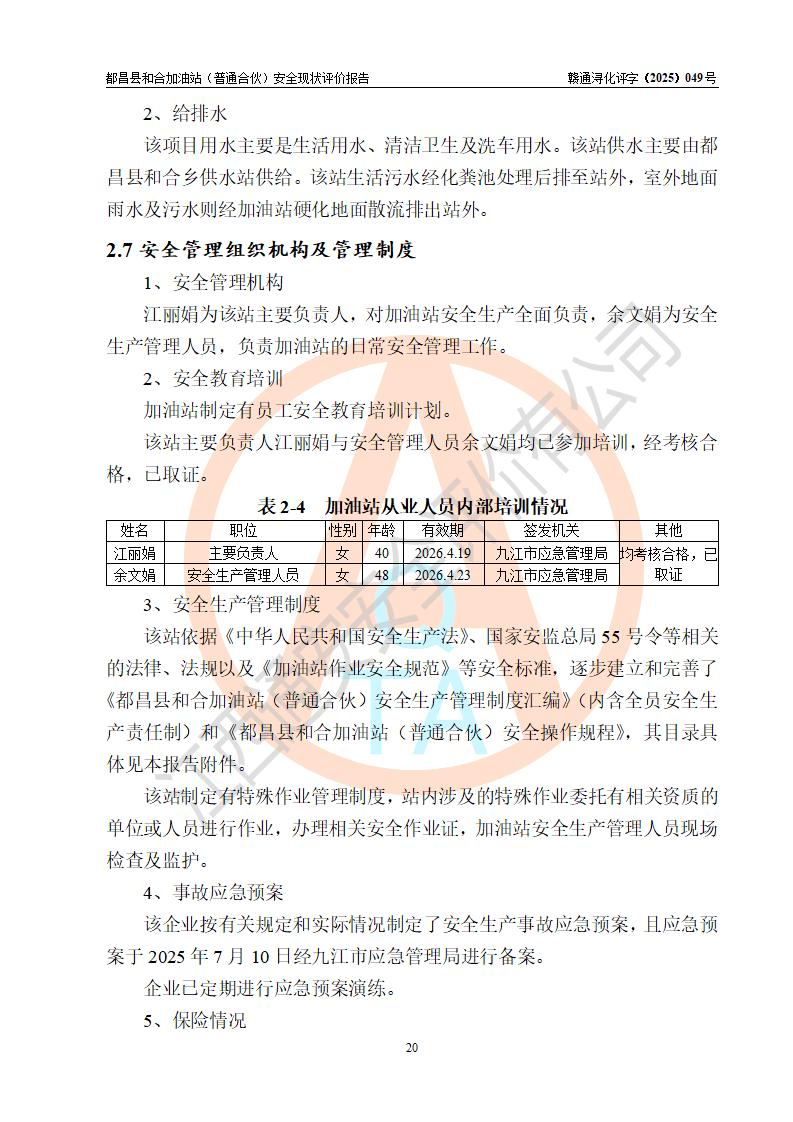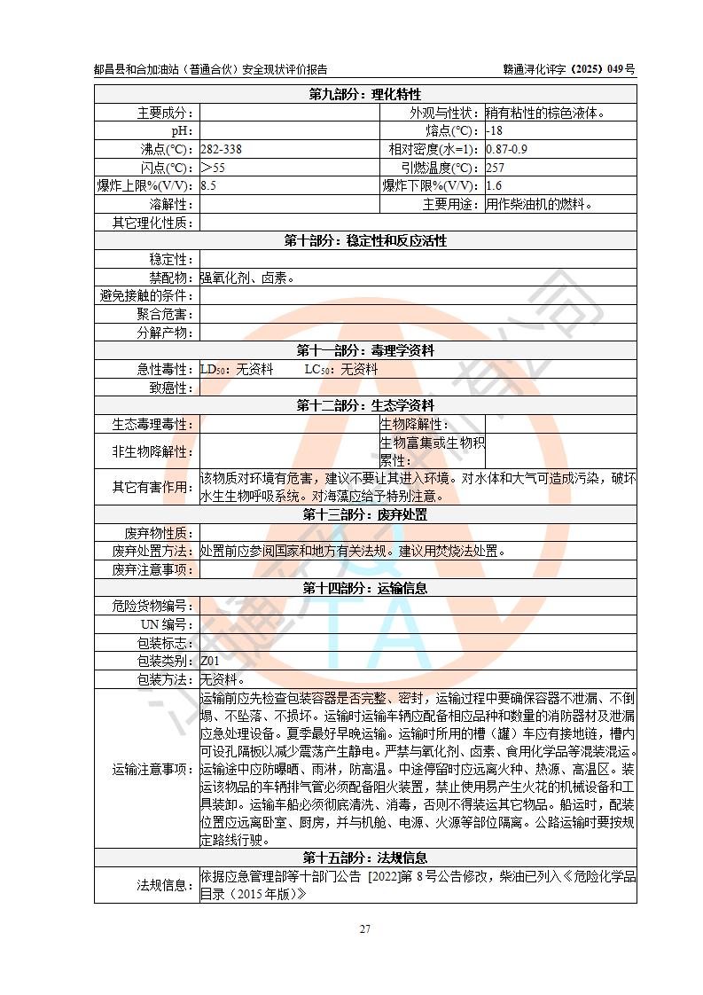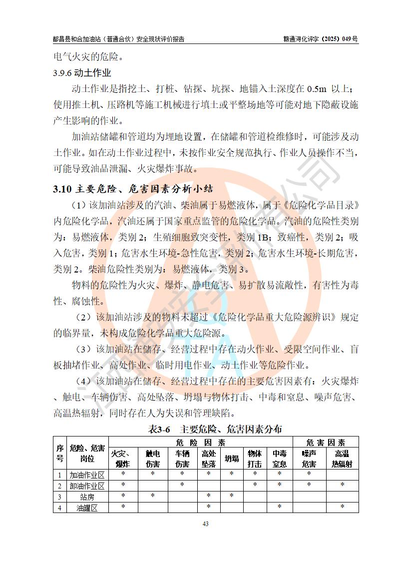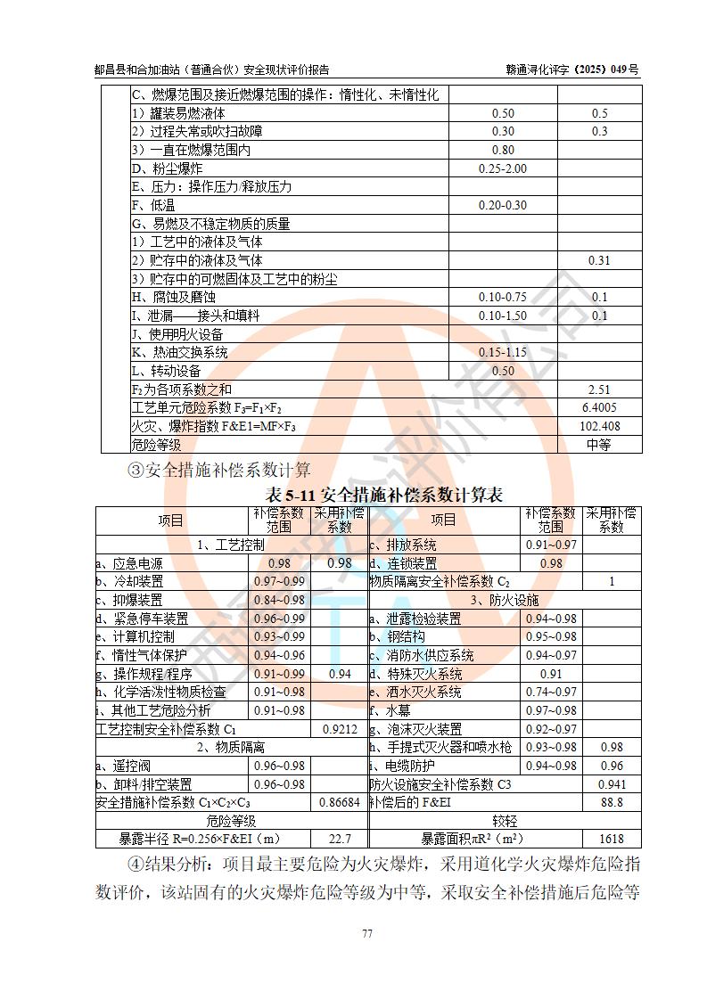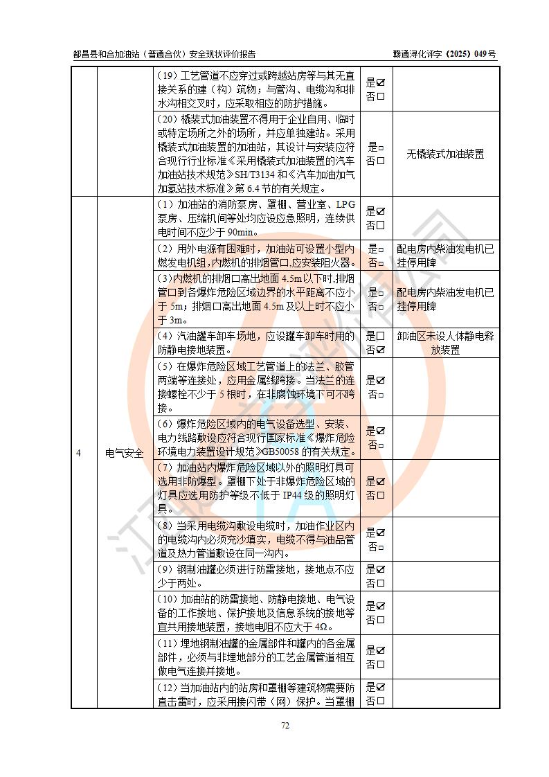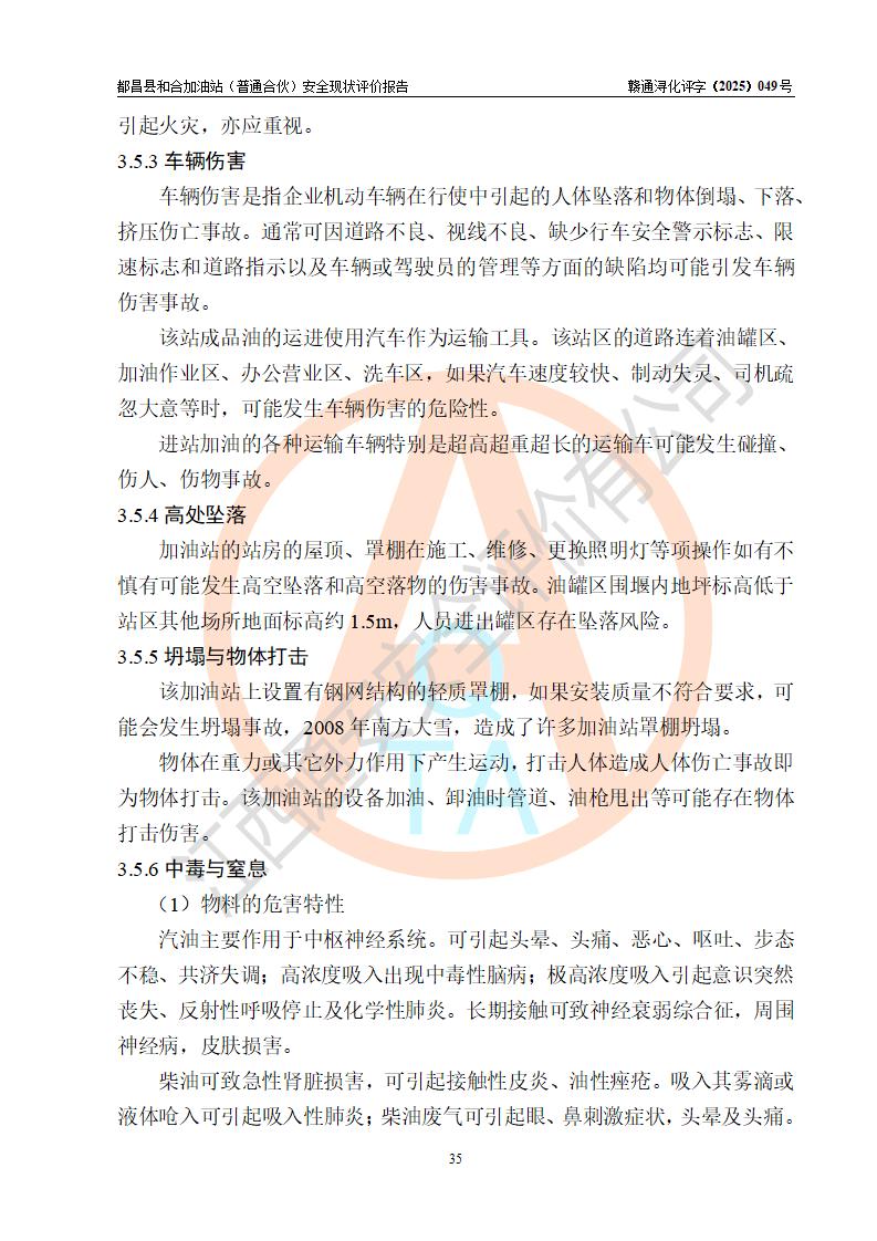 都昌縣和合加油站(普通合伙)是一家專門(mén)從事成品油零售經(jīng)營(yíng)的普通合伙企業(yè),執(zhí)行事務(wù)合伙人:江銘,經(jīng)營(yíng)場(chǎng)所位于江西省九江市都昌縣和合鄉(xiāng)南溪村和合路口。該加油站現(xiàn)有從業(yè)人員6人,其中安全管理人員1人,主要負(fù)責(zé)人江麗娟。 該加油站站區(qū)占地面積1350m2,站區(qū)內(nèi)設(shè)置有4臺(tái)雙槍程控燃油加油機(jī)及配套的工藝管線、30m3雙層0#柴油儲(chǔ)罐1臺(tái)、30m3雙層92#汽油儲(chǔ)罐2臺(tái)、30m3雙層95#汽油儲(chǔ)罐1臺(tái),油品儲(chǔ)罐總?cè)莘e為120m3(折算成汽油為105m3)。按現(xiàn)行《汽車加油加氣加氫站技術(shù)標(biāo)準(zhǔn)》對(duì)加油站的等級(jí)劃分原則,該站屬于二級(jí)加油站。 該站由九江市行政審批局換發(fā)《危險(xiǎn)化學(xué)品經(jīng)營(yíng)許可證》(證號(hào):贛九行審經(jīng)(甲)字[2022]000134號(hào)),**期限2022年08月15日至2025年08月14日。 |