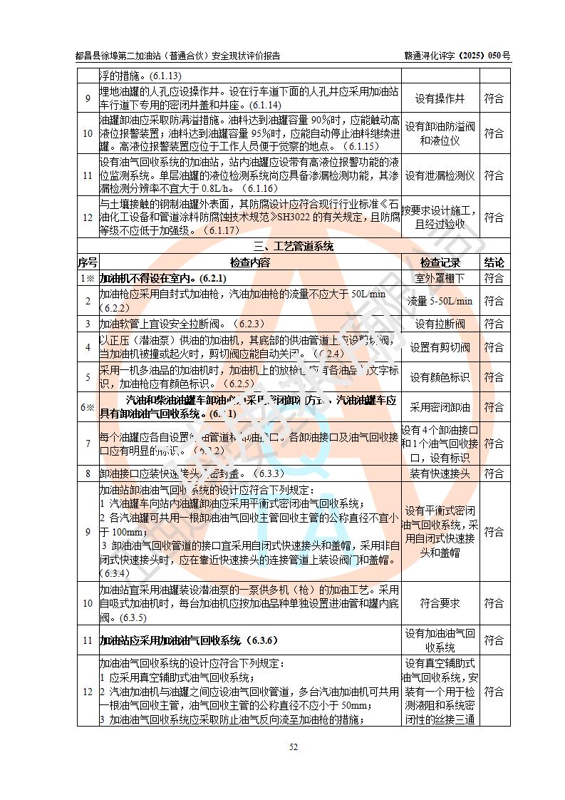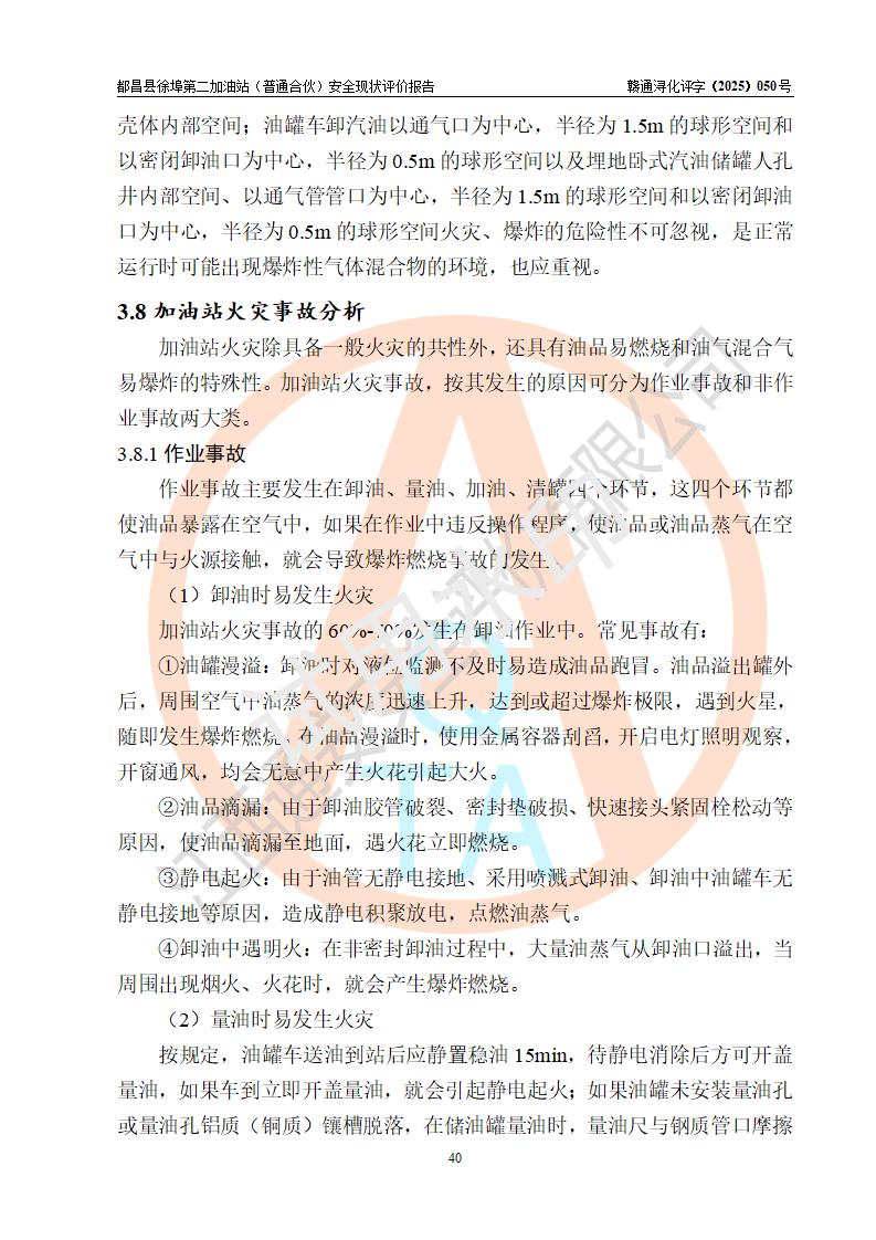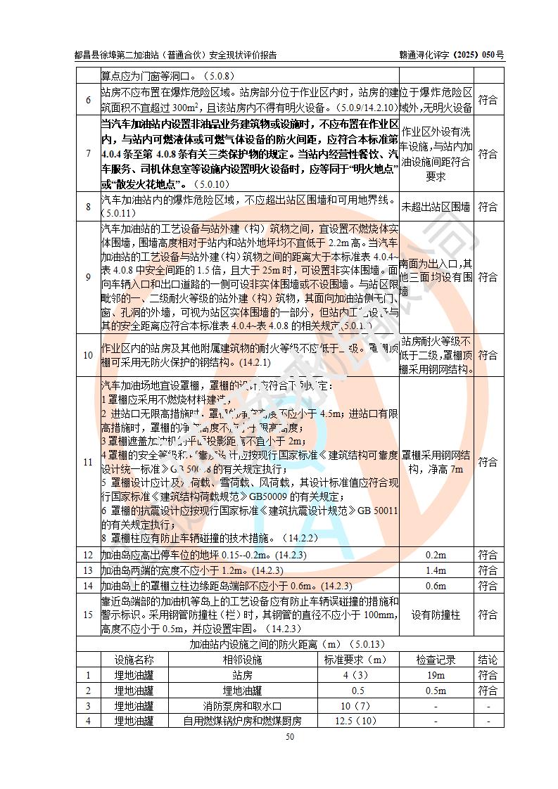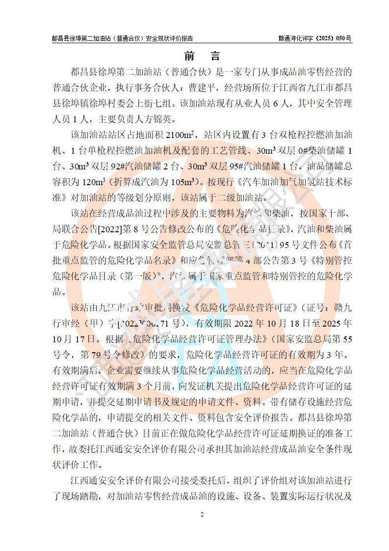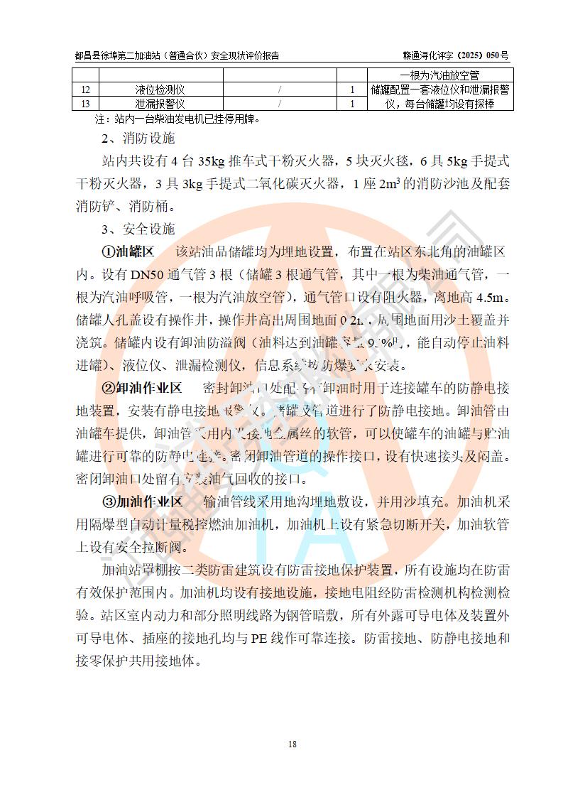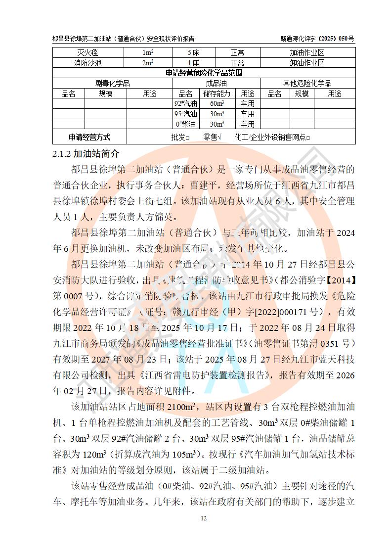 都昌縣徐埠第二加油站(普通合伙)是一家專門從事成品油零售經(jīng)營的普通合伙企業(yè),執(zhí)行事務合伙人:曹建平,經(jīng)營場所位于江西省九江市都昌縣徐埠鎮(zhèn)徐埠村委會上街七組。該加油站現(xiàn)有從業(yè)人員6人,其中安全管理人員1人,主要負責人方錦英。 該加油站站區(qū)占地面積2100m2,站區(qū)內(nèi)設(shè)置有3臺雙槍程控燃油加油機、1臺單槍程控燃油加油機及配套的工藝管線、30m3雙層0#柴油儲罐1臺、30m3雙層92#汽油儲罐2臺、30m3雙層95#汽油儲罐1臺,油品儲罐總?cè)莘e為120m3(折算成汽油為105m3)。按現(xiàn)行《汽車加油加氣加氫站技術(shù)標準》對加油站的等級劃分原則,該站屬于二級加油站。 該站由九江市行政審批局換發(fā)《危險化學品經(jīng)營許可證》(證號:贛九行審經(jīng)(甲)字[2022]000171號),**期限2022年10月18日至2025年10月17日。 |